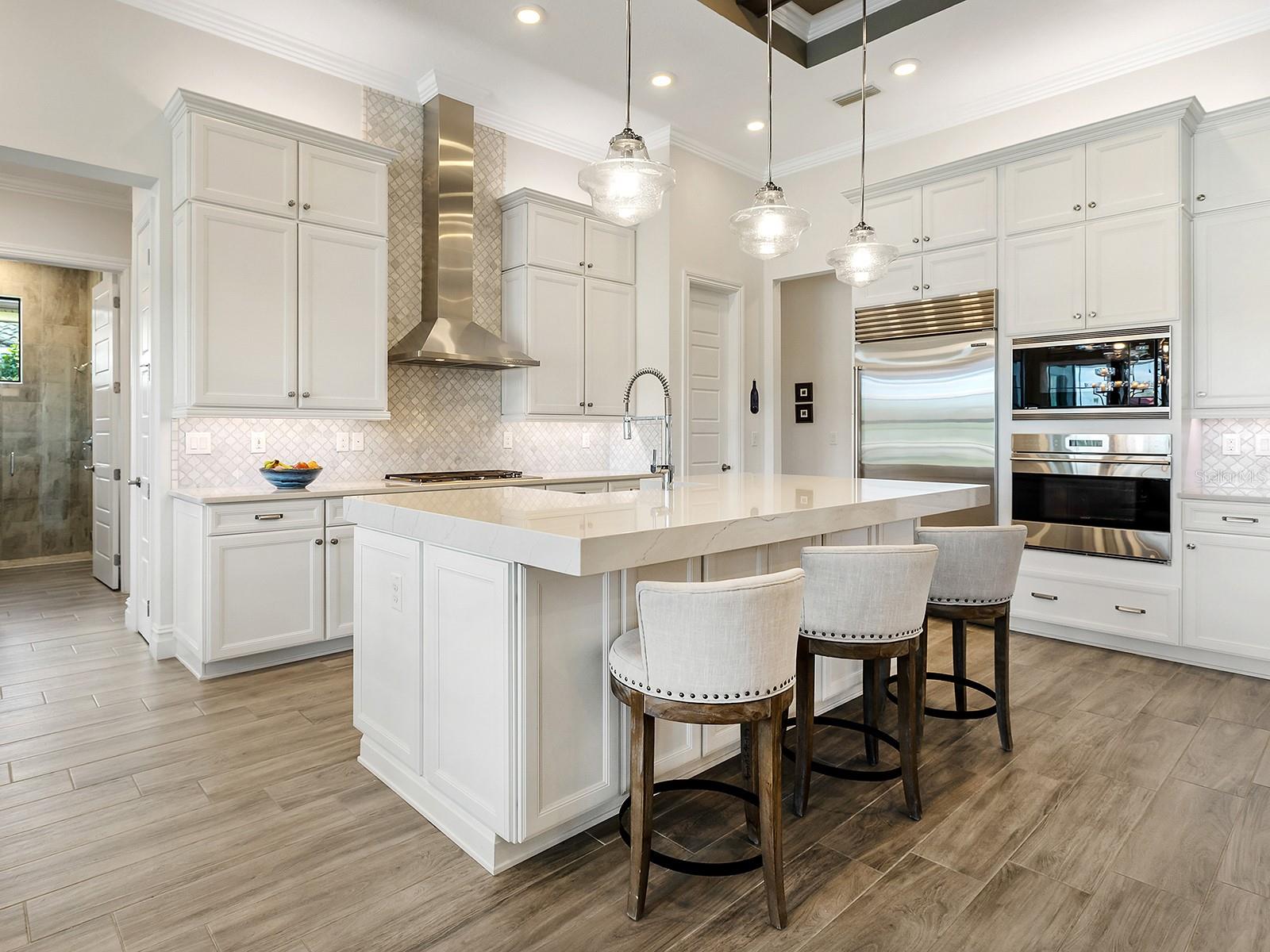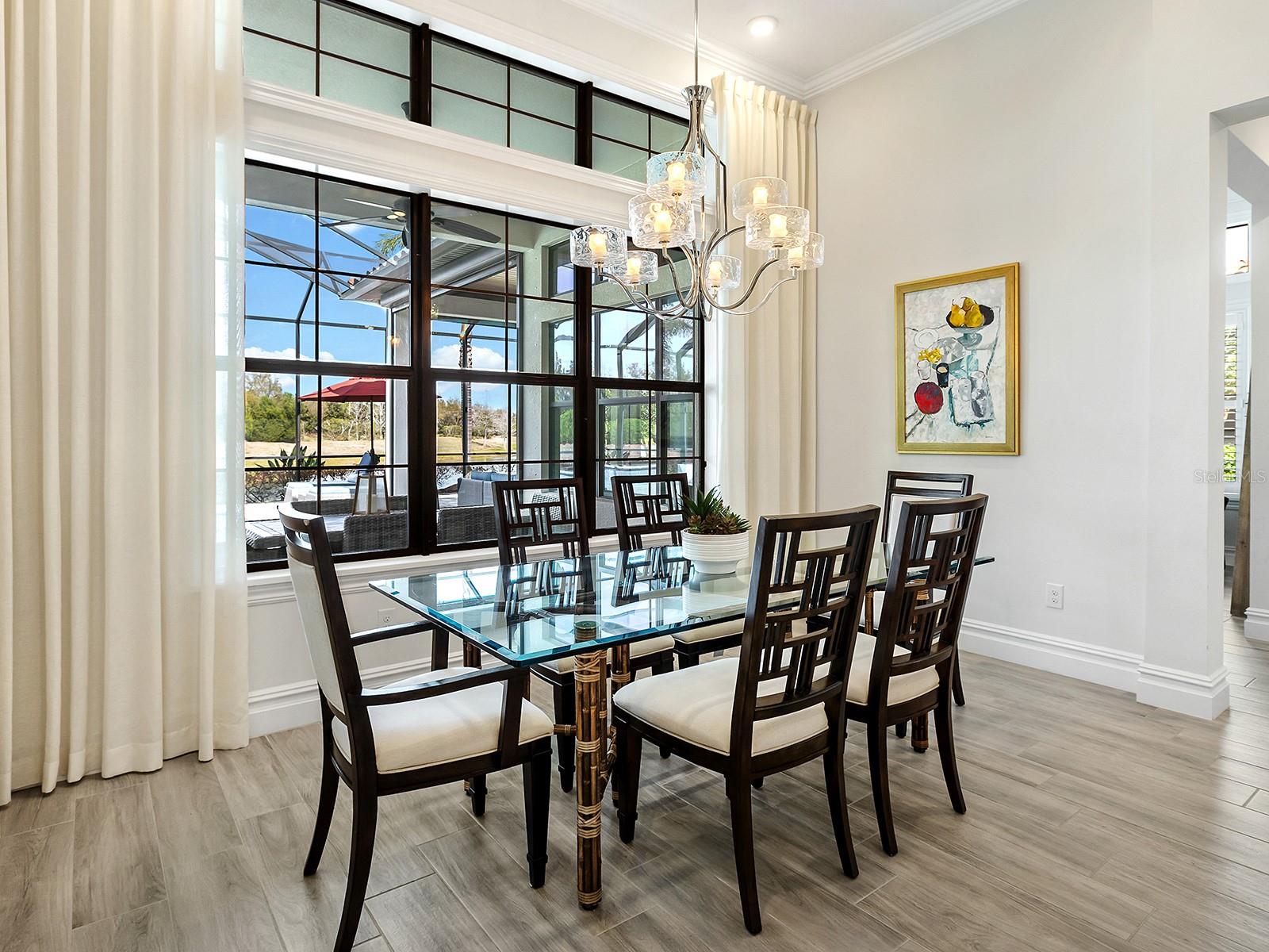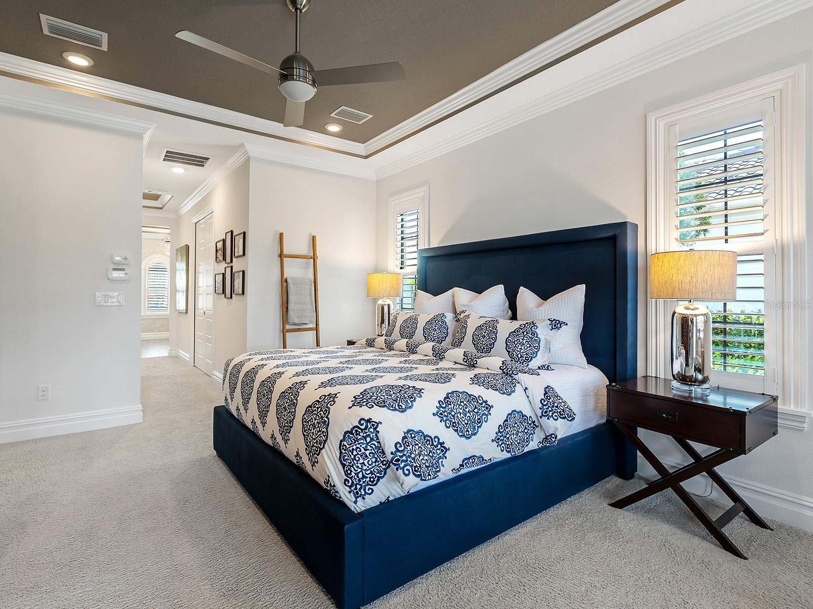 Exquisite, lakeside living is within reach at Country Club East in Lakewood Ranch! Located in the Collingtree section, this home is the former award-winning Toriana model home, representing the very best that Cardel Homes has to offer with sublime upgrades adorning every room. The meticulous landscaping (grounds maintenance included in HOA) welcomes you home with towering palms, wide paver driveway and custom Mizner-inspired exterior. In the foyer with 16' coffered ceiling you’re met with the first glimpses of elegant upgrades present throughout the entire home including wood look porcelain plank tile flooring, bright and light filled interior with lots of windows and sliders, warm accents, custom window treatments, and designer light fixtures. The central great room showcases a feature wall with custom molding and sconce lighting; and tray ceiling with crown molding, exposed beams, and large modern ceiling fan that also extends into the kitchen creating a cohesive entertaining floor plan. The upgraded kitchen sparkles with a central island of extra-thick stone counters and counter height seating; abundant cabinetry including extra uppers, soft close drawers, pull-outs, and vertical storage; stainless steel apron sink; and walk-in pantry with shelving. Chefs will love using the upgraded stainless steel appliance suite with Wolf gas cooktop, Wolf built-in microwave and wall oven set, and Sub-Zero refrigerator. Enjoy your meals in the formal dining with a full wall of windows that maximize the lake views for an elegant dining experience every day. Through sliding glass doors is the expanded paver lanai with over 90 feet of northern lake views, taking advantage of soft sunlight throughout the day while remaining cooler than other exposures. The main covered entertaining area off the great room offers an expertly equipped outdoor kitchen and two spaces to relax and dine; while the second off the bonus room has a cozy fireplace and remote-controlled hurricane and shade screens. The heated pool and spa with water feature are perfectly positioned to take in the lake views. The primary suite is a comforting and expansive space with tray ceiling, separate seating area, dual walk-in closets, French door leading to the lanai, and vestibule entry with morning bar. The en-suite primary bath offers his and hers dual vanities, designer wallpaper, triple tray ceiling, freestanding tub, oversized walk-in shower with frameless glass and floor-to-ceiling tile. Guests will savor their own accommodations with two guest bedrooms and two full guest bathrooms. When you need to work or crave some privacy, the study is the ideal place with custom disappearing corner barn doors, exposed beam ceiling, and built-in shelving. The rear bonus room with sliding glass doors to the lanai is truly a versatile space that can be used as a media room, play room and more. Additional spaces include a laundry room with extra cabinetry and mudroom built-ins, and oversized 2-car garage that has a large storage area. Enjoy the country club lifestyle in gated Country Club East with 3 community pools, fitness center, clubhouse, walking trails, social events and more. If you’re looking for additional amenities, membership to Lakewood Ranch Golf and Country Club is available for access to 3 Clubhouses, 4 championship 18-hole golf courses, fitness center with pool, tennis and pickleball courts. Lakewood Ranch is the top multi-generational community in the country for 8 years in a row.