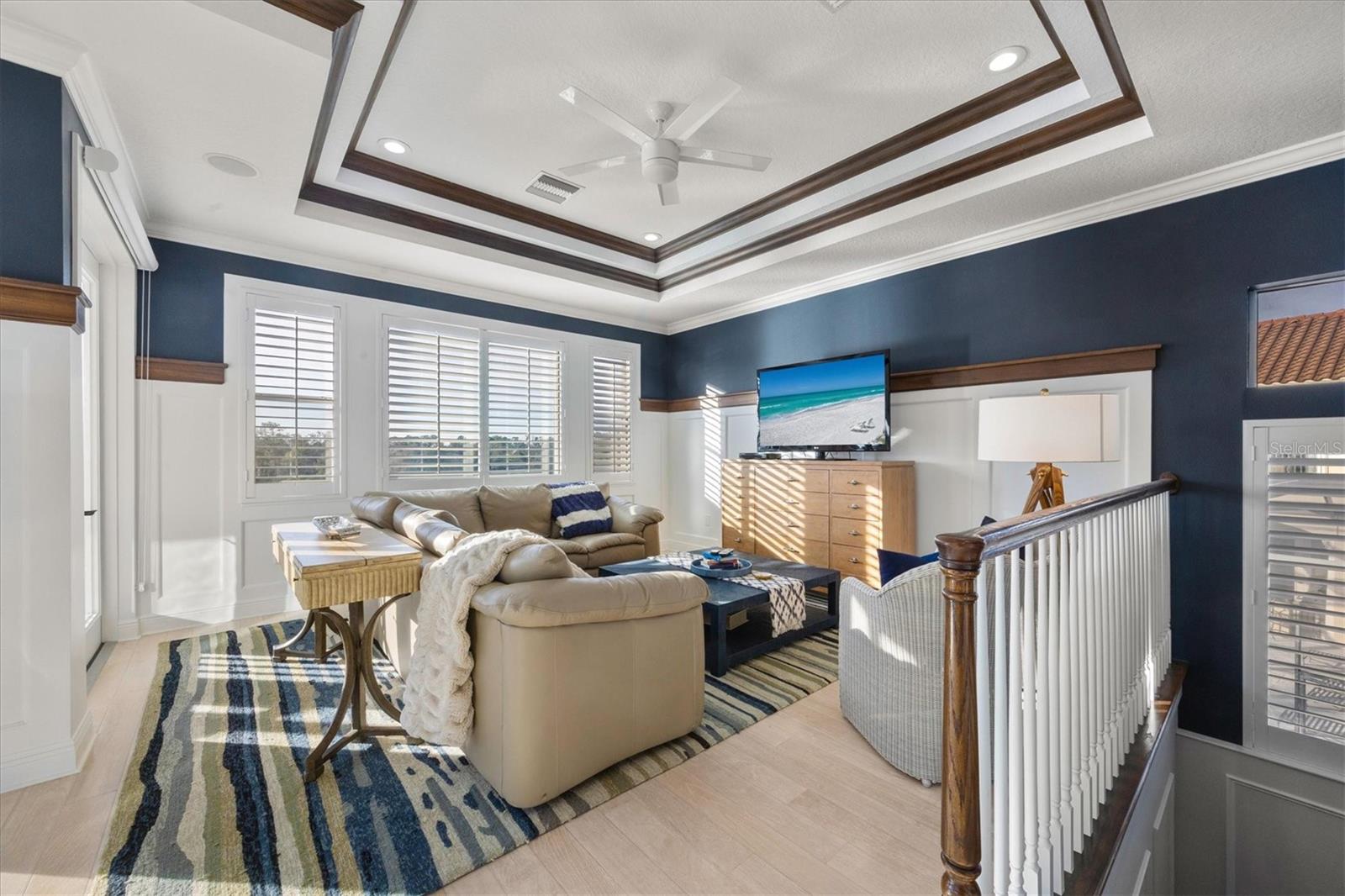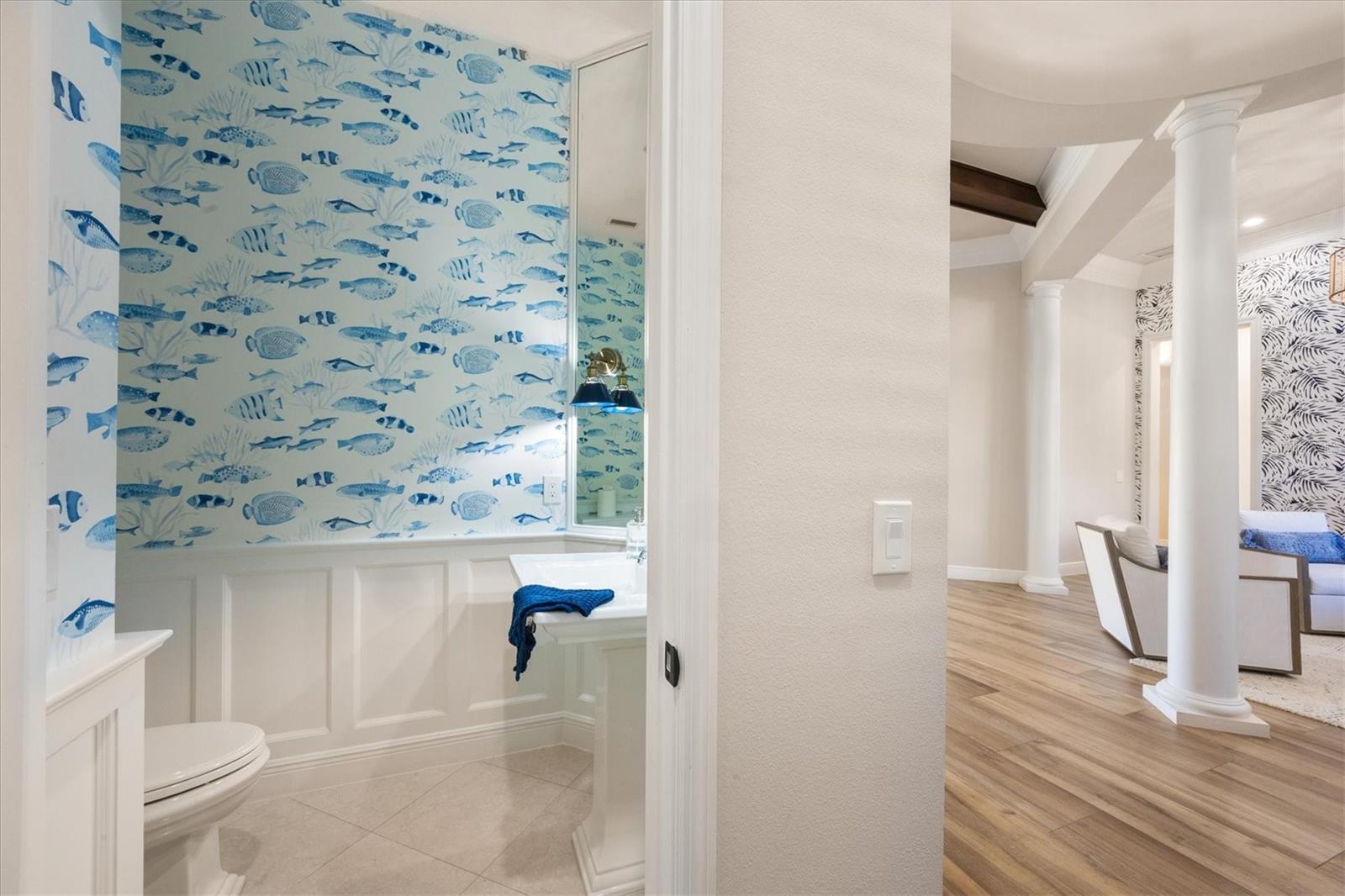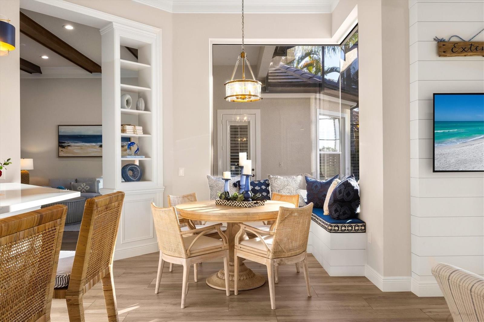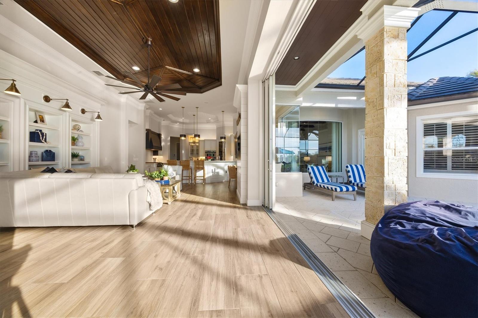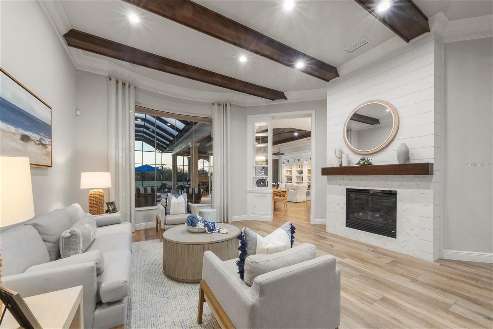Located within the prestigious, maintenance-free Greystone enclave of the Lakewood Ranch Country Club, this completely remodeled residence offers three bedrooms, four-and-a-half baths, a private office, and an expansive upstairs bonus guest retreat — all positioned to capture sweeping, unobstructed golf course views. Meticulous landscaping and a pavered driveway create a striking first impression, leading to a welcoming front porch and custom wood entry door. Inside, stunning wood-look plank porcelain tile flows seamlessly throughout the main living areas, complemented by architectural details at every turn — tray ceilings, crown molding, designer lighting, and refined millwork that elevate the home with timeless elegance. A formal seating area framed by an aquarium window overlooks the sparkling pool and lush fairways beyond welcoms you home. Architectural wood beams accent the ceiling while a gas fireplace with coastal detailing creates a warm focal point. A dedicated formal dining room provides an elegant setting for hosting gatherings both intimate and grand. The heart of the home is a beautifully appointed chef’s kitchen featuring quartz countertops, updated appliances, a generous prep island, breakfast bar seating, abundant cabinetry, and a dry bar with wine refrigerator. An inviting breakfast nook, enhanced by an aquarium window, captures tranquil views of the lanai and golf course. The adjacent family room is rich with character, showcasing warm wood tones in tongue-and-groove planks within the tray ceiling, custom built-ins, and disappearing corner sliders that fully open to the lanai — seamlessly blending indoor and outdoor living. The oversized primary suite serves as a private sanctuary, complete with tray ceiling detailing, dual walk-in closets, and a spa-inspired bath offering a soaking tub, walk-in shower, and split vanities. Two additional guest bedrooms each feature their own en-suite bath, ensuring privacy and comfort for family and visitors. The bright, oversized office is both functional and refined, highlighted by a rich, warm, wood built-in wall with shelving and custom cabinetry — a sophisticated and inspiring workspace. Upstairs, the expansive bonus room with full bar and full bath offers exceptional flexibility as a guest suite, fourth bedroom, or entertainment retreat, complete with its own private balcony overlooking the picturesque golf course. Outdoor living is nothing short of spectacular. The oversized lanai features a rich wood plank ceiling, gas fireplace, fully equipped outdoor kitchen, and generous spaces for dining, lounging, and entertaining. A heated pool and spa are perfectly positioned to capture breathtaking panoramic golf course views, creating a private resort-style setting. Residents of Lakewood Ranch Country Club enjoy an elevated country club lifestyle with championship golf courses, tennis and pickleball courts, fitness facilities, resort-style pools, fine and casual dining, and a vibrant social calendar — all within close proximity to shopping, dining, top-rated schools, and the Gulf Coast’s world-renowned beaches.