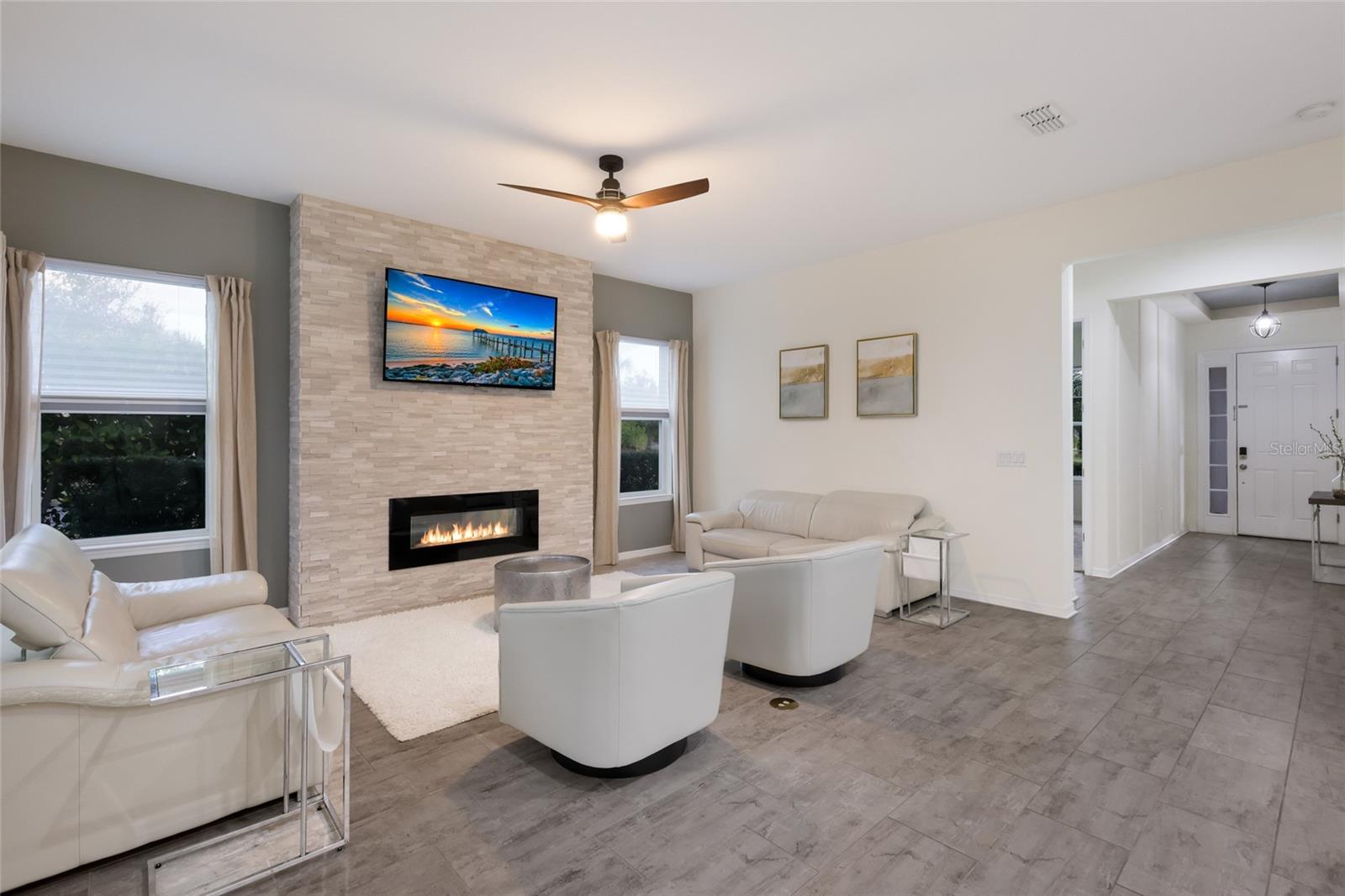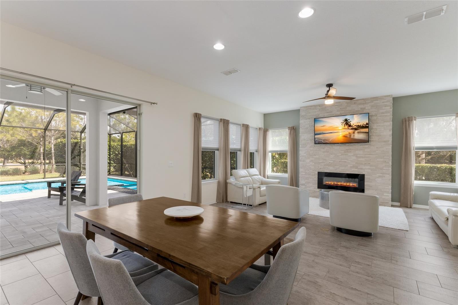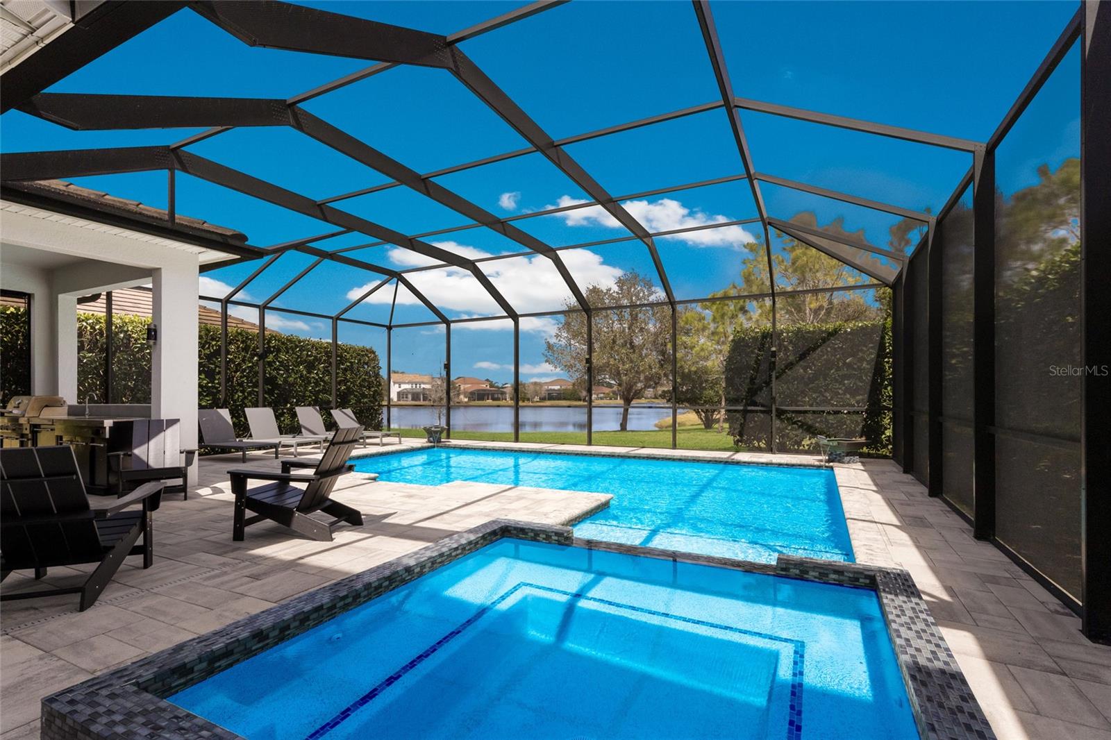 WELCOME to this STUNNING TWO-STORY Palmyra model by Meritage Homes offering 5 bedrooms, 3 bathrooms, a 2 car garage, and 2,906 sq. ft. of thoughtfully designed living space in the sought-after community of Savanna in Lakewood Ranch. Perfectly situated on a CORNER LOT, this home offers both space and privacy and is truly the perfect place to call HOME. As you step inside, you are greeted by a first-floor bedroom and full bathroom complete with a single vanity and walk-in glass shower, making it perfect for guests or a private home office. Continue into the heart of the home where the open-concept kitchen and living room create a bright and welcoming space filled with NATURAL LIGHT from numerous windows and sliders leading to the outdoor lanai and pool area. The living room features a beautiful BUILT-IN STONE ELECTRIC FIREPLACE, creating the perfect spot to relax and unwind after a long day. The chef’s kitchen is fully equipped with ample cabinet space, a TILED backsplash, BUILT-IN oven, cooktop, stainless steel HOOD, and NEW appliances, along with a kitchen island with seating that provides additional workspace and a great gathering place for family and friends. Just off the kitchen is a dining area overlooking the sliders and pool, making it the ideal setting for everyday meals or entertaining. The kitchen space is further enhanced with extended cabinetry offering extra storage and convenience. Upstairs you will find a spacious LOFT/MEDIA ROOM perfect for movie nights, a game room, or additional living space for the family. The expansive primary suite offers a peaceful retreat and features an ENSUITE bathroom with dual sinks and a large walk-in tiled glass shower, while the WALK-IN CLOSET is outfitted with cabinetry providing excellent storage and organization. Three additional bedrooms share a full bathroom with dual sinks and a tub/shower combination, and the laundry room is conveniently located upstairs. Step outside into your PRIVATE outdoor OASIS where the screened-in PAVER lanai features an extended covered area and a fully equipped OUTDOOR KITCHEN with stainless steel appliances and a stone wall bar with seating, creating the perfect space for entertaining. Enjoy the HEATED SALTWATER POOL and SPA, ideal for relaxing while soaking in the beautiful Florida weather. The backyard overlooks a peaceful pond, providing SERENE WATER VIEWS and the perfect backdrop for spectacular sunset evenings. Additional highlights include a built-in SURROUND SOUND SPEAKER SYSTEM on the first floor as well as throughout the outdoor pool area, enhancing both indoor comfort and outdoor entertaining. Savanna is a fabulous community with LOW HOA resort-style amenities such as a clubhouse, swimming pool, state-of-the-art fitness center, basketball courts, playground, dog park and numerous walking paths. Lakewood Ranch is known for their A+ rated school system and is perfectly located just a short ride to downtown Sarasota, St. Pete, world class shopping, fine dining and the FAMOUS Gulf beaches! Don't wait to make this your HOME and begin your FLORIDA Lifestyle!