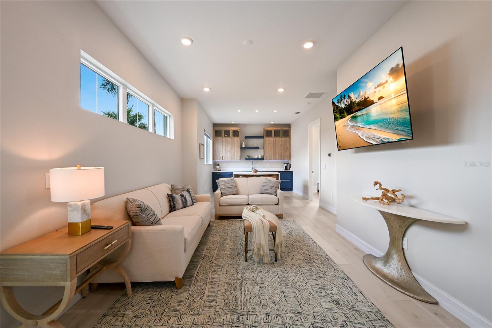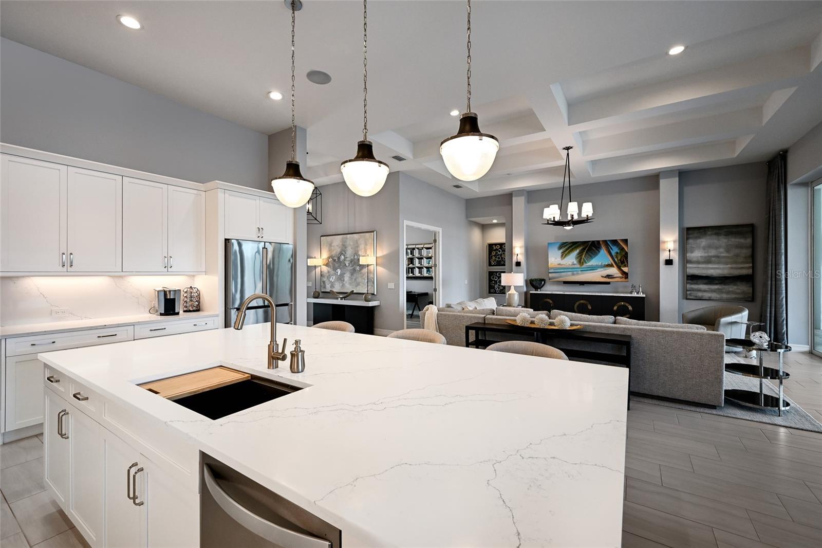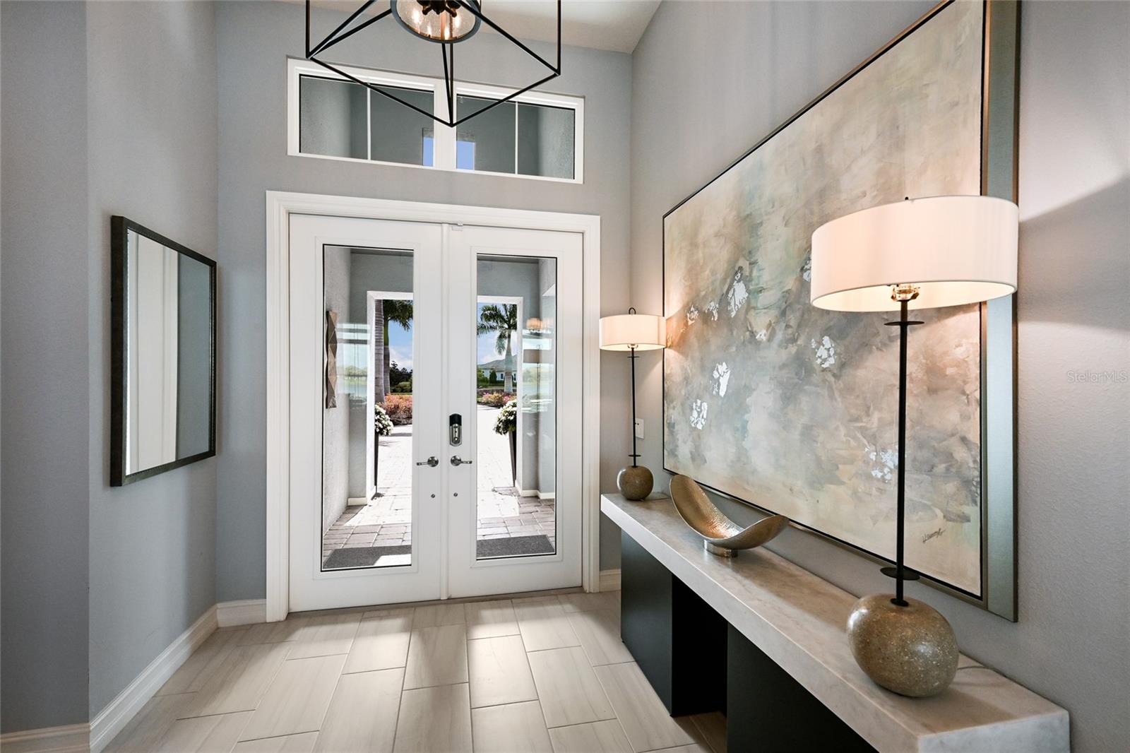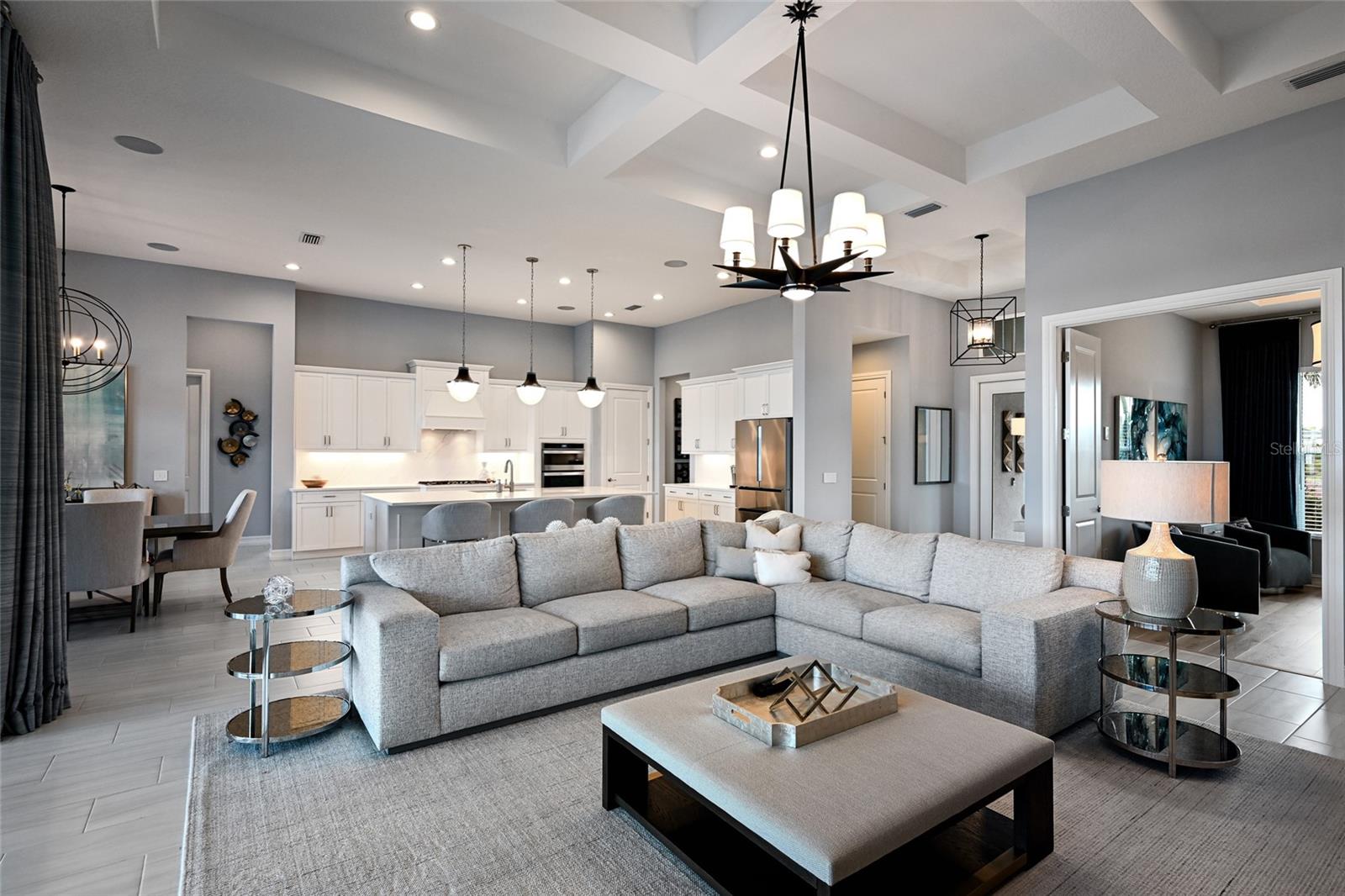 Private estate with a separate guest house positioned on one acre inside the exclusive gated community of The Lake Club with breathtaking lakefront westerly sunset views offers an unparalleled opportunity for flexible luxury living. This exceptional property offers a highly sought-after layout in Lakewood Ranch featuring a 3 bedroom, 3 full bath main residence complemented by a fully independent 2 bedroom, 2 full bath private casita, ideal for extended family, guests, or a dedicated work-from-home retreat. Added in 2024, the newly built separate entry living quarters also boasts a living area, a den and its own kitchenette complete with microwave, refrigerator drawers and dishwasher. Meanwhile, the main house is a stylishly open one-story great room plan plus a study that epitomizes the indoor-outdoor living experience with thoughtfully planned living spaces, accentuated volume ceilings, skillfully selected finishes, and, of course, all IMPACT windows/doors/sliders. The expansive outdoor retreat elevates with a panoramic screened lanai, extensive open and under cover spaces, soaring ceilings, full summer kitchen, PebbleTec heated saltwater pool/spa with sun shelf, and an inviting gas fireplace. Ten foot impact disappearing glass sliders seamlessly connect the outdoor oasis to a luxuriantly welcoming great room, dining area and gourmet kitchen crowned with coffered ceiling, accent wall, and designer light fixtures creating a sophisticated open continuity of space. Off the dining room, the gourmet kitchen further accentuates with wood cabinetry, soft-close dove-tail drawers, newly installed quartz counters and backsplash, stainless steel appliances, wine fridge, and walk-in pantry. The residence also offers an impressive office behind double-entry doors just off the entry foyer. The owner’s quarters positioned on a private wing in the main residence offers double tray ceilings, large scale windows, direct lanai access, two oversized walk-in customized closets, and a spa-like bath with dual station vanity, an oversized shower with designer tile, a large soaking tub, and separate water closet. There are two additional guest suites in the main house, each on a separate wings of the home generous in size with luxury plank vinyl flooring, one offering an ensuite full bath, while the third guest room is just off the home’s pool bath bath. Other notable highlights of this stunning residence includes a brilliantly finished laundry room with cabinetry and sink, tankless water heater, all impact windows and doors, smarthome automation, and an oversized three car air-conditioned garage with epoxy flooring and storage. This rare offering beckons a lifestyle fulfilled in The Lake Club, where residents enjoy access to a wealth of amenities, including two resort-style heated pools, Grande Clubhouse with fine dining and bar area, a fitness center, spa, tennis courts, pickleball, a playground, dog park, and services of a full-time concierge and activities director.