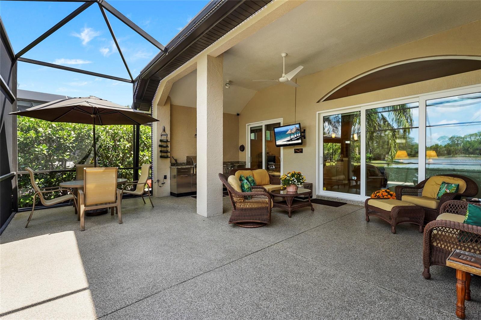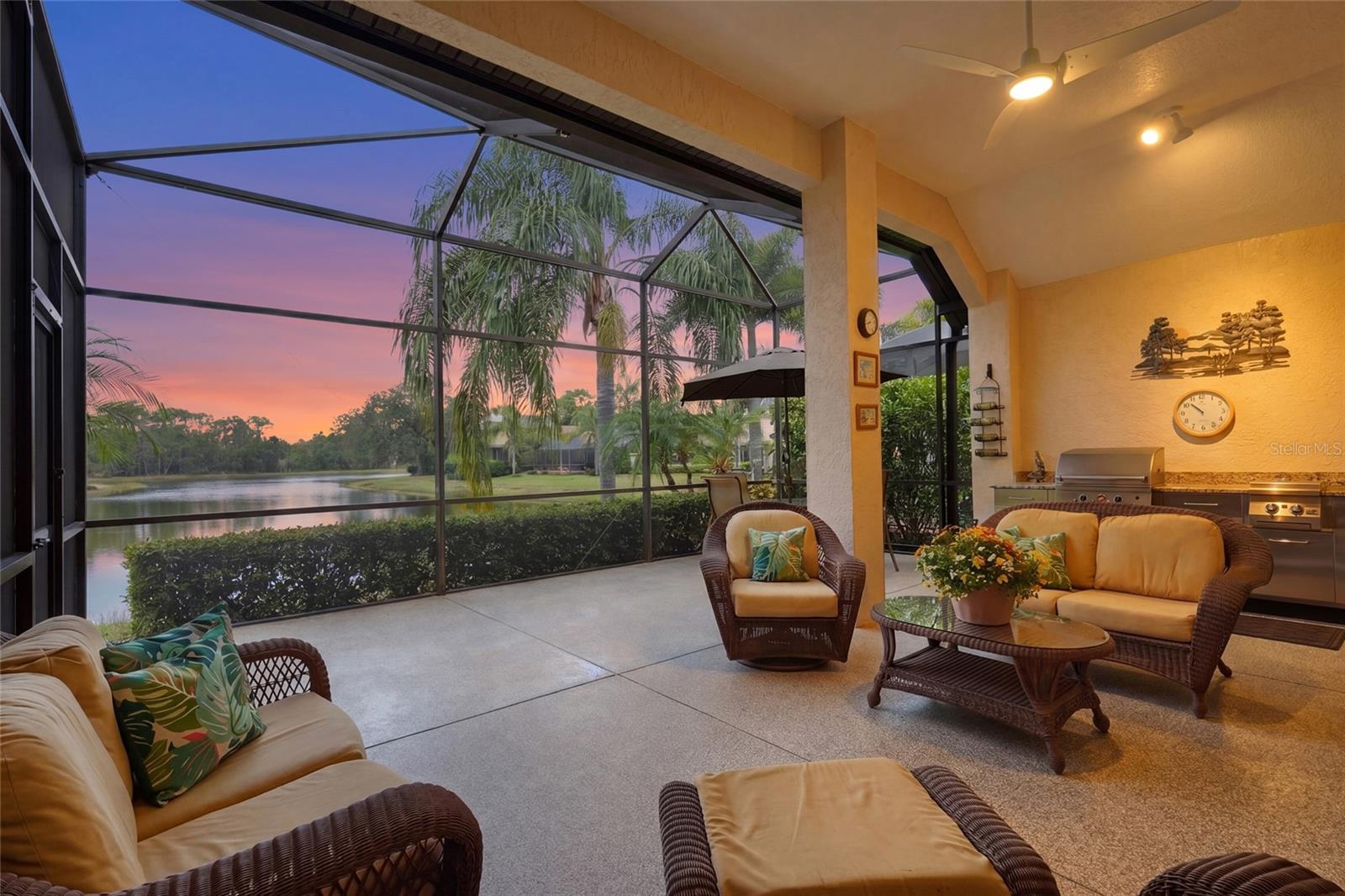 Located on a premium lakefront homesite at the end of a quiet cul-de-sac within Lakewood Ranch Country Club, this 3-bedroom 2-bath residence offers unobstructed water views and a maintenance-free lifestyle. Designed for comfortable living and seamless indoor-outdoor flow, hurricane impact sliders open to an extended lanai overlooking the water creating an ideal space for both everyday use and entertaining. The outdoor area features a gas outdoor kitchen and covered seating. The home is well maintained with a functional layout that includes a spacious main living area, an eat-in kitchen with appliances approximately five years old, a formal dining area, and a split-bedroom floor plan providing privacy for owners and guests. Recent improvements include a new roof (2025) with transferable warranty, exterior repaint (2025), AC system replaced in 2019, and an on-demand hot water heater. Enjoy a maintenance-free lifestyle within Lakewood Ranch Country Club, a gated community offering optional membership with access to championship golf, multiple clubhouses, fitness facilities, tennis and racquet sports, and a variety of social amenities. Conveniently located near Waterside Place, as well as shopping, dining, and everyday conveniences, with easy access to the greater Lakewood Ranch area and surrounding Gulf Coast destinations.