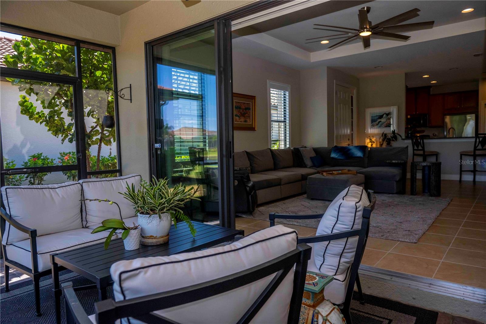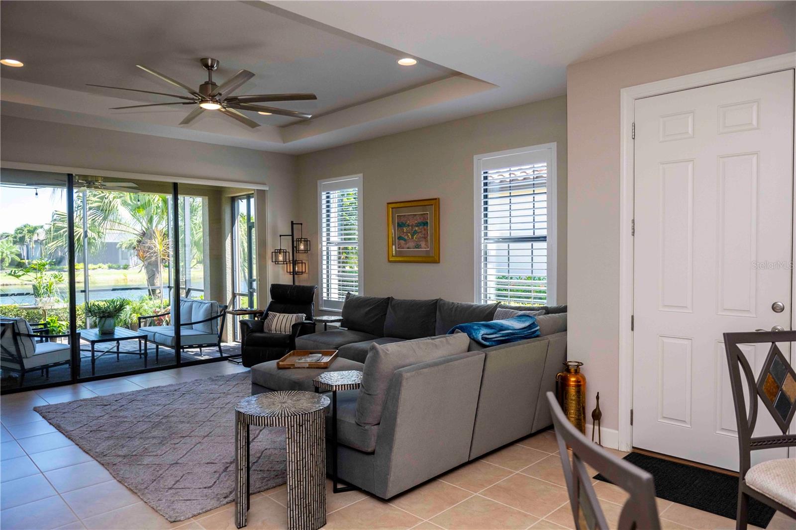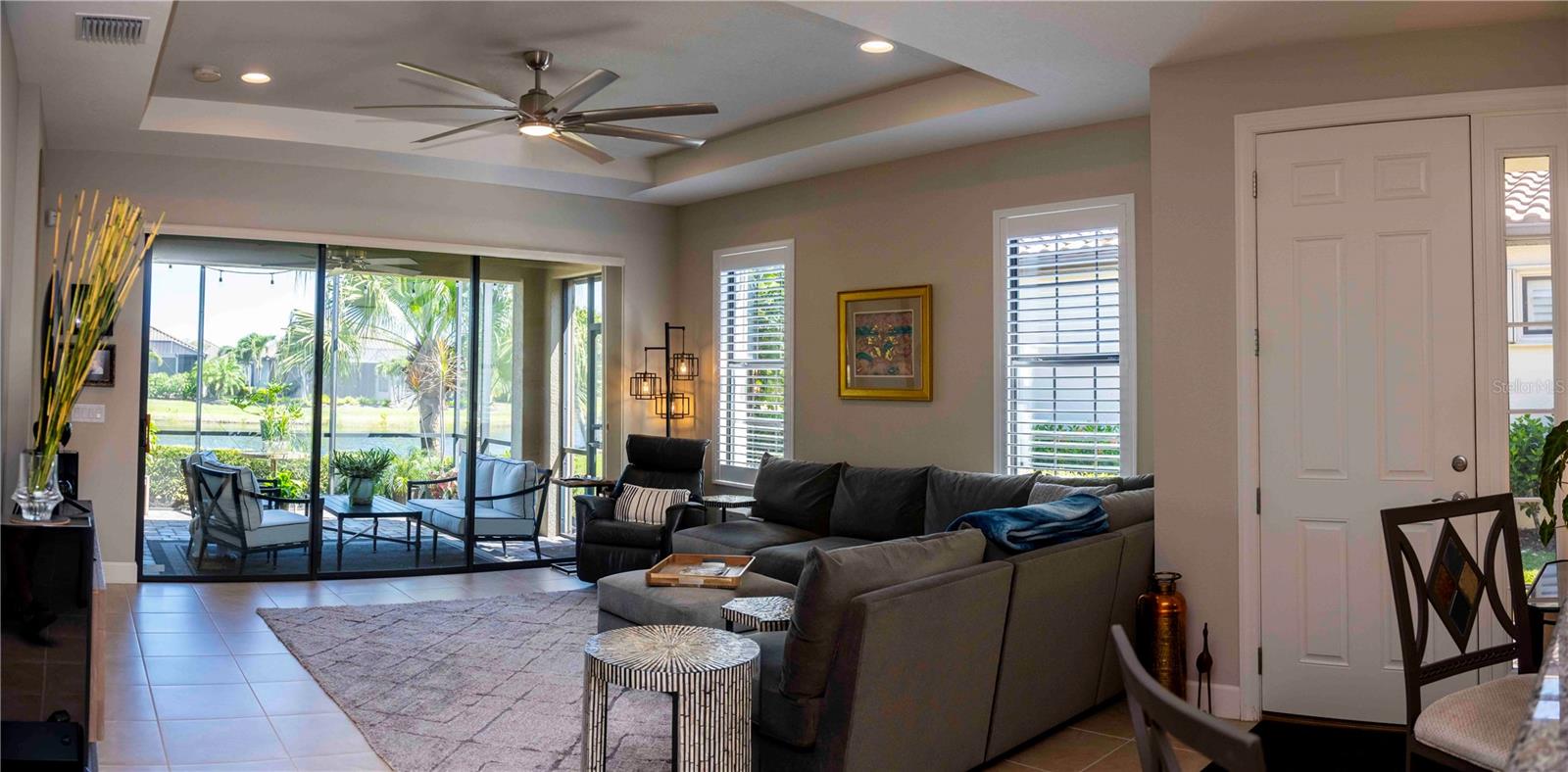 Luxury LAKEFRONT Living in Esplanade at Lakewood Ranch! Welcome to 13119 Prima Dr., a beautifully upgraded Roma floor plan villa in the highly sought-after Esplanade Golf & Country Club. Offering 2 bedrooms, 2 bathrooms, a private den, and peaceful pond views, this impeccably maintained home delivers the perfect blend of comfort, style, and resort living. From the moment you step inside, you’re greeted by an open, light-filled layout featuring tile flooring throughout the main living areas, 8-foot doors and tray ceilings. The thoughtfully designed kitchen is a standout, complete with 42” maple cabinetry with crown molding, soft-close drawers, pull-out shelving, under-cabinet lighting, granite countertops, stainless steel appliances, and a spacious breakfast bar—ideal for both everyday living and entertaining. The primary suite is a private retreat, showcasing serene water views through bay windows, a large custom walk-in closet, and an ensuite bath with dual vanities, an expansive walk-in shower, and private water closet. The guest bedroom also features a custom walk-in closet, offering both comfort and exceptional storage for visitors. Custom shelving has been thoughtfully installed in both bedroom closets for added organization and functionality. The den, enclosed with French doors, offers flexibility as a home office, hobby room, or additional guest space. Step outside to your EXTENDED screened-in lanai with paver flooring and take in the tranquil pond views—your own peaceful escape. The extended outdoor living space is perfect for relaxing or entertaining, and the backyard offers ample room to add a custom pool, creating the ultimate Florida oasis. Additional features include a 2-car garage with built-in storage, hurricane shutters, a dedicated laundry room with cabinetry, custom plantation shutters, fresh landscaping, and a NEW Trane A/C system installed July 2025. Living in Esplanade means enjoying a true resort lifestyle. Amenities include an 18-hole championship golf course (pay-to-play), multiple resort-style pools, fitness centers, pickleball and bocce courts, a full-service spa, dog parks, and a vibrant social calendar. The Culinary Center and Barrel House Bistro offer dining, wine tastings, and events right within the community. This is a Non-Deeded Golf Home. You can pay to play. FURNITURE IS AVAILABLE. Ideally located just minutes from I-75, UTC Mall, Waterside, SRQ Airport, and a short drive to downtown Sarasota, world-class dining, and Gulf Coast beaches—this home truly has it all. Move-in ready and packed with upgrades—this is Florida living at its finest. Don’t miss it.