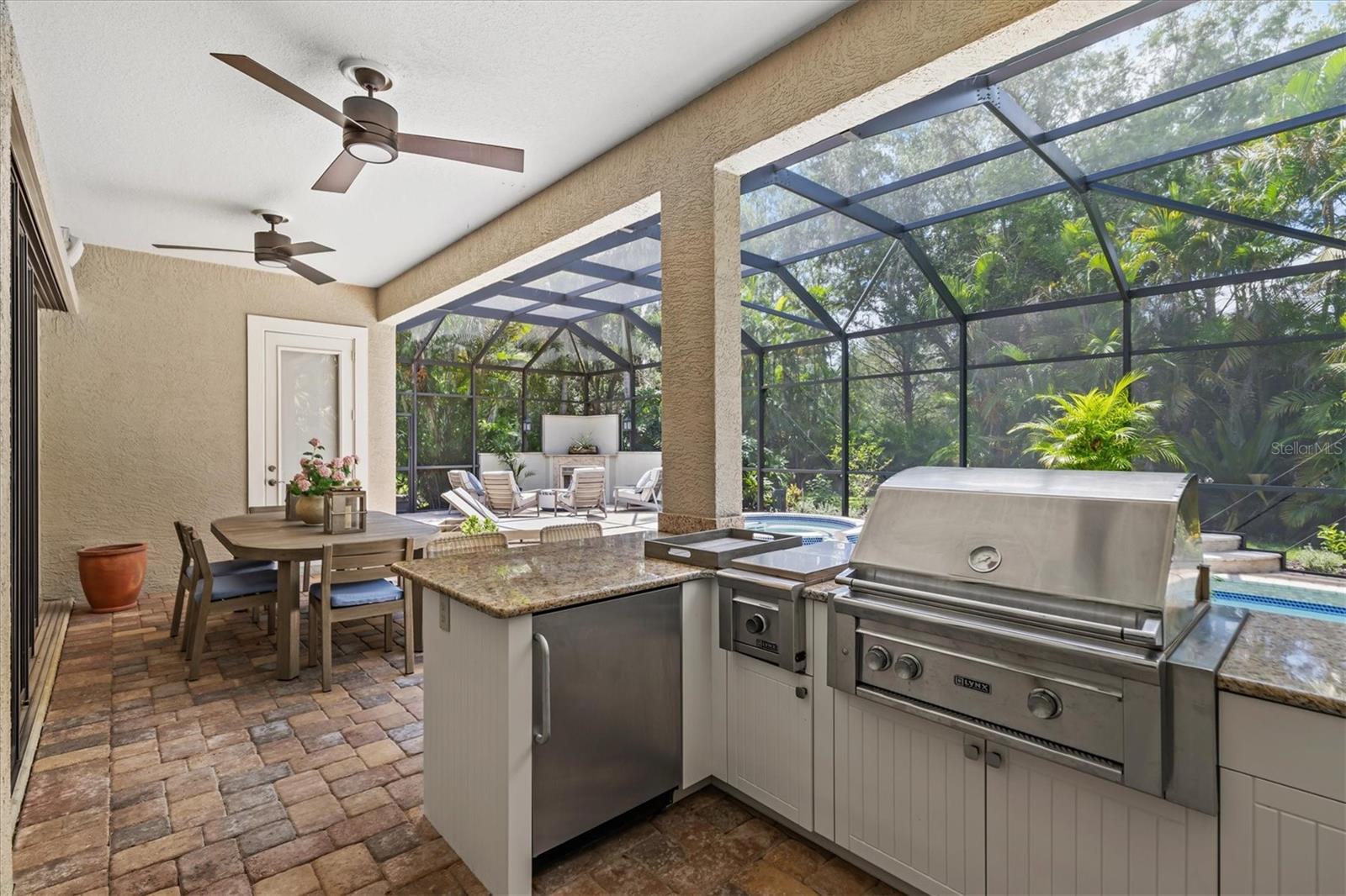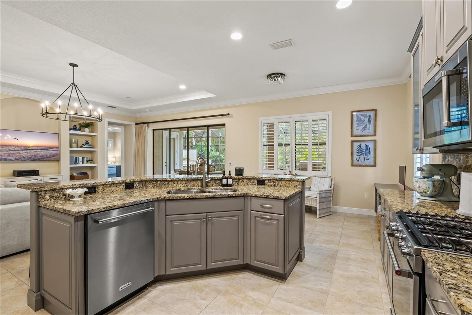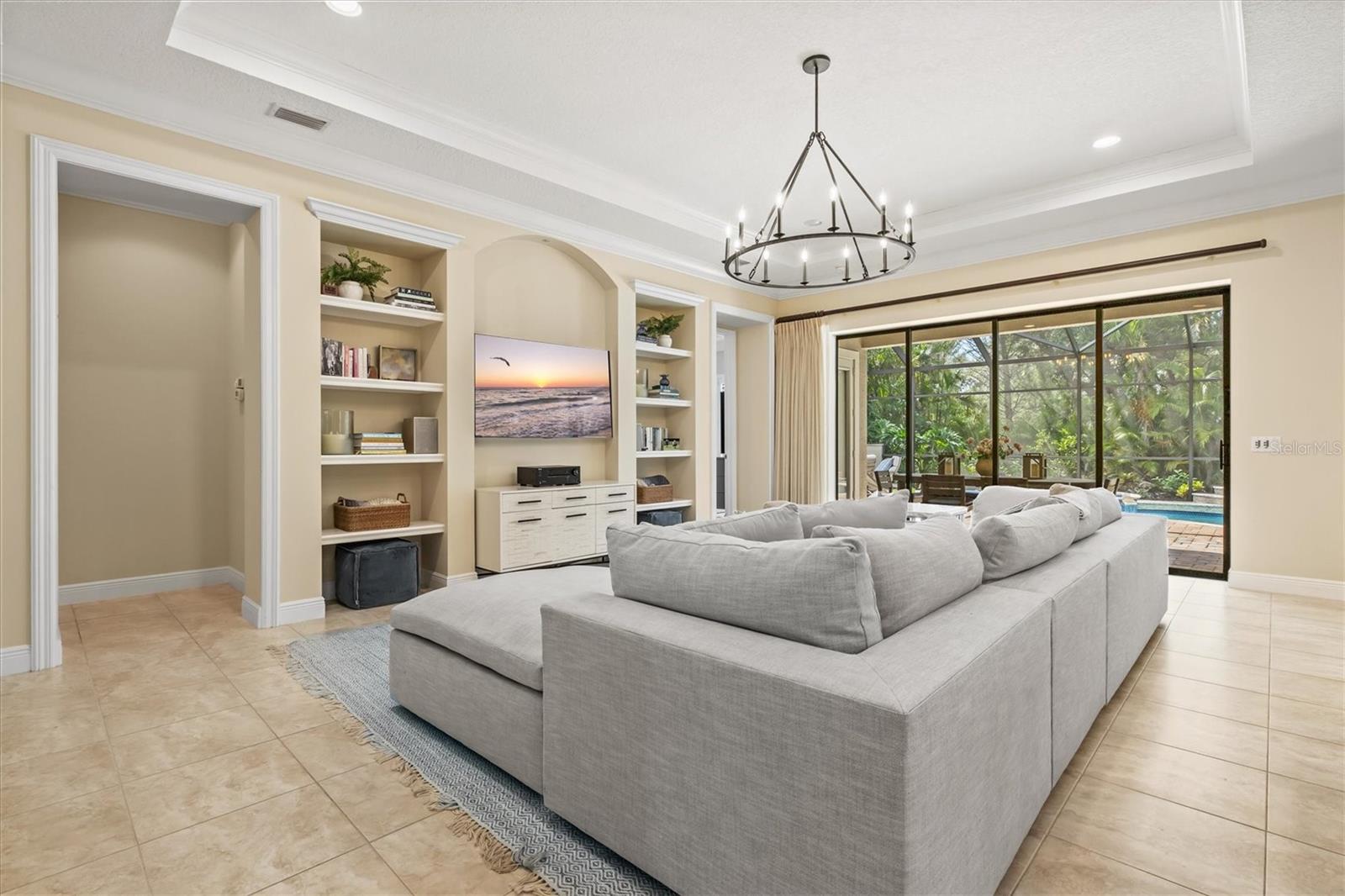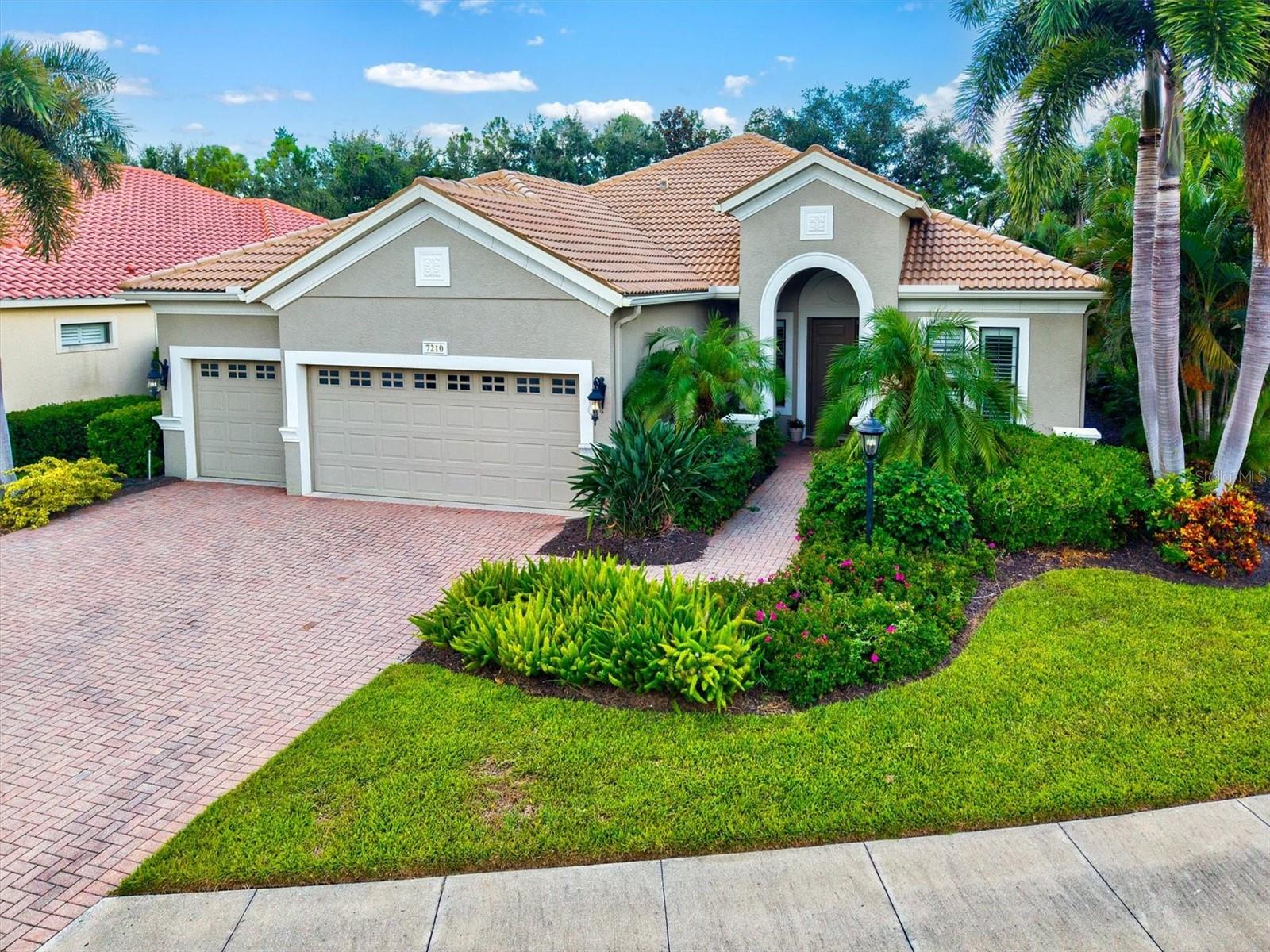 Immaculate Maintenance-Free Home in Stone Ridge at Lakewood Ranch Country Club. Located within the gates of Lakewood Ranch Country Club, this meticulously maintained Savona model by Neal Communities sits on a private oversized cul-de-sac lot. Offering nearly 2,500 sq. ft. of living space, the home features 3 bedrooms, a den, and a 3-car garage. Step inside to soaring 10-foot ceilings with coffered details, crown molding in every room, plantation shutters, and custom window treatments. Tile floors flow throughout, with wood-look plank tile in the owner’s suite, den, and bedrooms. All lighting and ceiling fans have been thoughtfully updated. The den, accented with glass-pane French doors, provides the perfect home office or quiet retreat. The formal living and dining areas set the tone, while the open-concept family room with custom built-ins and disappearing sliders expands seamlessly to the lanai. The adjoining kitchen showcases upgraded cabinetry with glass-front uppers, granite countertops, stainless-steel appliances, a built-in desk, breakfast bar, and casual dining nook. The spacious owner’s suite offers lanai access, a sitting area, and an en suite bath with soaking tub, dual vanities, walk-in shower, private water closet, and a custom-fitted walk-in closet. Outdoor living is unmatched here. This home boasts the largest lanai in the neighborhood, highlighted by a sparkling pool and spa, custom gas fireplace, lush landscaping, and complete privacy. The outdoor kitchen features granite counters, a gas grill, side burner, refrigerator, and sink. A covered dining space, cabana bath, and outdoor shower make this a true retreat for relaxing or entertaining. Membership at Lakewood Ranch Country Club is optional, but available, with access to golf, tennis, fitness, dining, and resort-style pools. All this, just minutes from award-winning beaches, fine dining, and world-class shopping.