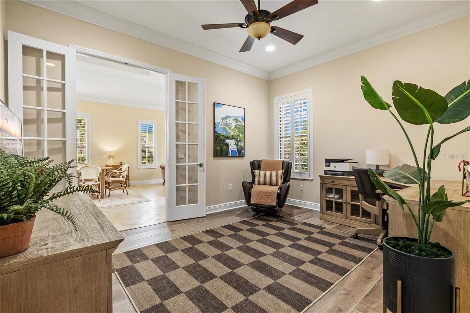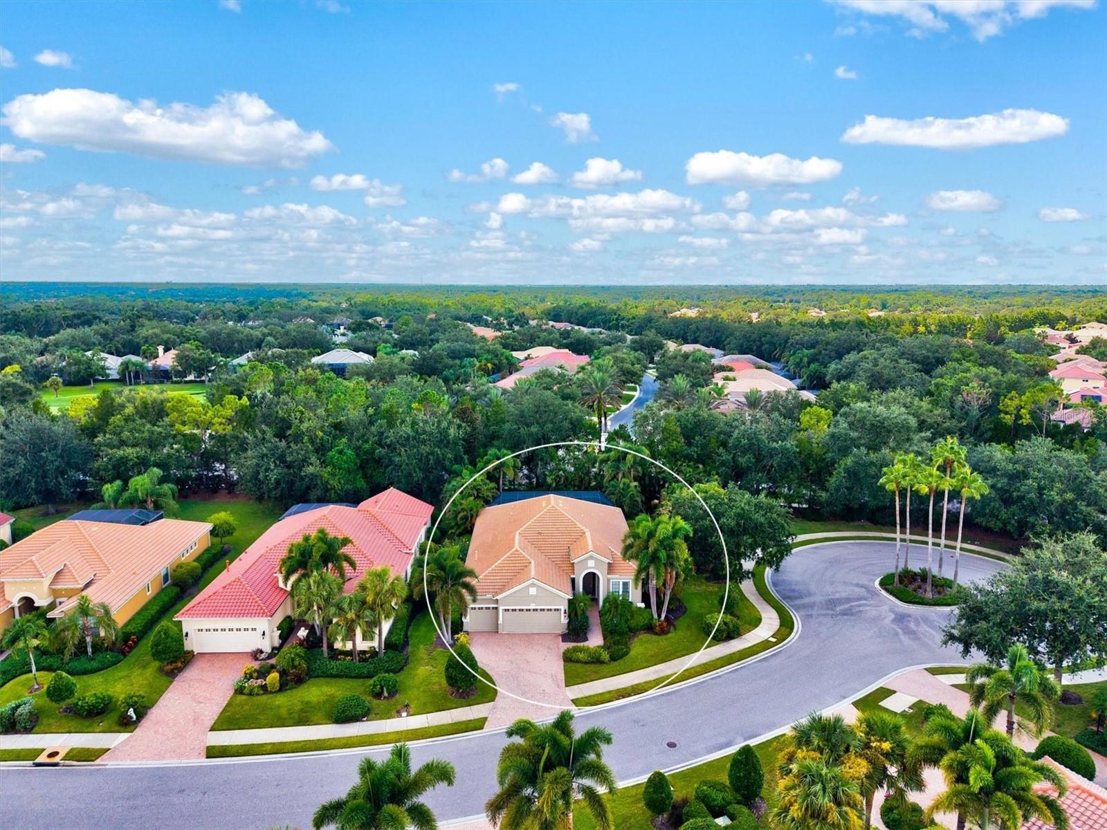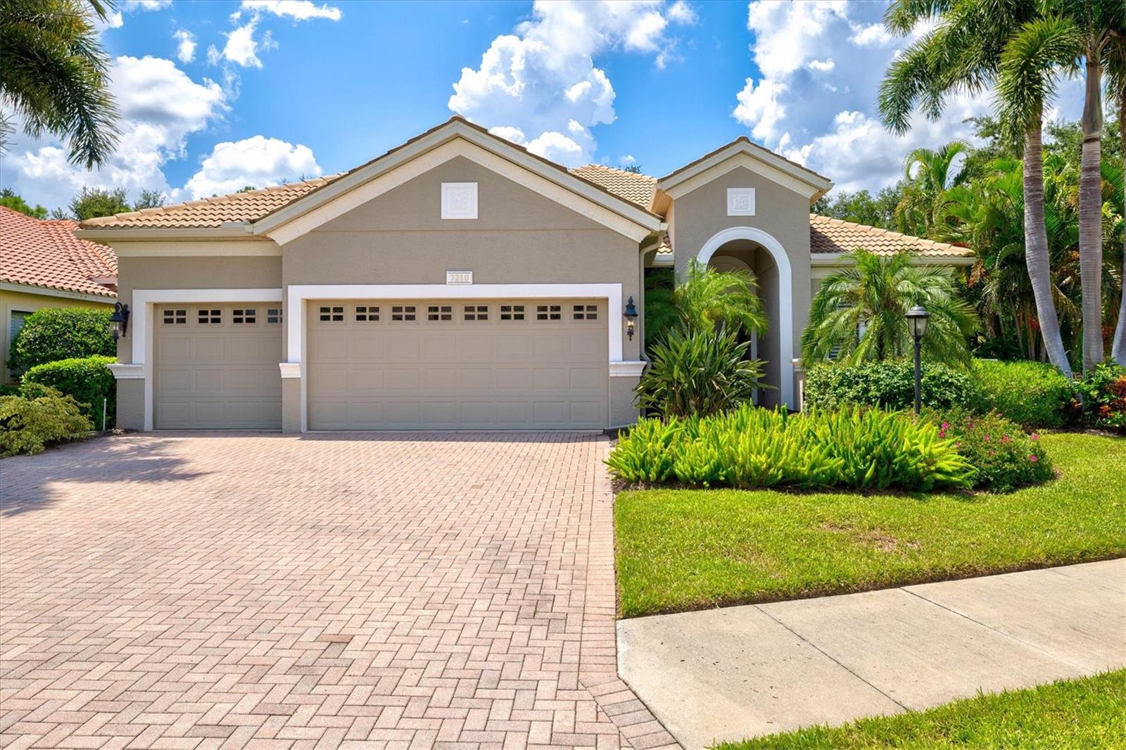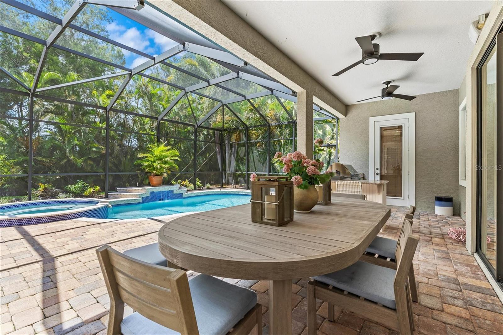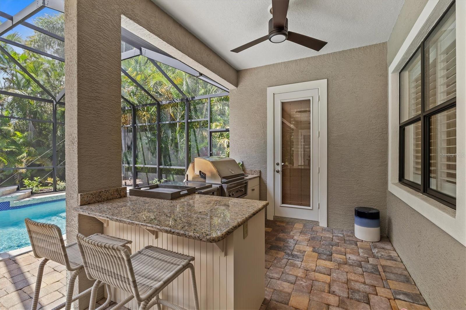 Immaculate Maintenance-Free Home in Stone Ridge at Lakewood Ranch Country Club. Located within the gates of Lakewood Ranch Country Club, this meticulously maintained Savona model by Neal Communities sits on a private oversized cul-de-sac lot. Offering nearly 2,500 sq. ft. of living space, the home features 3 bedrooms, a den, and a 3-car garage. Step inside to soaring 10-foot ceilings with coffered details, crown molding in every room, plantation shutters, and custom window treatments. Tile floors flow throughout, with wood-look plank tile in the owner’s suite, den, and bedrooms. All lighting and ceiling fans have been thoughtfully updated. The den, accented with glass-pane French doors, provides the perfect home office or quiet retreat. The formal living and dining areas set the tone, while the open-concept family room with custom built-ins and disappearing sliders expands seamlessly to the lanai. The adjoining kitchen showcases upgraded cabinetry with glass-front uppers, granite countertops, stainless-steel appliances, a built-in desk, breakfast bar, and casual dining nook. The spacious owner’s suite offers lanai access, a sitting area, and an en suite bath with soaking tub, dual vanities, walk-in shower, private water closet, and a custom-fitted walk-in closet. Outdoor living is unmatched here. This home boasts the largest lanai in the neighborhood, highlighted by a sparkling pool and spa, custom gas fireplace, lush landscaping, and complete privacy. The outdoor kitchen features granite counters, a gas grill, side burner, refrigerator, and sink. A covered dining space, cabana bath, and outdoor shower make this a true retreat for relaxing or entertaining. Membership at Lakewood Ranch Country Club is optional, but available, with access to golf, tennis, fitness, dining, and resort-style pools. All this, just minutes from award-winning beaches, fine dining, and world-class shopping.