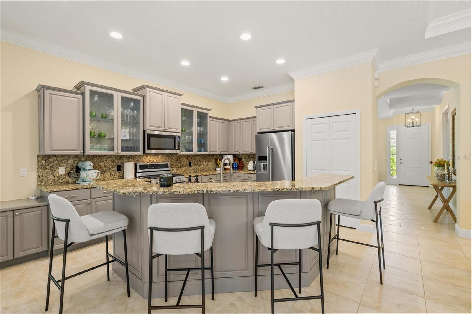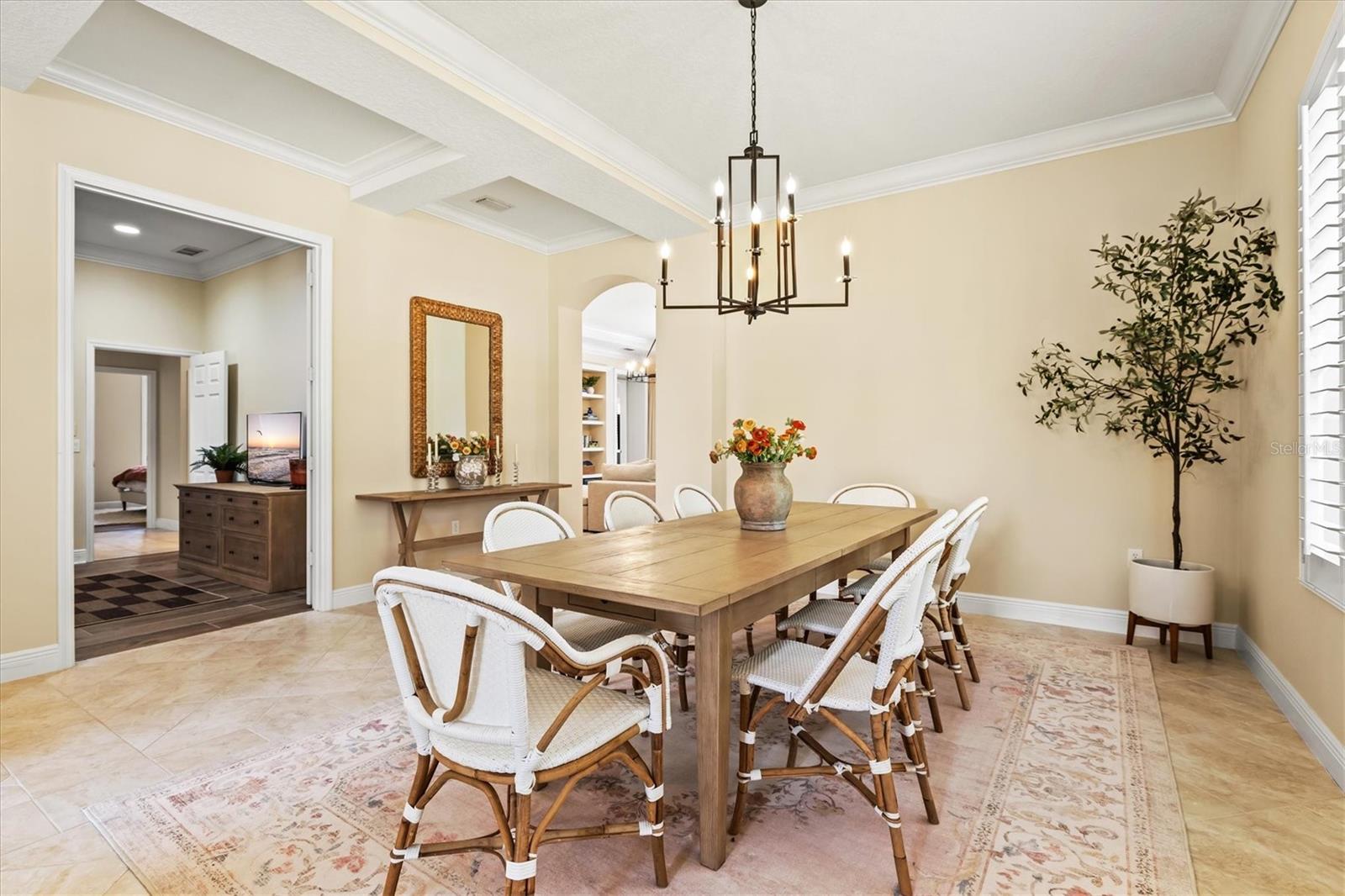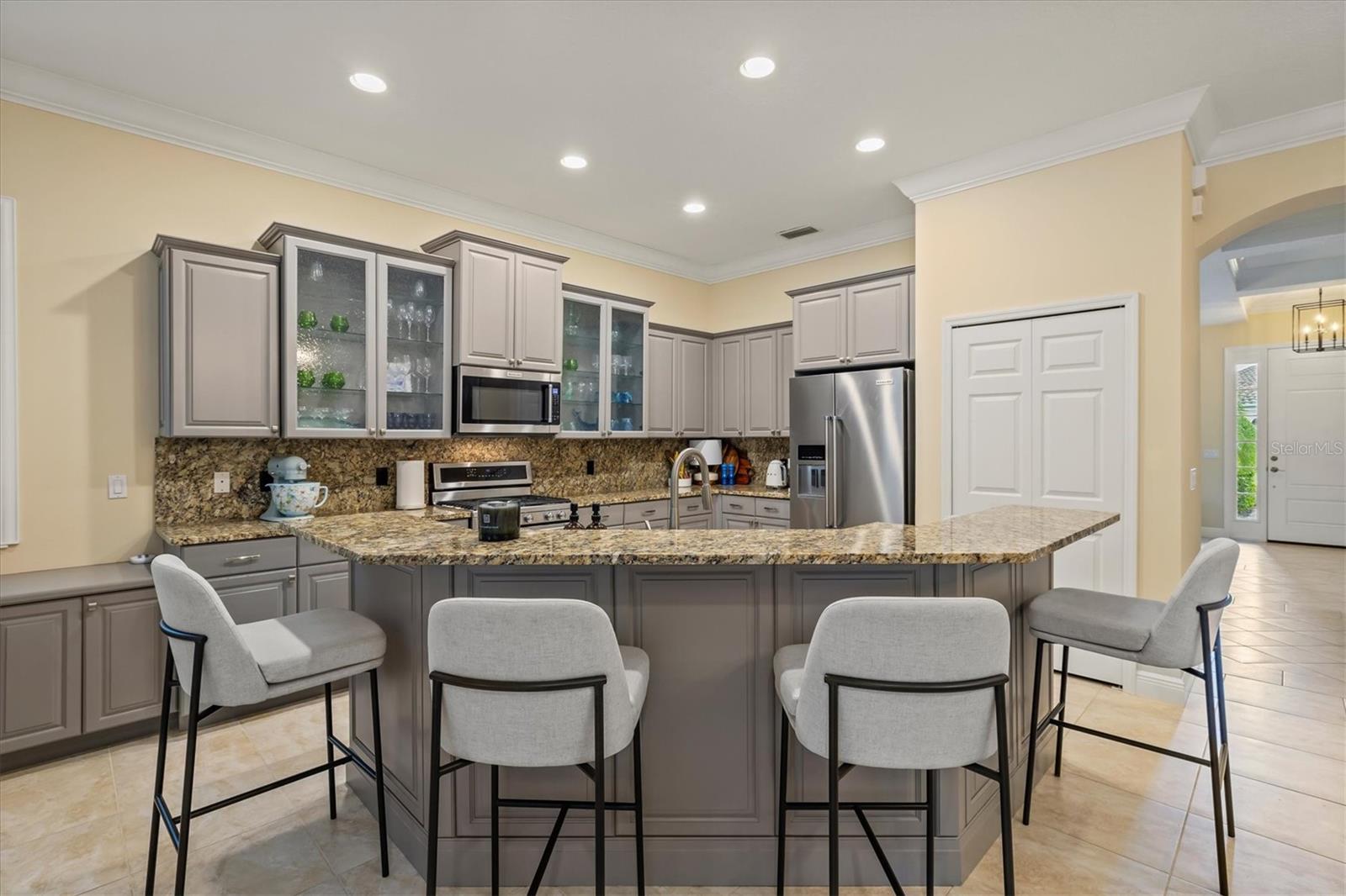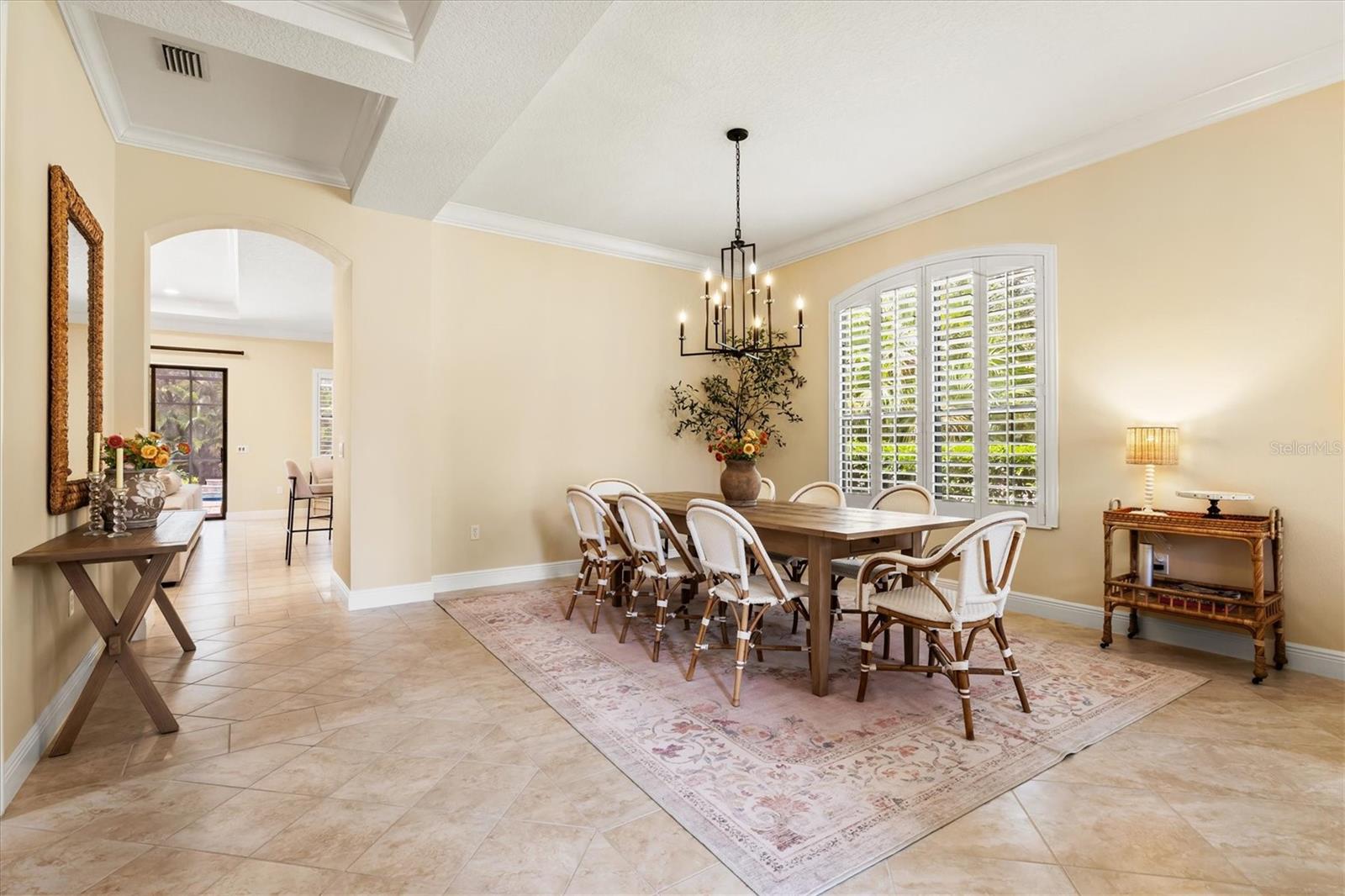 Immaculate Maintenance-Free Home in Stone Ridge at Lakewood Ranch Country Club. Located within the gates of Lakewood Ranch Country Club, this meticulously maintained Savona model by Neal Communities sits on a private oversized cul-de-sac lot. Offering nearly 2,500 sq. ft. of living space, the home features 3 bedrooms, a den, and a 3-car garage. Step inside to soaring 10-foot ceilings with coffered details, crown molding in every room, plantation shutters, and custom window treatments. Tile floors flow throughout, with wood-look plank tile in the owner’s suite, den, and bedrooms. All lighting and ceiling fans have been thoughtfully updated. The den, accented with glass-pane French doors, provides the perfect home office or quiet retreat. The formal living and dining areas set the tone, while the open-concept family room with custom built-ins and disappearing sliders expands seamlessly to the lanai. The adjoining kitchen showcases upgraded cabinetry with glass-front uppers, granite countertops, stainless-steel appliances, a built-in desk, breakfast bar, and casual dining nook. The spacious owner’s suite offers lanai access, a sitting area, and an en suite bath with soaking tub, dual vanities, walk-in shower, private water closet, and a custom-fitted walk-in closet. Outdoor living is unmatched here. This home boasts the largest lanai in the neighborhood, highlighted by a sparkling pool and spa, custom gas fireplace, lush landscaping, and complete privacy. The outdoor kitchen features granite counters, a gas grill, side burner, refrigerator, and sink. A covered dining space, cabana bath, and outdoor shower make this a true retreat for relaxing or entertaining. Membership at Lakewood Ranch Country Club is optional, but available, with access to golf, tennis, fitness, dining, and resort-style pools. All this, just minutes from award-winning beaches, fine dining, and world-class shopping.