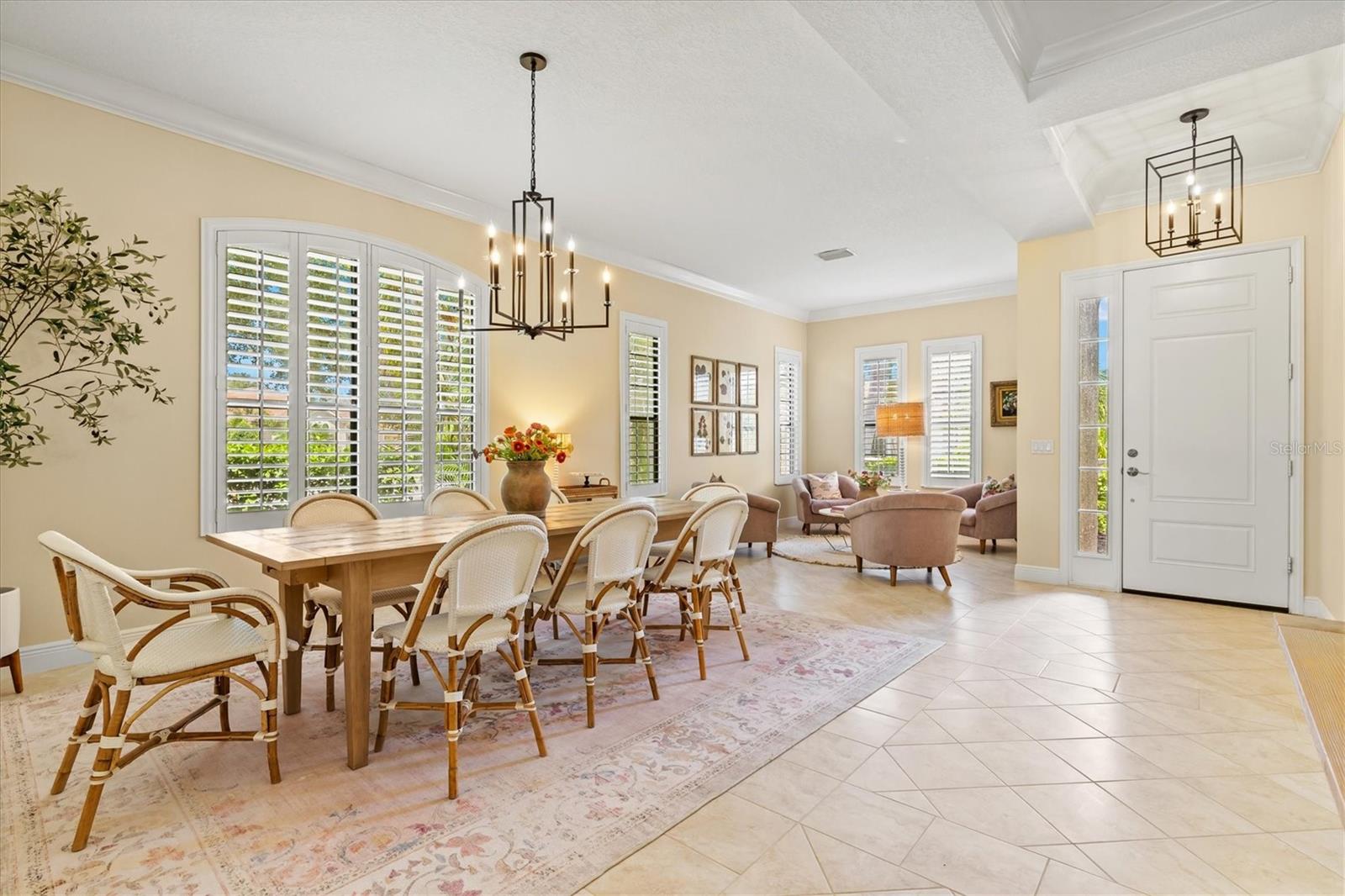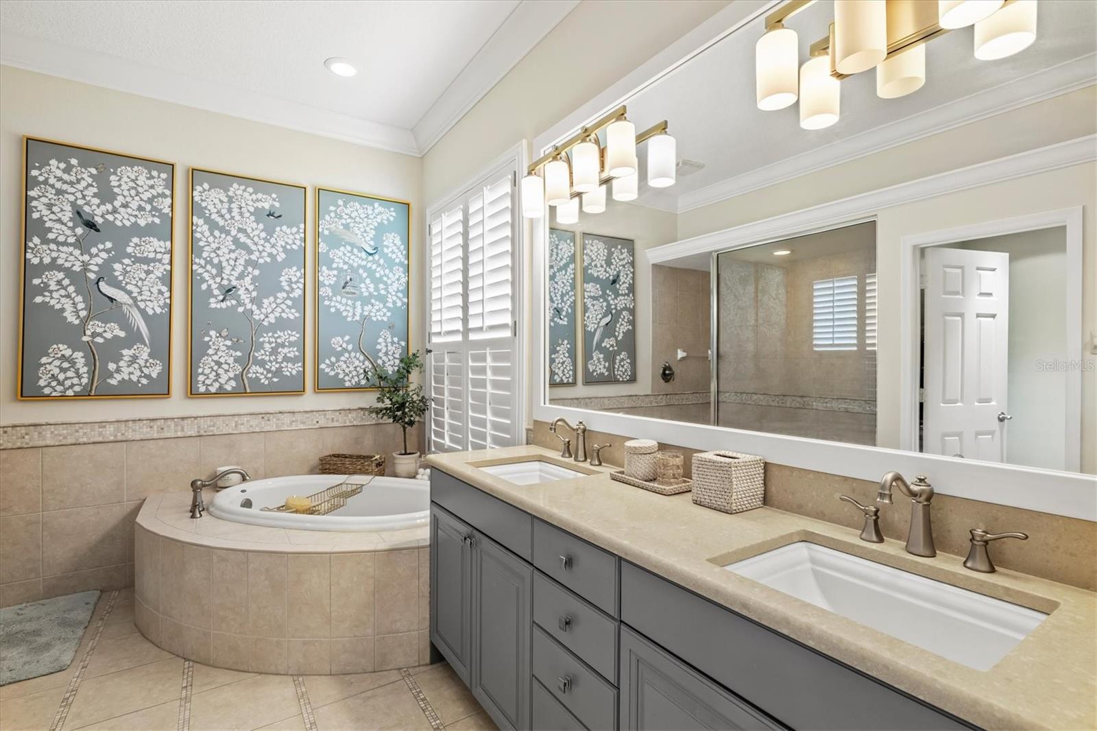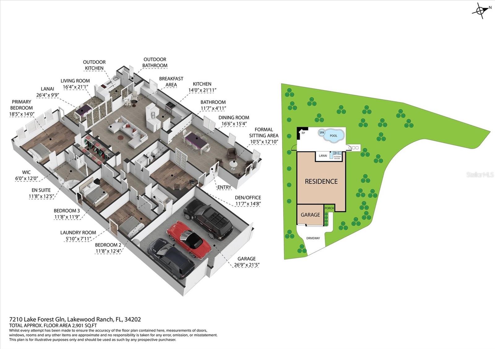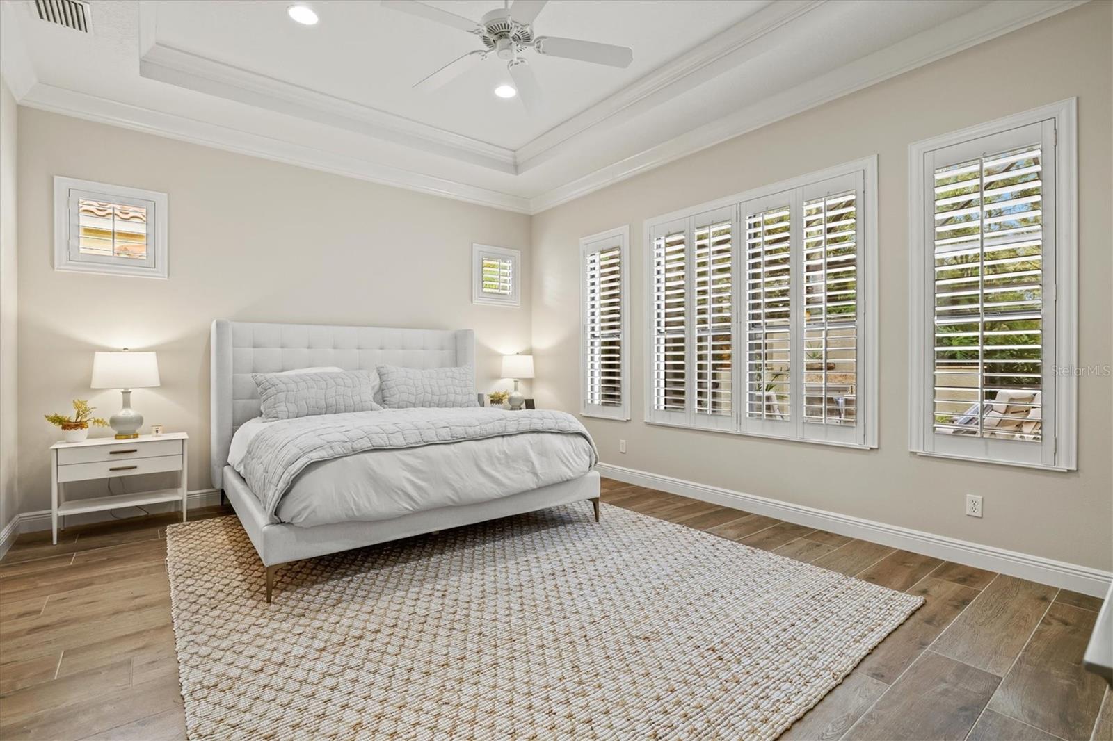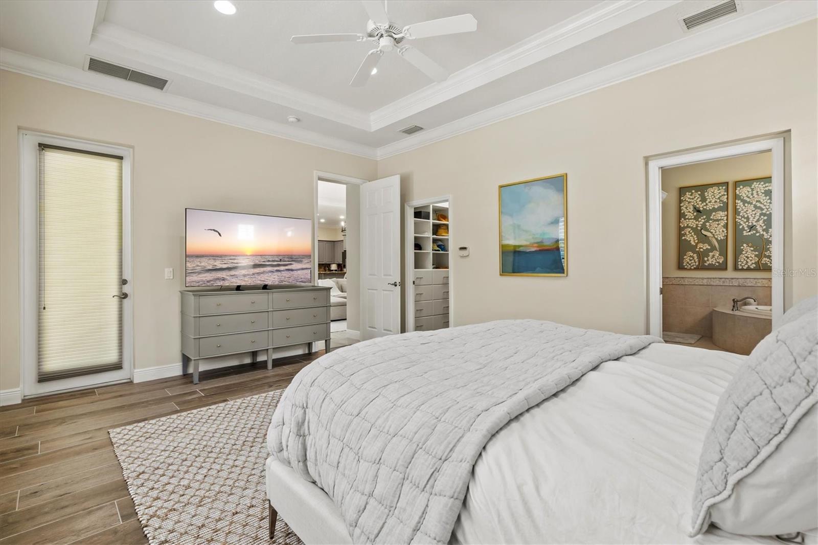 Immaculate Maintenance-Free Home in Stone Ridge at Lakewood Ranch Country Club. Located within the gates of Lakewood Ranch Country Club, this meticulously maintained Savona model by Neal Communities sits on a private oversized cul-de-sac lot. Offering nearly 2,500 sq. ft. of living space, the home features 3 bedrooms, a den, and a 3-car garage. Step inside to soaring 10-foot ceilings with coffered details, crown molding in every room, plantation shutters, and custom window treatments. Tile floors flow throughout, with wood-look plank tile in the owner’s suite, den, and bedrooms. All lighting and ceiling fans have been thoughtfully updated. The den, accented with glass-pane French doors, provides the perfect home office or quiet retreat. The formal living and dining areas set the tone, while the open-concept family room with custom built-ins and disappearing sliders expands seamlessly to the lanai. The adjoining kitchen showcases upgraded cabinetry with glass-front uppers, granite countertops, stainless-steel appliances, a built-in desk, breakfast bar, and casual dining nook. The spacious owner’s suite offers lanai access, a sitting area, and an en suite bath with soaking tub, dual vanities, walk-in shower, private water closet, and a custom-fitted walk-in closet. Outdoor living is unmatched here. This home boasts the largest lanai in the neighborhood, highlighted by a sparkling pool and spa, custom gas fireplace, lush landscaping, and complete privacy. The outdoor kitchen features granite counters, a gas grill, side burner, refrigerator, and sink. A covered dining space, cabana bath, and outdoor shower make this a true retreat for relaxing or entertaining. Membership at Lakewood Ranch Country Club is optional, but available, with access to golf, tennis, fitness, dining, and resort-style pools. All this, just minutes from award-winning beaches, fine dining, and world-class shopping.