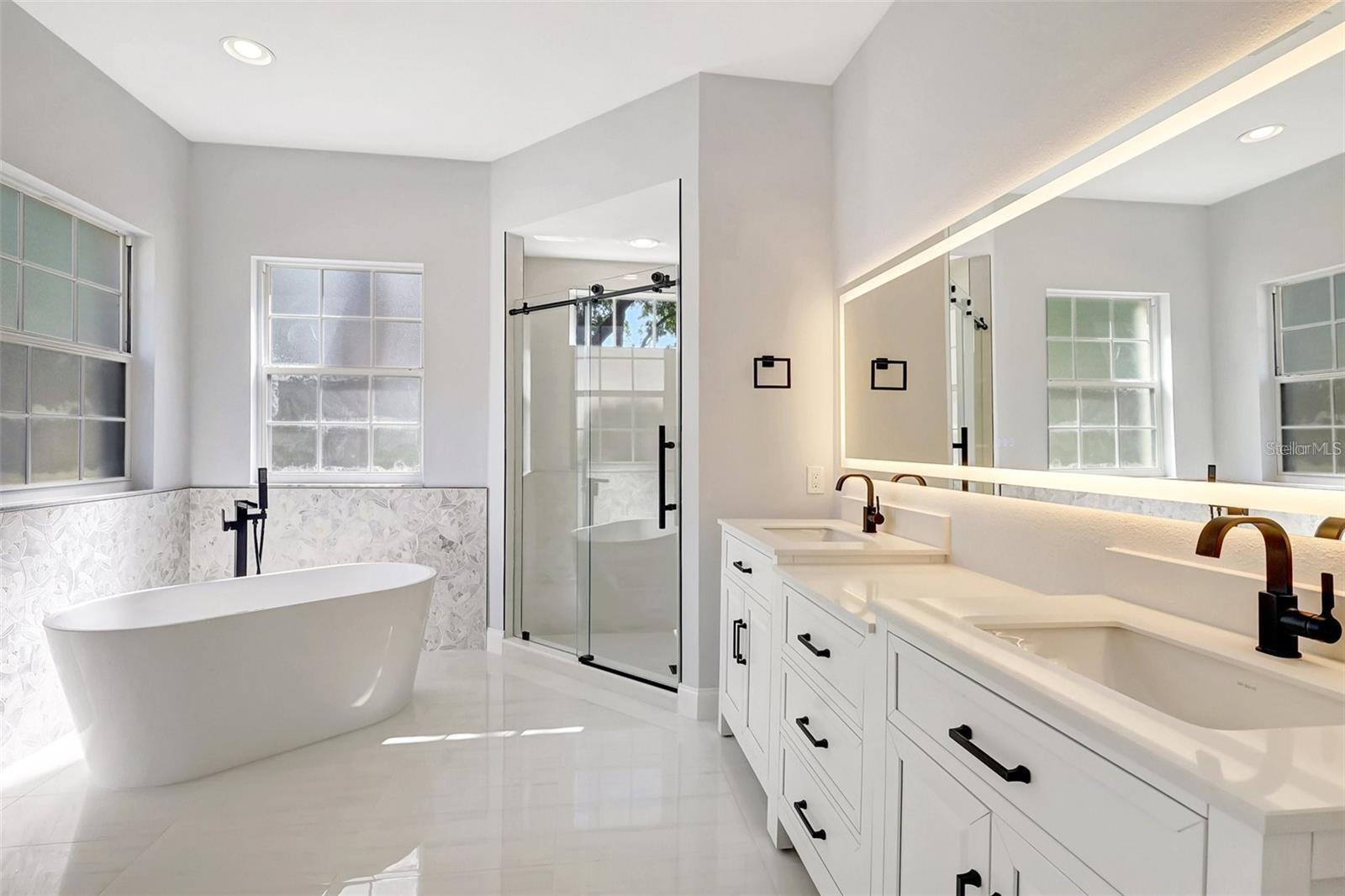 Welcome to this beautifully FULLY RENOVATED 4-bedroom, 3-bathroom home located in the desirable Summerfield Village community of Lakewood Ranch. With 2,317 square feet of updated living space on a spacious 0.26-acre lot, this home offers a perfect blend of comfort, style, and modern convenience. The curb appeal is immediately inviting with meticulously maintained landscaping and elegant palm trees framing the entrance. Inside, natural light pours through large windows, highlighting the sleek luxury tile flooring and open, airy layout. The heart of the home is the thoughtfully designed kitchen, featuring brand-new 2024 stainless steel appliances, expansive quartz countertops, and high-end cabinetry. Whether you're preparing meals for the family or entertaining guests, this kitchen offers both beauty and functionality. The primary suite provides a peaceful escape with large windows overlooking the pool and a walk-in closet for ample storage. The ensuite bathroom offers spa-like finishes including a freestanding soaking tub, a modern glass-enclosed shower with rainfall and handheld options, dual vanities topped with quartz, stylish vessel sinks, and ambient lighting throughout. Step outside into your private outdoor oasis. The screened-in lanai surrounds a sparkling pool and offers plenty of space for relaxing, grilling, or dining outdoors. The backyard is ideal for pets, play, or simply enjoying the peaceful surroundings. Summerfield Village is known for its scenic charm and community-focused atmosphere. Residents enjoy close proximity to parks, top-rated schools, shopping and dining at UTC, and some of Florida's most beautiful beaches. This fully updated home is move-in ready and offers the lifestyle and location that make Lakewood Ranch one of the most sought-after areas on the Gulf Coast.