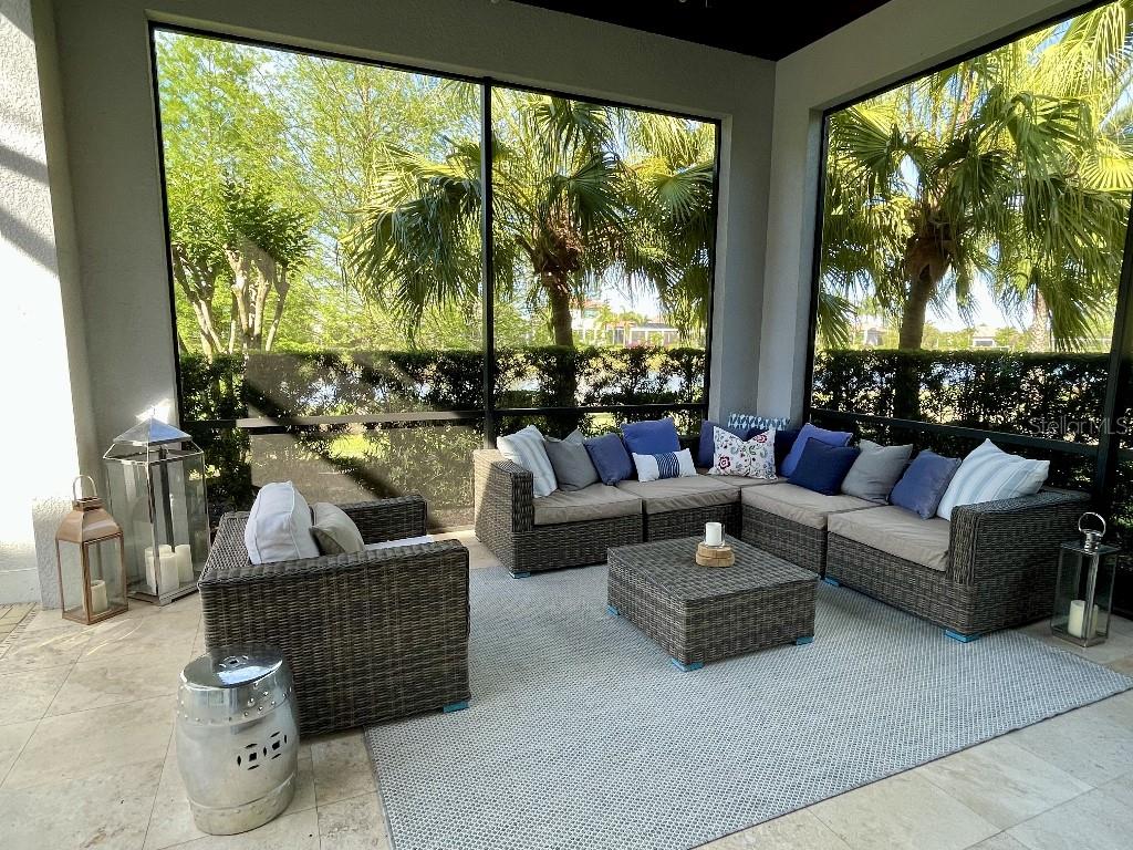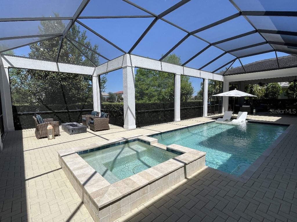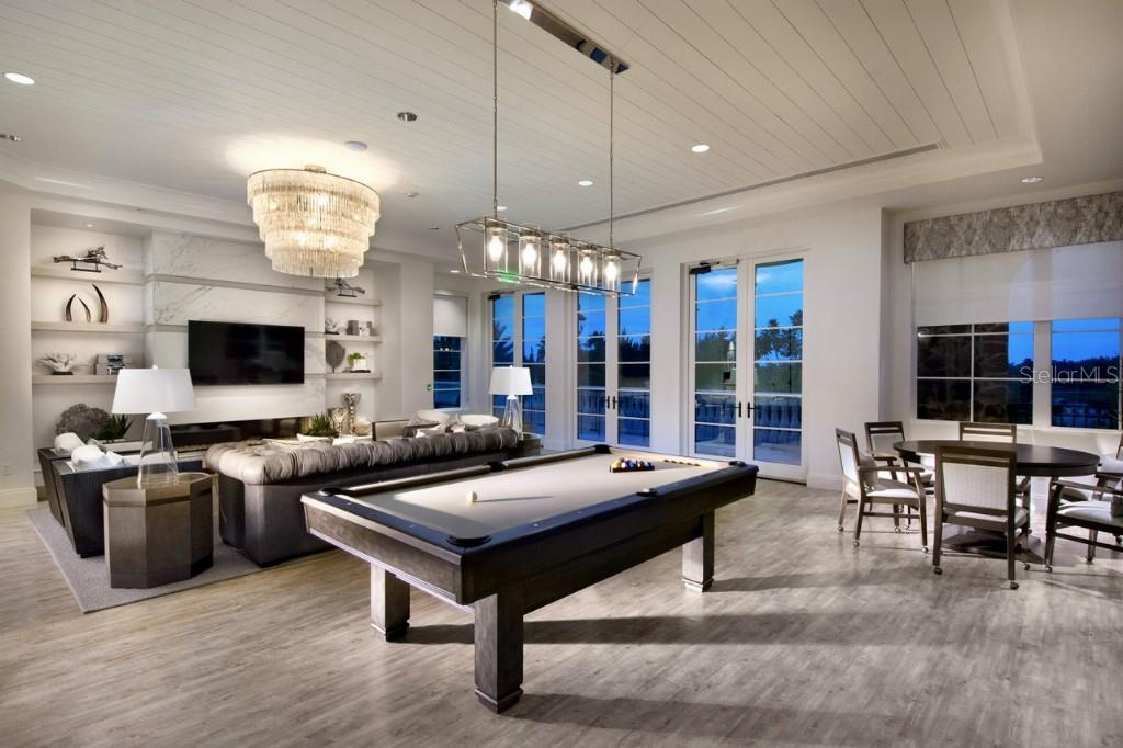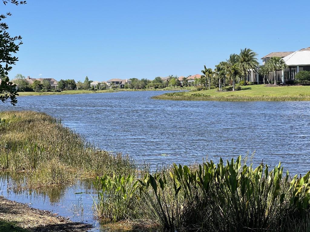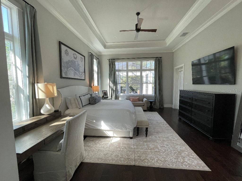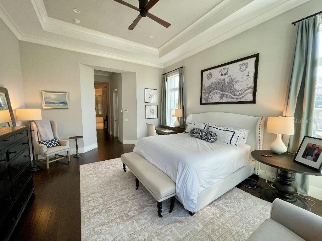 This is a rare opportunity to own an expansive, coastal contemporary lakefront home in the Lake Club, the most exclusive enclave of Lakewood Ranch. This custom-built home offers the pinnacle of relaxed luxury living with elegance and sophistication etched into every detail. Set in the heart of the Lake Club on a lakefront lot front by a serene linear park, this home provides a perfect balance of privacy and panoramic beauty. The architecture merges coastal elegance with contemporary grace, featuring soaring 13-foot ceilings that create an airy sanctuary on the first floor. Across 5,179 sq ft of impeccably designed interior living space incorporating 5 bedrooms and 4.5 baths and 7,829 Sq ft total under roof, the home hosts five bedrooms to comfortably accommodate family and guests. The heart of the home is the expansive great room and massive kitchen and island, equipped with a high-end Sub-Zero refrigerator, wine refrigerator, and Wolf dual-fuel stove, embodying the epitome of culinary luxury. Granite countertops and custom built-in cabinetry enhance the space, making it a hub for cooking and a centerpiece for social gatherings. The informal dining area is framed by zero corner sliders bar nook. In addition, two thoughtfully designed versatile spaces are attached to the great room, one currently used as a formal dining room and the other as an office. The main floor also includes a luxurious guest room with an ensuite bath. The seamless transition from the grand great room to the screened lanai through hurricane-rated pocket sliding doors invites the beauty of the outside in, offering a living experience that is both expansive and intimately connected with Florida's natural beauty. Step outside to a luxury outdoor living space with a gourmet kitchen, grill, refrigerator, and a seating area with a firepit overlooking the lake. Relax in the saltwater pool and hot tub, all overlooking stunning lake views that ensure endless relaxation and entertainment. The master suite is a sanctuary of luxury, complete with dual walk-in closets, an expansive walk-in shower, dual vanities, and a freestanding soaking tub. The thoughtfully designed and highly functional 2nd floor offers three additional bedrooms (one currently used as an office), two bathrooms, a movie room, another washer/dryer, a dedicated gym, and a beautiful screened-in patio perfect for catching the stunning sunrise and sunset over the lake. The Lake Club itself is a testament to luxury living, with amenities including a 20,000-square-foot grand clubhouse as the social heart of the Lake Club. Amenities abound: a restaurant and bar, two resort-style swimming pools, a fitness center, a massage and skincare room, a gaming and lifestyle center, and various sports facilities, including tennis, pickleball, and basketball courts. A dedicated staff provides a concierge luxury living experience and maintains a full calendar of social events. Located within a top-rated school district, with easy proximity to UTC Mall, dozens of restaurants, pristine beaches, and the vibrant Main Street and Waterside town centers of Lakewood Ranch, The Lake Club is more than a home; it's a lifestyle. Bedroom Closet Type: Walk-in Closet (Primary Bedroom).