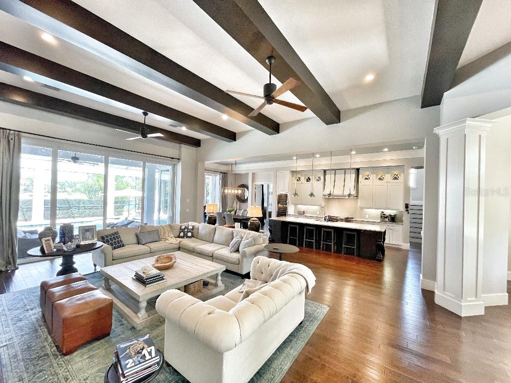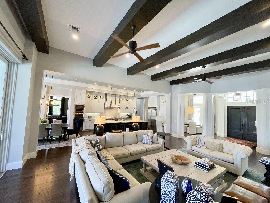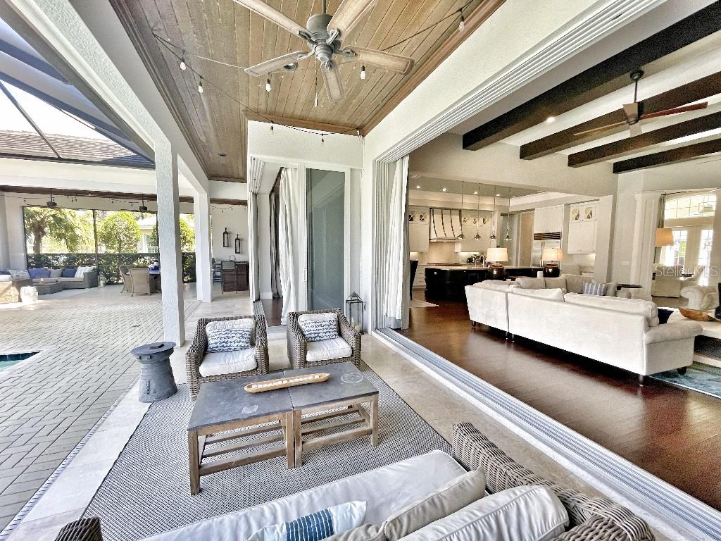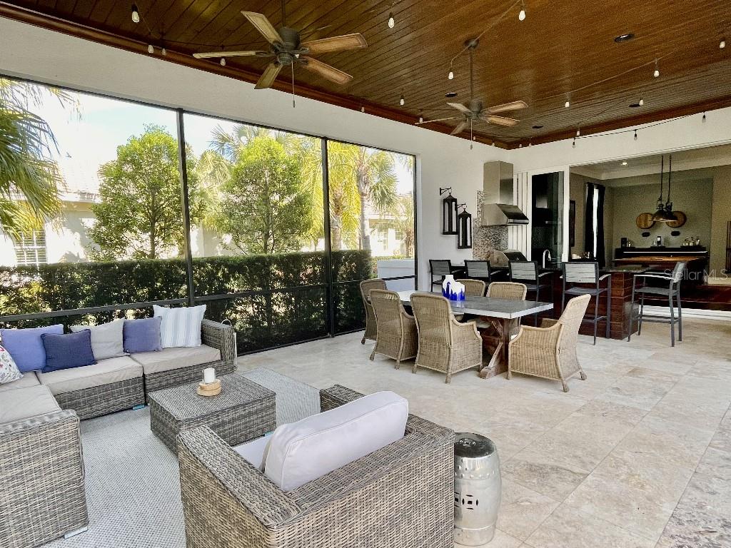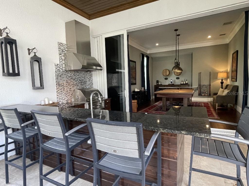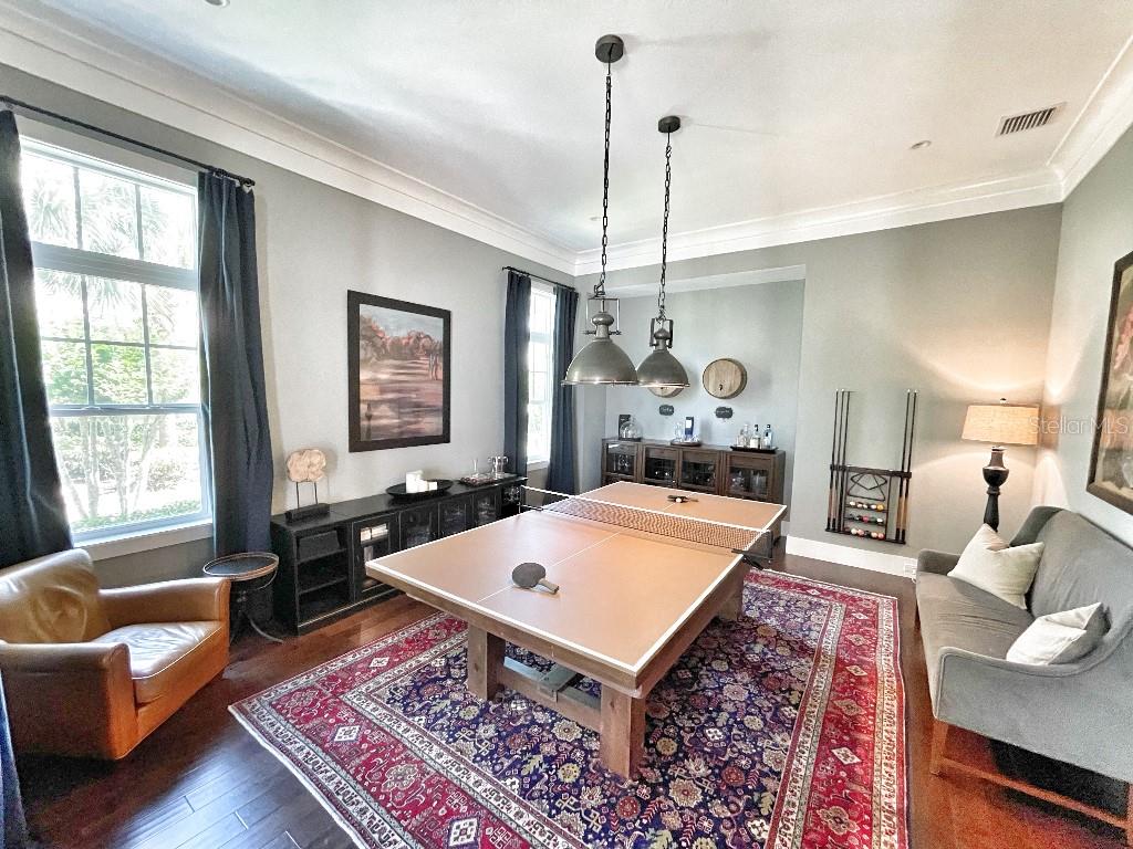 This is a rare opportunity to own an expansive, coastal contemporary lakefront home in the Lake Club, the most exclusive enclave of Lakewood Ranch. This custom-built home offers the pinnacle of relaxed luxury living with elegance and sophistication etched into every detail. Set in the heart of the Lake Club on a lakefront lot front by a serene linear park, this home provides a perfect balance of privacy and panoramic beauty. The architecture merges coastal elegance with contemporary grace, featuring soaring 13-foot ceilings that create an airy sanctuary on the first floor. Across 5,179 sq ft of impeccably designed interior living space incorporating 5 bedrooms and 4.5 baths and 7,829 Sq ft total under roof, the home hosts five bedrooms to comfortably accommodate family and guests. The heart of the home is the expansive great room and massive kitchen and island, equipped with a high-end Sub-Zero refrigerator, wine refrigerator, and Wolf dual-fuel stove, embodying the epitome of culinary luxury. Granite countertops and custom built-in cabinetry enhance the space, making it a hub for cooking and a centerpiece for social gatherings. The informal dining area is framed by zero corner sliders bar nook. In addition, two thoughtfully designed versatile spaces are attached to the great room, one currently used as a formal dining room and the other as an office. The main floor also includes a luxurious guest room with an ensuite bath. The seamless transition from the grand great room to the screened lanai through hurricane-rated pocket sliding doors invites the beauty of the outside in, offering a living experience that is both expansive and intimately connected with Florida's natural beauty. Step outside to a luxury outdoor living space with a gourmet kitchen, grill, refrigerator, and a seating area with a firepit overlooking the lake. Relax in the saltwater pool and hot tub, all overlooking stunning lake views that ensure endless relaxation and entertainment. The master suite is a sanctuary of luxury, complete with dual walk-in closets, an expansive walk-in shower, dual vanities, and a freestanding soaking tub. The thoughtfully designed and highly functional 2nd floor offers three additional bedrooms (one currently used as an office), two bathrooms, a movie room, another washer/dryer, a dedicated gym, and a beautiful screened-in patio perfect for catching the stunning sunrise and sunset over the lake. The Lake Club itself is a testament to luxury living, with amenities including a 20,000-square-foot grand clubhouse as the social heart of the Lake Club. Amenities abound: a restaurant and bar, two resort-style swimming pools, a fitness center, a massage and skincare room, a gaming and lifestyle center, and various sports facilities, including tennis, pickleball, and basketball courts. A dedicated staff provides a concierge luxury living experience and maintains a full calendar of social events. Located within a top-rated school district, with easy proximity to UTC Mall, dozens of restaurants, pristine beaches, and the vibrant Main Street and Waterside town centers of Lakewood Ranch, The Lake Club is more than a home; it's a lifestyle. Bedroom Closet Type: Walk-in Closet (Primary Bedroom).