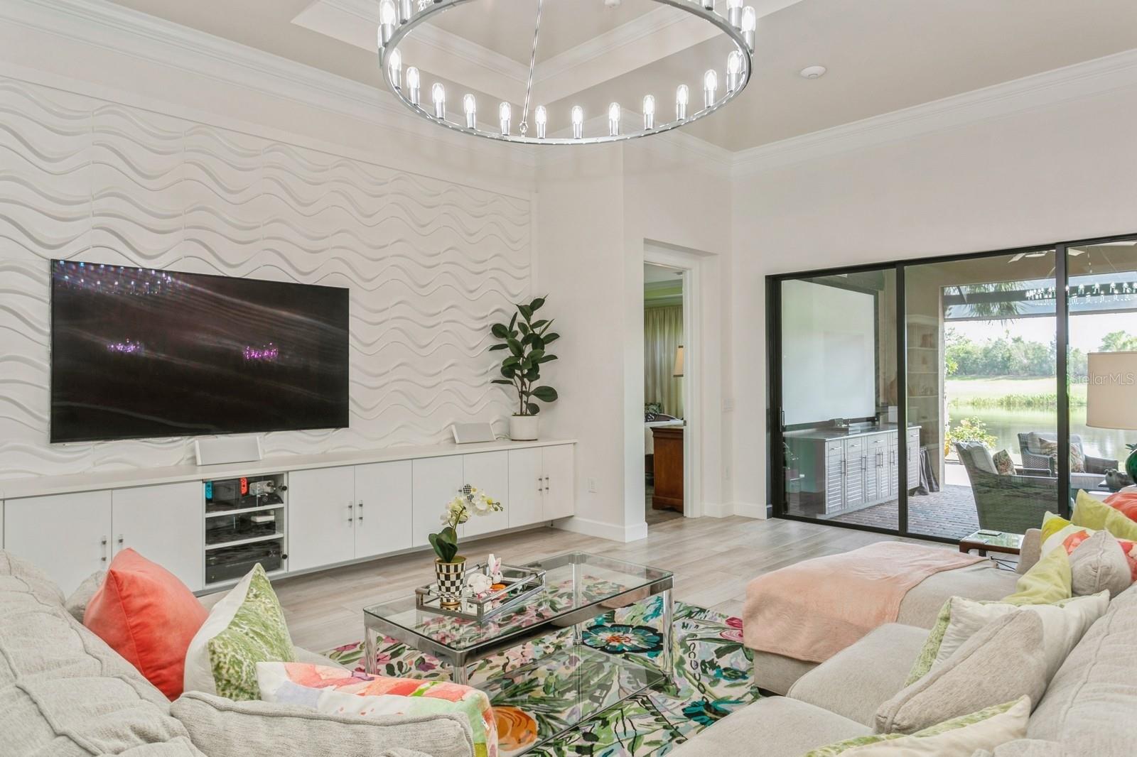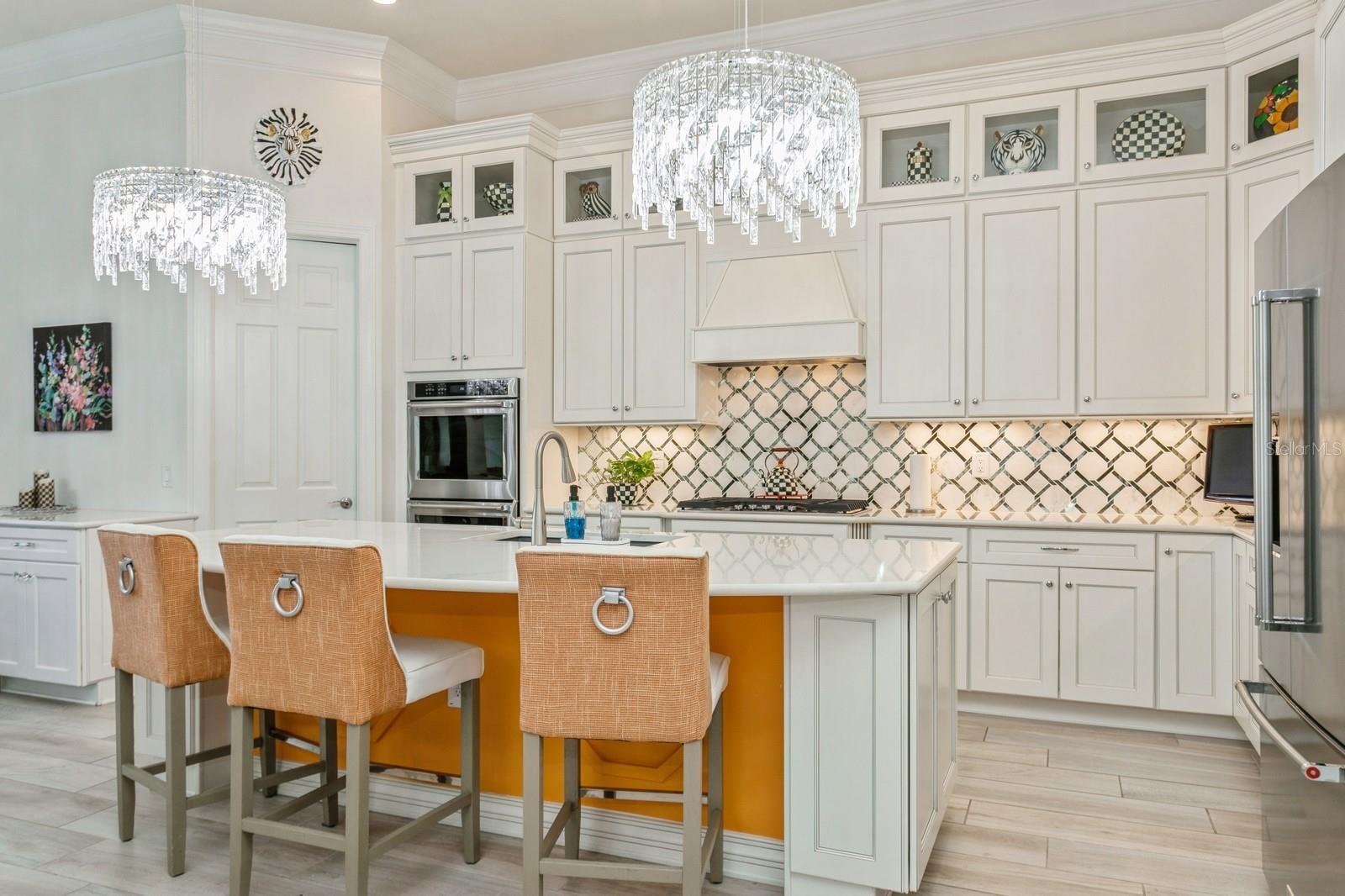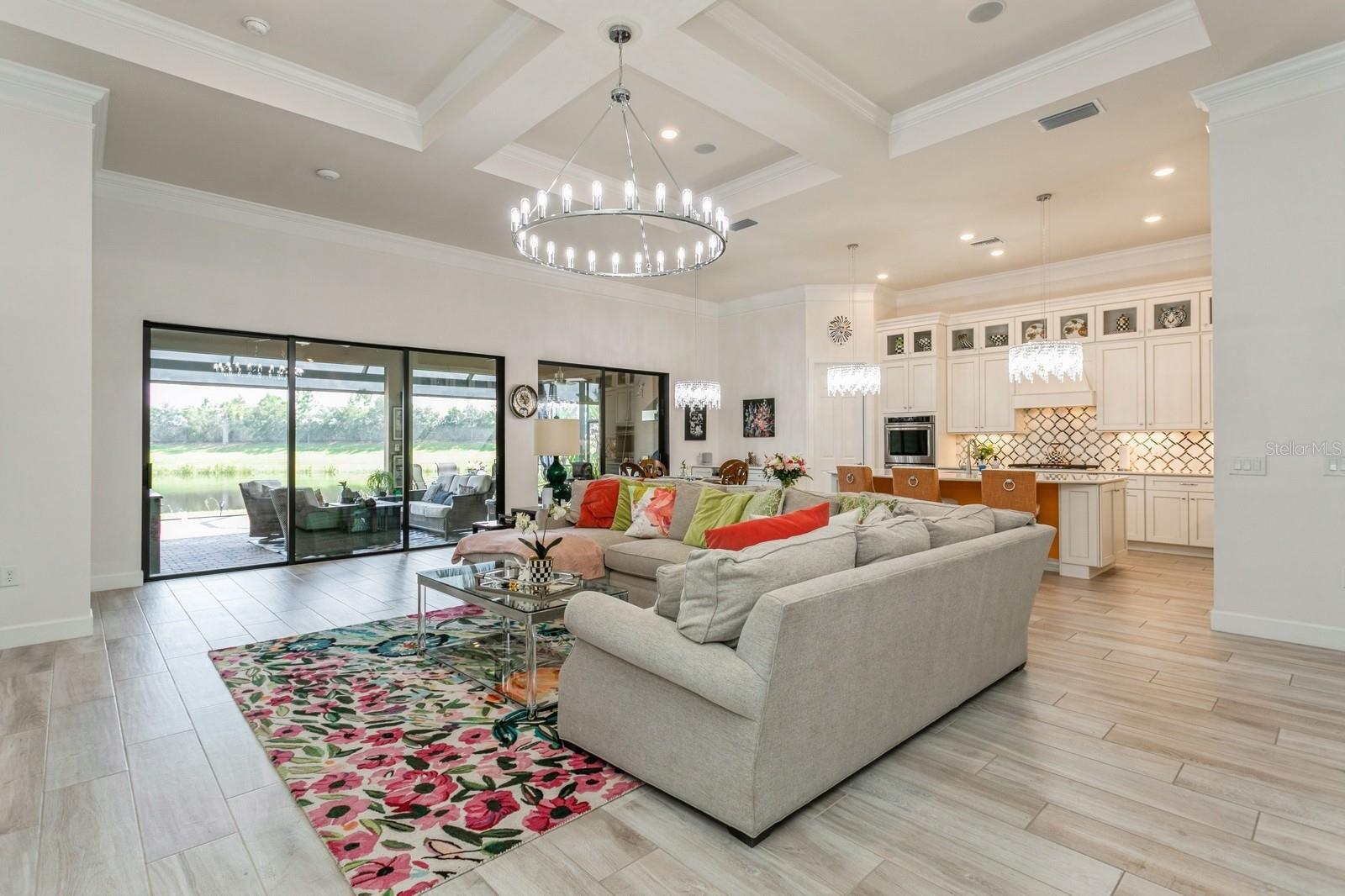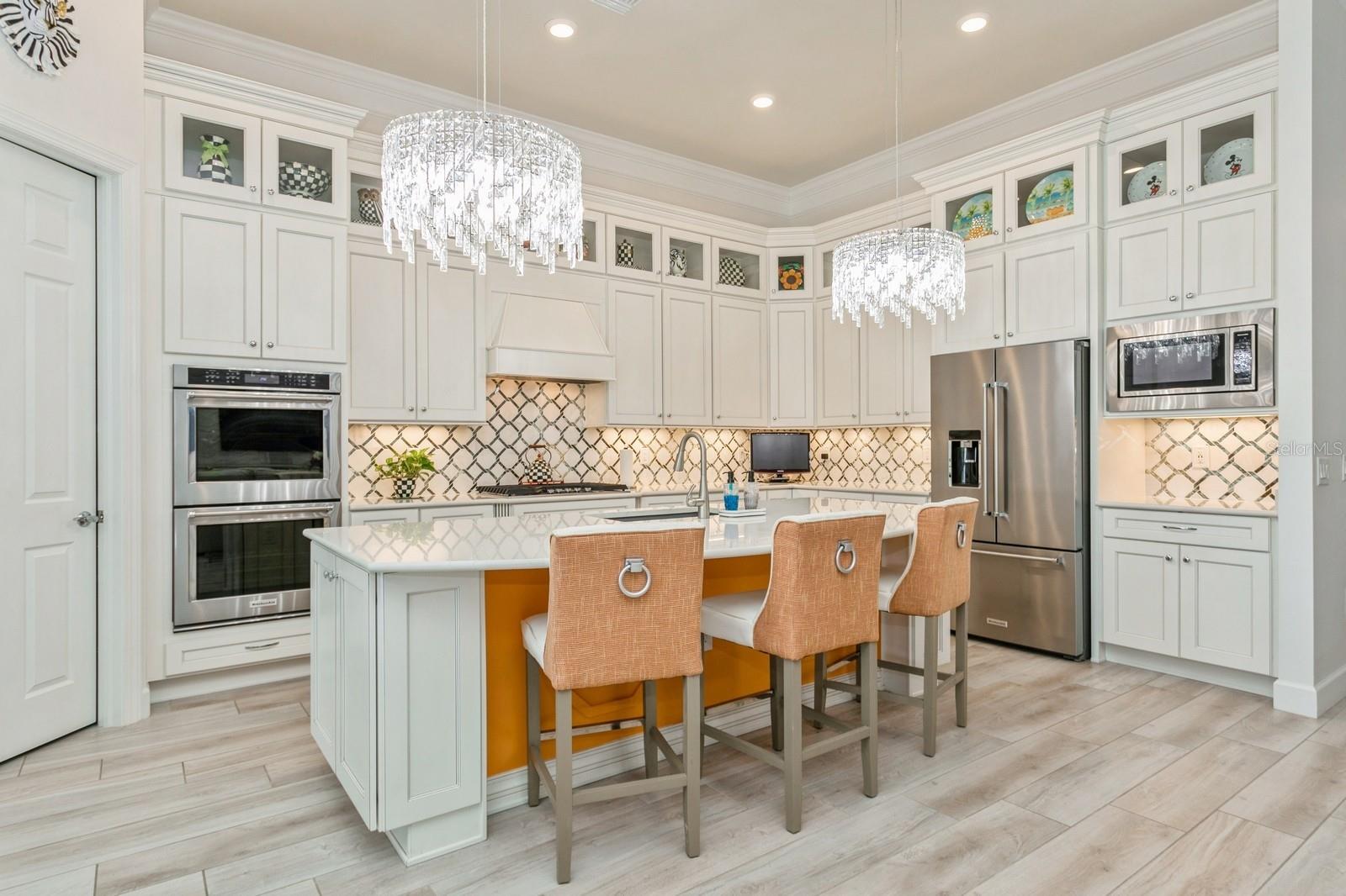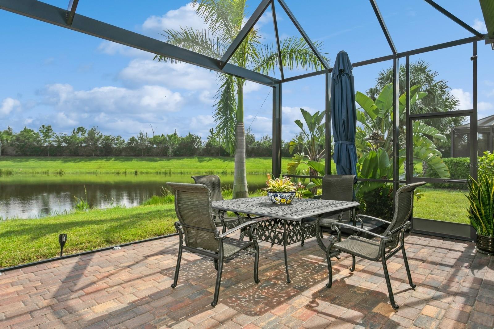 Elegant living can be yours in this HIGHLY SOUGHT AFTER GATED, 55+ DEL WEBB AT LAKEWOOD RANCH community. This stunning WATERFRONT Stonewater home is a designer's paradise featuring 3 Bedrooms, 3 FULL Bathrooms, & 3 CAR GARAGE WITH 4 FT EXT. Enter through the front Double Customs, Impact glass inserted, doors to the airy 12 FT high ceiling and private lake view that draws you to envision perfect entertaining on the 15 FT extended lanai with picture-frame screened cage. Porcelain tile flooring leads to the Great Dining room, Living room and Kitchen. Huge living room exudes an air of elegance with coffered ceiling, architectural Double Crown Molding, designer wall treatment, custom built-in cabinetry and ceiling speakers for surround sound entertainment. A Chef's dream kitchen features, premium KitchenAid stainless steel appliances, natural gas 5 burner cooktop, Double Convection wall ovens, counter depth French door refrigerator, large walk-in custom pantry. Premium stacked cabinetry with glass uppers for displays, 9.5 FT Quartz Island with large COMPOSITE sink, Touch Flow Faucet, INSTANT-HOT Water Tank. Added bonus of a DRY BAR with WINE COOLER in custom cabinets, elegant Crystal chandeliers, Marble mirrored back splash to complete this high in look. Primary bedroom suite, with lake and sunrise views has CROWN MOLDING, TRAY CEILING, Crystal glass Ceiling Fan, Glass double barn doors lead to EXTENDED SHOWER with Bench, Double Sinks, Granite countertop, private water closet, additional cabinetry for storage and generous Custom Finished Walk-In Closet! Bedrooms 2 has POCKET Door entry for privacy, Crystal Ceiling fan, crown molding, upgraded glass door shower, granite vanity top, custom closet shelving. Bedroom 3 has POCKET door for privacy, crystal ceiling fan, crown molding, Full bath with tiled tub/shower combination. The laundry room is designed for maximum storage with huge stainless-steel sink vanity with double upper cabinets, Full wall of FLOOR TO CEILING storage cabinets and LED expanded lighting for brightness. Entertain on the large lanai with the natural gas outdoor kitchen, featuring refrigerator, sink, gas grill, granite countertop and back splash. Custom granite countertop cabinetry to store equipment for outdoor theater with surround sound. Remote controlled drop-down HURRICANE SCREENS for added protection. Hurricane shutter for perfect fit over windows provide peace of mind. Professional landscape lighting for added ambiance, in front and back. This "SMART House" you experience LOW monthly electric bills due to the excellent 24 TESLA SOLAR PANELS which supply full power home usage, 2 TESLA POWERWALLS as generators. Security features ADT cameras, alarms, Nest doorbell, thermostat and Whole House Surge Protector! TANKLESS WATER HEATER and Water Softener enhances efficiency. Extended Garage has 2- 220V ELECTRIC CAR CHARGING STATIONS, exterior garage Keypad, rubberized flooring, tool boards and abundant built in cabinets. HOA dues provide lawn Maintenance and Irrigation System with reclaimed water. Enjoy Active Resort Style living throughout community starting at the 28,000 square foot "Oasis" amenity clubhouse, full-time lifestyle director, state-of-art Fitness room with classes, 2 heated pools and spa, card/game room, billiards, art classes, a plethora of activities/evening entertainment posted on monthly calendar. Outside tennis, pickleball, Disc golf, Bocce ball, walking trails and water volleyball.