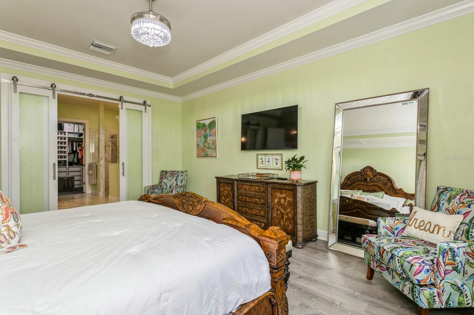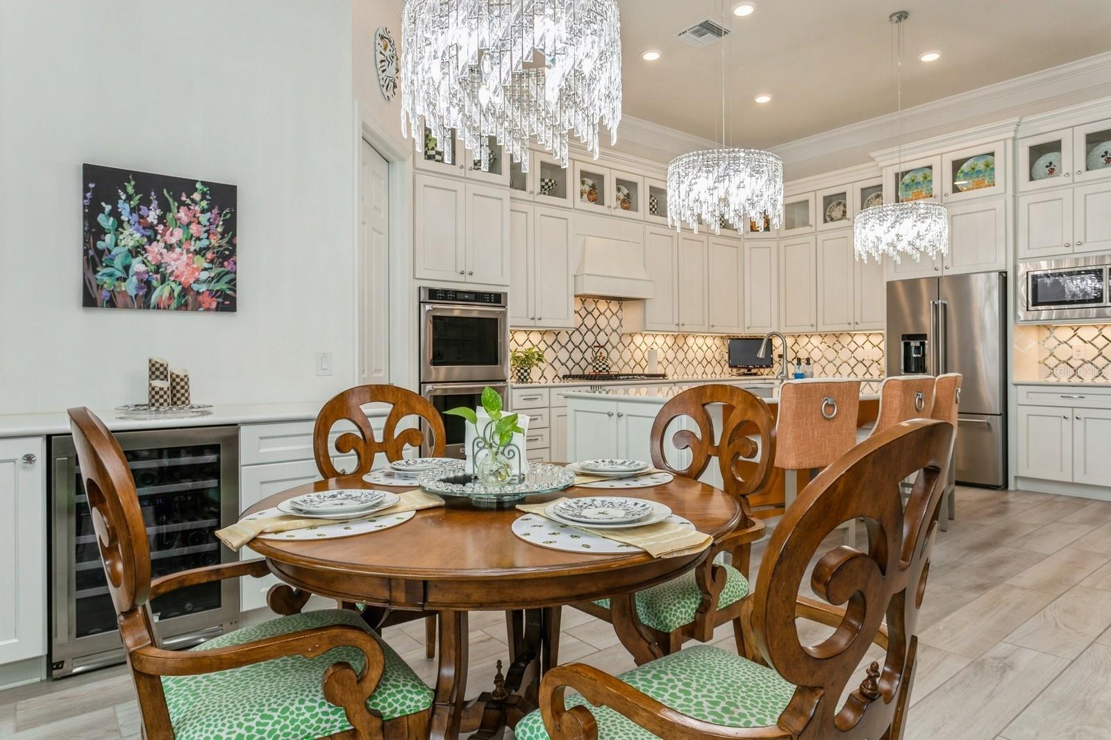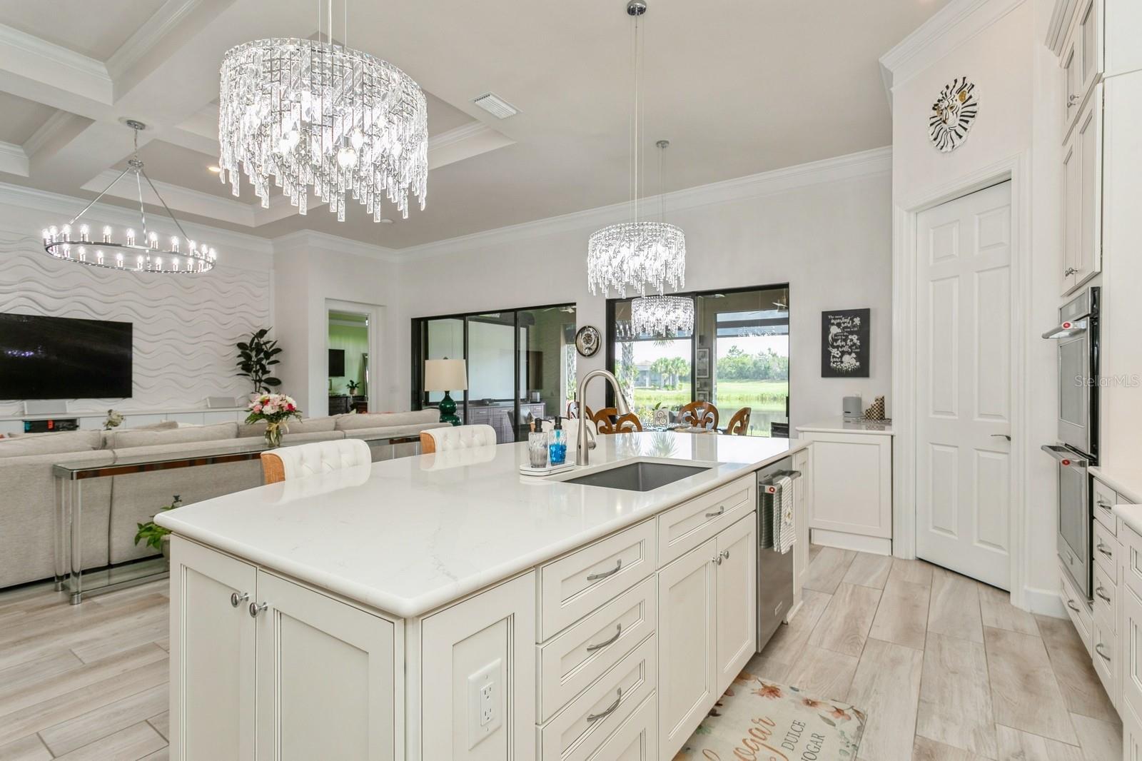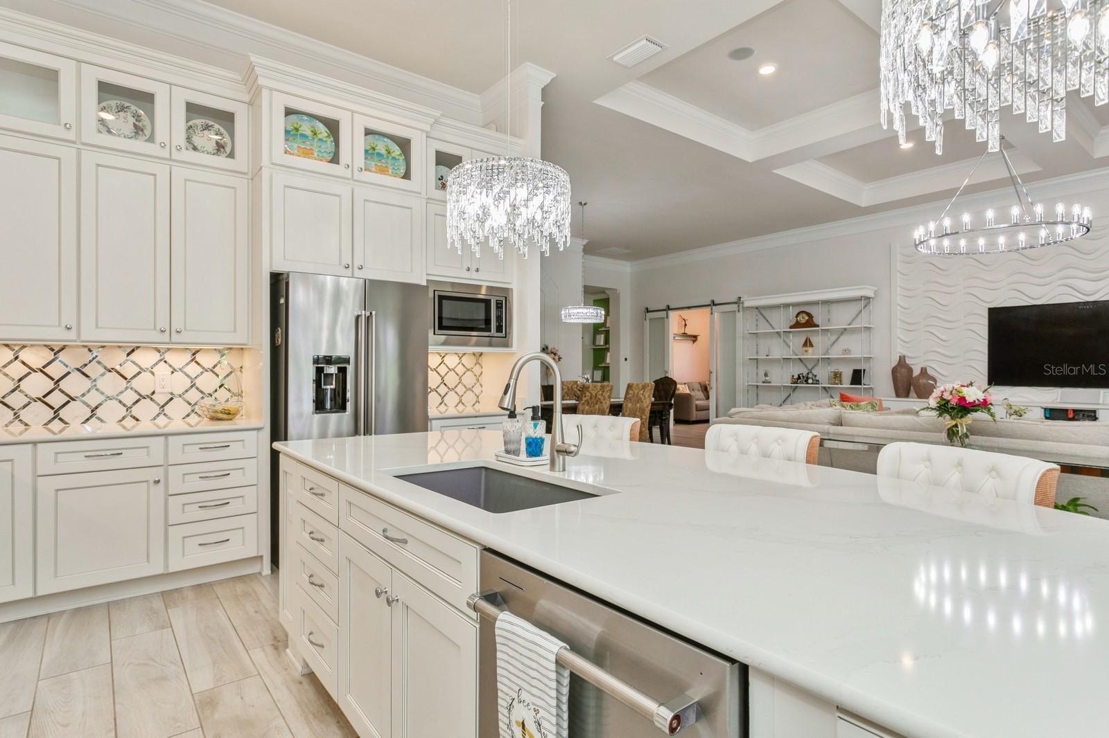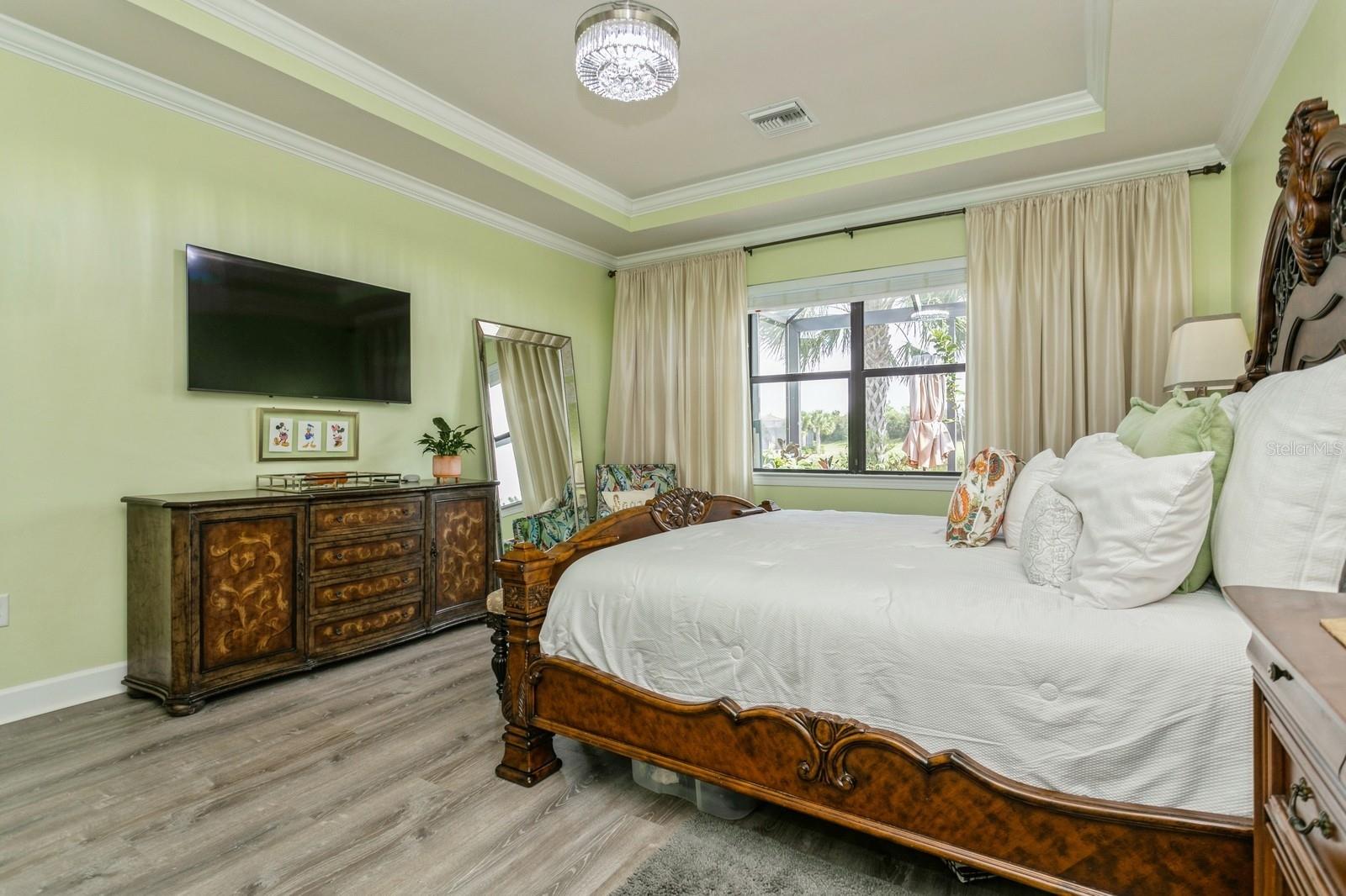 Elegant living can be yours in this HIGHLY SOUGHT AFTER GATED, 55+ DEL WEBB AT LAKEWOOD RANCH community. This stunning WATERFRONT Stonewater home is a designer's paradise featuring 3 Bedrooms, 3 FULL Bathrooms, & 3 CAR GARAGE WITH 4 FT EXT. Enter through the front Double Customs, Impact glass inserted, doors to the airy 12 FT high ceiling and private lake view that draws you to envision perfect entertaining on the 15 FT extended lanai with picture-frame screened cage. Porcelain tile flooring leads to the Great Dining room, Living room and Kitchen. Huge living room exudes an air of elegance with coffered ceiling, architectural Double Crown Molding, designer wall treatment, custom built-in cabinetry and ceiling speakers for surround sound entertainment. A Chef's dream kitchen features, premium KitchenAid stainless steel appliances, natural gas 5 burner cooktop, Double Convection wall ovens, counter depth French door refrigerator, large walk-in custom pantry. Premium stacked cabinetry with glass uppers for displays, 9.5 FT Quartz Island with large COMPOSITE sink, Touch Flow Faucet, INSTANT-HOT Water Tank. Added bonus of a DRY BAR with WINE COOLER in custom cabinets, elegant Crystal chandeliers, Marble mirrored back splash to complete this high in look. Primary bedroom suite, with lake and sunrise views has CROWN MOLDING, TRAY CEILING, Crystal glass Ceiling Fan, Glass double barn doors lead to EXTENDED SHOWER with Bench, Double Sinks, Granite countertop, private water closet, additional cabinetry for storage and generous Custom Finished Walk-In Closet! Bedrooms 2 has POCKET Door entry for privacy, Crystal Ceiling fan, crown molding, upgraded glass door shower, granite vanity top, custom closet shelving. Bedroom 3 has POCKET door for privacy, crystal ceiling fan, crown molding, Full bath with tiled tub/shower combination. The laundry room is designed for maximum storage with huge stainless-steel sink vanity with double upper cabinets, Full wall of FLOOR TO CEILING storage cabinets and LED expanded lighting for brightness. Entertain on the large lanai with the natural gas outdoor kitchen, featuring refrigerator, sink, gas grill, granite countertop and back splash. Custom granite countertop cabinetry to store equipment for outdoor theater with surround sound. Remote controlled drop-down HURRICANE SCREENS for added protection. Hurricane shutter for perfect fit over windows provide peace of mind. Professional landscape lighting for added ambiance, in front and back. This "SMART House" you experience LOW monthly electric bills due to the excellent 24 TESLA SOLAR PANELS which supply full power home usage, 2 TESLA POWERWALLS as generators. Security features ADT cameras, alarms, Nest doorbell, thermostat and Whole House Surge Protector! TANKLESS WATER HEATER and Water Softener enhances efficiency. Extended Garage has 2- 220V ELECTRIC CAR CHARGING STATIONS, exterior garage Keypad, rubberized flooring, tool boards and abundant built in cabinets. HOA dues provide lawn Maintenance and Irrigation System with reclaimed water. Enjoy Active Resort Style living throughout community starting at the 28,000 square foot "Oasis" amenity clubhouse, full-time lifestyle director, state-of-art Fitness room with classes, 2 heated pools and spa, card/game room, billiards, art classes, a plethora of activities/evening entertainment posted on monthly calendar. Outside tennis, pickleball, Disc golf, Bocce ball, walking trails and water volleyball.