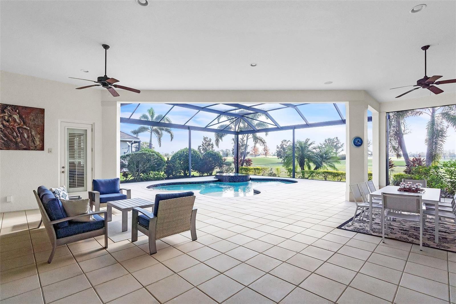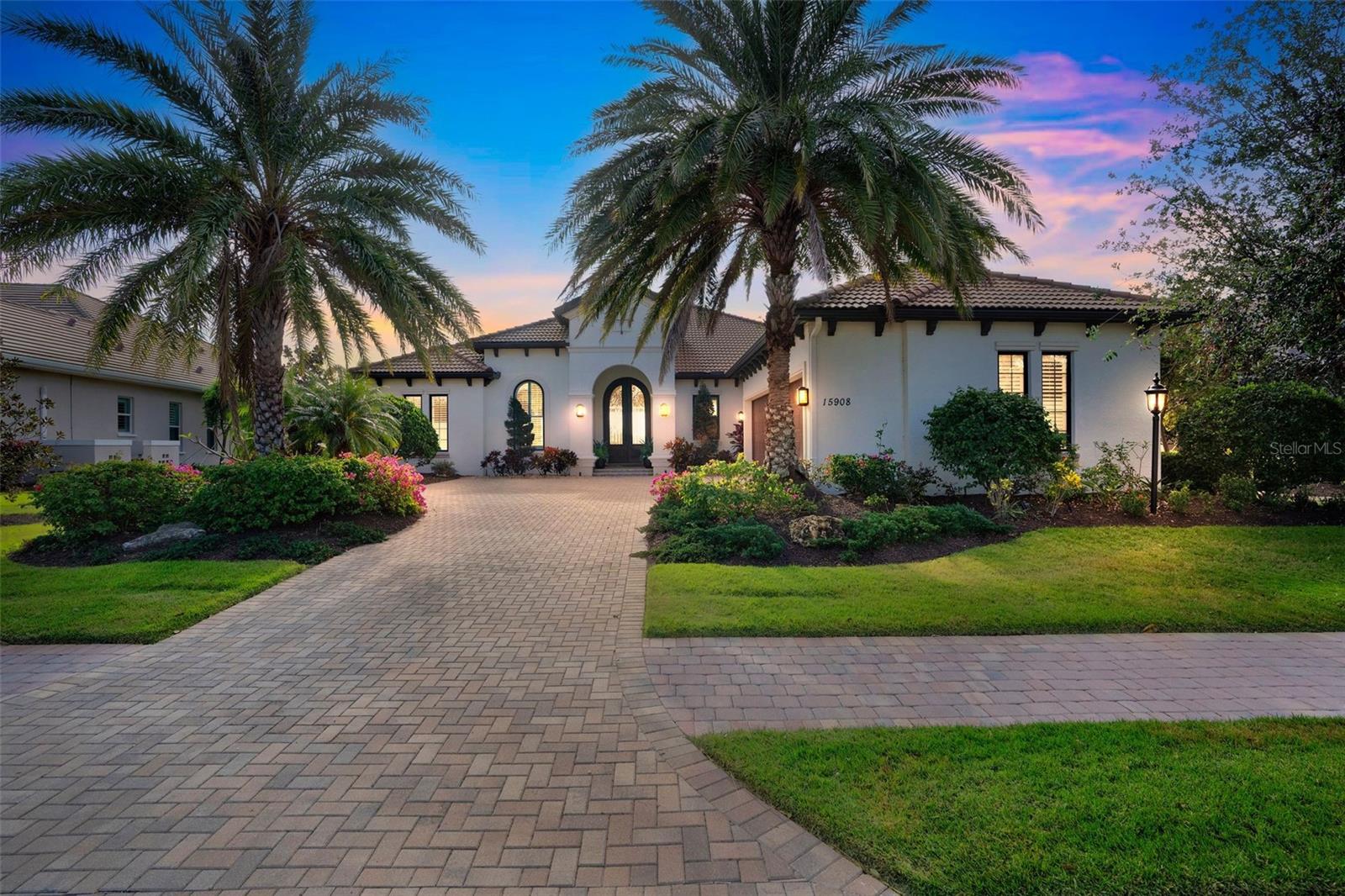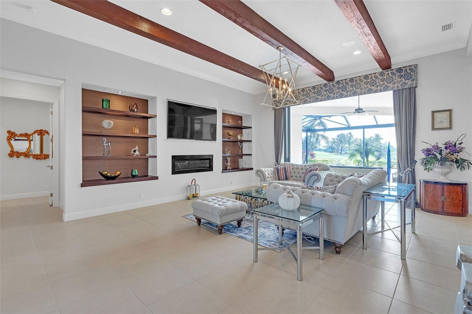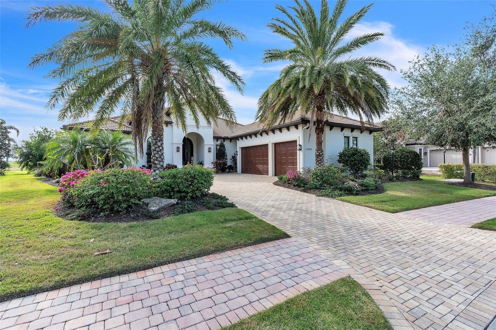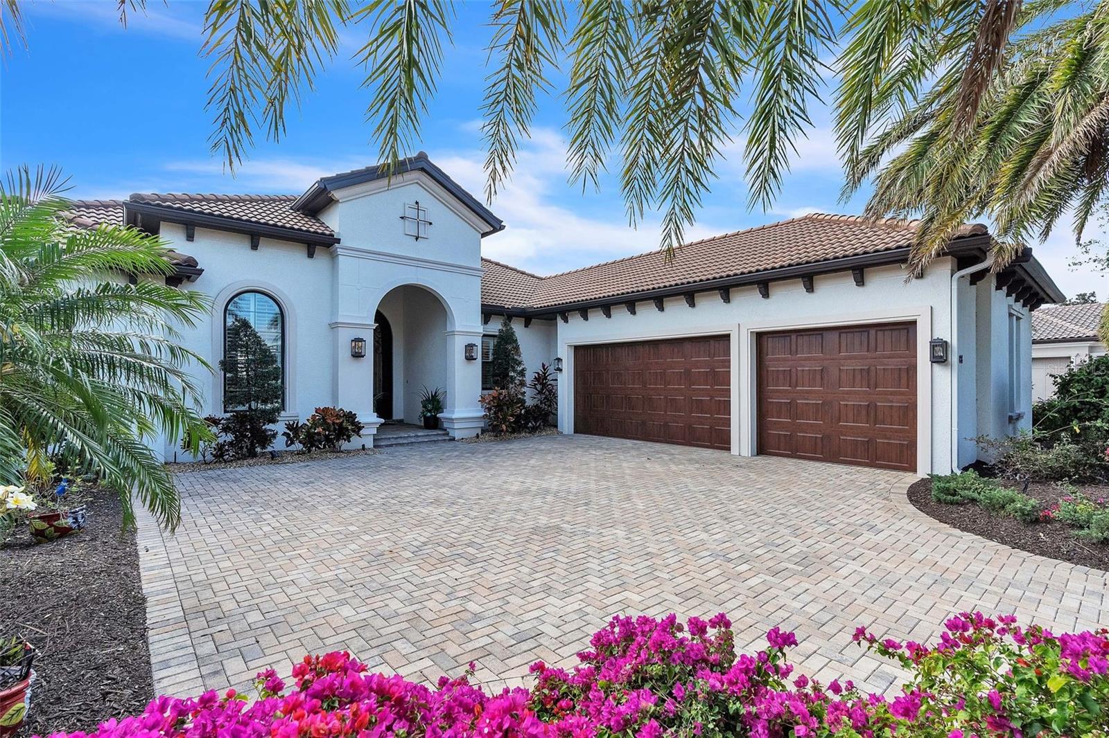 Discover this stunning custom home featuring 3 bedrooms, 3.5 bathrooms, a bonus room, and an office, built by John Cannon. Located in the beautiful enclave of a gated community in Country Club East, this elegant residence boasts magnificent arched double iron-glass front doors that define the entry. The open living space showcases 12-foot beamed ceilings and a gas fireplace. The gourmet chef's kitchen is equipped with custom cabinets, granite countertops, top-of-the-line Viking appliances, and a walk-in pantry. A massive island provides ample space for entertainment. The large bonus room offers flexible space for media and entertainment, while the spacious office adds functionality. The master bedroom suite features a generous layout, sitting area, and dual walk-in closets. The luxurious master bathroom includes a double sink vanity, free-standing modern bathtub, and a spacious walk-in shower with frameless glass enclosure. Custom plantation shutters and custom window treatments adorn the entire house. An impressive outdoor view of the golf course and lake greets residents. The oversized screened lanai features a heated saltwater pool and spa. An outdoor kitchen boasts a stainless steel grill, sink, and extractor fan, all overlooking a tropical oasis. Additional features include a spacious laundry room with ample cabinet space and an oversized three-car garage. Residents of this exceptional estate also enjoy access to amenities including three pools, a fitness center, and a clubhouse. Optional membership to the Lakewood Ranch Country Club is available. The property is zoned for A-rated schools and is in close proximity to shopping, dining, and world-class beaches. Seize this opportunity to experience upscale living.