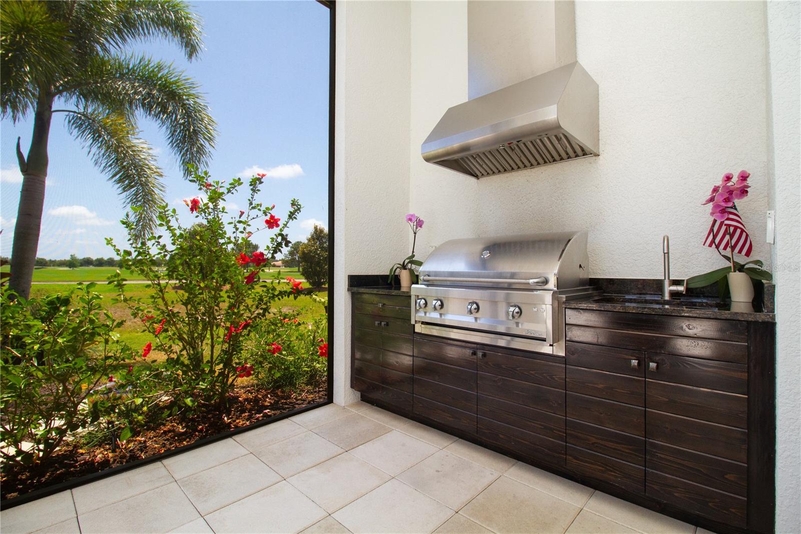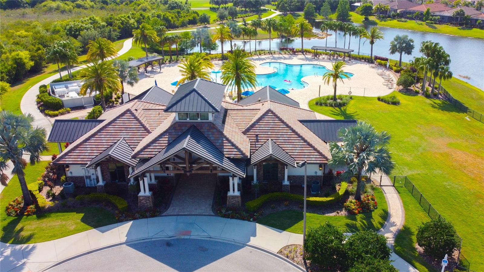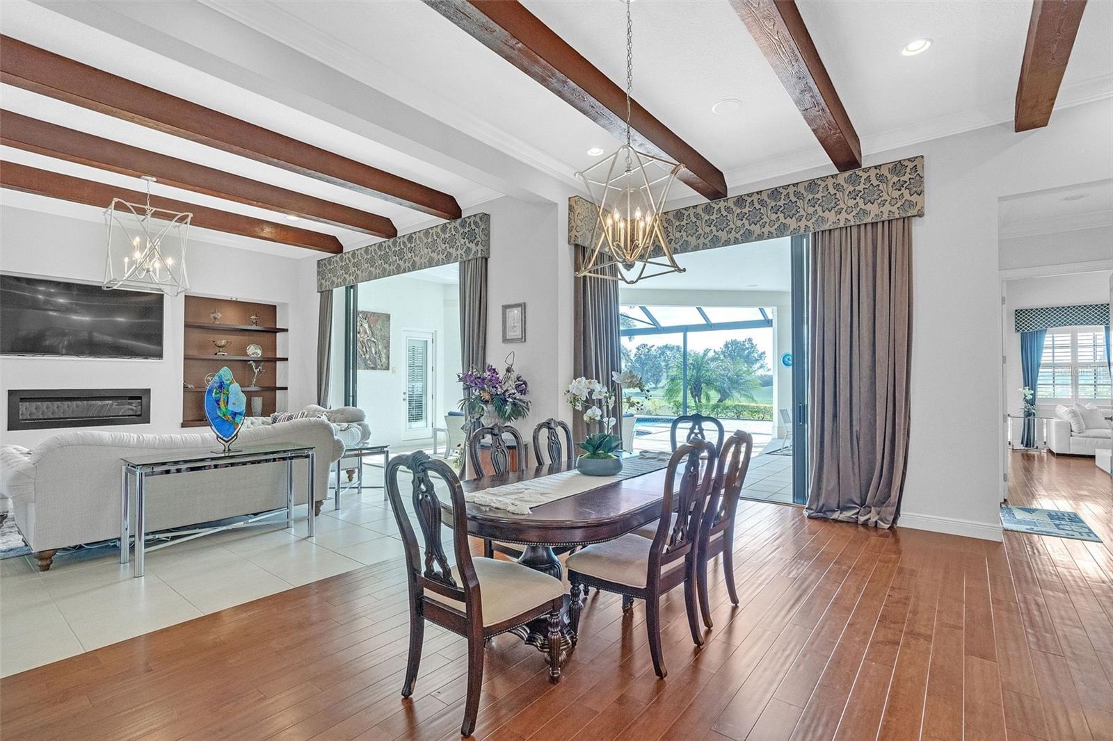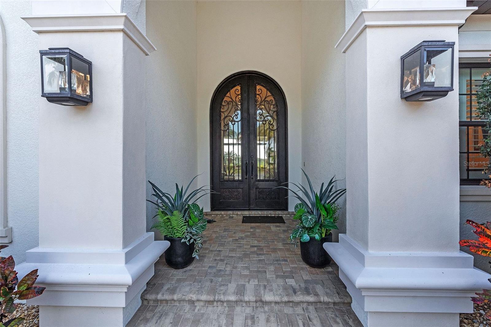 Discover this stunning custom home featuring 3 bedrooms, 3.5 bathrooms, a bonus room, and an office, built by John Cannon. Located in the beautiful enclave of a gated community in Country Club East, this elegant residence boasts magnificent arched double iron-glass front doors that define the entry. The open living space showcases 12-foot beamed ceilings and a gas fireplace. The gourmet chef's kitchen is equipped with custom cabinets, granite countertops, top-of-the-line Viking appliances, and a walk-in pantry. A massive island provides ample space for entertainment. The large bonus room offers flexible space for media and entertainment, while the spacious office adds functionality. The master bedroom suite features a generous layout, sitting area, and dual walk-in closets. The luxurious master bathroom includes a double sink vanity, free-standing modern bathtub, and a spacious walk-in shower with frameless glass enclosure. Custom plantation shutters and custom window treatments adorn the entire house. An impressive outdoor view of the golf course and lake greets residents. The oversized screened lanai features a heated saltwater pool and spa. An outdoor kitchen boasts a stainless steel grill, sink, and extractor fan, all overlooking a tropical oasis. Additional features include a spacious laundry room with ample cabinet space and an oversized three-car garage. Residents of this exceptional estate also enjoy access to amenities including three pools, a fitness center, and a clubhouse. Optional membership to the Lakewood Ranch Country Club is available. The property is zoned for A-rated schools and is in close proximity to shopping, dining, and world-class beaches. Seize this opportunity to experience upscale living.