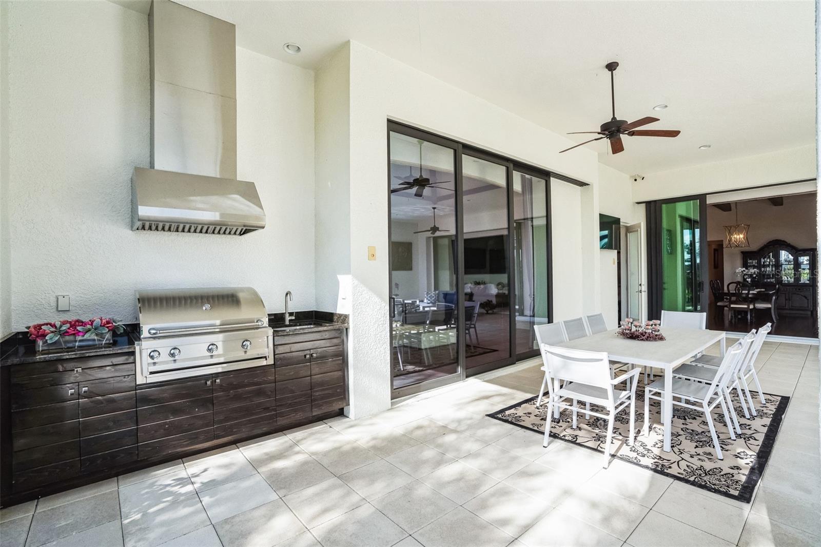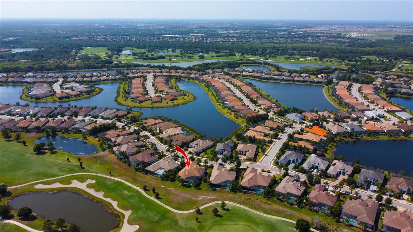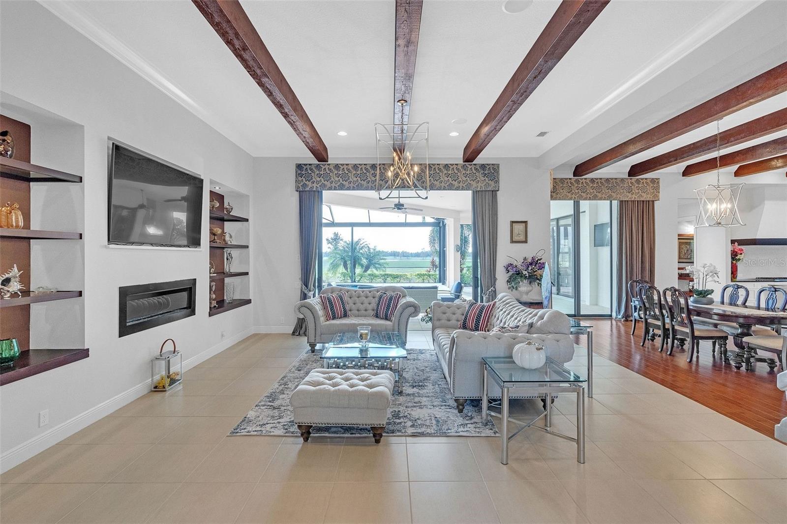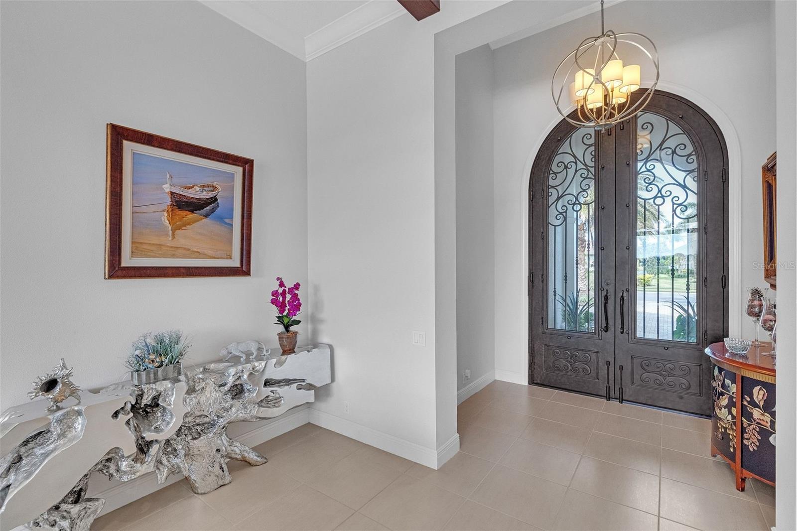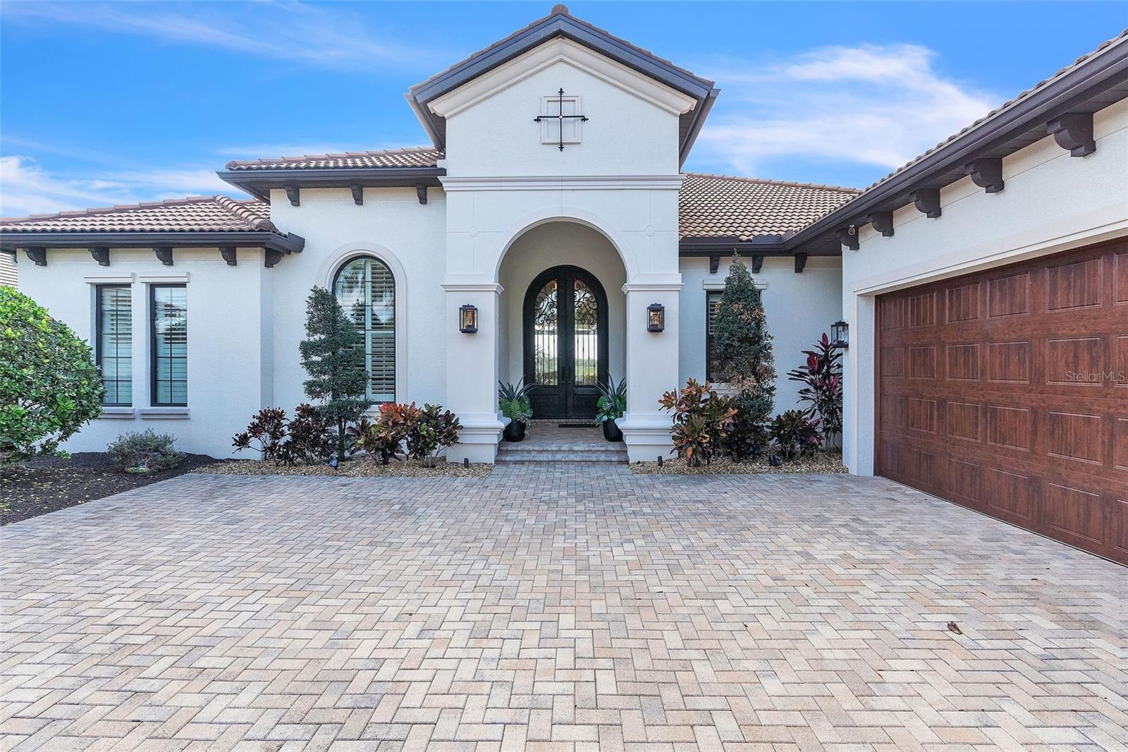 Discover this stunning custom home featuring 3 bedrooms, 3.5 bathrooms, a bonus room, and an office, built by John Cannon. Located in the beautiful enclave of a gated community in Country Club East, this elegant residence boasts magnificent arched double iron-glass front doors that define the entry. The open living space showcases 12-foot beamed ceilings and a gas fireplace. The gourmet chef's kitchen is equipped with custom cabinets, granite countertops, top-of-the-line Viking appliances, and a walk-in pantry. A massive island provides ample space for entertainment. The large bonus room offers flexible space for media and entertainment, while the spacious office adds functionality. The master bedroom suite features a generous layout, sitting area, and dual walk-in closets. The luxurious master bathroom includes a double sink vanity, free-standing modern bathtub, and a spacious walk-in shower with frameless glass enclosure. Custom plantation shutters and custom window treatments adorn the entire house. An impressive outdoor view of the golf course and lake greets residents. The oversized screened lanai features a heated saltwater pool and spa. An outdoor kitchen boasts a stainless steel grill, sink, and extractor fan, all overlooking a tropical oasis. Additional features include a spacious laundry room with ample cabinet space and an oversized three-car garage. Residents of this exceptional estate also enjoy access to amenities including three pools, a fitness center, and a clubhouse. Optional membership to the Lakewood Ranch Country Club is available. The property is zoned for A-rated schools and is in close proximity to shopping, dining, and world-class beaches. Seize this opportunity to experience upscale living.