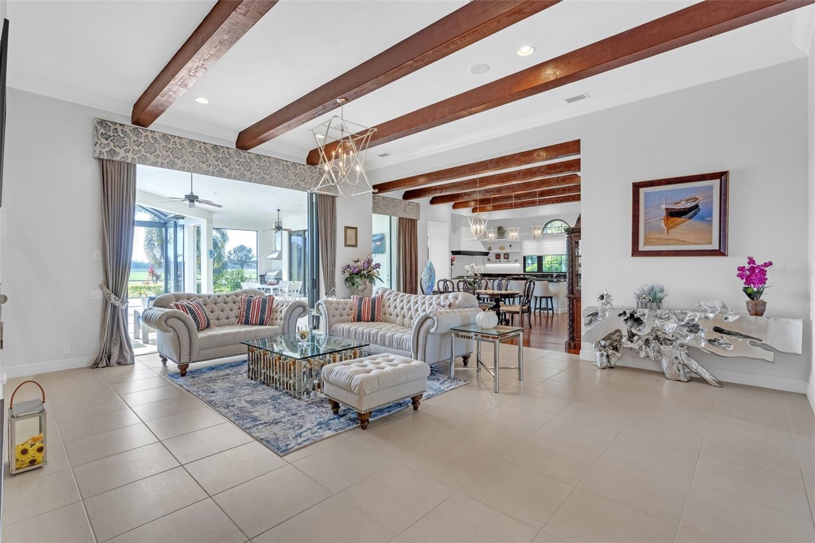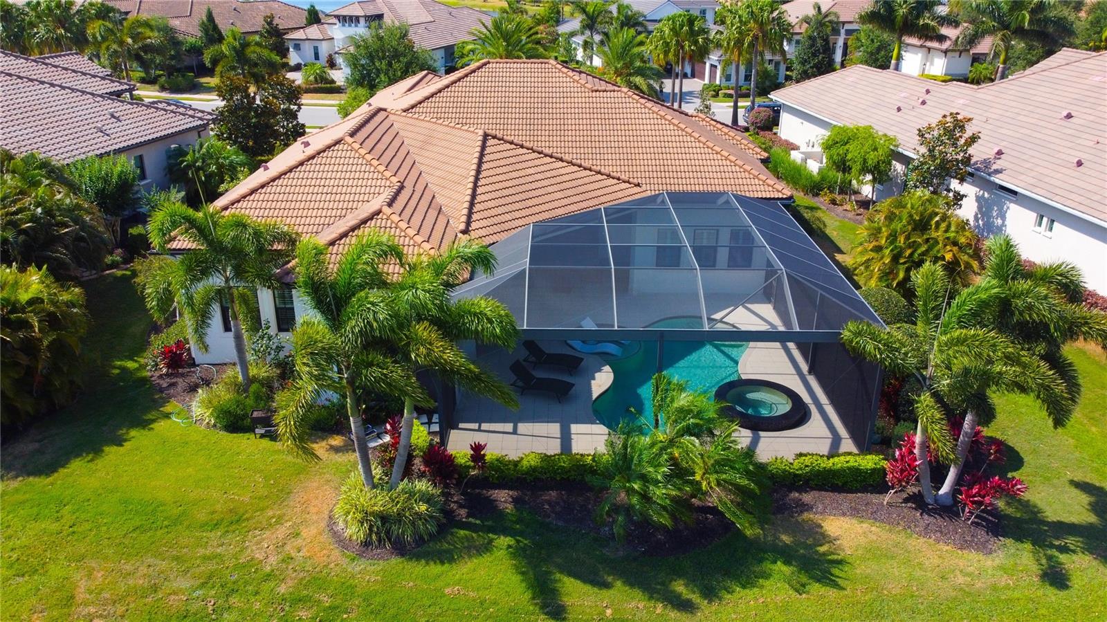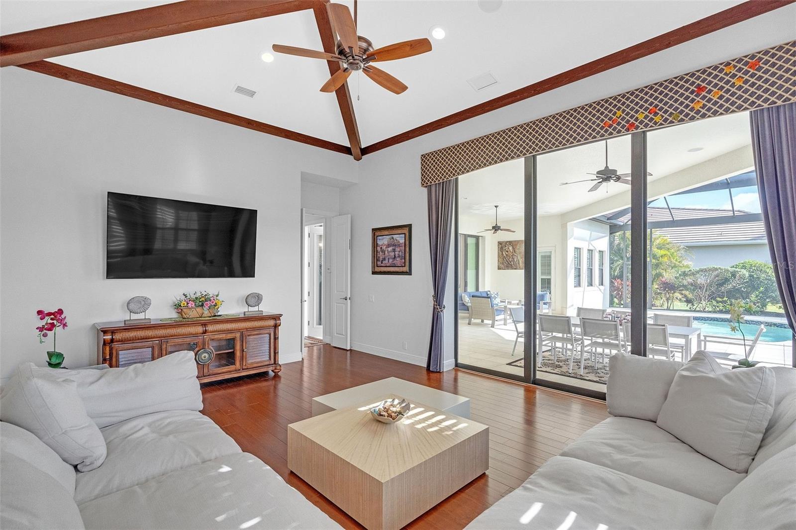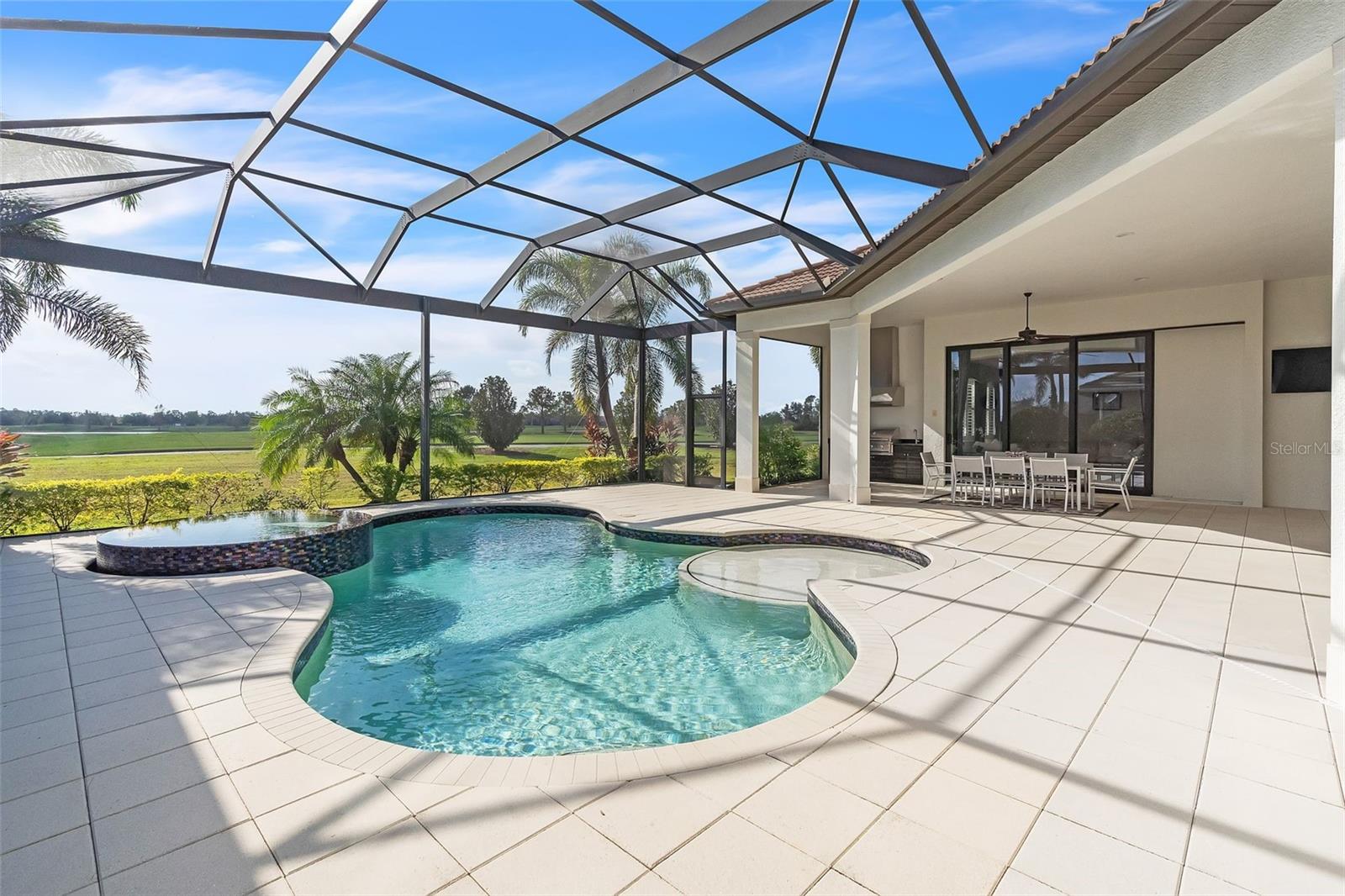 Discover this stunning custom home featuring 3 bedrooms, 3.5 bathrooms, a bonus room, and an office, built by John Cannon. Located in the beautiful enclave of a gated community in Country Club East, this elegant residence boasts magnificent arched double iron-glass front doors that define the entry. The open living space showcases 12-foot beamed ceilings and a gas fireplace. The gourmet chef's kitchen is equipped with custom cabinets, granite countertops, top-of-the-line Viking appliances, and a walk-in pantry. A massive island provides ample space for entertainment. The large bonus room offers flexible space for media and entertainment, while the spacious office adds functionality. The master bedroom suite features a generous layout, sitting area, and dual walk-in closets. The luxurious master bathroom includes a double sink vanity, free-standing modern bathtub, and a spacious walk-in shower with frameless glass enclosure. Custom plantation shutters and custom window treatments adorn the entire house. An impressive outdoor view of the golf course and lake greets residents. The oversized screened lanai features a heated saltwater pool and spa. An outdoor kitchen boasts a stainless steel grill, sink, and extractor fan, all overlooking a tropical oasis. Additional features include a spacious laundry room with ample cabinet space and an oversized three-car garage. Residents of this exceptional estate also enjoy access to amenities including three pools, a fitness center, and a clubhouse. Optional membership to the Lakewood Ranch Country Club is available. The property is zoned for A-rated schools and is in close proximity to shopping, dining, and world-class beaches. Seize this opportunity to experience upscale living.