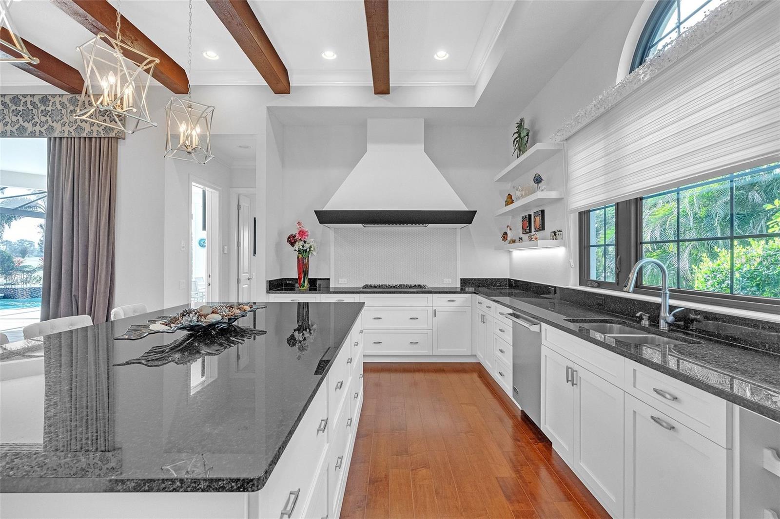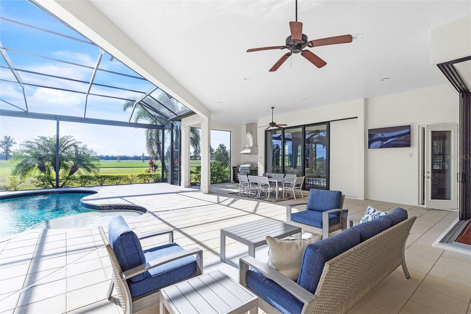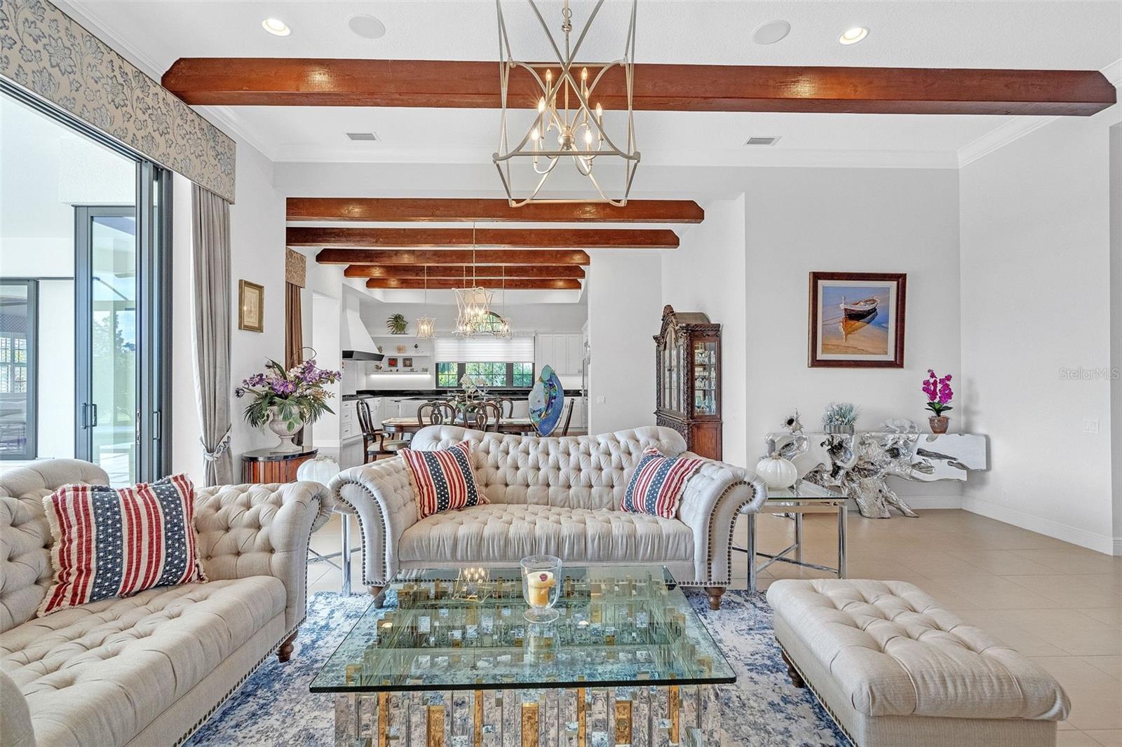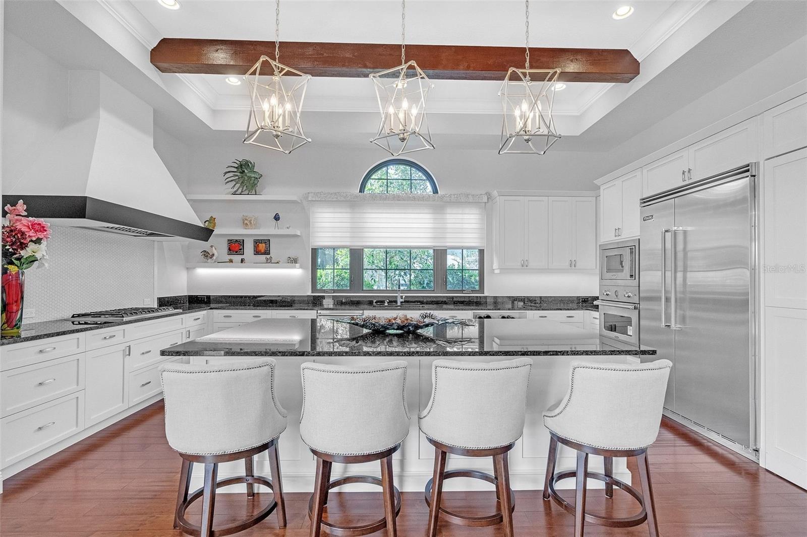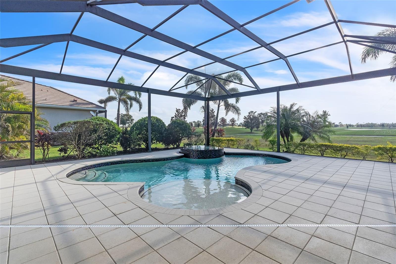 Discover this stunning custom home featuring 3 bedrooms, 3.5 bathrooms, a bonus room, and an office, built by John Cannon. Located in the beautiful enclave of a gated community in Country Club East, this elegant residence boasts magnificent arched double iron-glass front doors that define the entry. The open living space showcases 12-foot beamed ceilings and a gas fireplace. The gourmet chef's kitchen is equipped with custom cabinets, granite countertops, top-of-the-line Viking appliances, and a walk-in pantry. A massive island provides ample space for entertainment. The large bonus room offers flexible space for media and entertainment, while the spacious office adds functionality. The master bedroom suite features a generous layout, sitting area, and dual walk-in closets. The luxurious master bathroom includes a double sink vanity, free-standing modern bathtub, and a spacious walk-in shower with frameless glass enclosure. Custom plantation shutters and custom window treatments adorn the entire house. An impressive outdoor view of the golf course and lake greets residents. The oversized screened lanai features a heated saltwater pool and spa. An outdoor kitchen boasts a stainless steel grill, sink, and extractor fan, all overlooking a tropical oasis. Additional features include a spacious laundry room with ample cabinet space and an oversized three-car garage. Residents of this exceptional estate also enjoy access to amenities including three pools, a fitness center, and a clubhouse. Optional membership to the Lakewood Ranch Country Club is available. The property is zoned for A-rated schools and is in close proximity to shopping, dining, and world-class beaches. Seize this opportunity to experience upscale living.