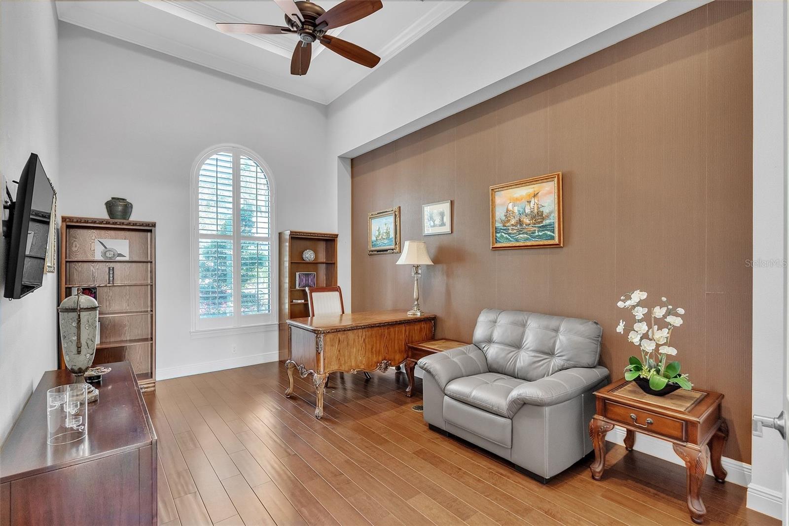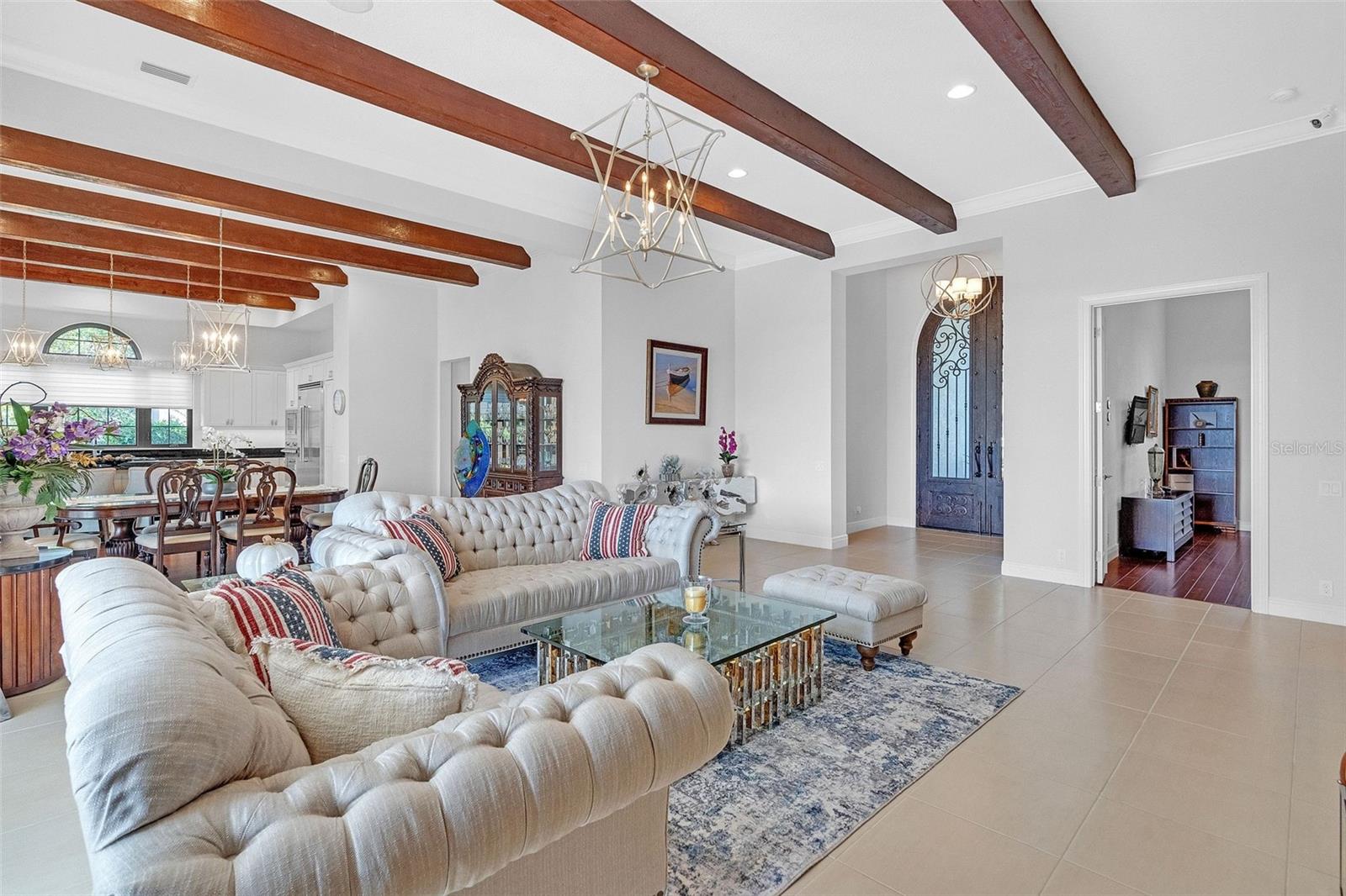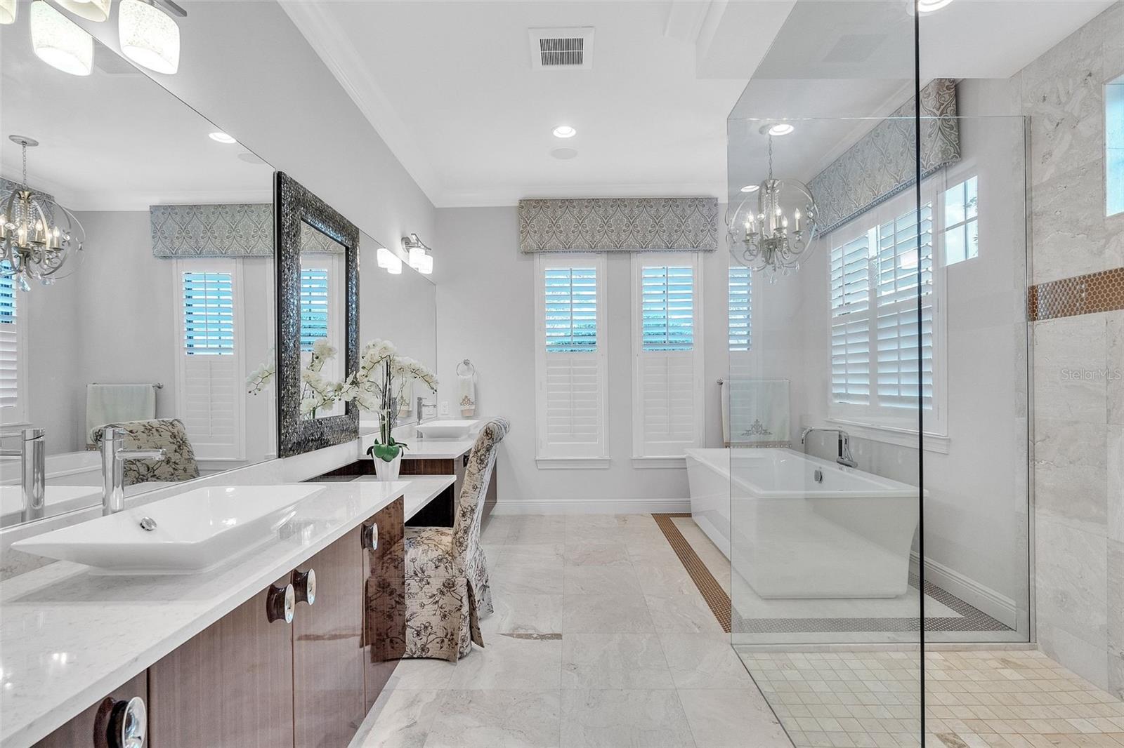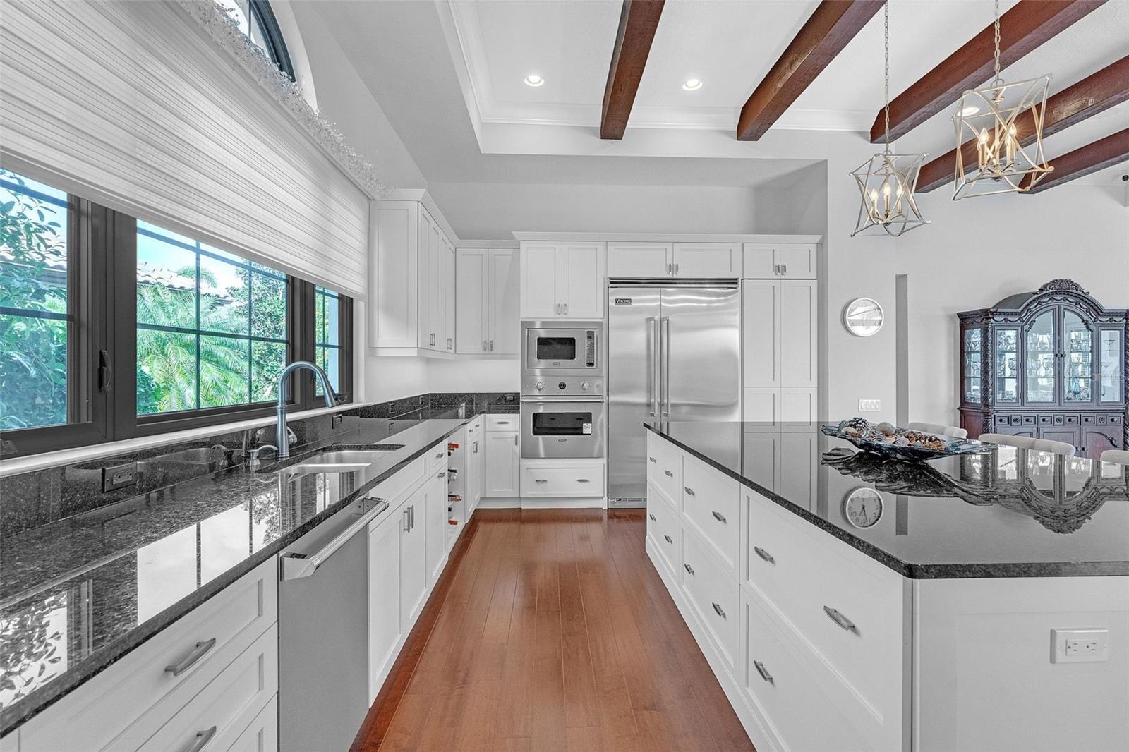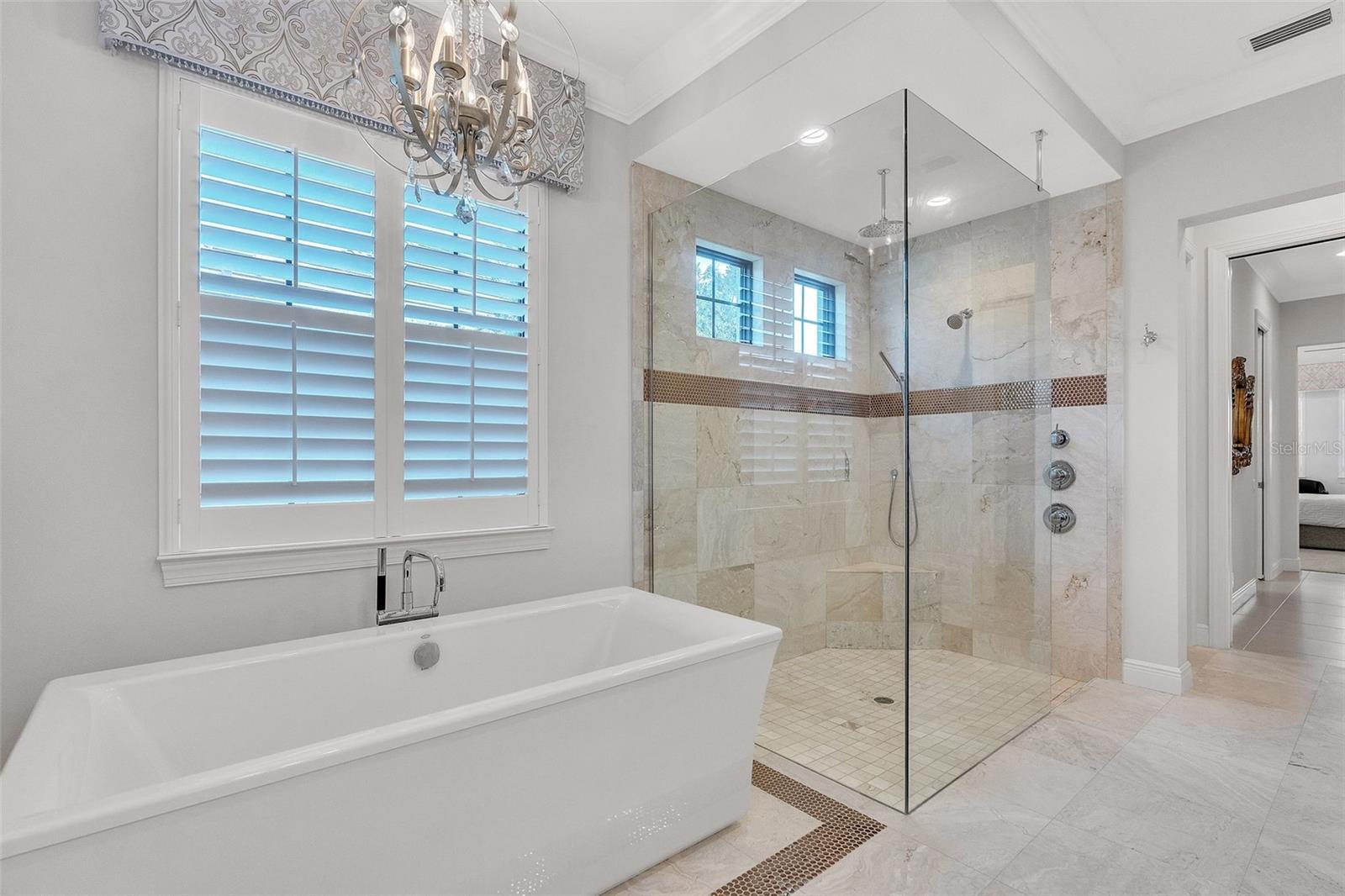 Discover this stunning custom home featuring 3 bedrooms, 3.5 bathrooms, a bonus room, and an office, built by John Cannon. Located in the beautiful enclave of a gated community in Country Club East, this elegant residence boasts magnificent arched double iron-glass front doors that define the entry. The open living space showcases 12-foot beamed ceilings and a gas fireplace. The gourmet chef's kitchen is equipped with custom cabinets, granite countertops, top-of-the-line Viking appliances, and a walk-in pantry. A massive island provides ample space for entertainment. The large bonus room offers flexible space for media and entertainment, while the spacious office adds functionality. The master bedroom suite features a generous layout, sitting area, and dual walk-in closets. The luxurious master bathroom includes a double sink vanity, free-standing modern bathtub, and a spacious walk-in shower with frameless glass enclosure. Custom plantation shutters and custom window treatments adorn the entire house. An impressive outdoor view of the golf course and lake greets residents. The oversized screened lanai features a heated saltwater pool and spa. An outdoor kitchen boasts a stainless steel grill, sink, and extractor fan, all overlooking a tropical oasis. Additional features include a spacious laundry room with ample cabinet space and an oversized three-car garage. Residents of this exceptional estate also enjoy access to amenities including three pools, a fitness center, and a clubhouse. Optional membership to the Lakewood Ranch Country Club is available. The property is zoned for A-rated schools and is in close proximity to shopping, dining, and world-class beaches. Seize this opportunity to experience upscale living.