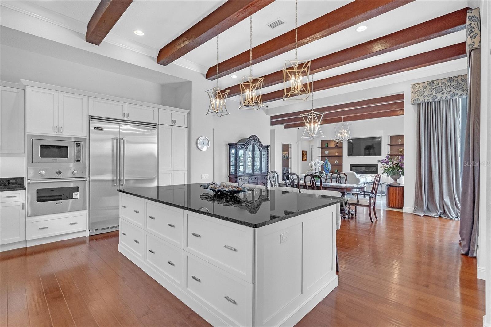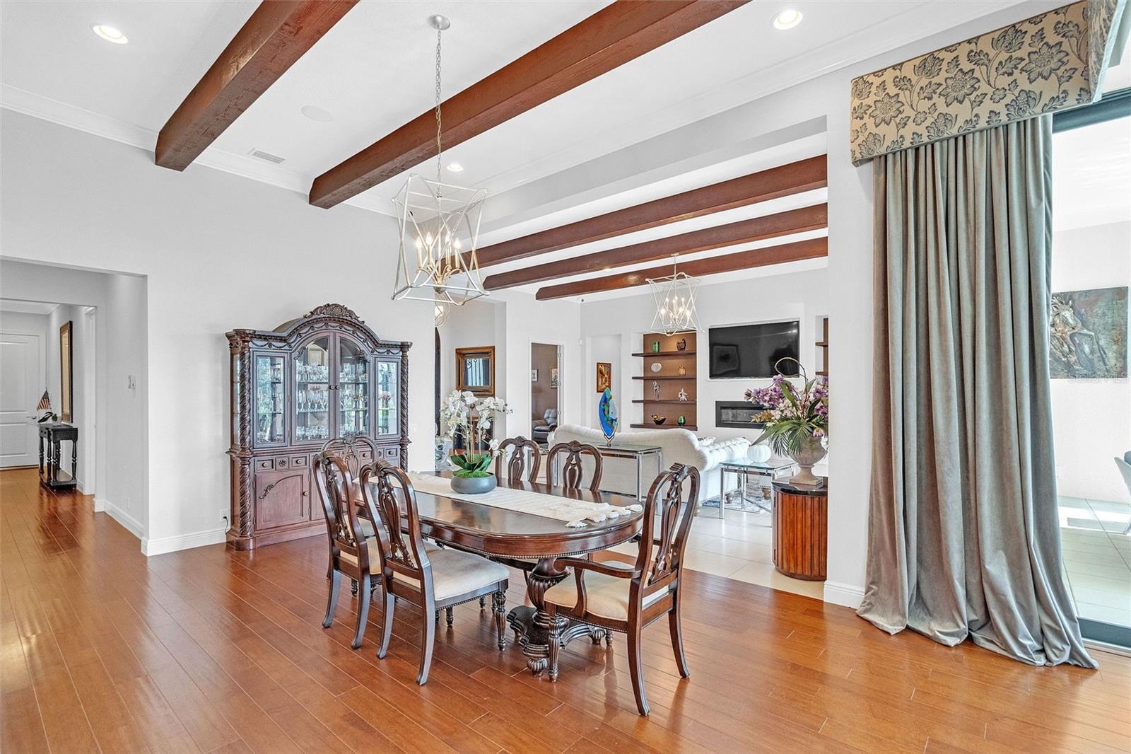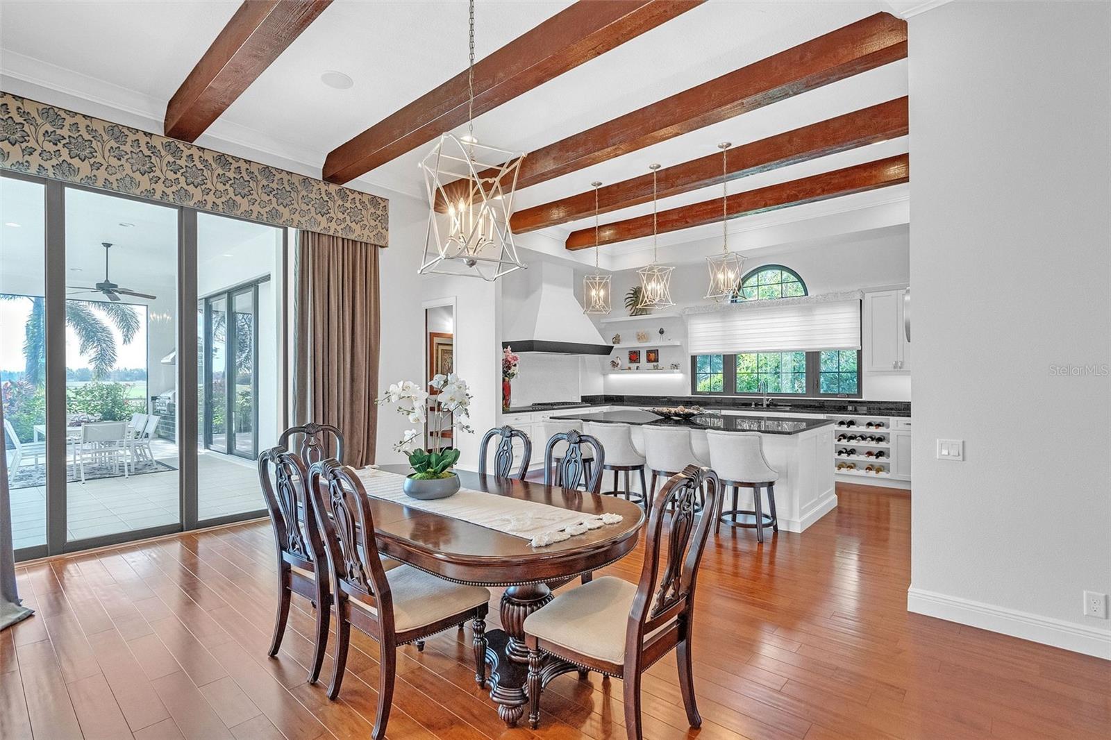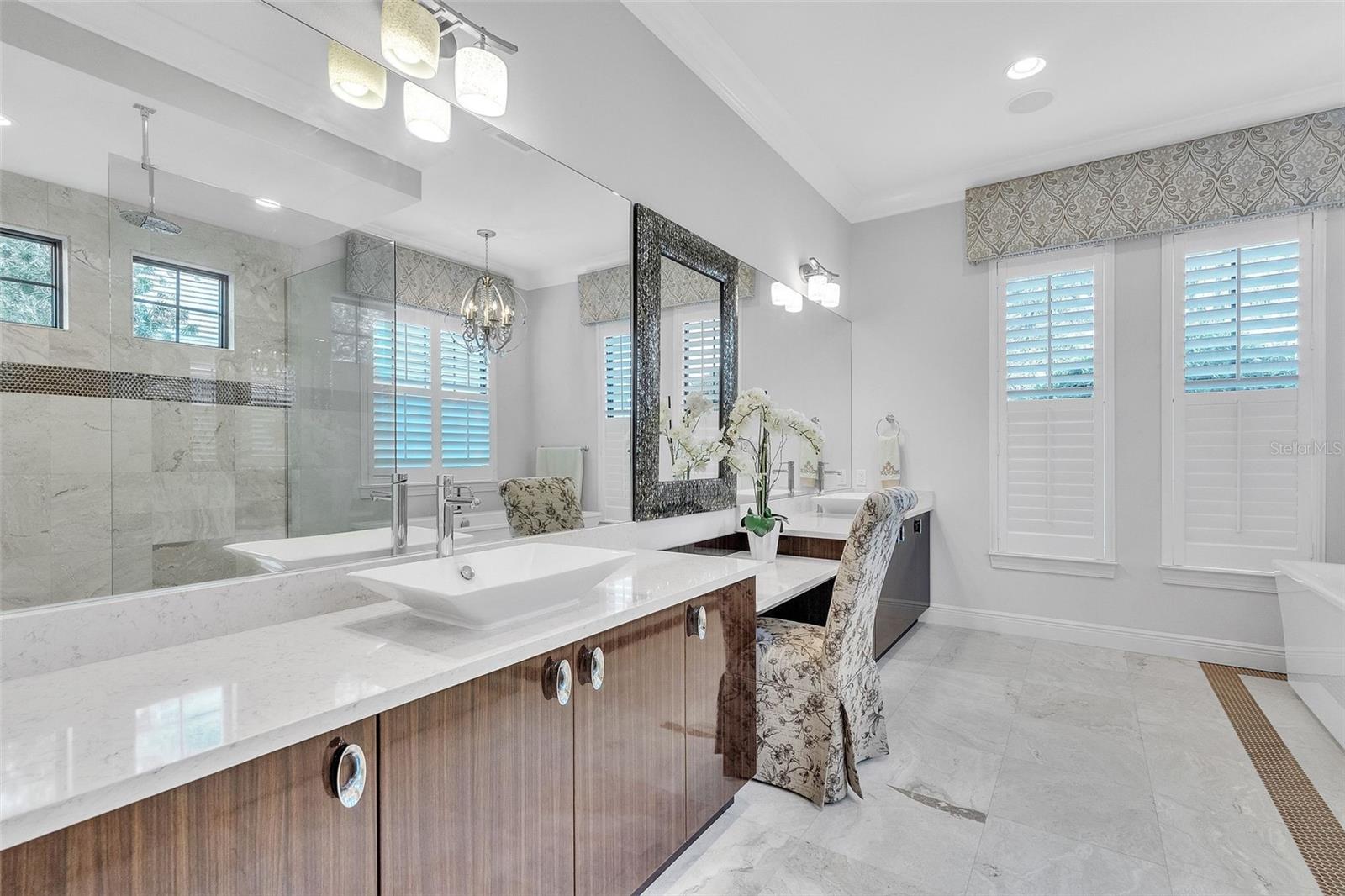 Discover this stunning custom home featuring 3 bedrooms, 3.5 bathrooms, a bonus room, and an office, built by John Cannon. Located in the beautiful enclave of a gated community in Country Club East, this elegant residence boasts magnificent arched double iron-glass front doors that define the entry. The open living space showcases 12-foot beamed ceilings and a gas fireplace. The gourmet chef's kitchen is equipped with custom cabinets, granite countertops, top-of-the-line Viking appliances, and a walk-in pantry. A massive island provides ample space for entertainment. The large bonus room offers flexible space for media and entertainment, while the spacious office adds functionality. The master bedroom suite features a generous layout, sitting area, and dual walk-in closets. The luxurious master bathroom includes a double sink vanity, free-standing modern bathtub, and a spacious walk-in shower with frameless glass enclosure. Custom plantation shutters and custom window treatments adorn the entire house. An impressive outdoor view of the golf course and lake greets residents. The oversized screened lanai features a heated saltwater pool and spa. An outdoor kitchen boasts a stainless steel grill, sink, and extractor fan, all overlooking a tropical oasis. Additional features include a spacious laundry room with ample cabinet space and an oversized three-car garage. Residents of this exceptional estate also enjoy access to amenities including three pools, a fitness center, and a clubhouse. Optional membership to the Lakewood Ranch Country Club is available. The property is zoned for A-rated schools and is in close proximity to shopping, dining, and world-class beaches. Seize this opportunity to experience upscale living.