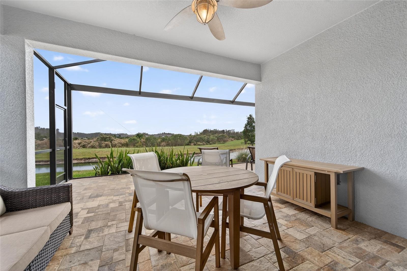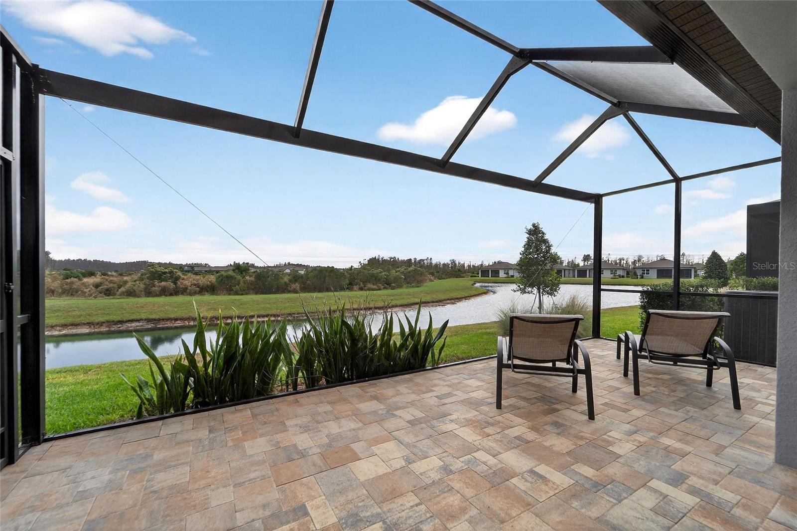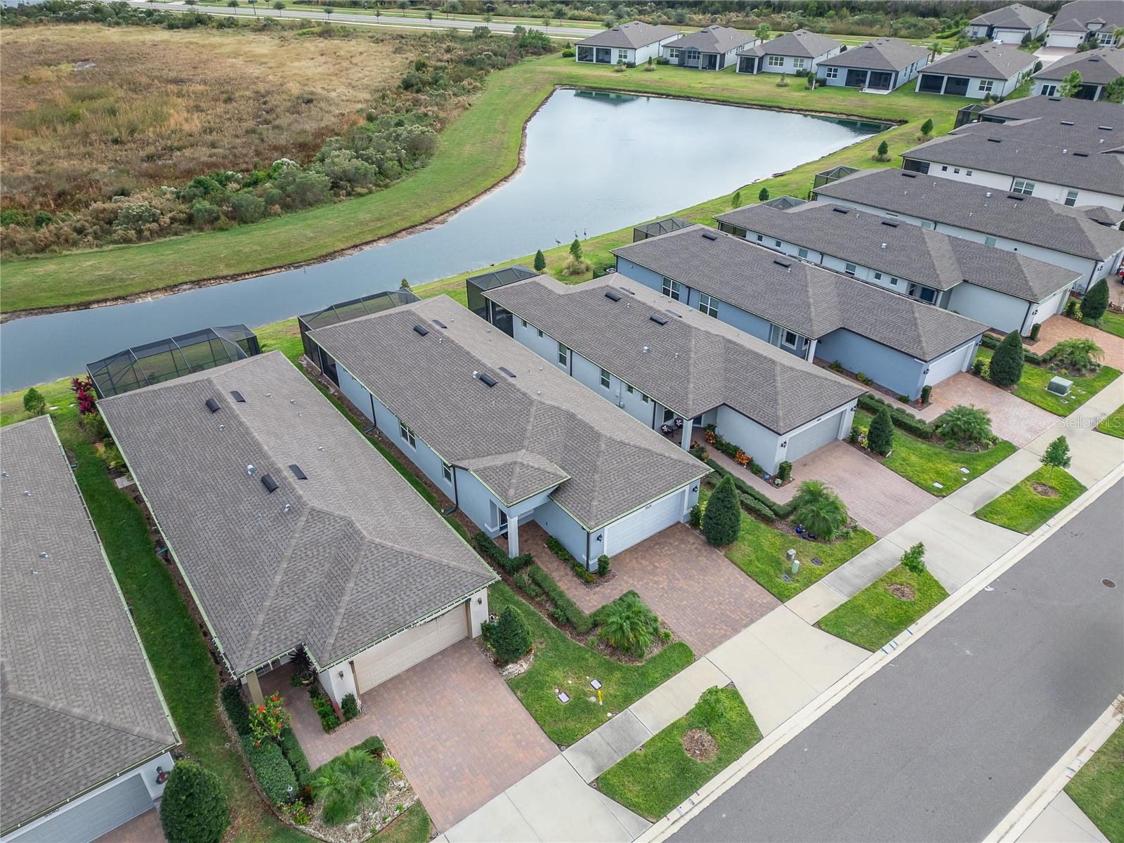 POND VIEW 3 bedroom home in ACTIVE ADULT 55+ community! Live your best life in the gated resort style community of Del Webb Bexley! You will love this three bedroom - two bathroom home (just like new - only used a few weeks each year for vacations) located on one of the quietest streets in the entire neighborhood! The kitchen is the Heart of the Home and will steal your breath away! You'll enjoy all of the storage space the tall 42 inch white cabinets provide. There is even crown molding, soft close drawers with double roll out trays and decorative end panels. GAS COOKING! Gorgeous gray glossy glass backsplash tile coordinates with the pendant lighting and stainless steel appliance package. The great room has a pocket sliding glass door that looks out over the brand new recently extended lanai where you can watch the sun rise. Enjoy the well manicured back yard and pond - there is nothing better than WATER VIEW! LED lighting package! UV light added to the A/C. Upgraded two tone paint enhances this homes beauty! There is a gas line stub out for easy outside grilling. Plumbed for a future water softener. As you enter the home from the large four foot extended two car epoxy floor garage, you will find a convenient laundry room that includes the washer and dryer. All three bedrooms have upgraded carpet and the 3rd bedroom with glass doors is currently being used as a home office/den. The primary has two large closets and is located in the back of the home where you wake up each morning to a view of the pond! Both bathrooms are spacious and have beautiful upgraded wall and floor tile. The HOA fee includes internet and cable, use and maintenance of state of the art amenities, landscaping within the common areas inside of the gates and maintenance of the landscape within your home site. The 19,000 square foot clubhouse offers residents a fitness center, ball room, multi-purpose rooms, clubs, planned activities, bistro and more! Outdoors you will enjoy bocce ball, pickle ball, a resort style zero entry heated pool with lap lanes and an additional walking resistance pool, spa, community garden and even dog park! A full time activities director and her staff will keep you as busy as you want to be!