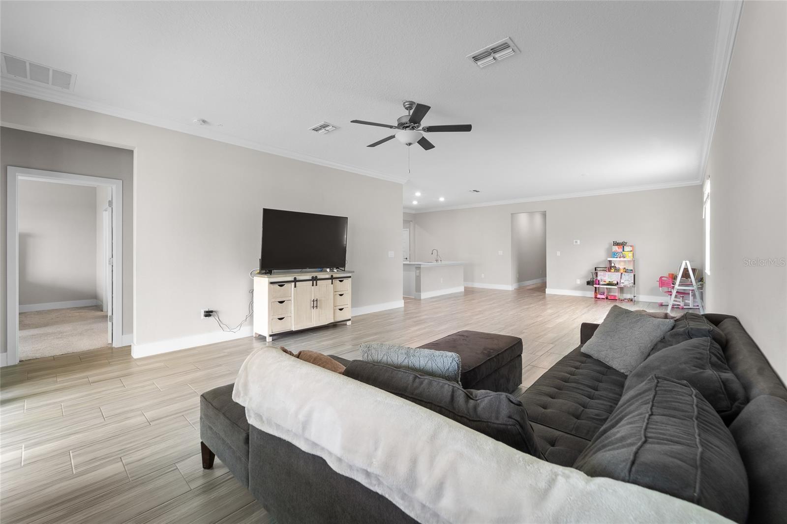 Major price improvement! The Connerton Community is exceptional and so is this villa. It was built in 2022, with extra attention to details, and a pond view. Walking into the foyer you'll see there are 2 front bedrooms with a shared bathroom and a private primary bedroom in the back, with an ensuite bathroom and expansive walk-in closet. The primary bedroom has windows overlooking the pond, housing turtles and fish. This home has gorgeous quartz in the kitchen AND bathrooms, slate appliances, modern light cabinetry, double vanities in primary bathroom with extra-large closets in all rooms, and a separate laundry space. Experience open concept living in the spacious living room/dining room/kitchen, all on the first floor, no stairs. The high ceilings, crown molding, and 5" baseboards feel very open with natural light from the sliding glass door to the outdoor patio, set up for alfresco dining. There's also a 2-car garage with an electric vehicle charging station. All appliances are included plus the washer and dryer. The HOA fees cover all exterior lawn care, irrigation, water/sewer, exterior roof and paint repairs, making this truly a maintenance free villa. Visit the community amenities included as well, the pool, tennis, basketball court, fitness center, and trails. This is what you've been waiting for, come see for yourself.