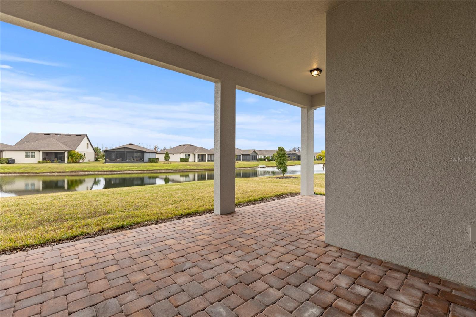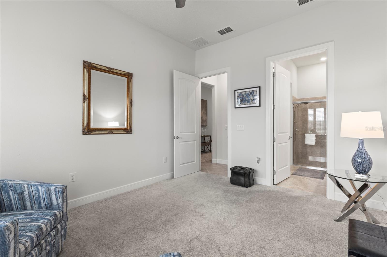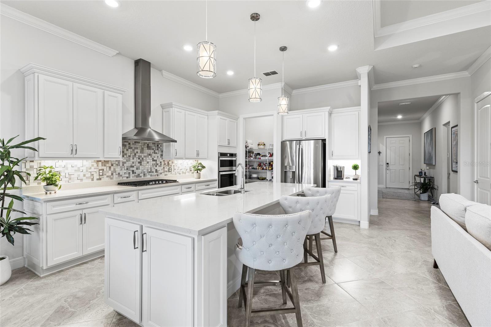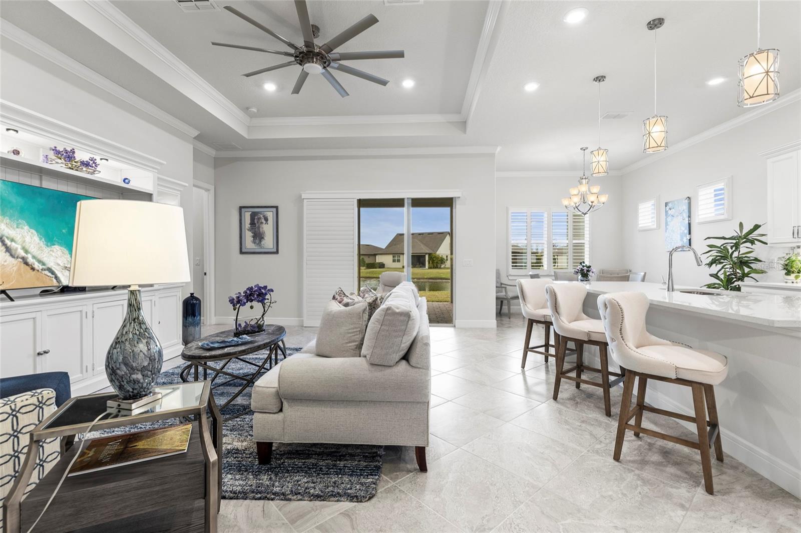 One or more photo(s) has been virtually staged. PRICE IMPROVEMENT! EXQUISITE WATERFRONT HOME WITH LUXURY UPGRADES & ACTIVE LIFESTYLE AMENITIES! Welcome to Del Webb Bexley, a sought-after gated 55+ active lifestyle community in Land O' Lakes, just minutes from shopping, dining, and stunning West Coast beaches. Built in 2021 by Pulte Homes, this Prestige model offers 2,114 sq. ft. of thoughtfully designed living space, blending modern conveniences, designer touches, and exceptional craftsmanship. From the moment you arrive, you’ll be captivated by the manicured landscaping, sealed paver driveway, and storm shutters. Step inside and discover a home filled with natural light, plantation shutters, and an inviting open floor plan. The gourmet kitchen is a chef’s dream, boasting quartz countertops, soft-close cabinets with roll-out shelves, under-island storage, a huge walk-in pantry, and top-of-the-line stainless steel appliances, including a gas range, built-in oven, and microwave. Elegant pendant lighting completes the space, making it the heart of the home. The primary suite is a true retreat, featuring dual walk-in closets, one with a convenient mini door to the adjacent laundry room, and a luxurious en-suite bathroom with his-and-her vanities, pull-out shelves, and a walk-in shower with a bench and larger openings for added accessibility. The second bedroom and full bath provide a welcoming space for guests, while the flexible third bedroom or office with French doors adds versatility to your lifestyle. The oversized two-car garage includes an extra four-foot depth for additional storage, and the laundry room is fully equipped with cabinets, a laundry sink, and counter space. The outdoor living area is equally impressive, with a spacious brick paver patio overlooking the picturesque pond—perfect for watching sunsets and enjoying the Florida lifestyle. This home also includes a tankless gas water heater, providing added efficiency and space in the garage. The Del Webb community offers an array of resort-style amenities, including lawn maintenance through the HOA, a pool with lap lanes, a resistance pool and spa, walking trails, bocce, pickleball and tennis courts, a dog park, and a community garden. A full-time lifestyle director ensures residents enjoy a calendar full of fitness classes, social events, and activities. Don’t miss the opportunity to make this beautiful residence your own and experience luxury, accessibility, and an unbeatable location in this vibrant community. Schedule your private showing today—homes like this don’t last long!