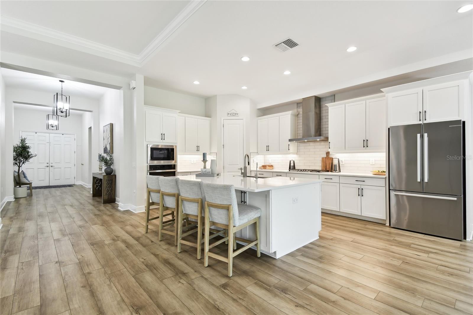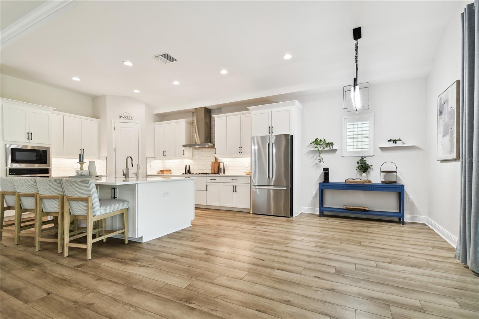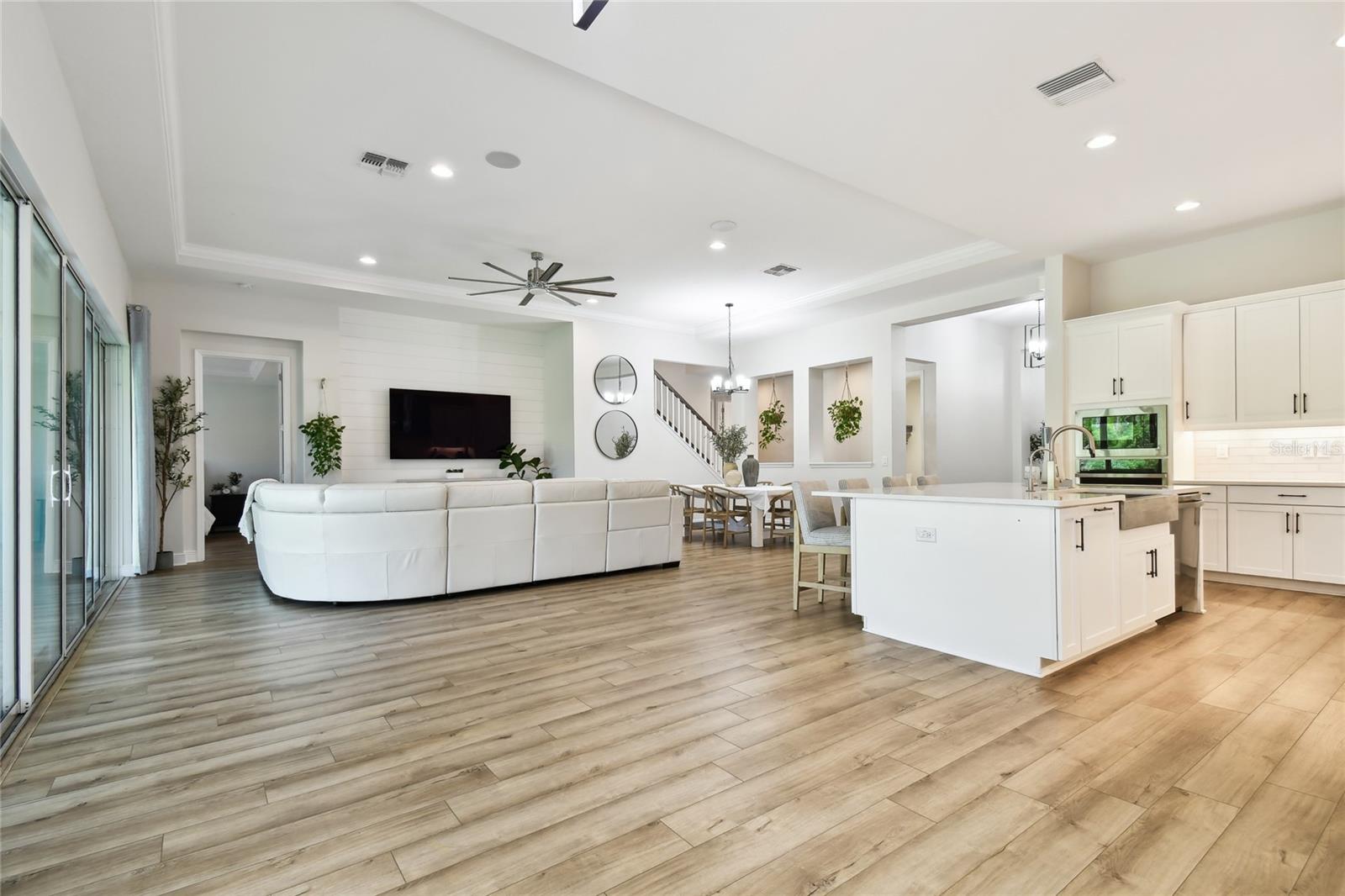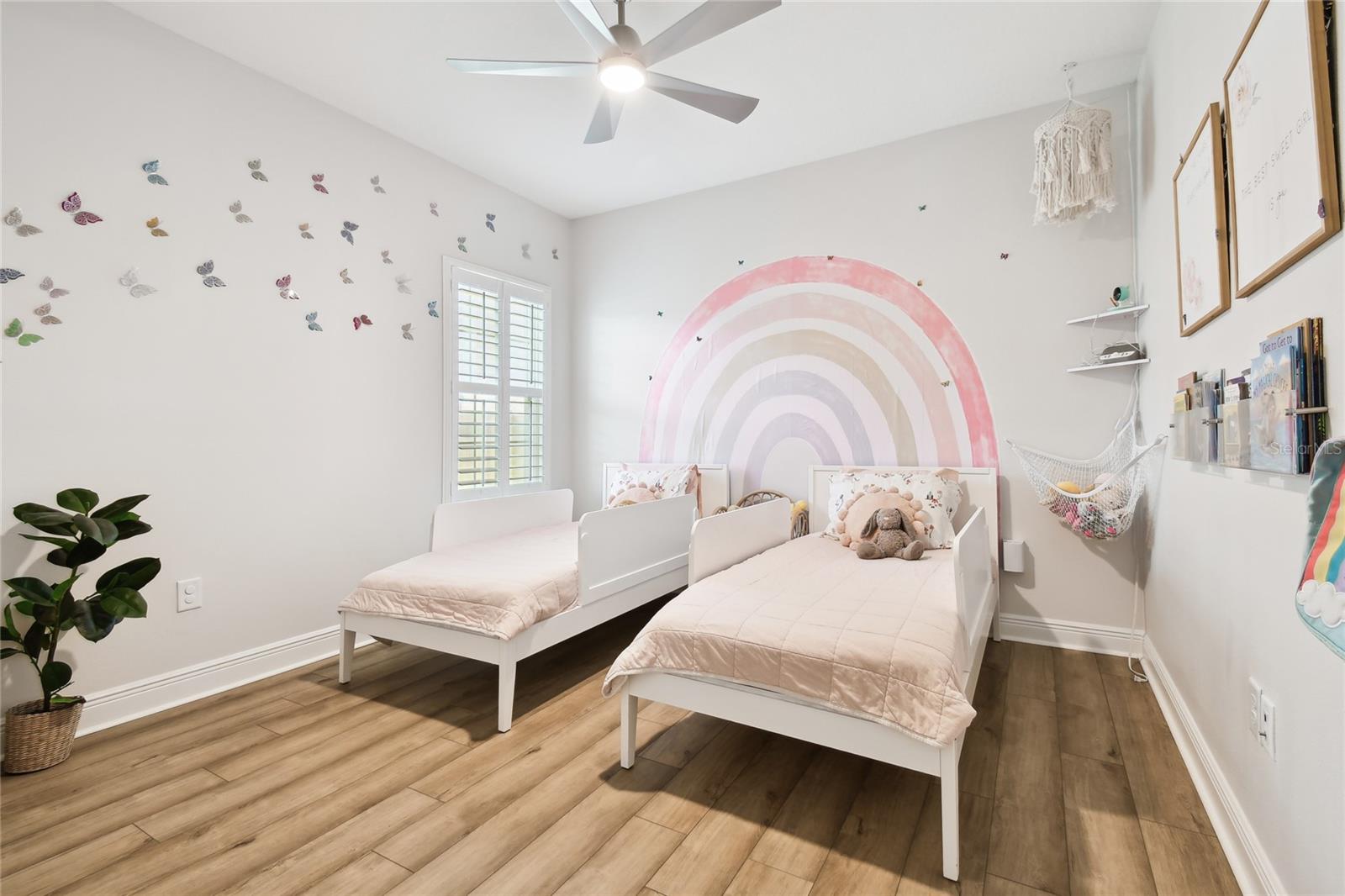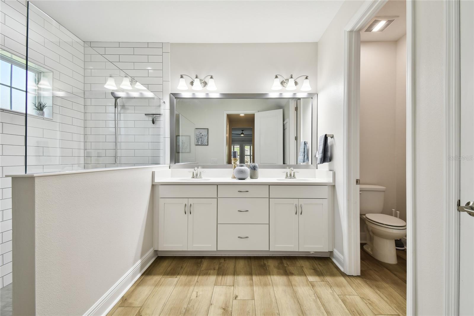 Luxury Living on Oversized Conservation Lot – 5BR/5BA Bayshore II by Homes by West Bay! Experience resort-style living in this stunning 5-bedroom, 5-bathroom Bayshore II, nestled on a rare, oversized .26-acre fully fenced conservation lot in the award-winning Connerton community. This move-in-ready home features 3,283 sq. ft. of meticulously maintained space, an open-concept design, and luxury upgrades throughout. Enjoy easy living with a split-bedroom layout that offers privacy for the owner’s retreat and secondary bedrooms. Step through the 8ft double doors into the wide double foyer into a grand room that seamlessly blends with the deluxe kitchen, casual dining area, and panoramic screened lanai—perfect for entertaining or simply relaxing while enjoying serene nature views. The chef’s kitchen is a showstopper, boasting a massive quartz island with double-sided cabinetry, GE Profile stainless steel appliances, 42” cabinets, subway tile backsplash, farmhouse sink, and a custom walk-in pantry with wood shelving. Tray ceilings, crown molding, luxury vinyl plank flooring, and plantation shutters throughout the main living areas and bedrooms enhance the home’s refined ambiance. The owner’s retreat is tucked away for ultimate privacy and features tray ceilings, crown molding, dual walk-in closets, and a luxurious en-suite bath with quartz countertops, dual vanities, and a spacious walk-in shower. Two secondary bedrooms and a full bath are located off the foyer with upgraded finishes, while a fourth bedroom is privately situated near the laundry room and another full bath. Upstairs, you'll find a versatile bonus room, fifth bedroom, and full bath, perfect for a media room, guest suite, or teen retreat. Step outside to the expansive covered lanai with a panoramic screen enclosure, surround sound system, and full outdoor pool bath—an entertainer’s dream space that’s pre-plumbed for a pool and ready for your custom outdoor oasis. Additional standout features include reclaimed water irrigation, upgraded landscaping, custom light fixtures, a paved driveway, three-car garage, and exceptional curb appeal. Located in the highly desirable Connerton community, this home offers access to world-class amenities including a resort-style pool, splash park, fitness center, clubhouse, sports courts, scenic trails, and year-round resident events. The highly anticipated Pinecrest Academy opens Fall 2025, and a second clubhouse with pool, gym, and six pickleball courts is currently under construction. This is more than just a home—it’s a lifestyle. Don’t miss your opportunity to own one of the most impressive conservation homesites in Connerton.