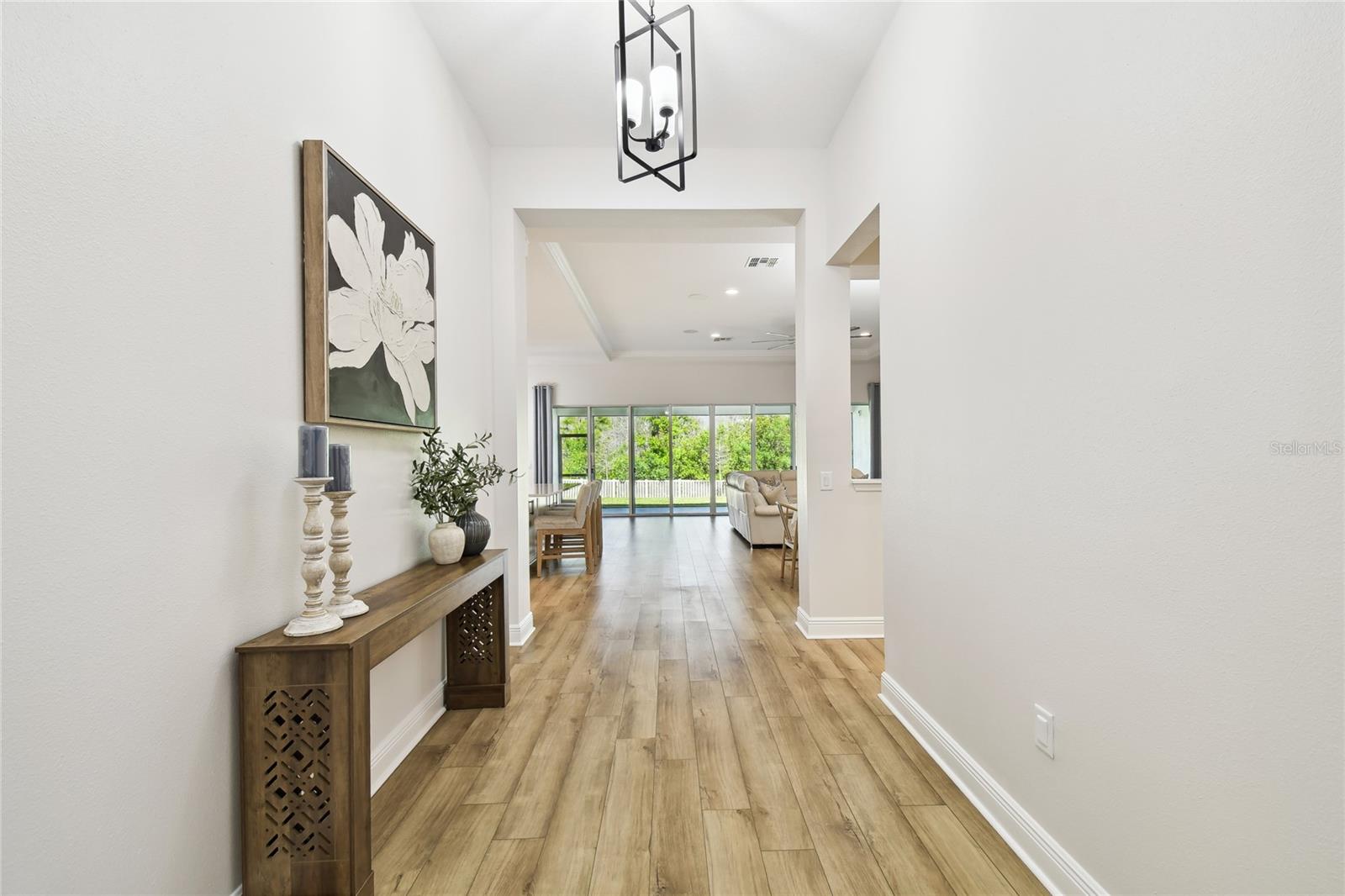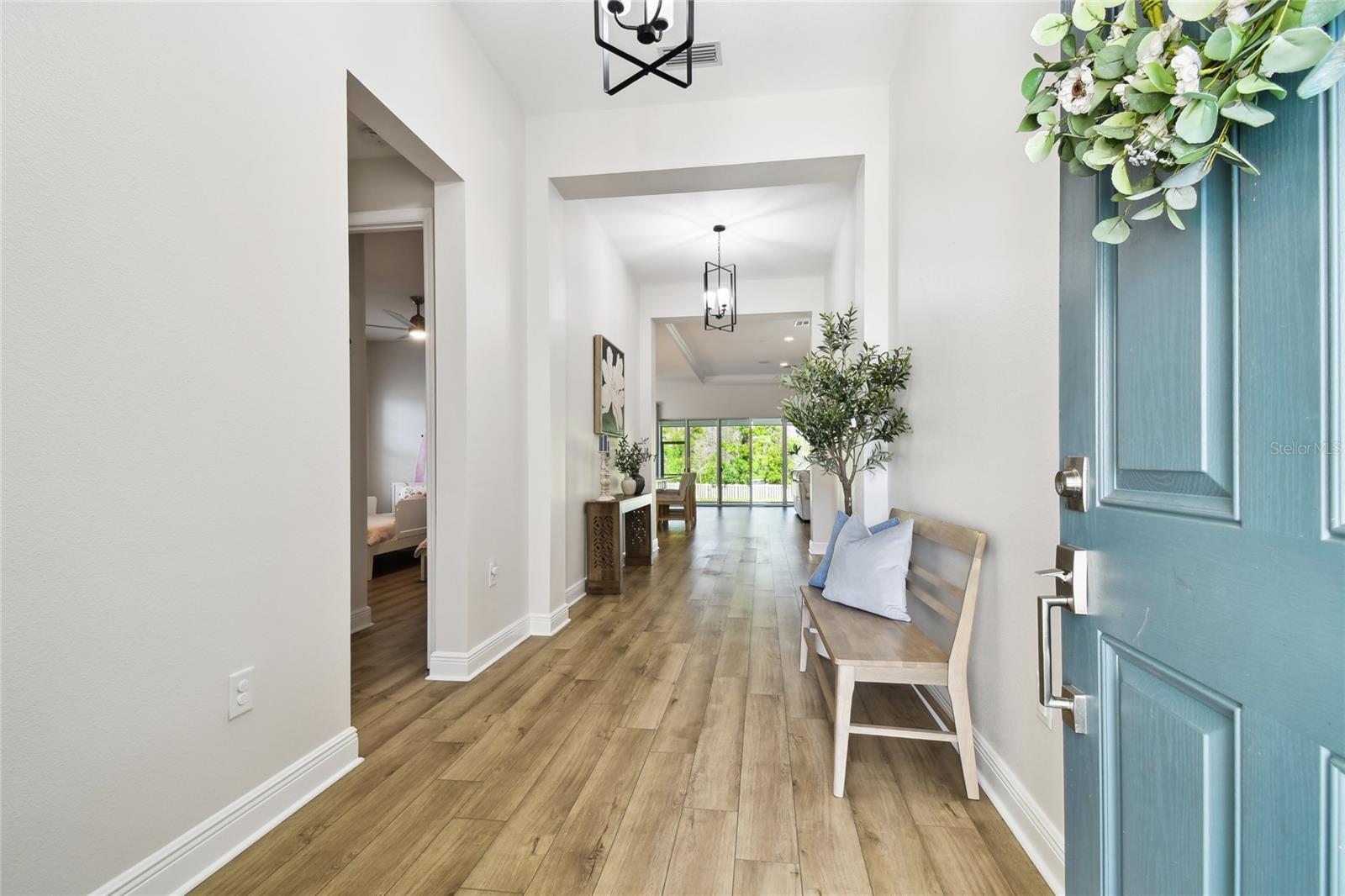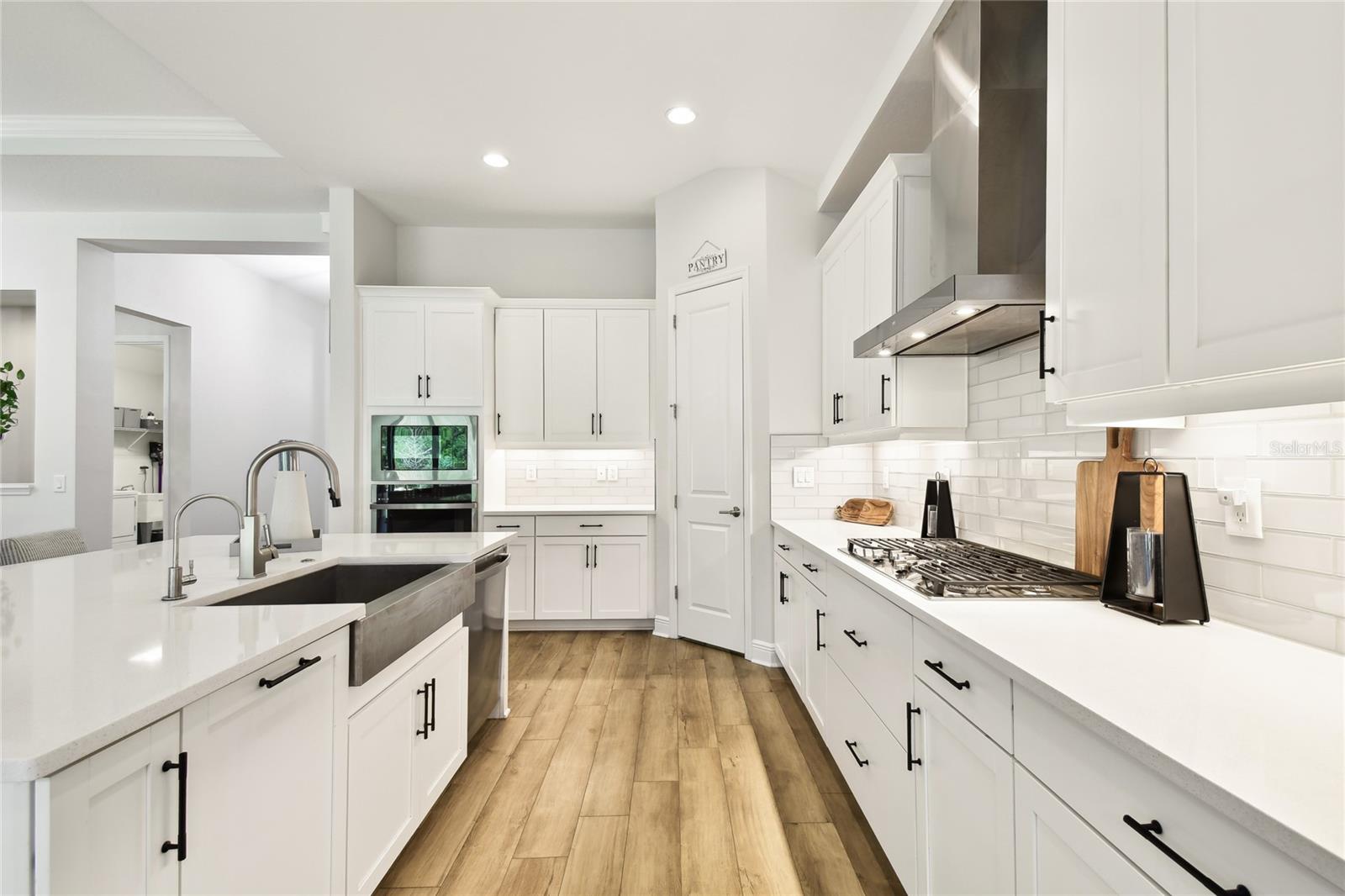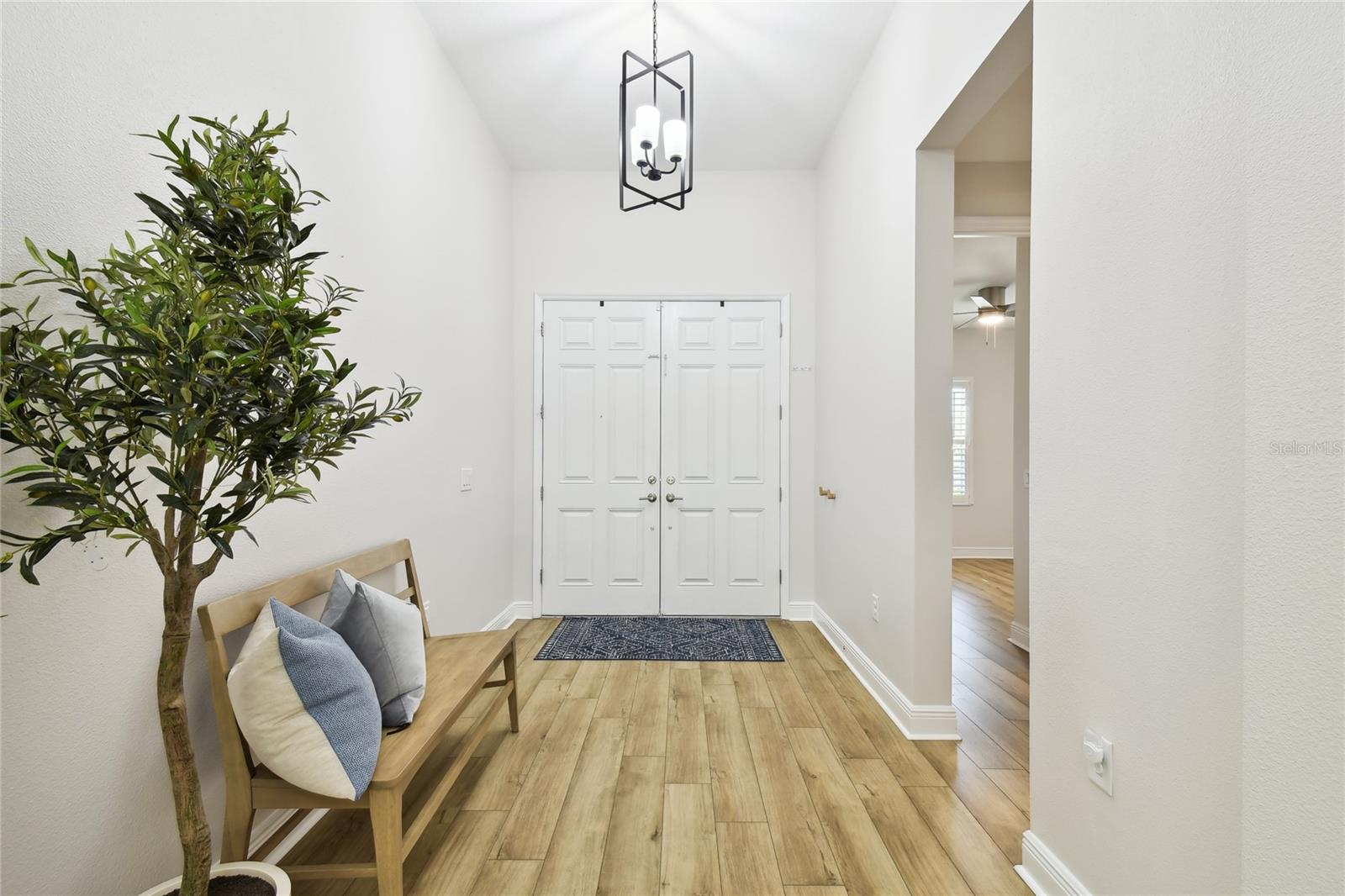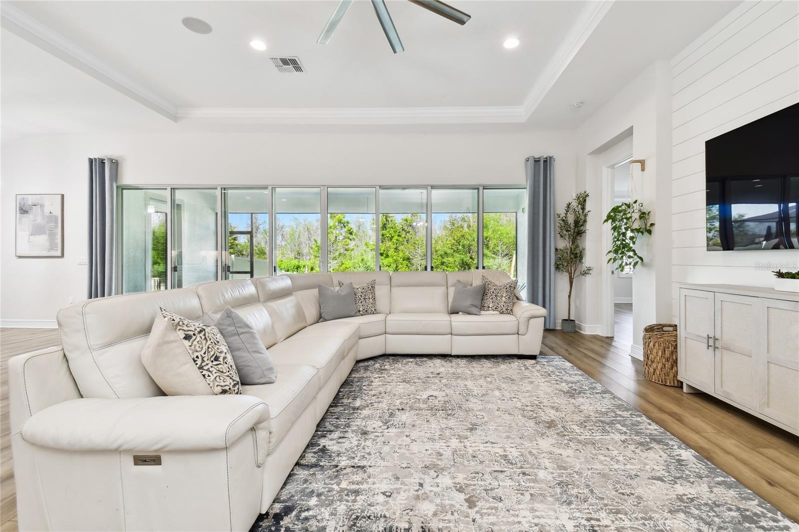 Luxury Living on Oversized Conservation Lot – 5BR/5BA Bayshore II by Homes by West Bay! Experience resort-style living in this stunning 5-bedroom, 5-bathroom Bayshore II, nestled on a rare, oversized .26-acre fully fenced conservation lot in the award-winning Connerton community. This move-in-ready home features 3,283 sq. ft. of meticulously maintained space, an open-concept design, and luxury upgrades throughout. Enjoy easy living with a split-bedroom layout that offers privacy for the owner’s retreat and secondary bedrooms. Step through the 8ft double doors into the wide double foyer into a grand room that seamlessly blends with the deluxe kitchen, casual dining area, and panoramic screened lanai—perfect for entertaining or simply relaxing while enjoying serene nature views. The chef’s kitchen is a showstopper, boasting a massive quartz island with double-sided cabinetry, GE Profile stainless steel appliances, 42” cabinets, subway tile backsplash, farmhouse sink, and a custom walk-in pantry with wood shelving. Tray ceilings, crown molding, luxury vinyl plank flooring, and plantation shutters throughout the main living areas and bedrooms enhance the home’s refined ambiance. The owner’s retreat is tucked away for ultimate privacy and features tray ceilings, crown molding, dual walk-in closets, and a luxurious en-suite bath with quartz countertops, dual vanities, and a spacious walk-in shower. Two secondary bedrooms and a full bath are located off the foyer with upgraded finishes, while a fourth bedroom is privately situated near the laundry room and another full bath. Upstairs, you'll find a versatile bonus room, fifth bedroom, and full bath, perfect for a media room, guest suite, or teen retreat. Step outside to the expansive covered lanai with a panoramic screen enclosure, surround sound system, and full outdoor pool bath—an entertainer’s dream space that’s pre-plumbed for a pool and ready for your custom outdoor oasis. Additional standout features include reclaimed water irrigation, upgraded landscaping, custom light fixtures, a paved driveway, three-car garage, and exceptional curb appeal. Located in the highly desirable Connerton community, this home offers access to world-class amenities including a resort-style pool, splash park, fitness center, clubhouse, sports courts, scenic trails, and year-round resident events. The highly anticipated Pinecrest Academy opens Fall 2025, and a second clubhouse with pool, gym, and six pickleball courts is currently under construction. This is more than just a home—it’s a lifestyle. Don’t miss your opportunity to own one of the most impressive conservation homesites in Connerton.