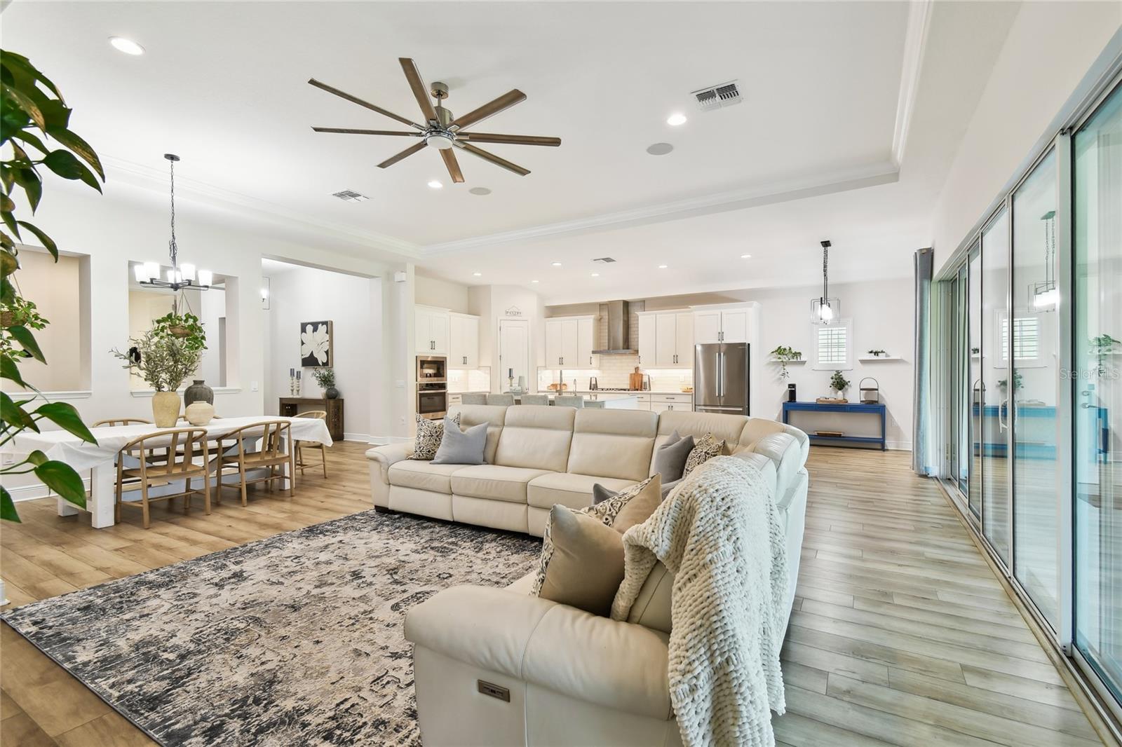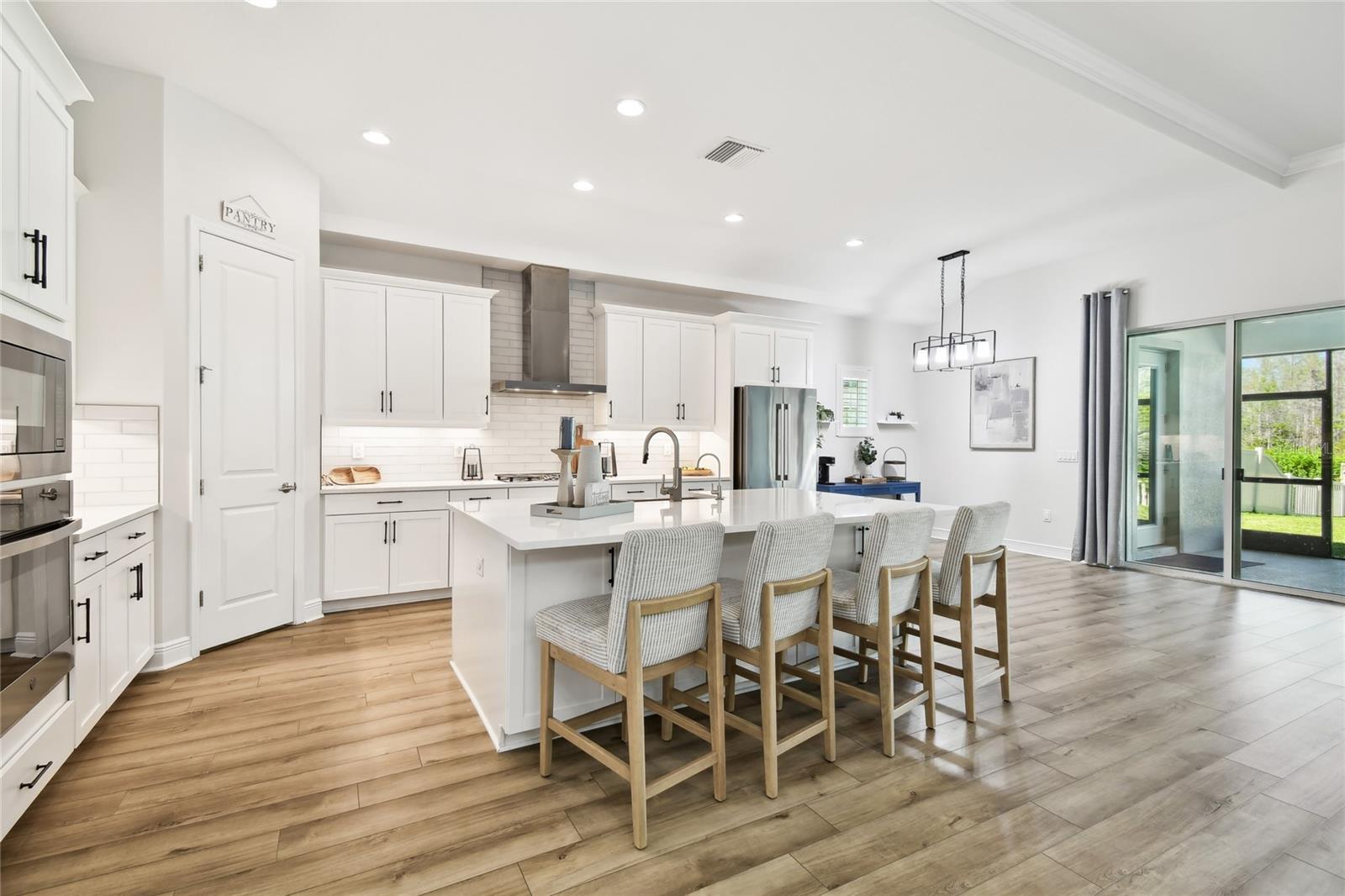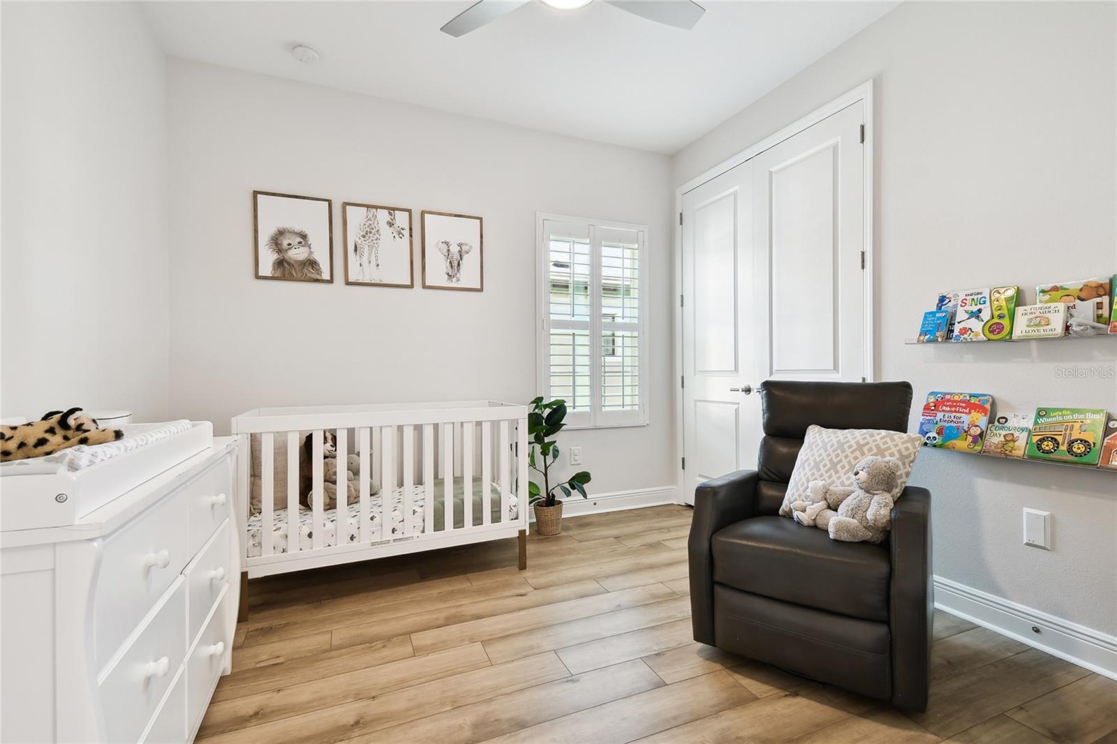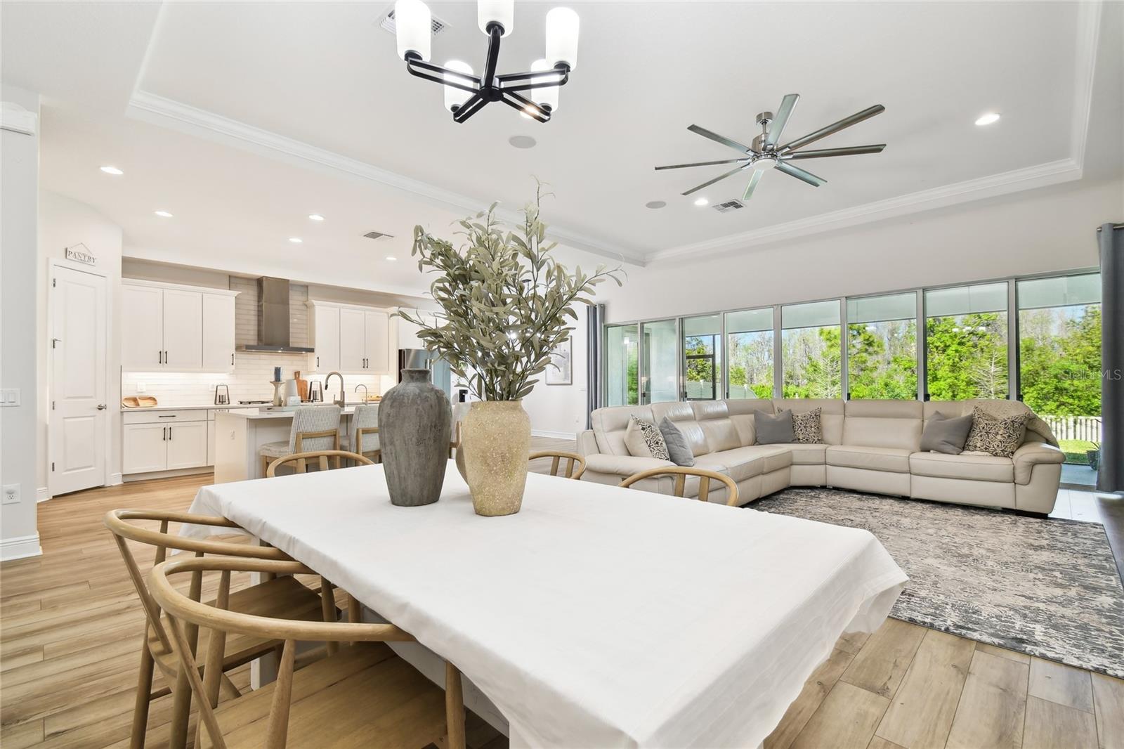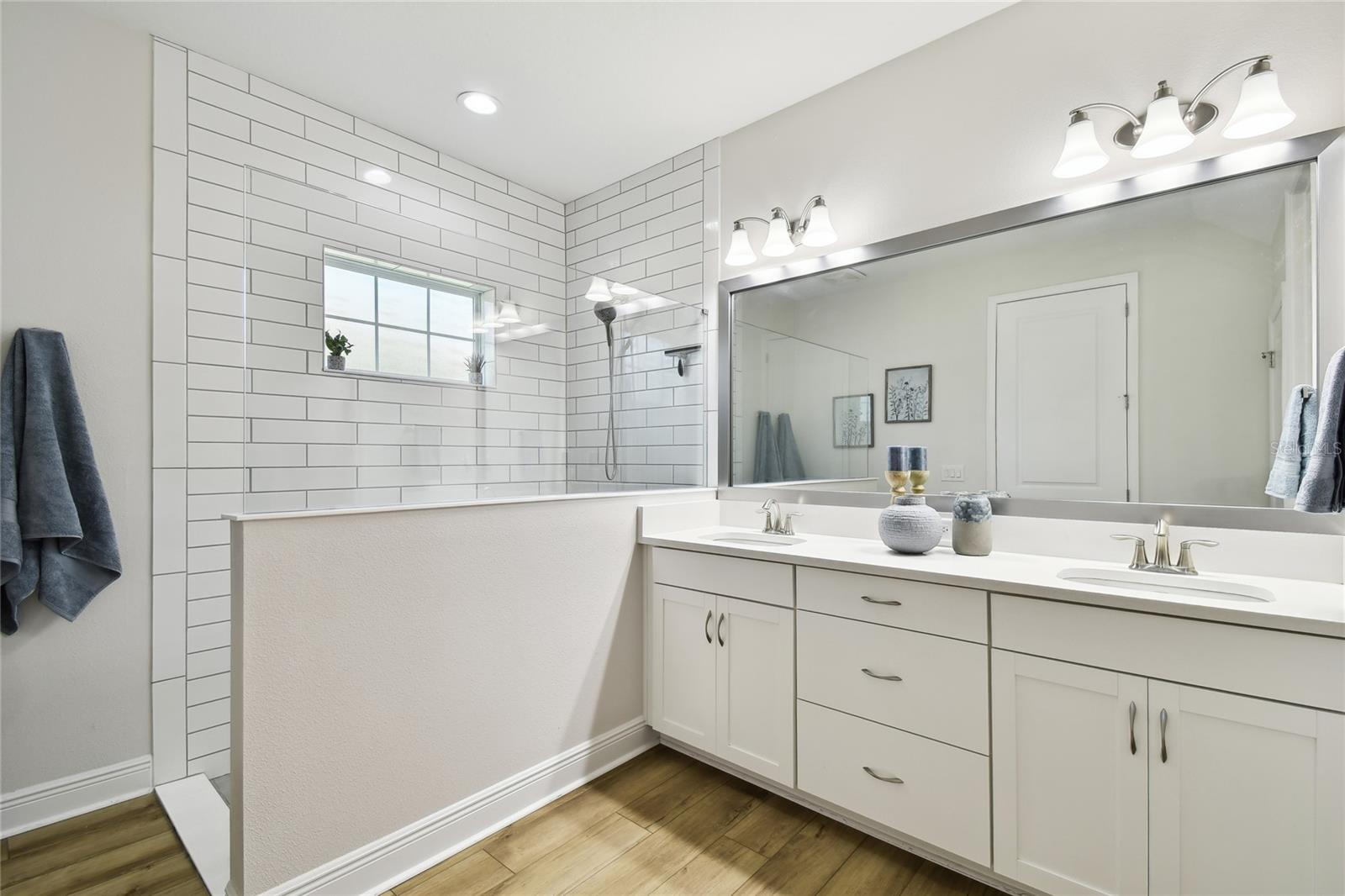 Luxury Living on Oversized Conservation Lot – 5BR/5BA Bayshore II by Homes by West Bay! Experience resort-style living in this stunning 5-bedroom, 5-bathroom Bayshore II, nestled on a rare, oversized .26-acre fully fenced conservation lot in the award-winning Connerton community. This move-in-ready home features 3,283 sq. ft. of meticulously maintained space, an open-concept design, and luxury upgrades throughout. Enjoy easy living with a split-bedroom layout that offers privacy for the owner’s retreat and secondary bedrooms. Step through the 8ft double doors into the wide double foyer into a grand room that seamlessly blends with the deluxe kitchen, casual dining area, and panoramic screened lanai—perfect for entertaining or simply relaxing while enjoying serene nature views. The chef’s kitchen is a showstopper, boasting a massive quartz island with double-sided cabinetry, GE Profile stainless steel appliances, 42” cabinets, subway tile backsplash, farmhouse sink, and a custom walk-in pantry with wood shelving. Tray ceilings, crown molding, luxury vinyl plank flooring, and plantation shutters throughout the main living areas and bedrooms enhance the home’s refined ambiance. The owner’s retreat is tucked away for ultimate privacy and features tray ceilings, crown molding, dual walk-in closets, and a luxurious en-suite bath with quartz countertops, dual vanities, and a spacious walk-in shower. Two secondary bedrooms and a full bath are located off the foyer with upgraded finishes, while a fourth bedroom is privately situated near the laundry room and another full bath. Upstairs, you'll find a versatile bonus room, fifth bedroom, and full bath, perfect for a media room, guest suite, or teen retreat. Step outside to the expansive covered lanai with a panoramic screen enclosure, surround sound system, and full outdoor pool bath—an entertainer’s dream space that’s pre-plumbed for a pool and ready for your custom outdoor oasis. Additional standout features include reclaimed water irrigation, upgraded landscaping, custom light fixtures, a paved driveway, three-car garage, and exceptional curb appeal. Located in the highly desirable Connerton community, this home offers access to world-class amenities including a resort-style pool, splash park, fitness center, clubhouse, sports courts, scenic trails, and year-round resident events. The highly anticipated Pinecrest Academy opens Fall 2025, and a second clubhouse with pool, gym, and six pickleball courts is currently under construction. This is more than just a home—it’s a lifestyle. Don’t miss your opportunity to own one of the most impressive conservation homesites in Connerton.
