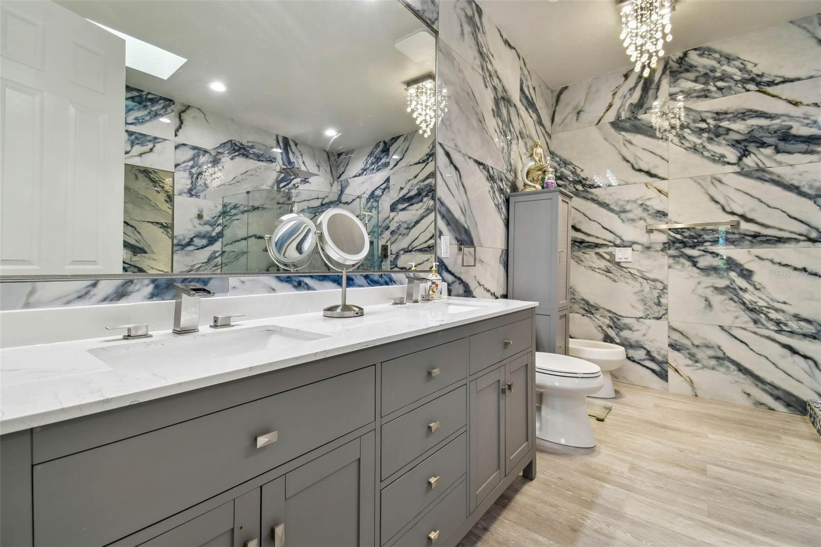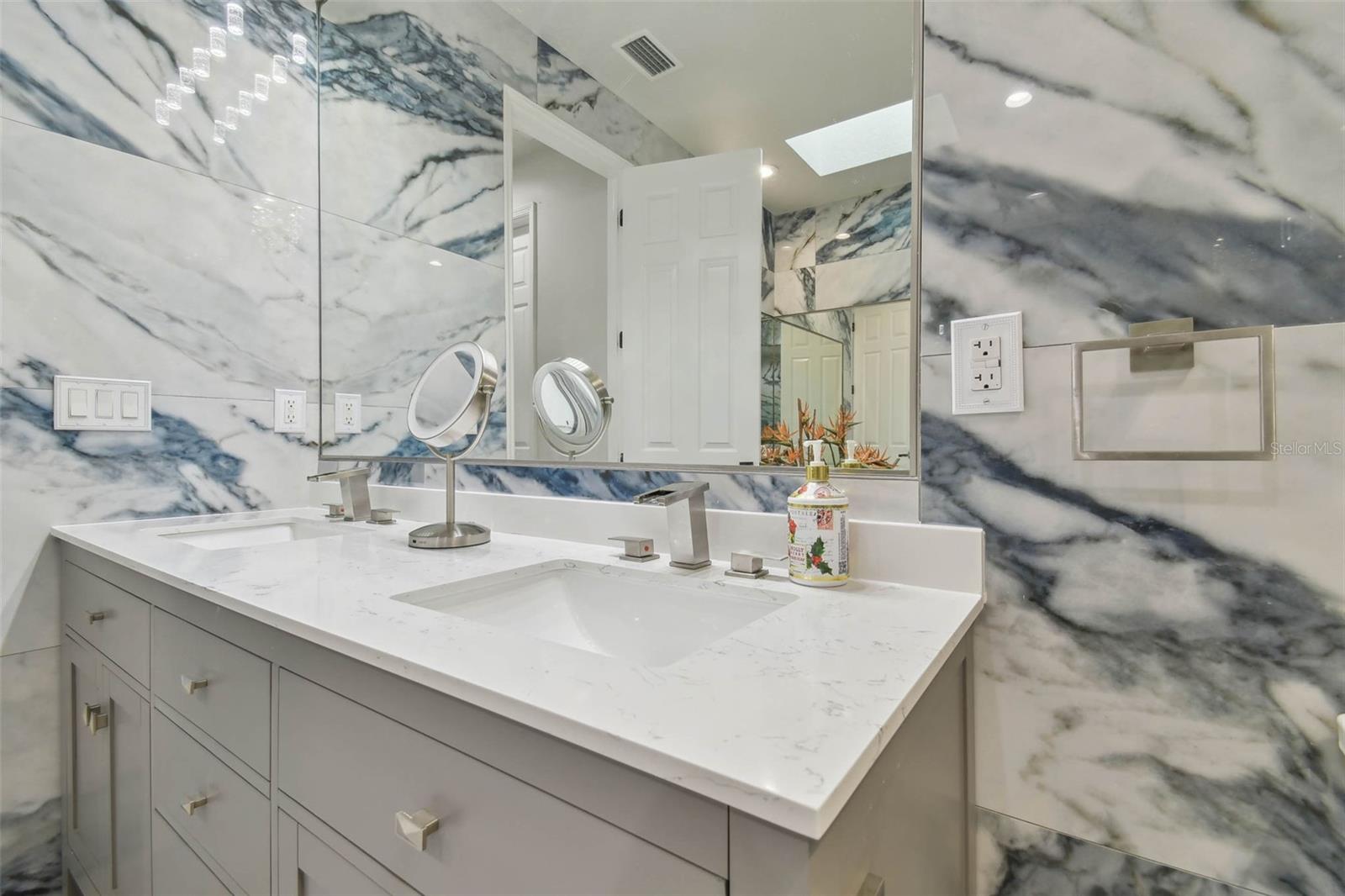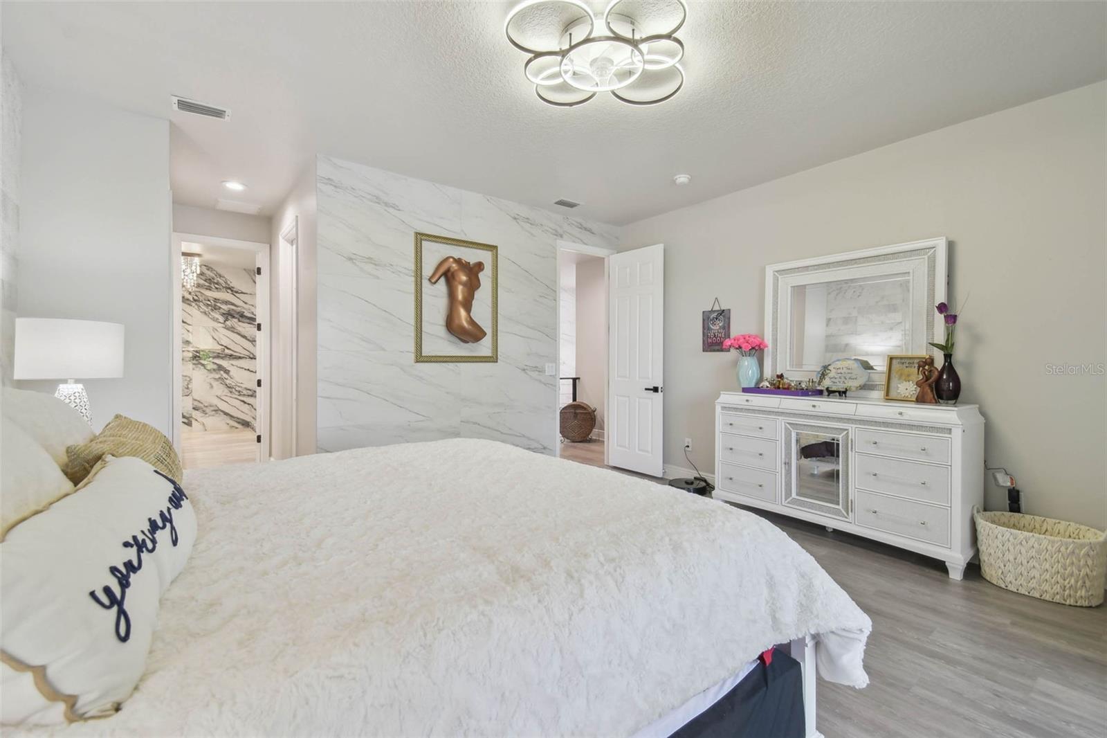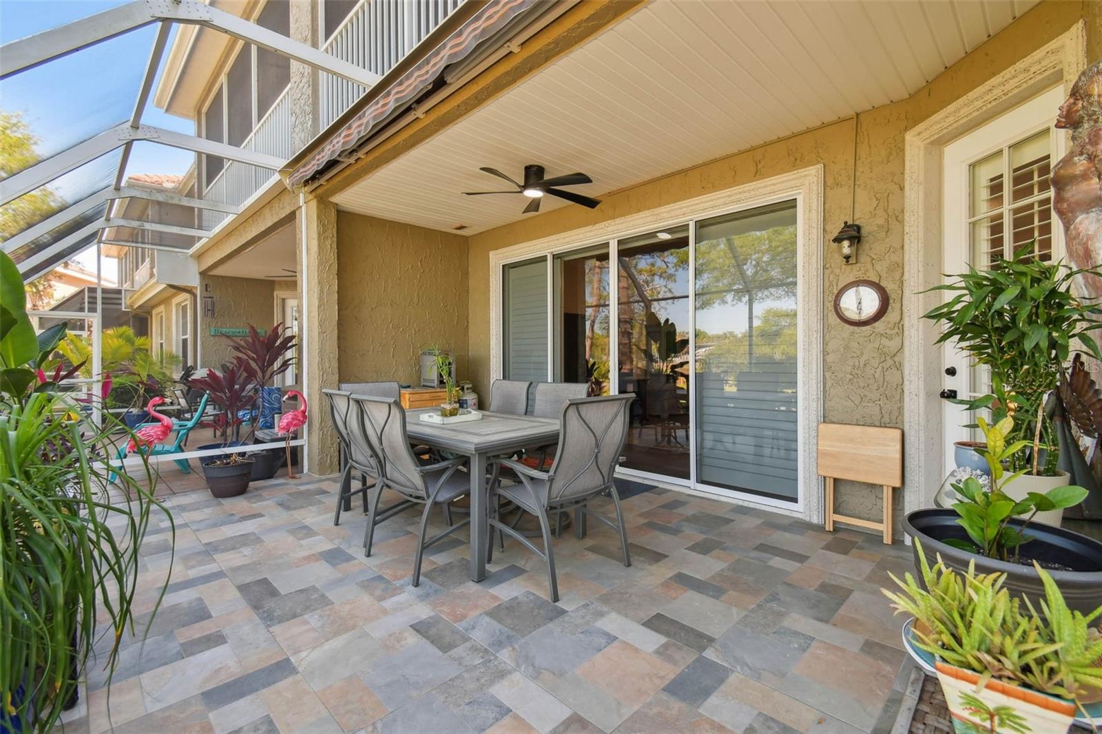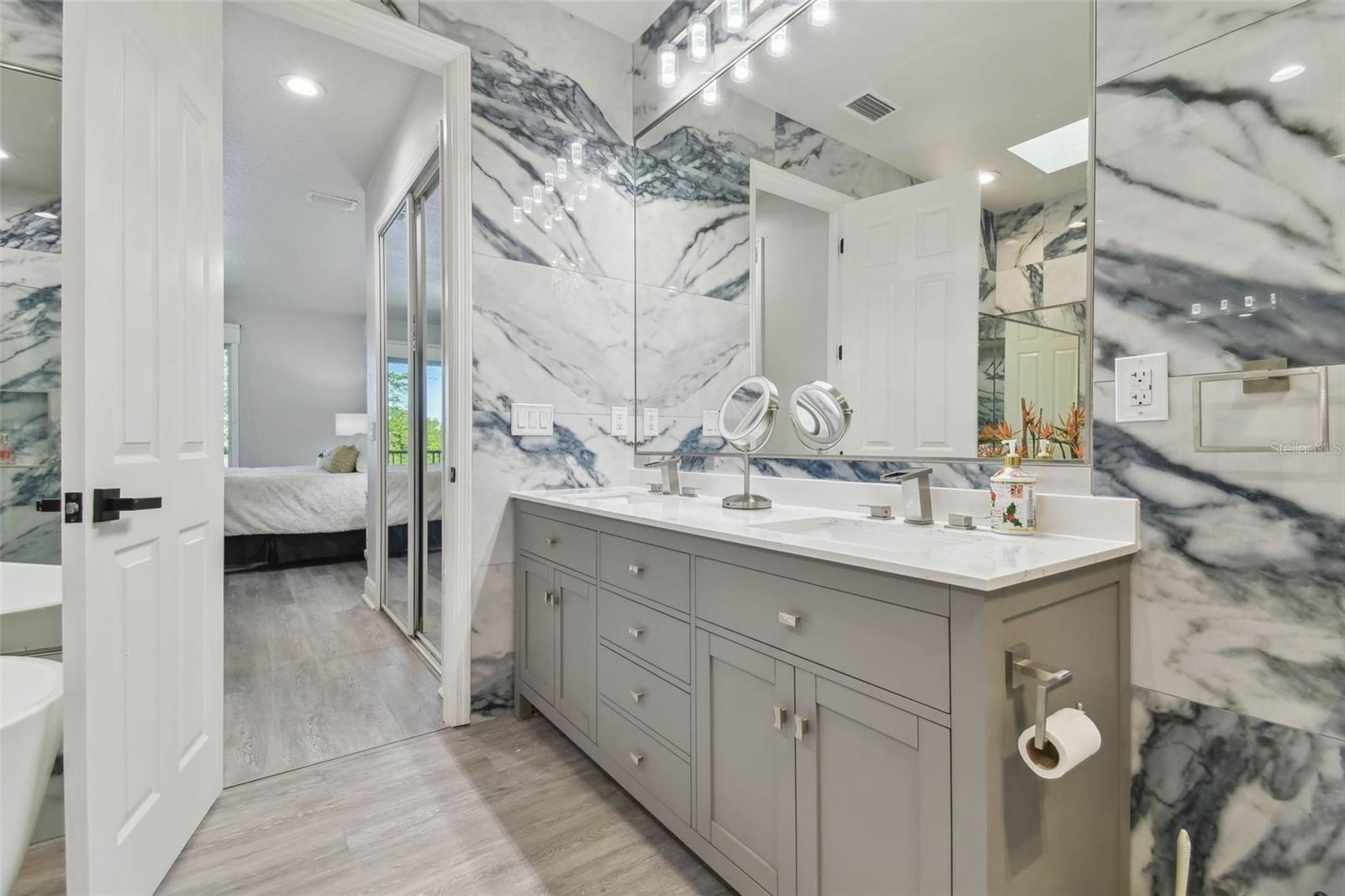 Indulge in the epitome of luxury with this exquisite waterfront Villa in Land o Lakes. Prepare to be captivated by the sheer opulence of this two-story haven, meticulously remodeled to perfection. Boasting a rare gem in the prestigious Caliente community, this Villa is a true treasure, with only 48 units in existence, and seldom does one become available for sale. As you enter through the grand doorway, a world of creative extravagance unfolds before you. Marvel at the custom marble tile walls and the industrial-style staircase adorned with cascading motion-sensing LED lighting. The first floor beckons with an open layout, flooded with natural light, encompassing a gourmet kitchen, dining area, and a living space featuring a bespoke bar with marble accents, custom storage, wine cabinets, and a cutting-edge wine fridge. The kitchen is a masterpiece of modern design, with custom deep drawers, soft-close technology, and top-of-the-line appliances including a Miele dishwasher, Samsung refrigerator with see-thru technology, and a Samsung convection oven with Wi-Fi capabilities. The entire house exudes elegance, with new Sherwin Williams paint, waterproof LVP flooring, and LED lighting enhancing every corner. Upstairs, the three bedrooms and bathrooms have been completely transformed, showcasing marble walls, custom cabinetry, and luxurious fixtures. Each bathroom is a sanctuary in itself. Primary bathroom is featuring an oversized rain shower and a floating bathtub under a skylight. The attention to detail is unparalleled, with too many upgrades to list. Step outside into your personal oasis and be enveloped by the tranquility of the picturesque waterfront views and lush landscaping. This is a sanctuary where you can truly unwind and rejuvenate, leaving all worries behind. The inside of this Villa is spectacular but so is the outside. Enjoy sipping your cocktail and watching the water display in the lake from your huge screened in patio right off the living area or take in the serene and tranquil lake views from the screened in balcony off the master bedroom. Located in the exclusive Caliente community, a clothing-optional gated paradise, residents are treated to a plethora of amenities including live entertainment, nightclubs, bars, restaurants, spa, gym, pools, tennis courts, and a variety of activities. With its proximity to Tampa airport, shopping centers, golf courses, and Gulf Beaches, this Villa offers a lifestyle of unparalleled luxury and convenience. For the discerning buyer, the option to purchase this Villa fully furnished is available. Embrace the extraordinary and make this luxurious retreat your own.