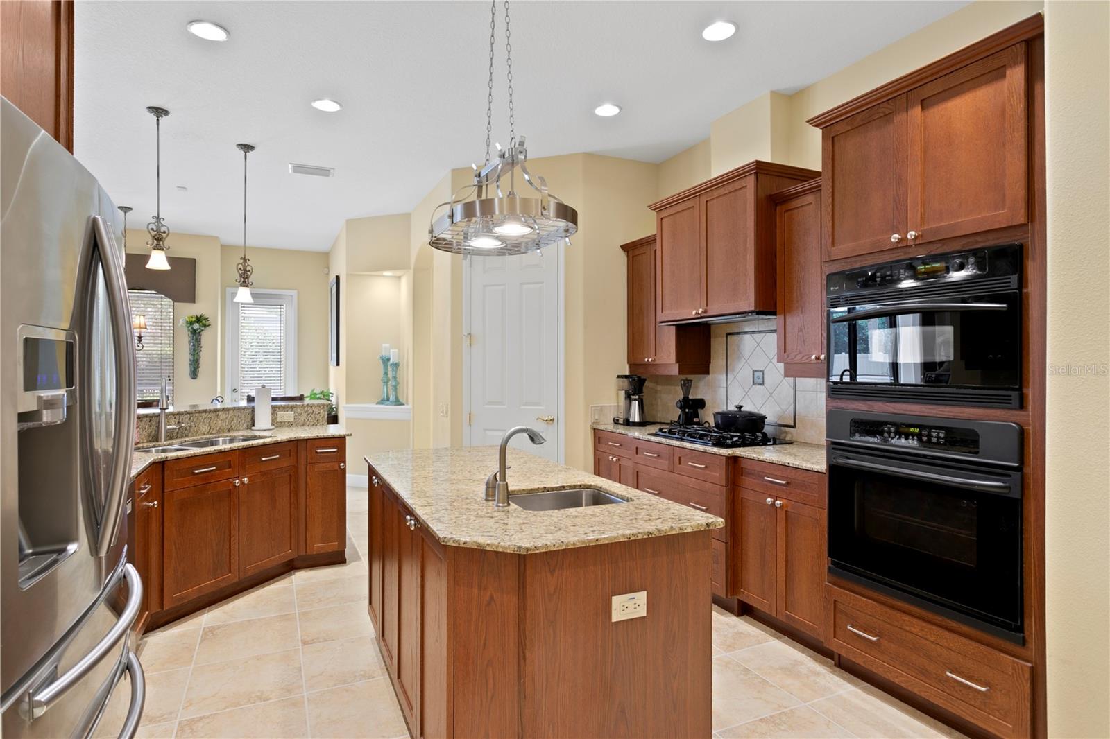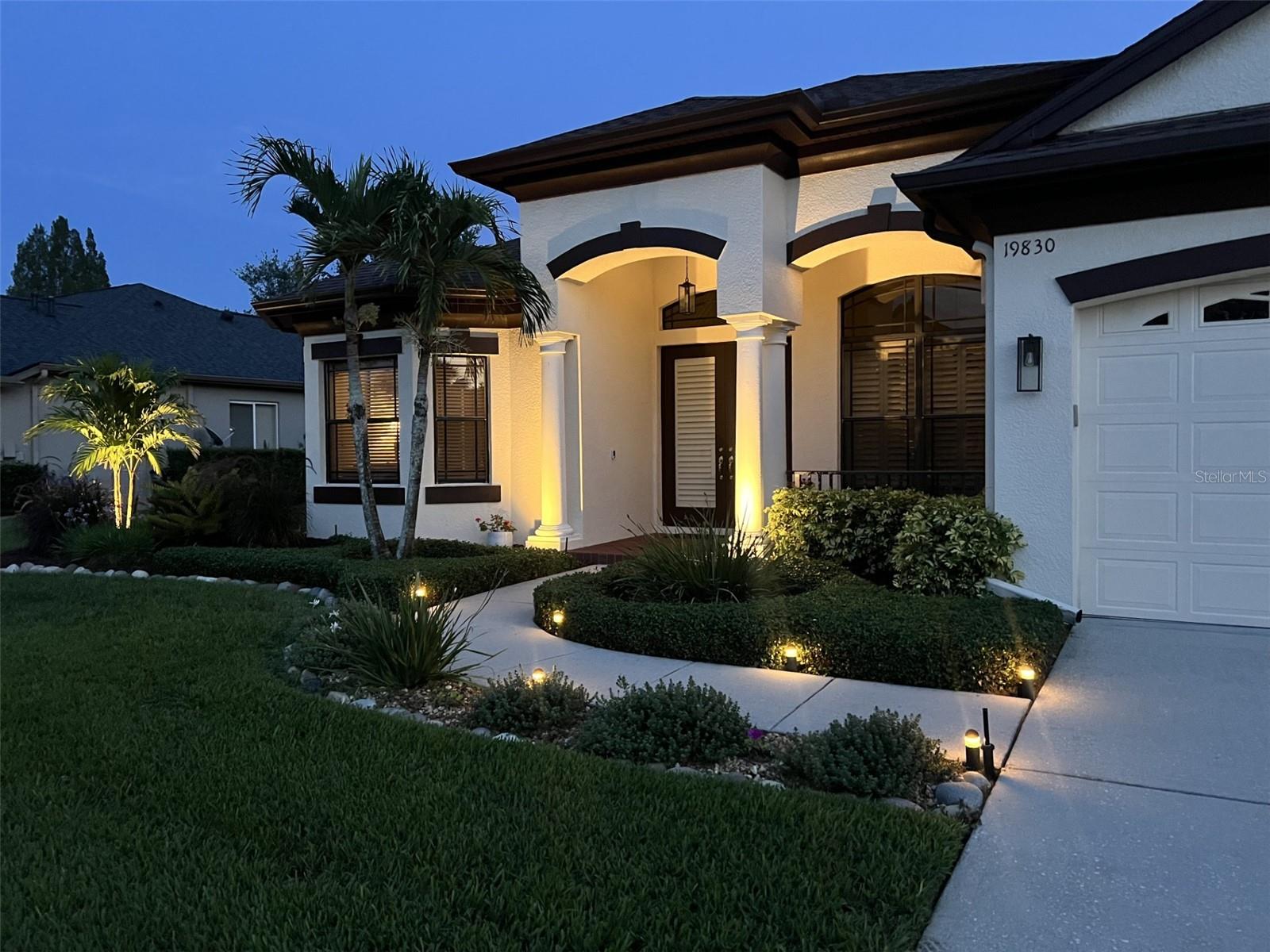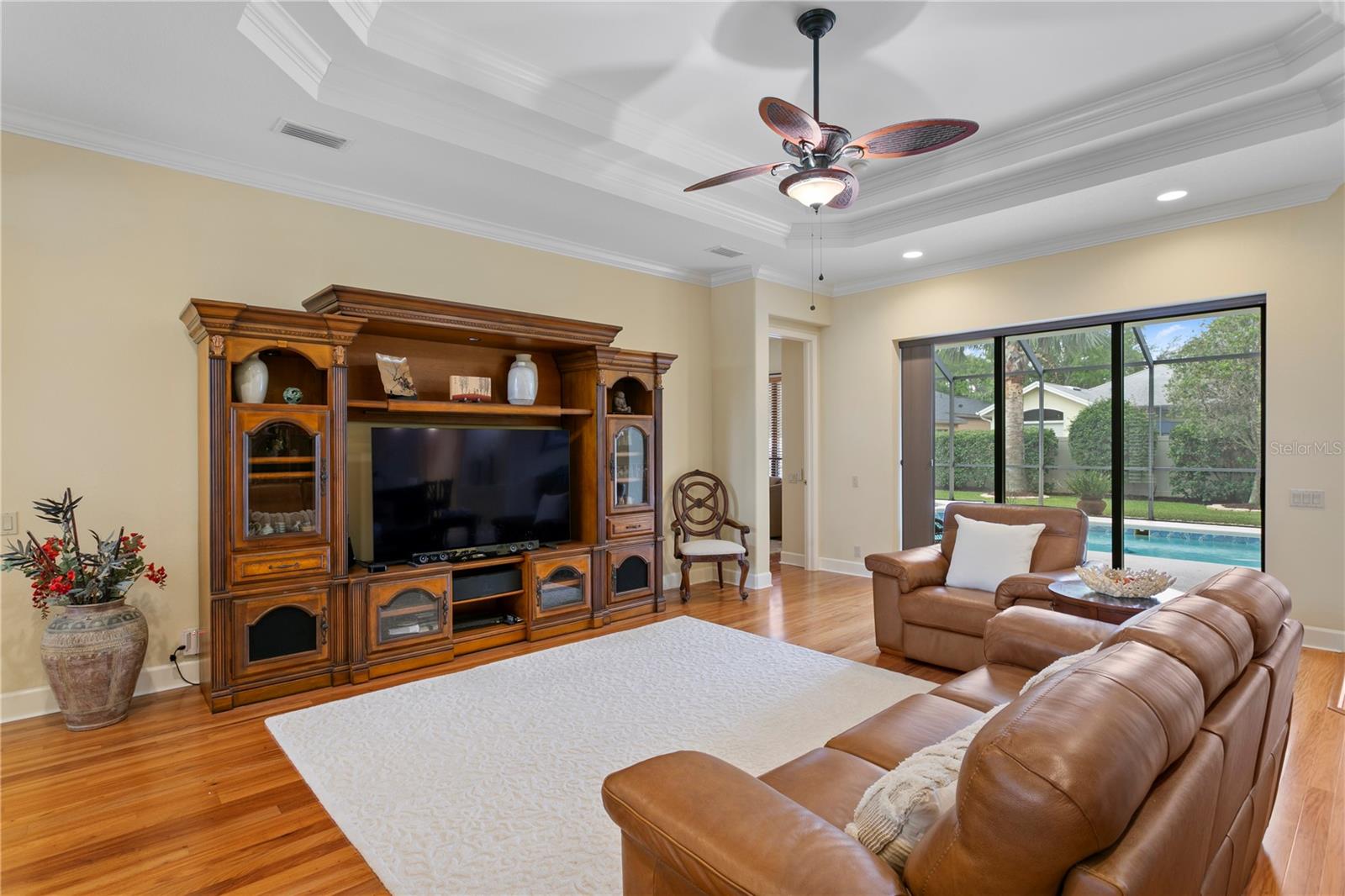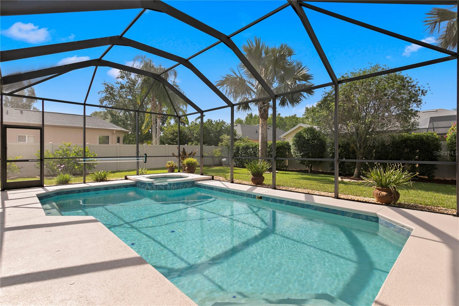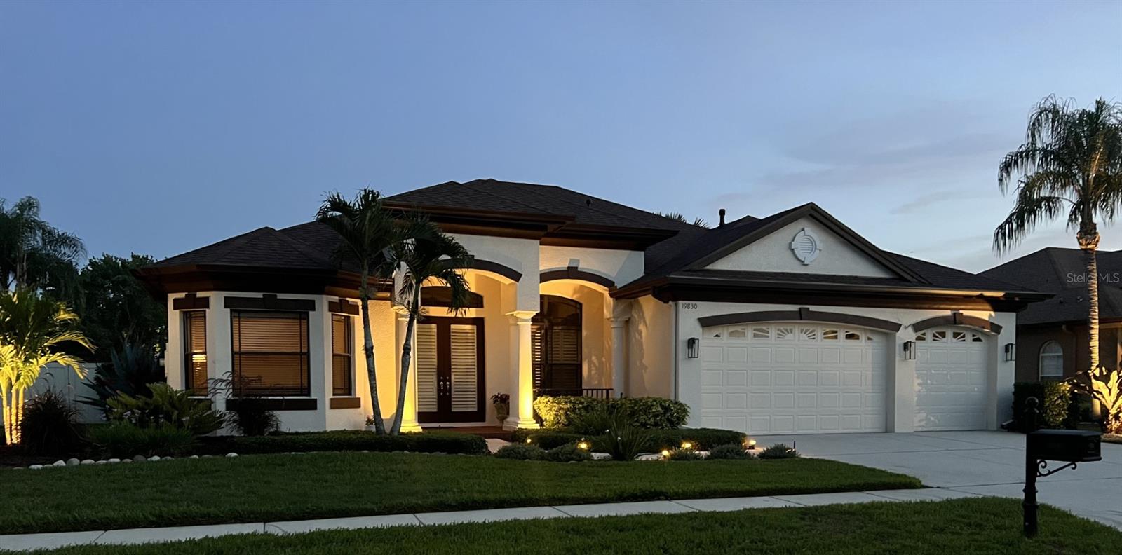 Welcome to your dream home in the gated Strathmore Village. This gorgeous Arthur Rutenberg Coquina pool/spa home boasts undeniable curb appeal and is nestled in the Oakstead Development. This home features 3 spacious bedrooms, 3 baths, and den/office with custom built-ins (which can be easily converted into a 4th bedroom) and 3 car garage. Step inside and discover architectural design details that include 12’ tray ceilings in the formal dining area and great room separated by a pass-through granite top with wood cabinets and tapered columns. Engineered hardwood floors, tiled wet areas and SOARING 10’ ceilings throughout along with 8’ doors. Custom plantation shutters, shades, cornice window treatments and blinds add a touch of class. The triple sliders are completely retractable and offer access to the large oversized lanai with pool/spa that includes surround sound and outdoor shower. All fixed glass have bronze tinted windows. The CHEF’S KITCHEN boasts 42” wood cabinetry with crown, breakfast bar, morning room, tile backsplash, granite countertops, Double Sink, desirable GAS COOKTOP, built-in oven and convection /microwave, large central work island with separate PREP SINK, desk area with additional storage, roll-out pan drawers and walk-in pantry. The spacious owner’s suite offers private access to the pool area, 2 spacious walk-in closets, a large jetted jacuzzi soaking tub, walk-in shower with dual shower heads, linen closet and 2 separate vanity areas. 2nd bedroom has a walk-in closet with custom built-ins, double slider with access to cabana, an ensuite with walk-in shower, vanity and access to the pool. The 3rd bedroom has a bathroom with shower and tub conveniently located just outside the door and features a linen closet. The 3-car garage features 10.5’ ceilings with a side door, work benches and additional storage added (all convey), water softener, pull down stairs for easy access to the attic and bike pulleys. This home is complete with a NEW ROOF (2024), a NEW HVAC (2024), interior LED lighting and MOEN FIXTURES, CROWN MOLDING, newer rescreened pool cage, gutters, EXTERIOR PAINTED (2021) and large interior laundry room with utility sink, cabinets, storage closet and LG washer and dryer both recently replaced. NEST THERMOSTATS, Nest front door camera, Google kitchen hub monitor and Nest backyard camera all convey. Professional lush landscaping includes irrigation system, palm trees along with other landscaping details. Oakstead is a natural gas, deed-restricted community with resort-style amenities which include a clubhouse, lap/kiddie pool, fitness center, tennis and pickle ball courts, covered playground, and scenic 3-mile walking trail. AMAZING LOCATION with easy access to I-75, I-275, Suncoast Pkwy, Tampa International and St. Pete/Clearwater Airports, Restaurants, Shopping, Hospitals, Sports Venues and more! Please call today to schedule your private showing!