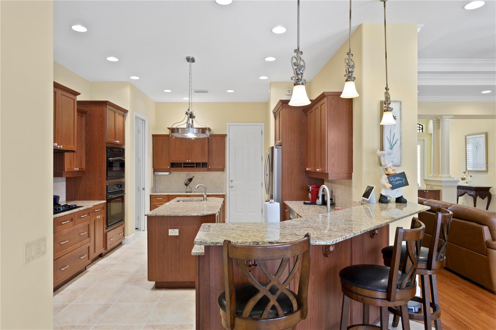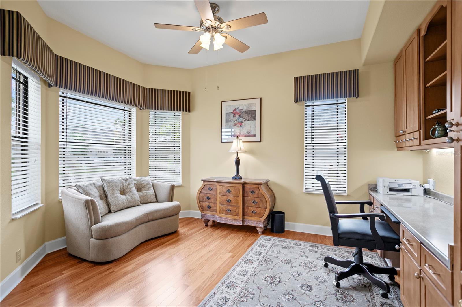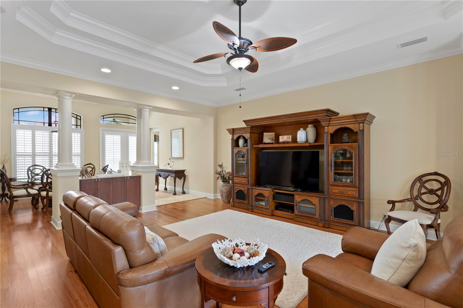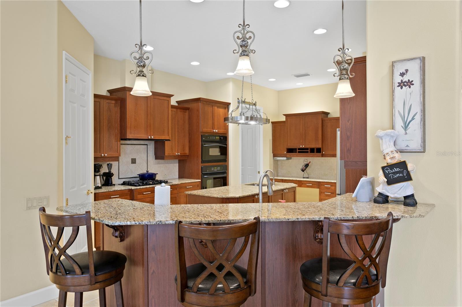 Welcome to your dream home in the gated Strathmore Village. This gorgeous Arthur Rutenberg Coquina pool/spa home boasts undeniable curb appeal and is nestled in the Oakstead Development. This home features 3 spacious bedrooms, 3 baths, and den/office with custom built-ins (which can be easily converted into a 4th bedroom) and 3 car garage. Step inside and discover architectural design details that include 12’ tray ceilings in the formal dining area and great room separated by a pass-through granite top with wood cabinets and tapered columns. Engineered hardwood floors, tiled wet areas and SOARING 10’ ceilings throughout along with 8’ doors. Custom plantation shutters, shades, cornice window treatments and blinds add a touch of class. The triple sliders are completely retractable and offer access to the large oversized lanai with pool/spa that includes surround sound and outdoor shower. All fixed glass have bronze tinted windows. The CHEF’S KITCHEN boasts 42” wood cabinetry with crown, breakfast bar, morning room, tile backsplash, granite countertops, Double Sink, desirable GAS COOKTOP, built-in oven and convection /microwave, large central work island with separate PREP SINK, desk area with additional storage, roll-out pan drawers and walk-in pantry. The spacious owner’s suite offers private access to the pool area, 2 spacious walk-in closets, a large jetted jacuzzi soaking tub, walk-in shower with dual shower heads, linen closet and 2 separate vanity areas. 2nd bedroom has a walk-in closet with custom built-ins, double slider with access to cabana, an ensuite with walk-in shower, vanity and access to the pool. The 3rd bedroom has a bathroom with shower and tub conveniently located just outside the door and features a linen closet. The 3-car garage features 10.5’ ceilings with a side door, work benches and additional storage added (all convey), water softener, pull down stairs for easy access to the attic and bike pulleys. This home is complete with a NEW ROOF (2024), a NEW HVAC (2024), interior LED lighting and MOEN FIXTURES, CROWN MOLDING, newer rescreened pool cage, gutters, EXTERIOR PAINTED (2021) and large interior laundry room with utility sink, cabinets, storage closet and LG washer and dryer both recently replaced. NEST THERMOSTATS, Nest front door camera, Google kitchen hub monitor and Nest backyard camera all convey. Professional lush landscaping includes irrigation system, palm trees along with other landscaping details. Oakstead is a natural gas, deed-restricted community with resort-style amenities which include a clubhouse, lap/kiddie pool, fitness center, tennis and pickle ball courts, covered playground, and scenic 3-mile walking trail. AMAZING LOCATION with easy access to I-75, I-275, Suncoast Pkwy, Tampa International and St. Pete/Clearwater Airports, Restaurants, Shopping, Hospitals, Sports Venues and more! Please call today to schedule your private showing!