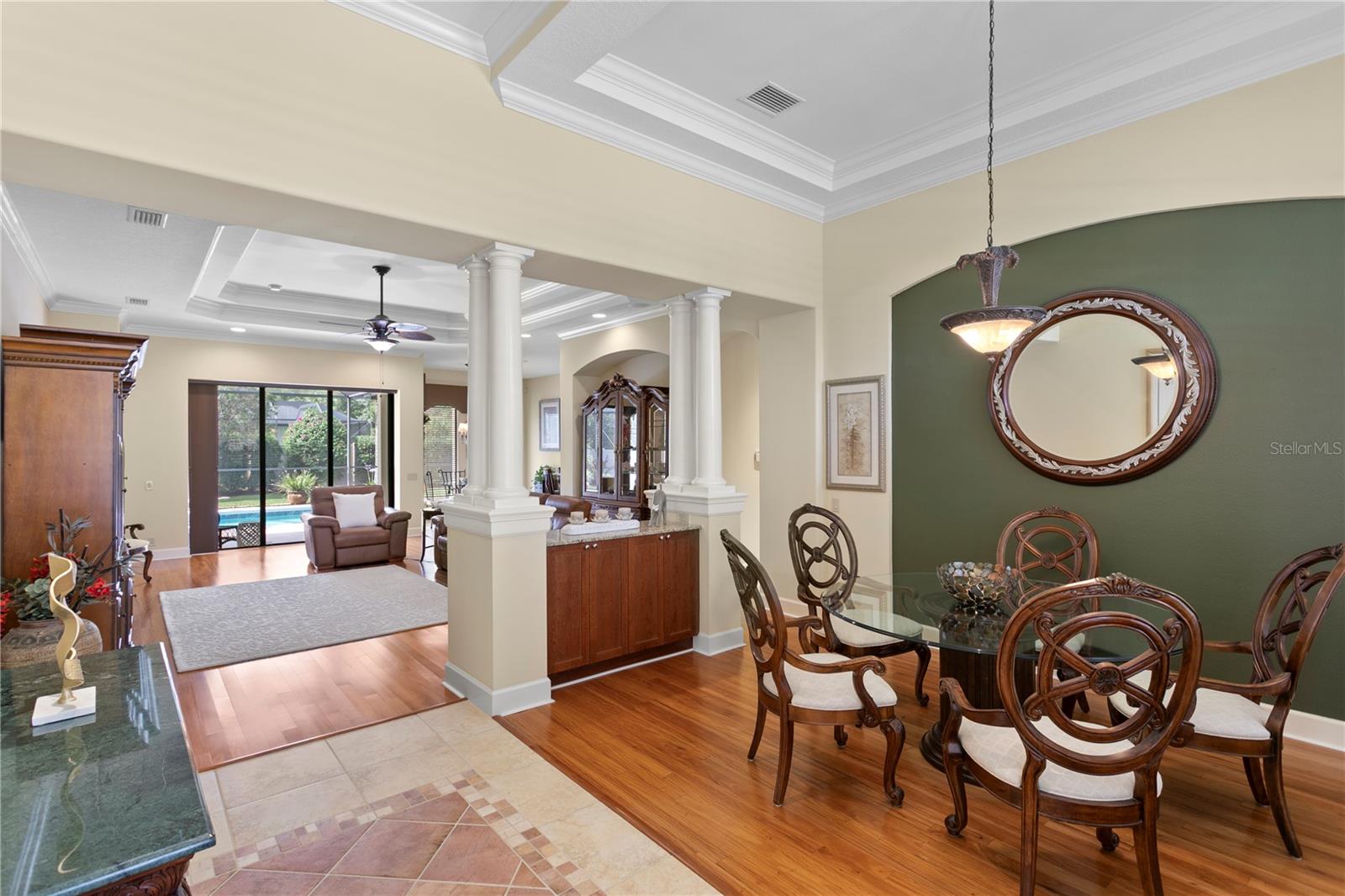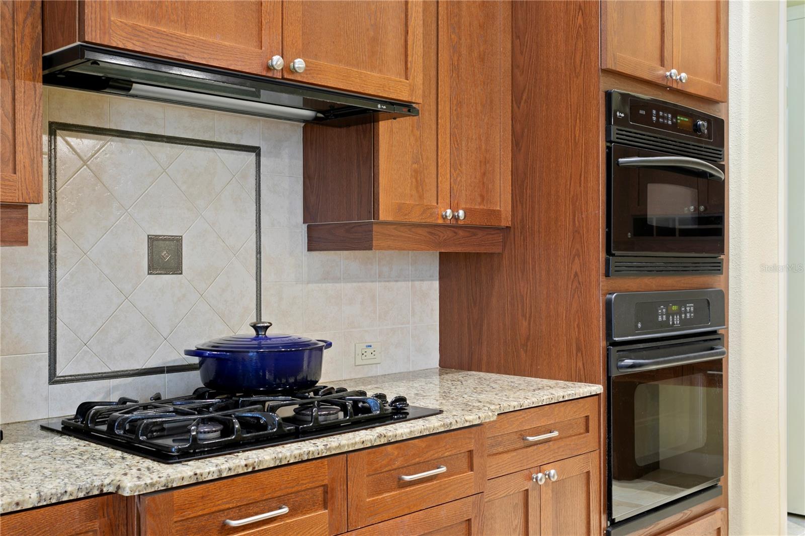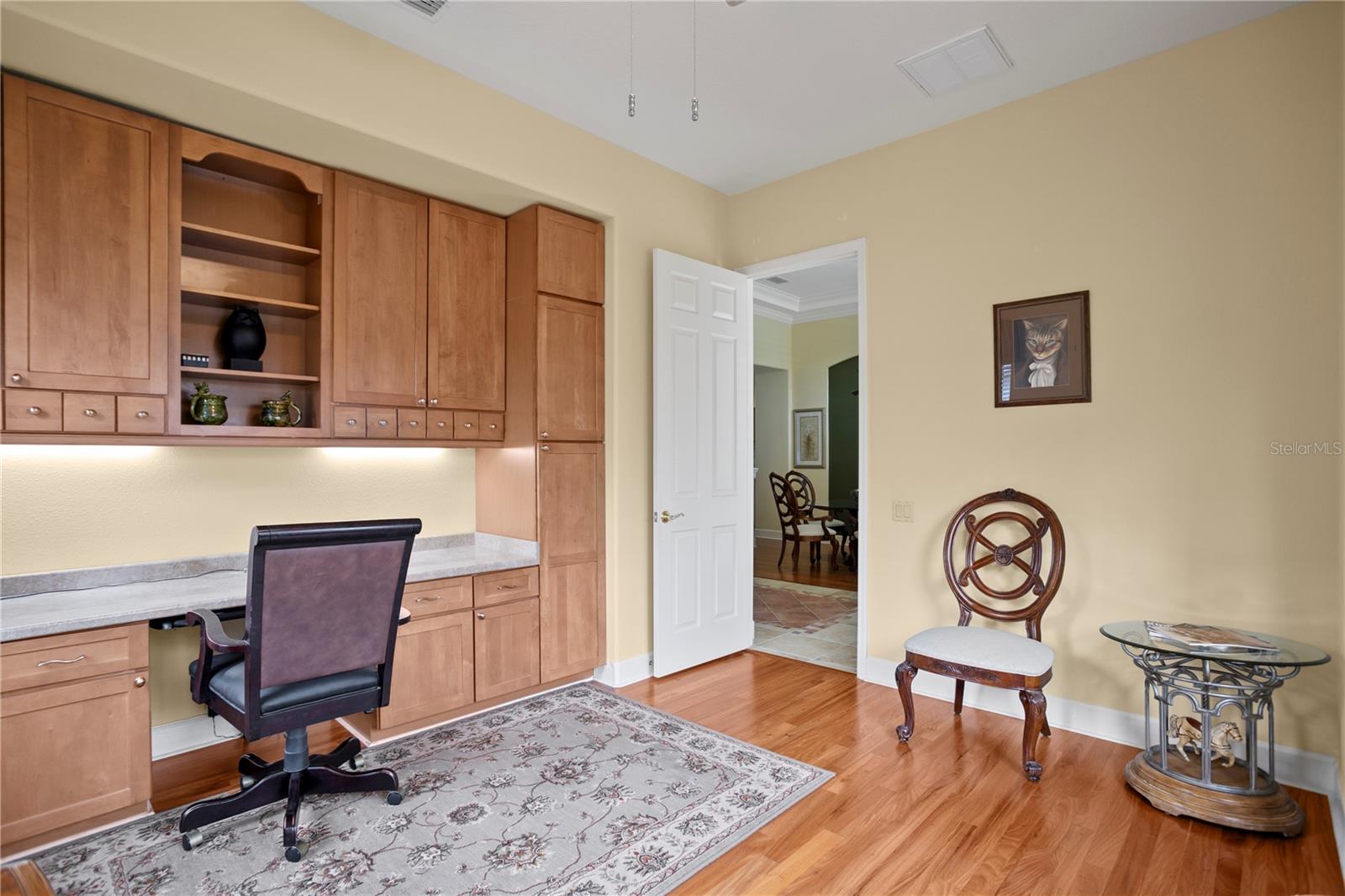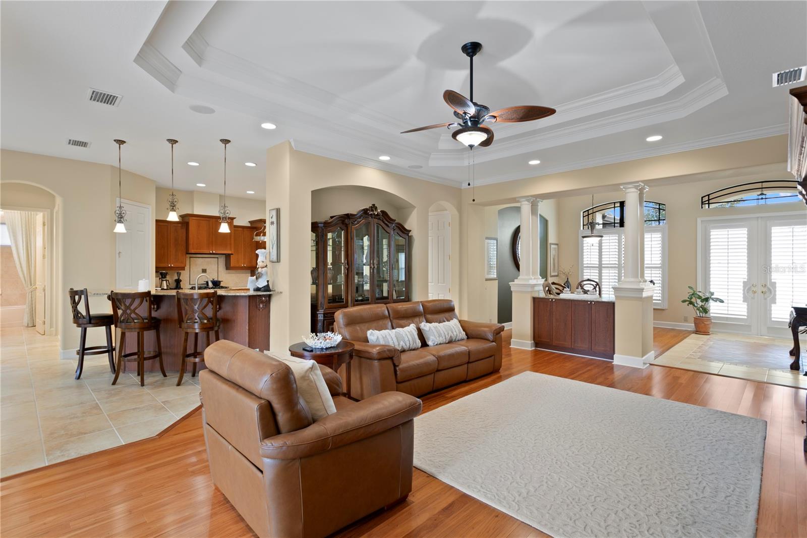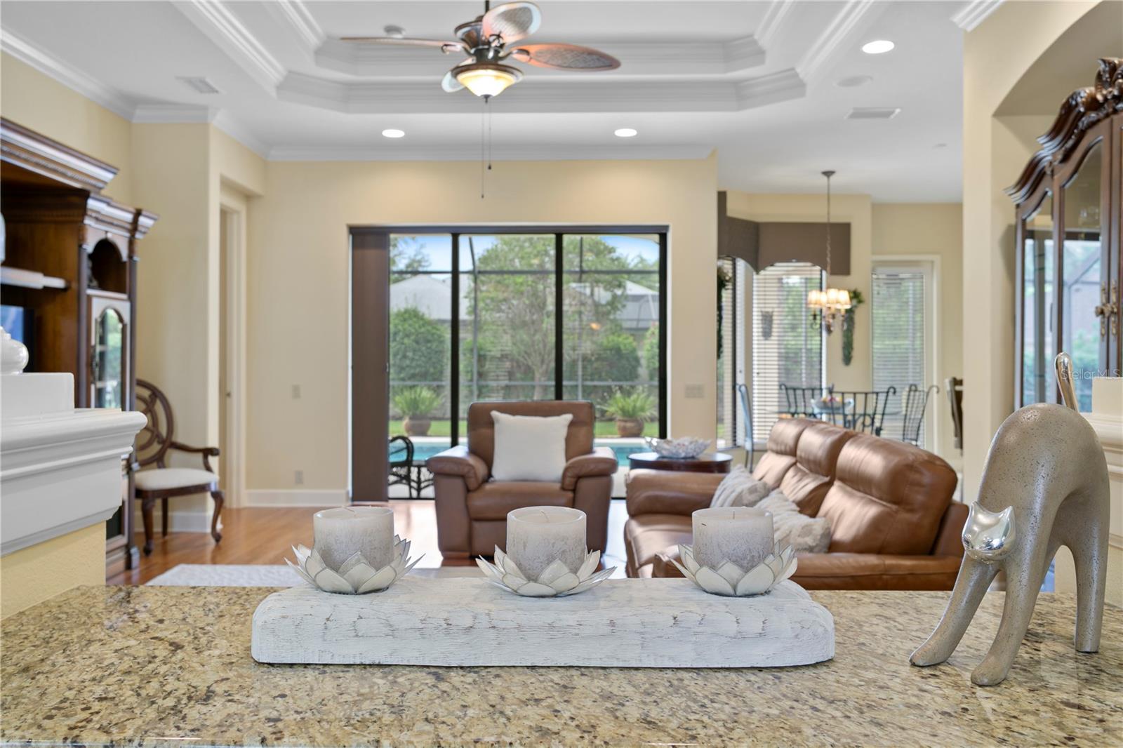 Welcome to your dream home in the gated Strathmore Village. This gorgeous Arthur Rutenberg Coquina pool/spa home boasts undeniable curb appeal and is nestled in the Oakstead Development. This home features 3 spacious bedrooms, 3 baths, and den/office with custom built-ins (which can be easily converted into a 4th bedroom) and 3 car garage. Step inside and discover architectural design details that include 12’ tray ceilings in the formal dining area and great room separated by a pass-through granite top with wood cabinets and tapered columns. Engineered hardwood floors, tiled wet areas and SOARING 10’ ceilings throughout along with 8’ doors. Custom plantation shutters, shades, cornice window treatments and blinds add a touch of class. The triple sliders are completely retractable and offer access to the large oversized lanai with pool/spa that includes surround sound and outdoor shower. All fixed glass have bronze tinted windows. The CHEF’S KITCHEN boasts 42” wood cabinetry with crown, breakfast bar, morning room, tile backsplash, granite countertops, Double Sink, desirable GAS COOKTOP, built-in oven and convection /microwave, large central work island with separate PREP SINK, desk area with additional storage, roll-out pan drawers and walk-in pantry. The spacious owner’s suite offers private access to the pool area, 2 spacious walk-in closets, a large jetted jacuzzi soaking tub, walk-in shower with dual shower heads, linen closet and 2 separate vanity areas. 2nd bedroom has a walk-in closet with custom built-ins, double slider with access to cabana, an ensuite with walk-in shower, vanity and access to the pool. The 3rd bedroom has a bathroom with shower and tub conveniently located just outside the door and features a linen closet. The 3-car garage features 10.5’ ceilings with a side door, work benches and additional storage added (all convey), water softener, pull down stairs for easy access to the attic and bike pulleys. This home is complete with a NEW ROOF (2024), a NEW HVAC (2024), interior LED lighting and MOEN FIXTURES, CROWN MOLDING, newer rescreened pool cage, gutters, EXTERIOR PAINTED (2021) and large interior laundry room with utility sink, cabinets, storage closet and LG washer and dryer both recently replaced. NEST THERMOSTATS, Nest front door camera, Google kitchen hub monitor and Nest backyard camera all convey. Professional lush landscaping includes irrigation system, palm trees along with other landscaping details. Oakstead is a natural gas, deed-restricted community with resort-style amenities which include a clubhouse, lap/kiddie pool, fitness center, tennis and pickle ball courts, covered playground, and scenic 3-mile walking trail. AMAZING LOCATION with easy access to I-75, I-275, Suncoast Pkwy, Tampa International and St. Pete/Clearwater Airports, Restaurants, Shopping, Hospitals, Sports Venues and more! Please call today to schedule your private showing!