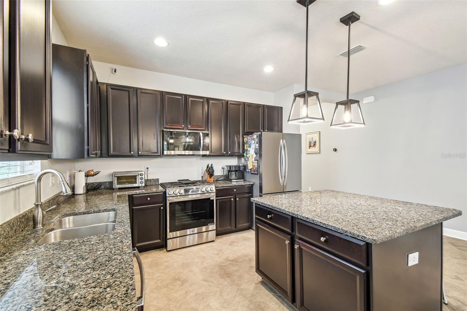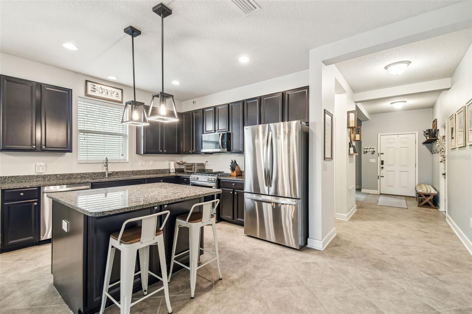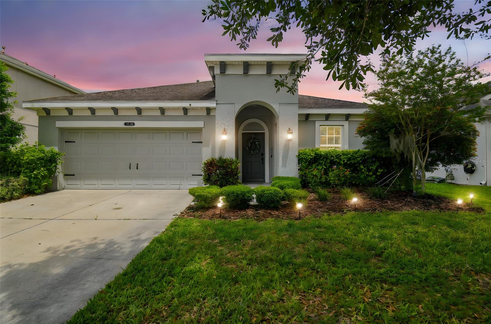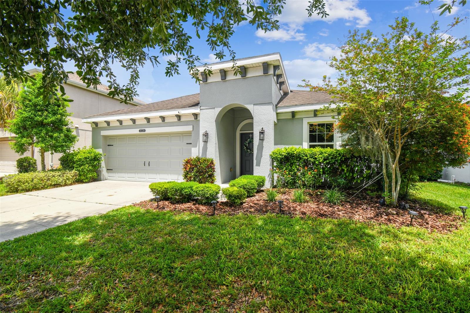 Your dream home awaits in award-winning Connerton; a master-planned community known for its resort-style living, nature preserves, and miles of scenic trails and elevated boardwalks. This move-in ready home offers 2,091 square feet of thoughtfully designed space, featuring 3 bedrooms, 2 full bathrooms, a den/office that can easily be converted into a 4th bedroom, a bonus/media room, and a 2-car garage. Step inside to an inviting open-concept layout perfect for both relaxing and entertaining. The heart of the home is the beautifully updated kitchen, featuring new stainless steel appliances, including a gas range, built-in microwave, dishwasher, and refrigerator. With 42” wood cabinets featuring custom pull-out drawers, abundant granite countertops, and a large prep island, the space is as functional as it is stylish—ideal for preparing meals and gathering with friends and family. The kitchen opens seamlessly to the dining area and spacious great room, creating a bright and connected living space. From the great room, enjoy views of the extended lanai and beautifully landscaped, fenced backyard, offering both privacy and the perfect setting for outdoor living. The split-bedroom floor plan ensures comfort and privacy, with the owner's suite featuring a walk-in closet, ceiling fan, and a private ensuite bath complete with a tiled walk-in shower, linen closet, and granite-topped vanity. The two additional bedrooms are generously sized with ceiling fans and carpeted flooring. The bonus room offers a flexible retreat, ideal for a media or game room. Additional upgrades include a new whole-home tankless water heater with self-descaling system, ensuring energy efficiency and long-term comfort. Living in Connerton means access to top-tier community amenities, including a 10,000 sq. ft. clubhouse, Fit & Flourish Fitness Center, resort-style pool with water slides and splash pad, adult pool, dog parks, sports courts, and an outdoor amphitheater. An additional clubhouse and pool are currently under construction, expanding the community’s offerings even further. The home is located less than a 5-minute walk to Connerton’s park, which features a playground, soccer fields, ping pong tables, and bags courts, making it perfect for active families. Commuters will love the upcoming entrance to the Veterans/Suncoast Expressway, providing quick access to Tampa, Clearwater, and St. Pete. Educational options are exceptional, with Pinecrest Academy recently built in the neighborhood, and Dayspring Academy and Angeline Academy just minutes away.