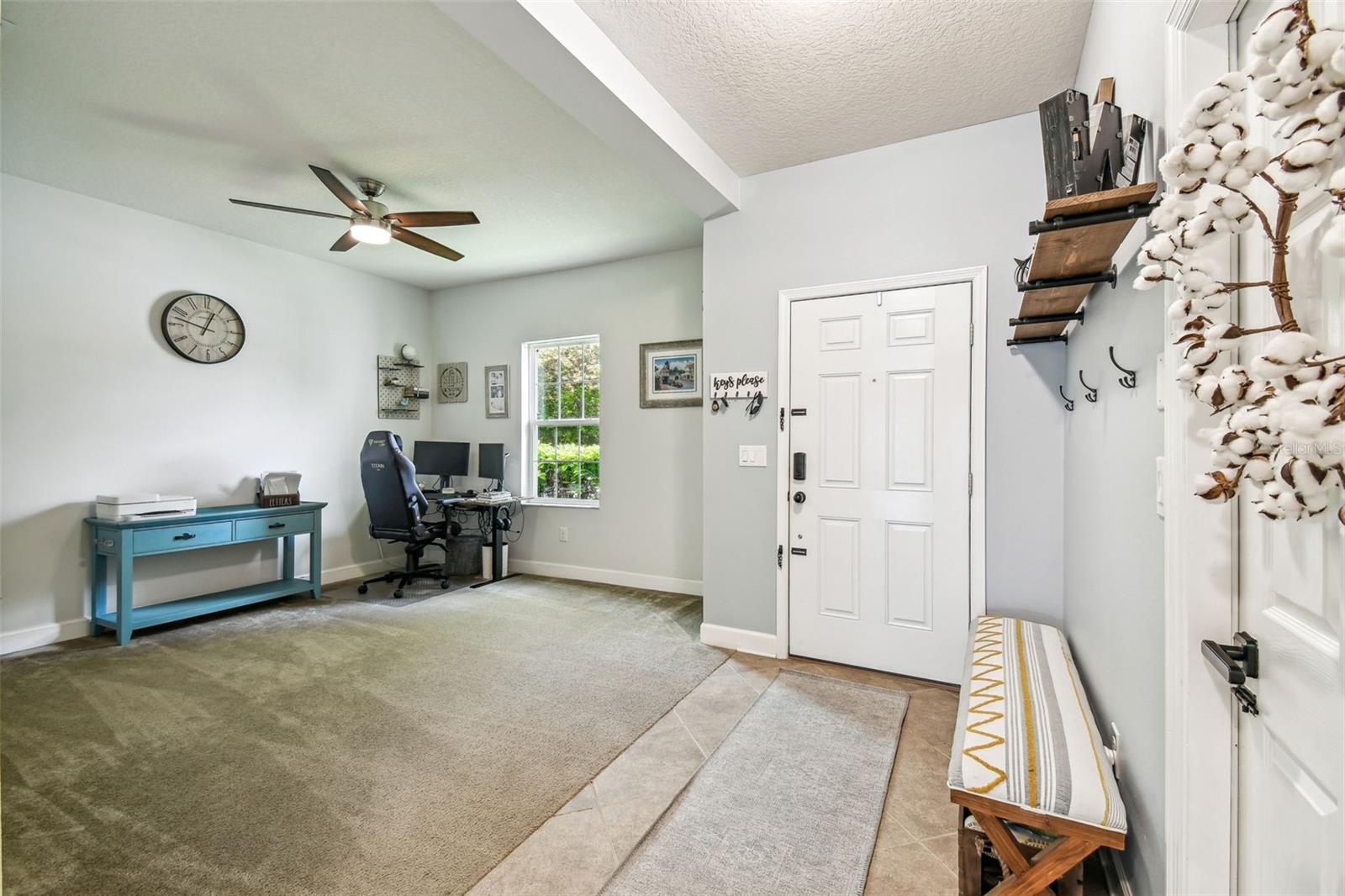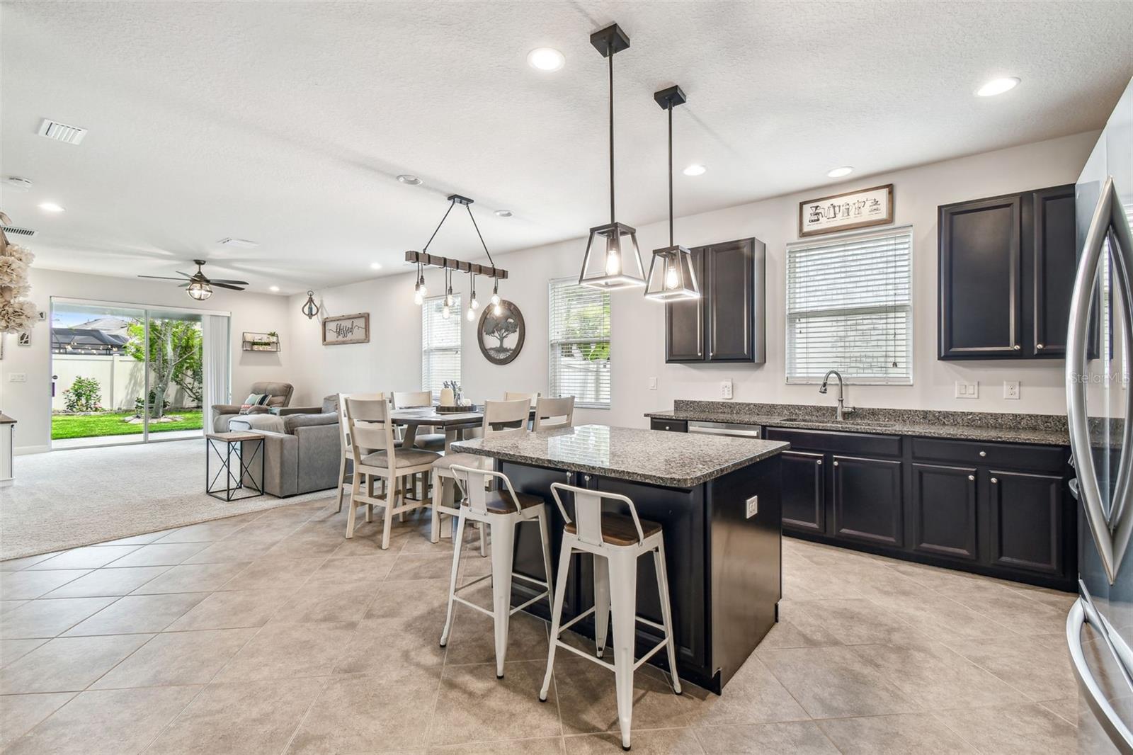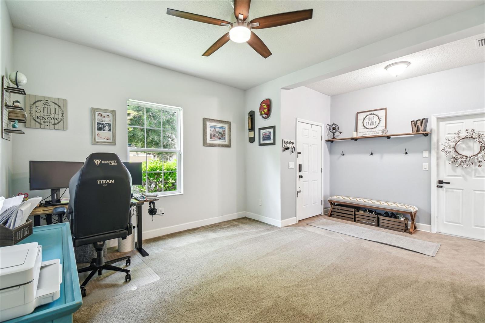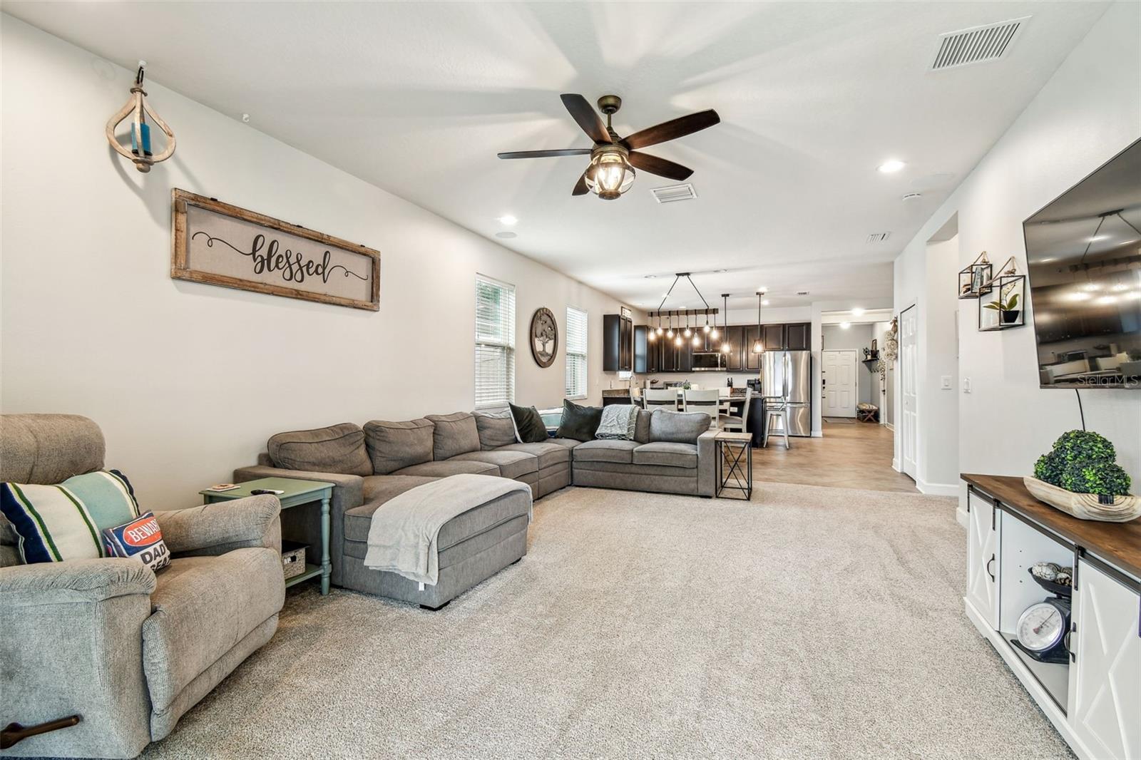 Your dream home awaits in award-winning Connerton; a master-planned community known for its resort-style living, nature preserves, and miles of scenic trails and elevated boardwalks. This move-in ready home offers 2,091 square feet of thoughtfully designed space, featuring 3 bedrooms, 2 full bathrooms, a den/office that can easily be converted into a 4th bedroom, a bonus/media room, and a 2-car garage. Step inside to an inviting open-concept layout perfect for both relaxing and entertaining. The heart of the home is the beautifully updated kitchen, featuring new stainless steel appliances, including a gas range, built-in microwave, dishwasher, and refrigerator. With 42” wood cabinets featuring custom pull-out drawers, abundant granite countertops, and a large prep island, the space is as functional as it is stylish—ideal for preparing meals and gathering with friends and family. The kitchen opens seamlessly to the dining area and spacious great room, creating a bright and connected living space. From the great room, enjoy views of the extended lanai and beautifully landscaped, fenced backyard, offering both privacy and the perfect setting for outdoor living. The split-bedroom floor plan ensures comfort and privacy, with the owner's suite featuring a walk-in closet, ceiling fan, and a private ensuite bath complete with a tiled walk-in shower, linen closet, and granite-topped vanity. The two additional bedrooms are generously sized with ceiling fans and carpeted flooring. The bonus room offers a flexible retreat, ideal for a media or game room. Additional upgrades include a new whole-home tankless water heater with self-descaling system, ensuring energy efficiency and long-term comfort. Living in Connerton means access to top-tier community amenities, including a 10,000 sq. ft. clubhouse, Fit & Flourish Fitness Center, resort-style pool with water slides and splash pad, adult pool, dog parks, sports courts, and an outdoor amphitheater. An additional clubhouse and pool are currently under construction, expanding the community’s offerings even further. The home is located less than a 5-minute walk to Connerton’s park, which features a playground, soccer fields, ping pong tables, and bags courts, making it perfect for active families. Commuters will love the upcoming entrance to the Veterans/Suncoast Expressway, providing quick access to Tampa, Clearwater, and St. Pete. Educational options are exceptional, with Pinecrest Academy recently built in the neighborhood, and Dayspring Academy and Angeline Academy just minutes away.