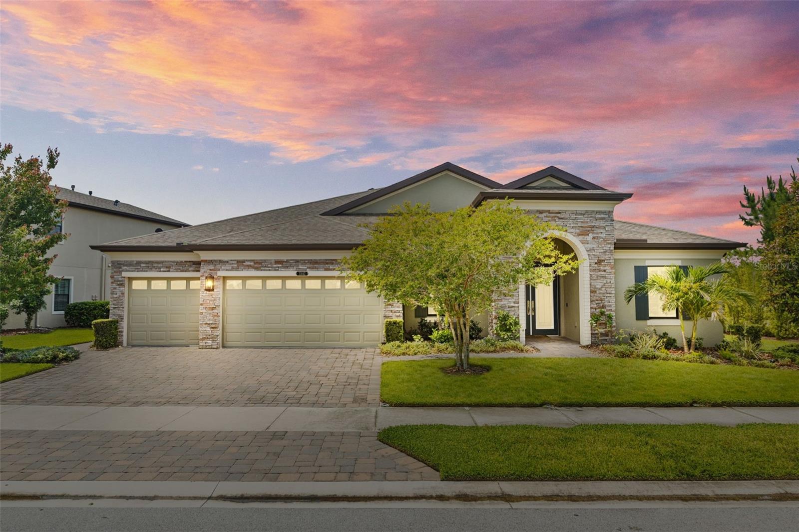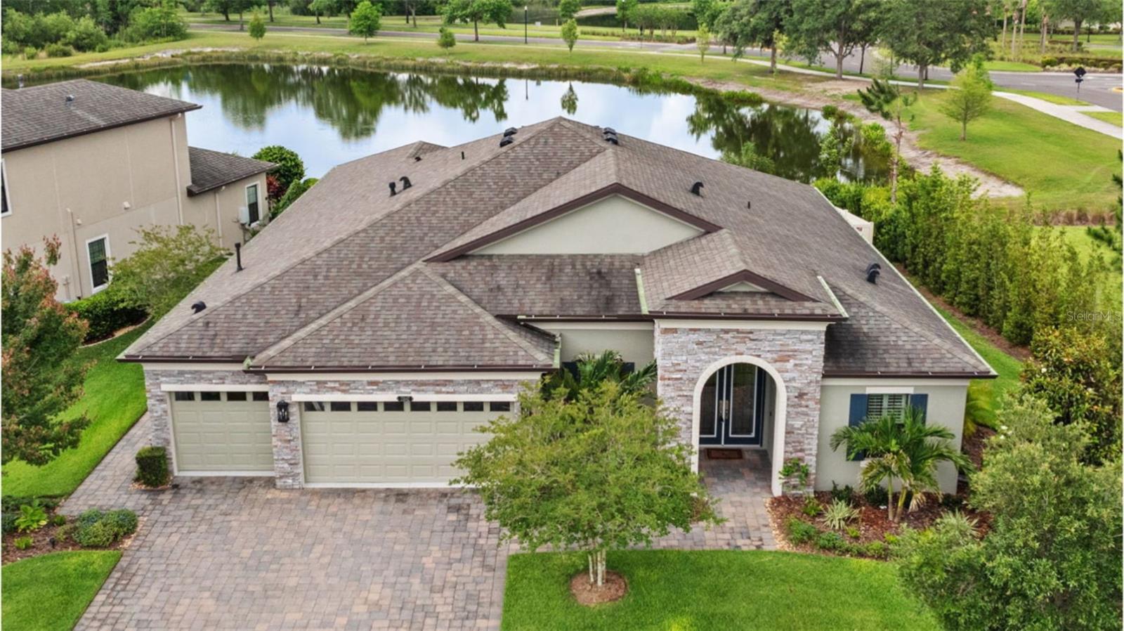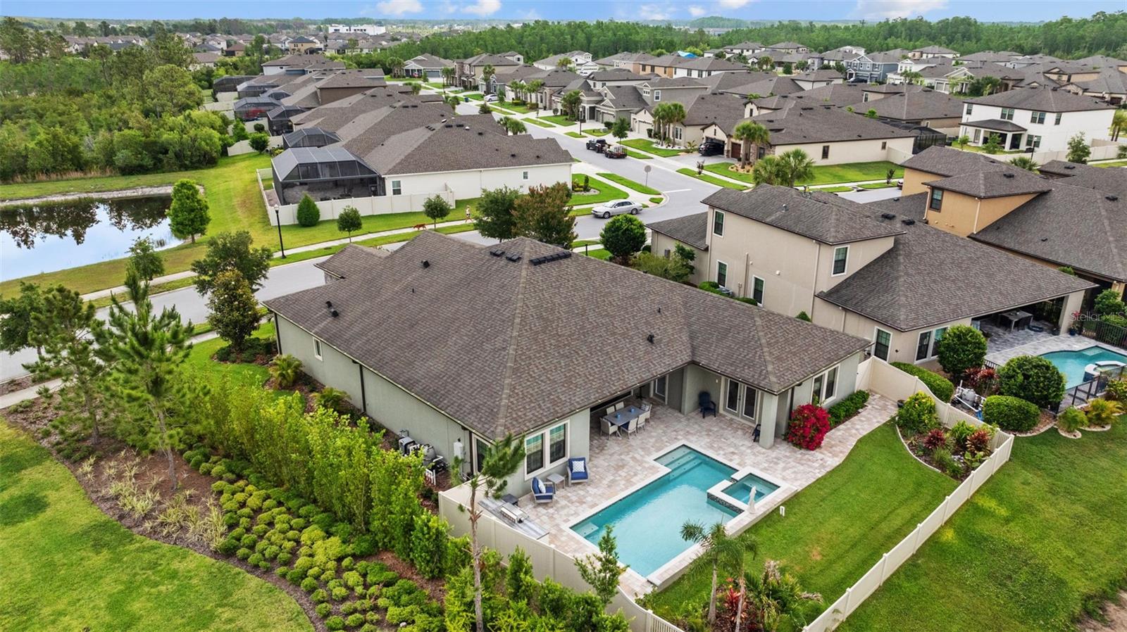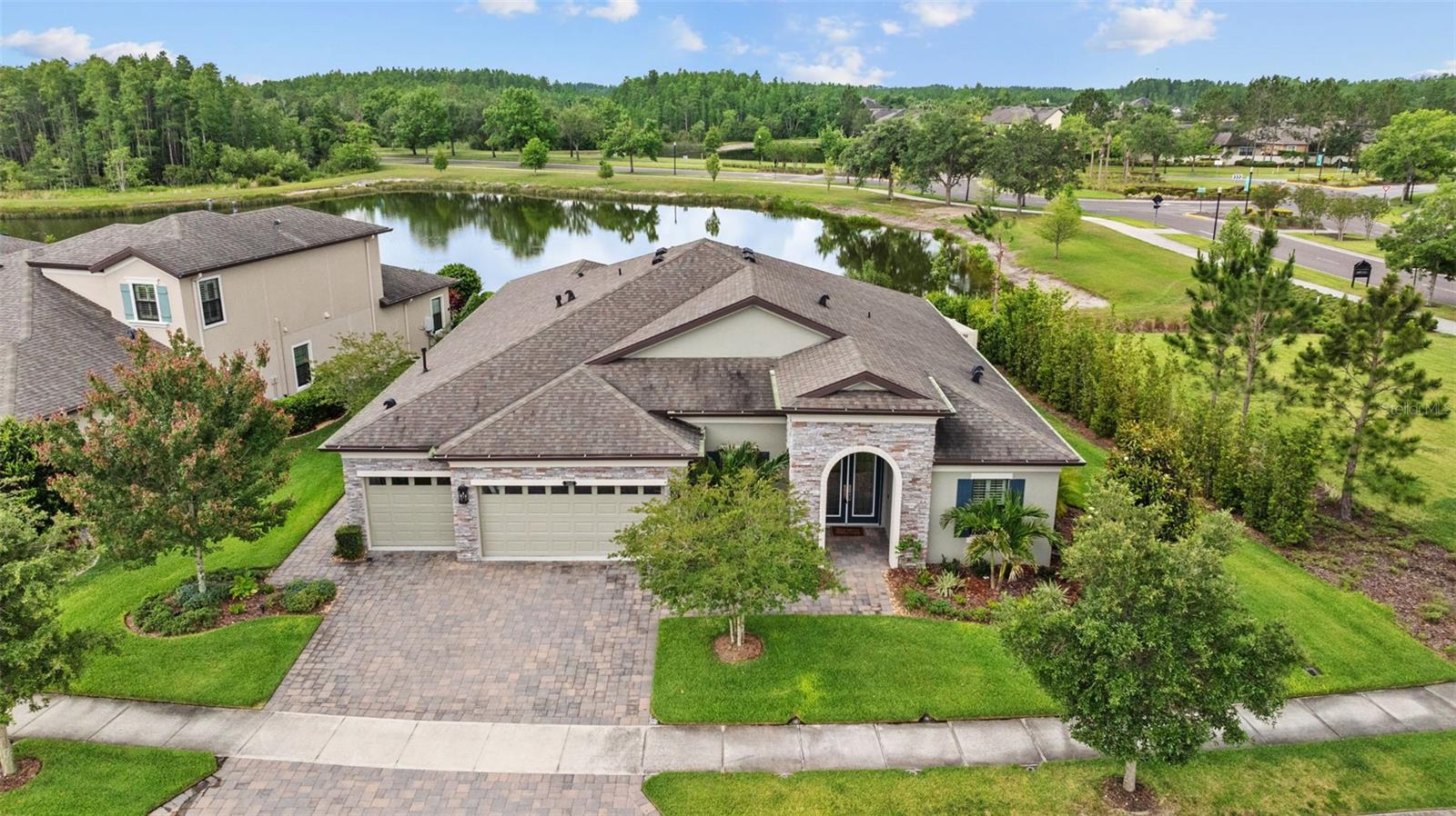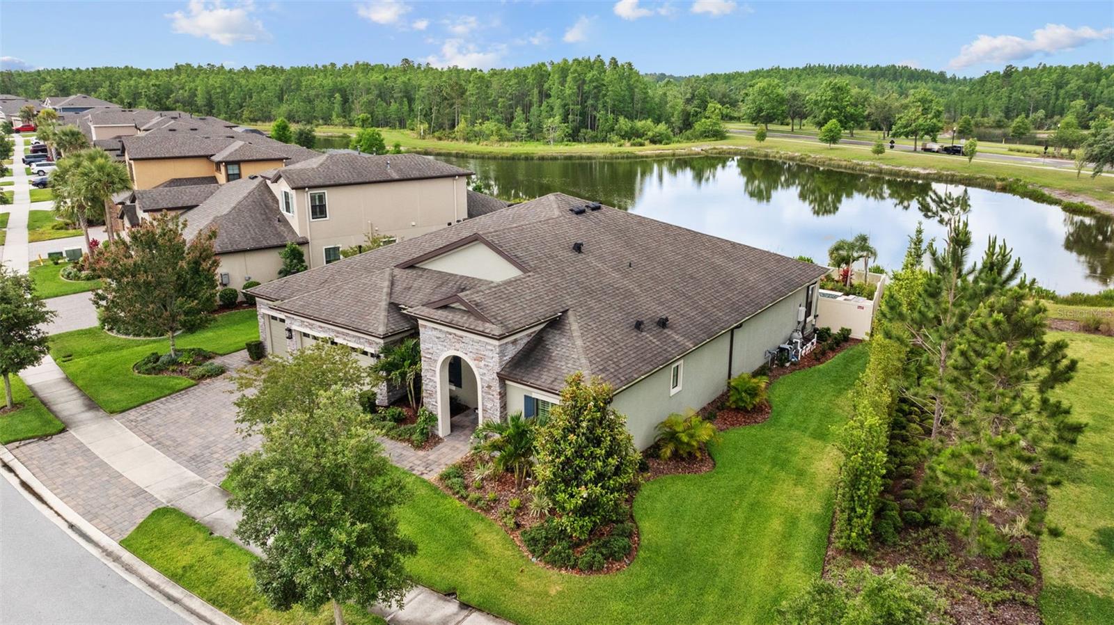 EXQUISITE LUXURY LIVING IN THE HEART OF LAND O' LAKES! Welcome to this stunning 4-bedroom, 3-bathroom lakefront estate with a dedicated HOME OFFICE, formal living room, BONUS room, and 3-car garage, located in the prestigious Connerton Village. Meticulously maintained and thoughtfully upgraded, this elegant residence combines timeless sophistication with resort-style living. This one-of-a-kind home boasts an exceptional layout with over 3,250 sq ft of living space, showcasing refined design elements including stone accent walls, ceiling beams, and elegant finishes throughout. Upon entry, you're greeted by a formal living room — a refined space ideal for receiving guests or enjoying quiet moments. From there, the home flows effortlessly into the heart of the residence: an expansive open kitchen with a quartz waterfall island, stainless steel appliances, walk-in pantry, and abundant cabinet space. Adjacent, the family room and dining area create the ideal setting for entertaining or relaxing with family. The dedicated home office, located near the front entry, provides a quiet retreat perfect for remote work or study. Toward the back of the home, you'll find a spacious bonus room, offering flexible use as a media room, playroom, fitness space, or additional lounge area — all while enjoying views of the serene backyard. The primary suite is privately situated with lake views and includes a spa-like en-suite bath with a freestanding tub, oversized walk-in shower, dual vanities, and a spacious walk-in closet. The additional three bedrooms are generously sized and located in separate wings for enhanced privacy and versatility. Step outside to your own private sanctuary. The pavered outdoor living area is perfect for Florida living, complete with a spa-style pool and breathtaking views of the tranquil lake/pond just beyond your backyard. Whether you're enjoying a quiet morning coffee or entertaining under the stars, this home delivers a seamless indoor-outdoor experience. Residents of Connerton Village enjoy access to resort-style amenities including a luxurious clubhouse, fitness center, resort pool, nature trails, playgrounds, dog parks, and vibrant community events — all designed to elevate your lifestyle. Conveniently located near top-rated schools, upscale shopping, dining, and just a short drive from downtown Tampa, this exceptional home offers both elegance and everyday convenience. Schedule your private tour today and experience unmatched luxury and lifestyle!