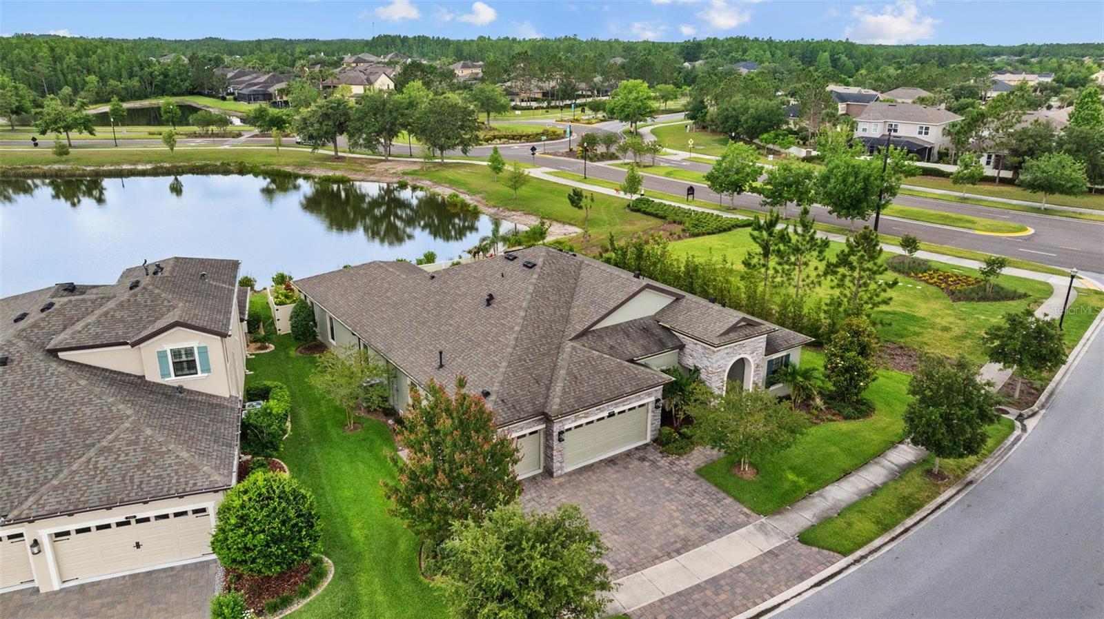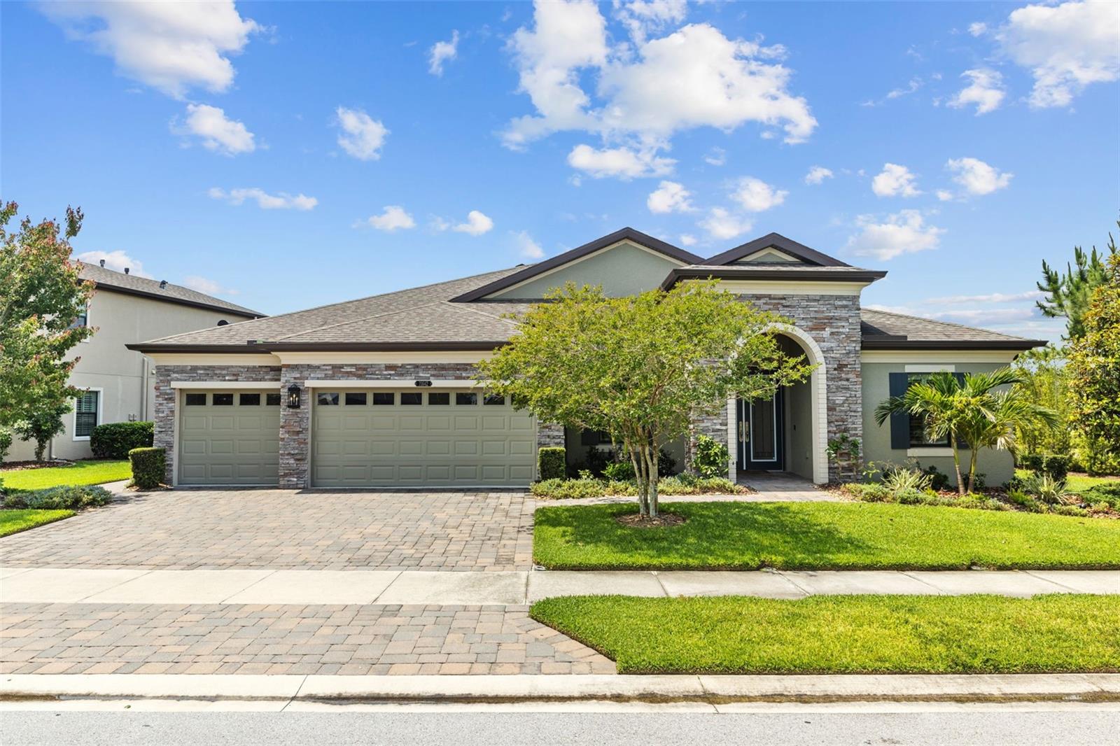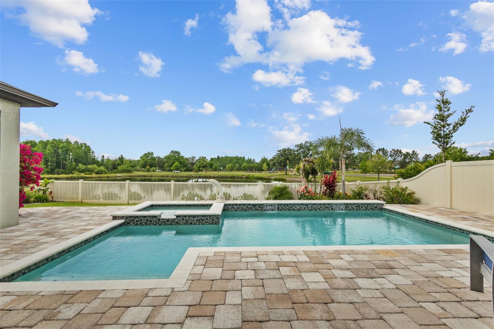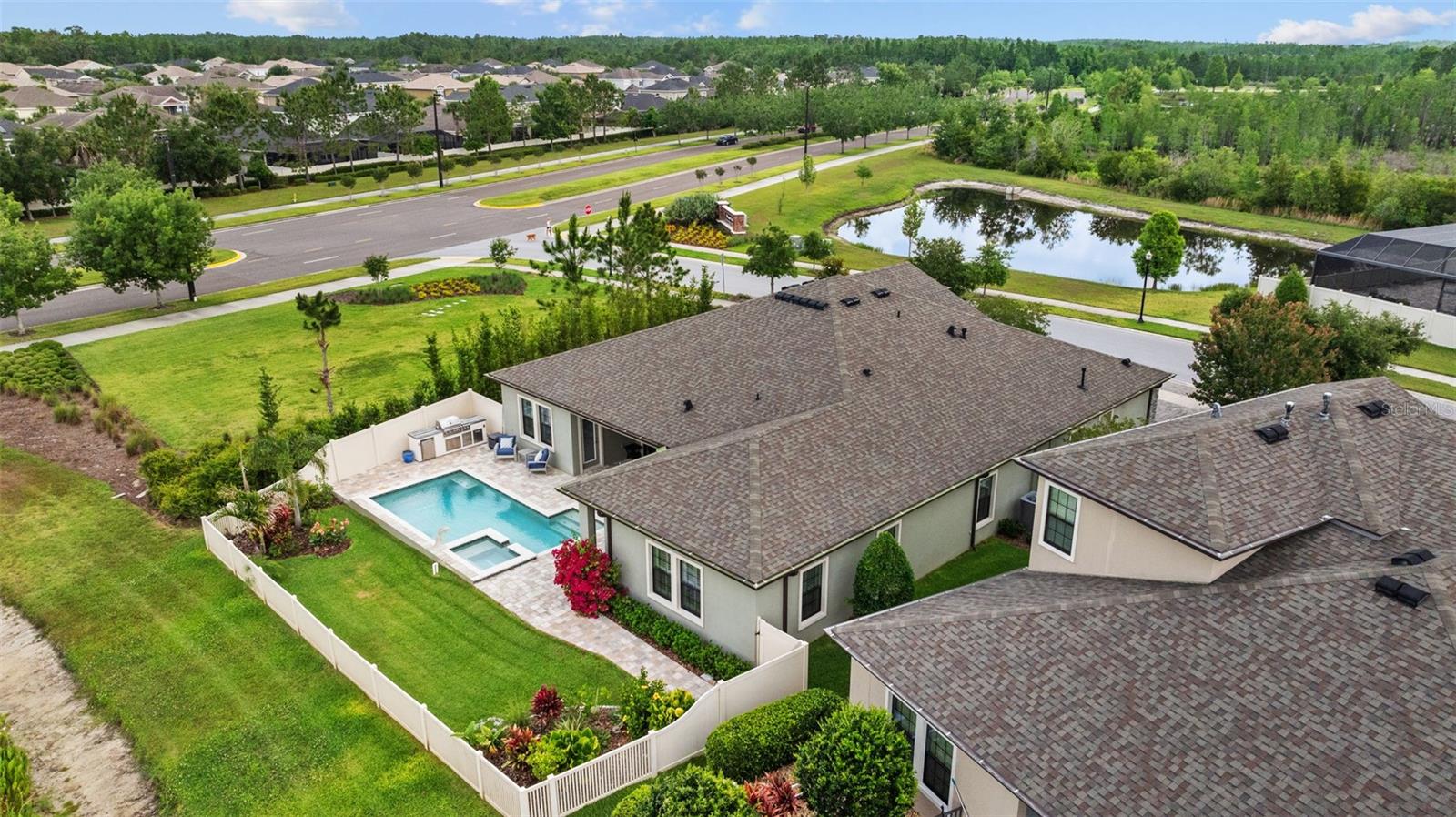 EXQUISITE LUXURY LIVING IN THE HEART OF LAND O' LAKES! Welcome to this stunning 4-bedroom, 3-bathroom lakefront estate with a dedicated HOME OFFICE, formal living room, BONUS room, and 3-car garage, located in the prestigious Connerton Village. Meticulously maintained and thoughtfully upgraded, this elegant residence combines timeless sophistication with resort-style living. This one-of-a-kind home boasts an exceptional layout with over 3,250 sq ft of living space, showcasing refined design elements including stone accent walls, ceiling beams, and elegant finishes throughout. Upon entry, you're greeted by a formal living room — a refined space ideal for receiving guests or enjoying quiet moments. From there, the home flows effortlessly into the heart of the residence: an expansive open kitchen with a quartz waterfall island, stainless steel appliances, walk-in pantry, and abundant cabinet space. Adjacent, the family room and dining area create the ideal setting for entertaining or relaxing with family. The dedicated home office, located near the front entry, provides a quiet retreat perfect for remote work or study. Toward the back of the home, you'll find a spacious bonus room, offering flexible use as a media room, playroom, fitness space, or additional lounge area — all while enjoying views of the serene backyard. The primary suite is privately situated with lake views and includes a spa-like en-suite bath with a freestanding tub, oversized walk-in shower, dual vanities, and a spacious walk-in closet. The additional three bedrooms are generously sized and located in separate wings for enhanced privacy and versatility. Step outside to your own private sanctuary. The pavered outdoor living area is perfect for Florida living, complete with a spa-style pool and breathtaking views of the tranquil lake/pond just beyond your backyard. Whether you're enjoying a quiet morning coffee or entertaining under the stars, this home delivers a seamless indoor-outdoor experience. Residents of Connerton Village enjoy access to resort-style amenities including a luxurious clubhouse, fitness center, resort pool, nature trails, playgrounds, dog parks, and vibrant community events — all designed to elevate your lifestyle. Conveniently located near top-rated schools, upscale shopping, dining, and just a short drive from downtown Tampa, this exceptional home offers both elegance and everyday convenience. Schedule your private tour today and experience unmatched luxury and lifestyle!
