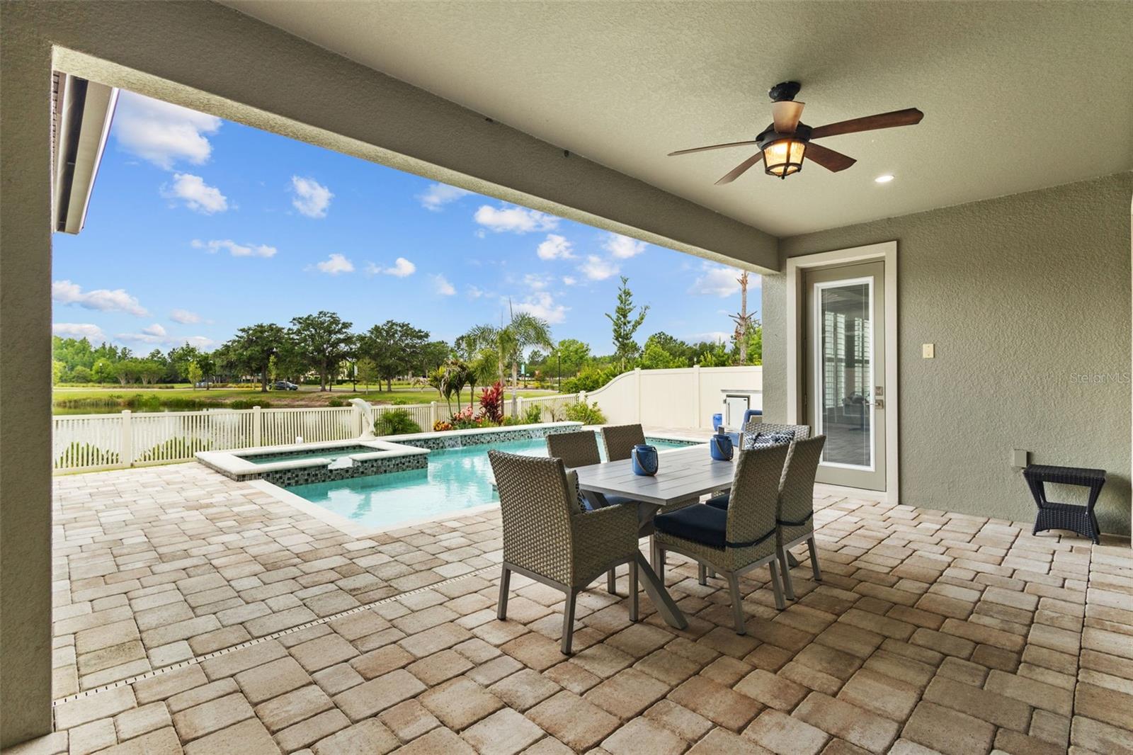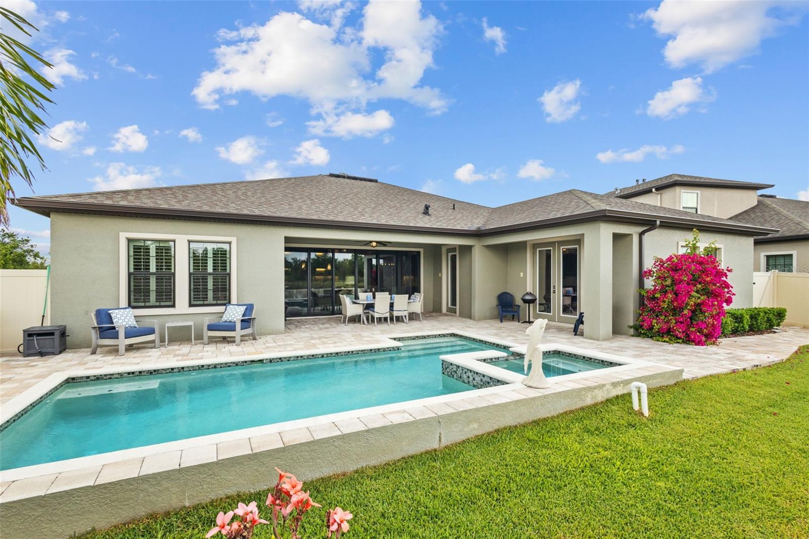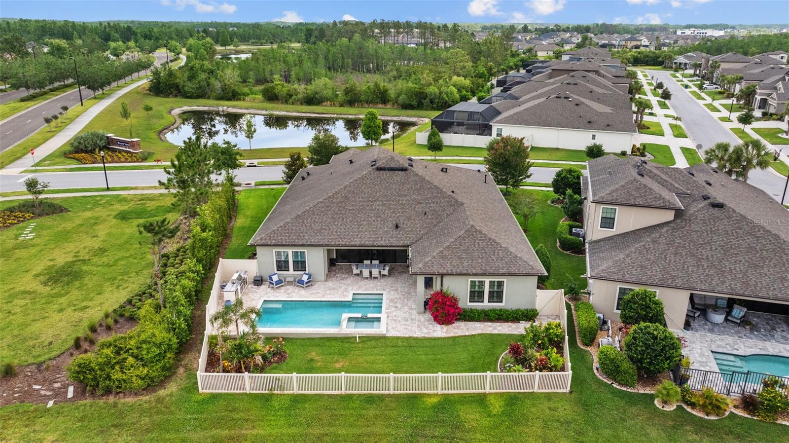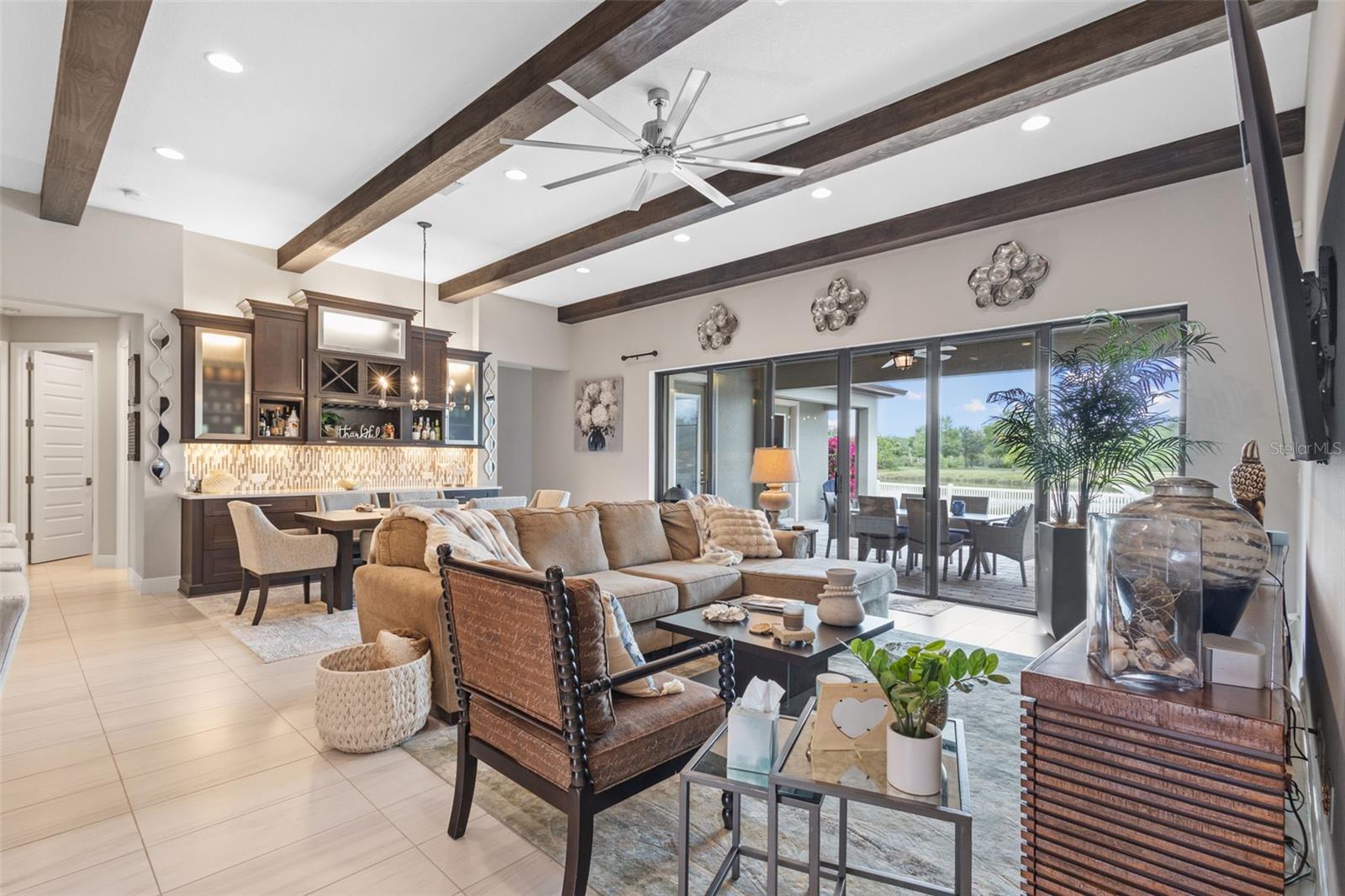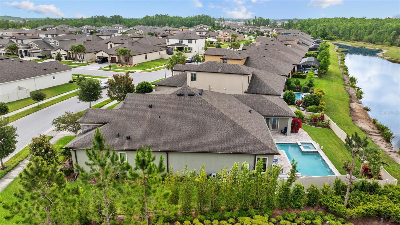 EXQUISITE LUXURY LIVING IN THE HEART OF LAND O' LAKES! Welcome to this stunning 4-bedroom, 3-bathroom lakefront estate with a dedicated HOME OFFICE, formal living room, BONUS room, and 3-car garage, located in the prestigious Connerton Village. Meticulously maintained and thoughtfully upgraded, this elegant residence combines timeless sophistication with resort-style living. This one-of-a-kind home boasts an exceptional layout with over 3,250 sq ft of living space, showcasing refined design elements including stone accent walls, ceiling beams, and elegant finishes throughout. Upon entry, you're greeted by a formal living room — a refined space ideal for receiving guests or enjoying quiet moments. From there, the home flows effortlessly into the heart of the residence: an expansive open kitchen with a quartz waterfall island, stainless steel appliances, walk-in pantry, and abundant cabinet space. Adjacent, the family room and dining area create the ideal setting for entertaining or relaxing with family. The dedicated home office, located near the front entry, provides a quiet retreat perfect for remote work or study. Toward the back of the home, you'll find a spacious bonus room, offering flexible use as a media room, playroom, fitness space, or additional lounge area — all while enjoying views of the serene backyard. The primary suite is privately situated with lake views and includes a spa-like en-suite bath with a freestanding tub, oversized walk-in shower, dual vanities, and a spacious walk-in closet. The additional three bedrooms are generously sized and located in separate wings for enhanced privacy and versatility. Step outside to your own private sanctuary. The pavered outdoor living area is perfect for Florida living, complete with a spa-style pool and breathtaking views of the tranquil lake/pond just beyond your backyard. Whether you're enjoying a quiet morning coffee or entertaining under the stars, this home delivers a seamless indoor-outdoor experience. Residents of Connerton Village enjoy access to resort-style amenities including a luxurious clubhouse, fitness center, resort pool, nature trails, playgrounds, dog parks, and vibrant community events — all designed to elevate your lifestyle. Conveniently located near top-rated schools, upscale shopping, dining, and just a short drive from downtown Tampa, this exceptional home offers both elegance and everyday convenience. Schedule your private tour today and experience unmatched luxury and lifestyle!