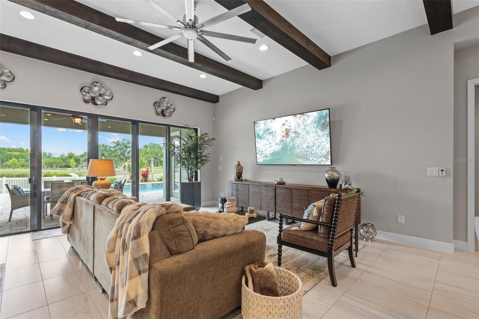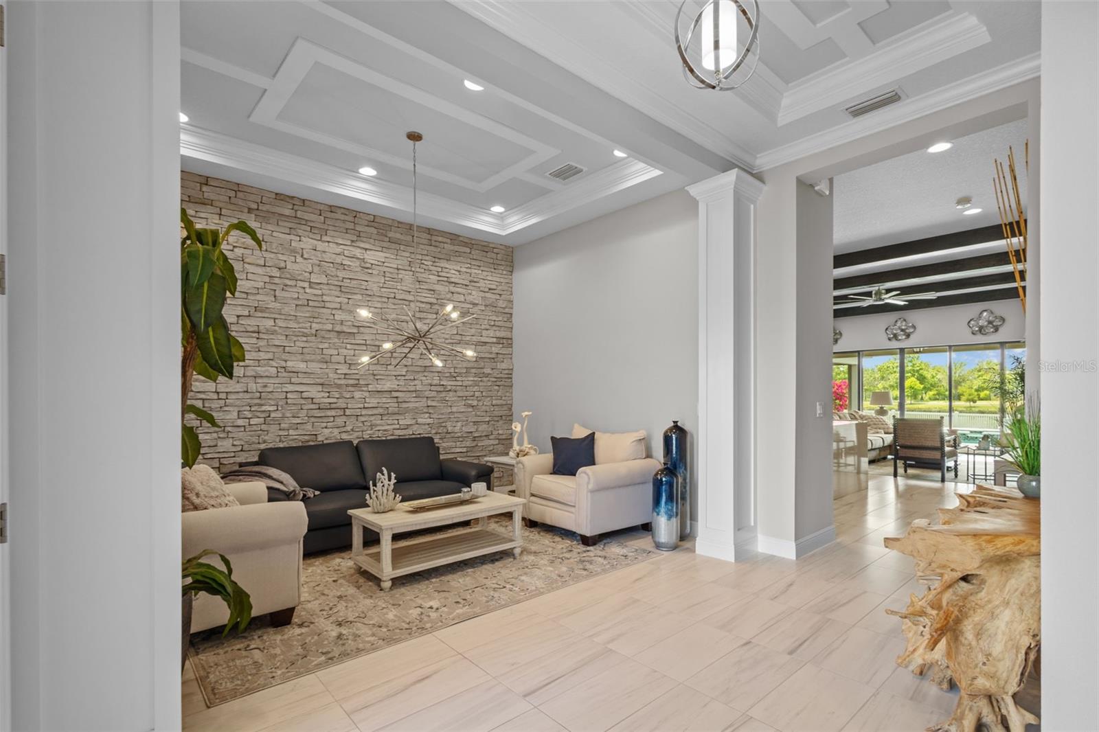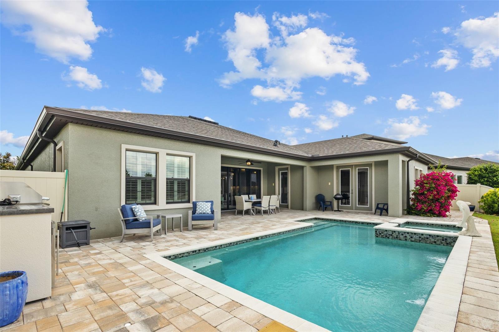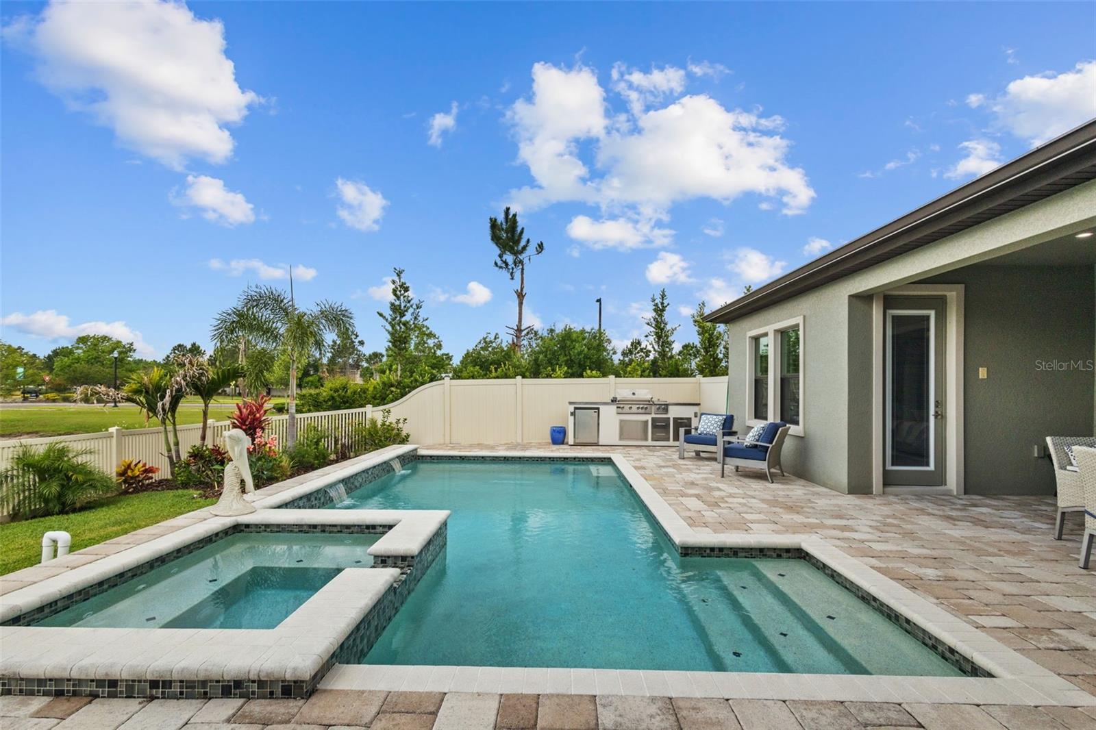 EXQUISITE LUXURY LIVING IN THE HEART OF LAND O' LAKES! Welcome to this stunning 4-bedroom, 3-bathroom lakefront estate with a dedicated HOME OFFICE, formal living room, BONUS room, and 3-car garage, located in the prestigious Connerton Village. Meticulously maintained and thoughtfully upgraded, this elegant residence combines timeless sophistication with resort-style living. This one-of-a-kind home boasts an exceptional layout with over 3,250 sq ft of living space, showcasing refined design elements including stone accent walls, ceiling beams, and elegant finishes throughout. Upon entry, you're greeted by a formal living room — a refined space ideal for receiving guests or enjoying quiet moments. From there, the home flows effortlessly into the heart of the residence: an expansive open kitchen with a quartz waterfall island, stainless steel appliances, walk-in pantry, and abundant cabinet space. Adjacent, the family room and dining area create the ideal setting for entertaining or relaxing with family. The dedicated home office, located near the front entry, provides a quiet retreat perfect for remote work or study. Toward the back of the home, you'll find a spacious bonus room, offering flexible use as a media room, playroom, fitness space, or additional lounge area — all while enjoying views of the serene backyard. The primary suite is privately situated with lake views and includes a spa-like en-suite bath with a freestanding tub, oversized walk-in shower, dual vanities, and a spacious walk-in closet. The additional three bedrooms are generously sized and located in separate wings for enhanced privacy and versatility. Step outside to your own private sanctuary. The pavered outdoor living area is perfect for Florida living, complete with a spa-style pool and breathtaking views of the tranquil lake/pond just beyond your backyard. Whether you're enjoying a quiet morning coffee or entertaining under the stars, this home delivers a seamless indoor-outdoor experience. Residents of Connerton Village enjoy access to resort-style amenities including a luxurious clubhouse, fitness center, resort pool, nature trails, playgrounds, dog parks, and vibrant community events — all designed to elevate your lifestyle. Conveniently located near top-rated schools, upscale shopping, dining, and just a short drive from downtown Tampa, this exceptional home offers both elegance and everyday convenience. Schedule your private tour today and experience unmatched luxury and lifestyle!