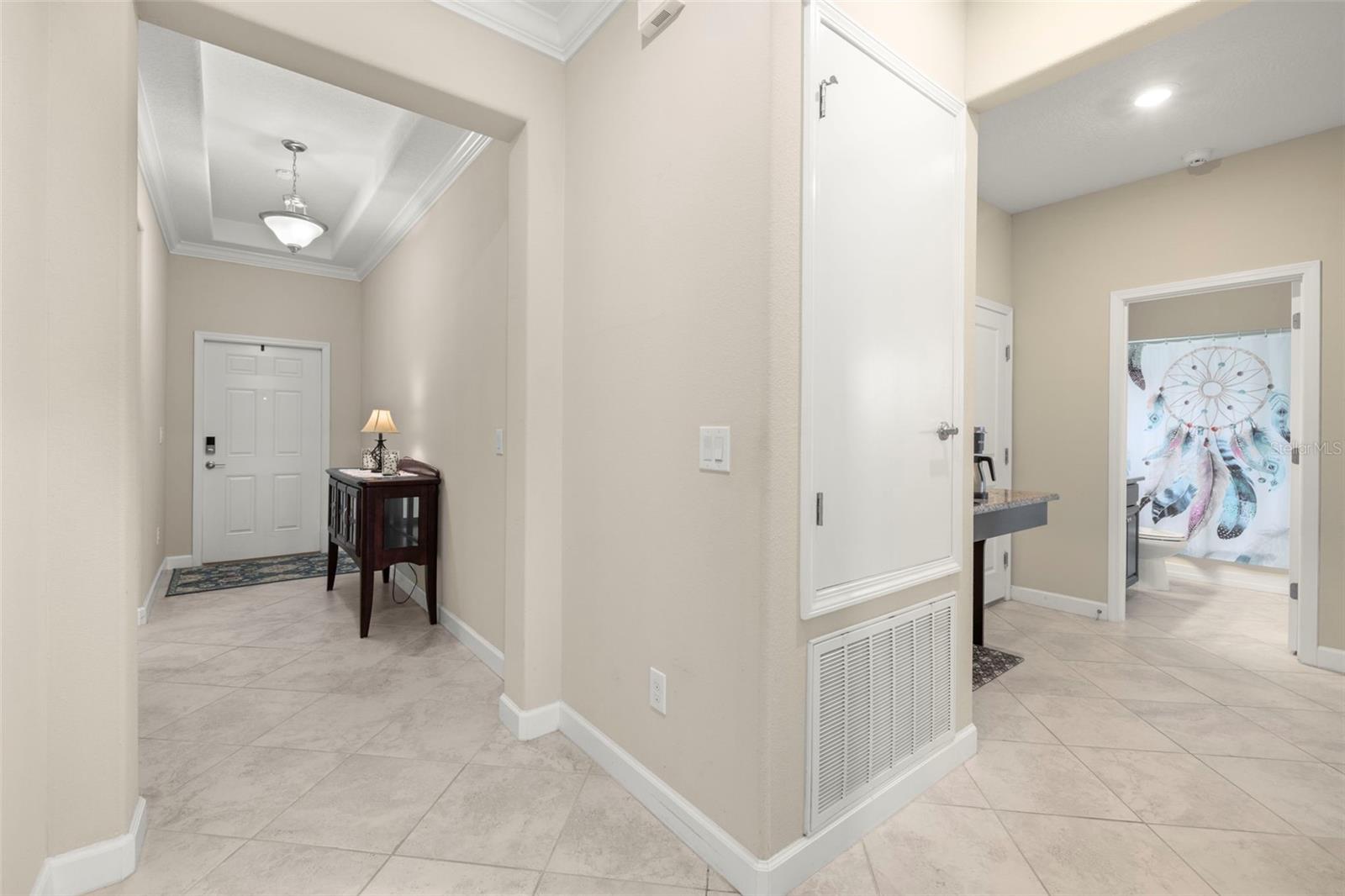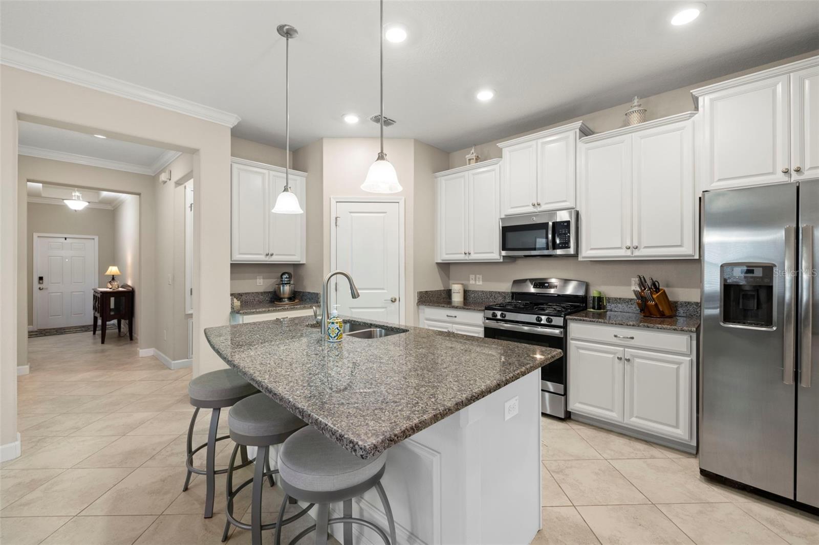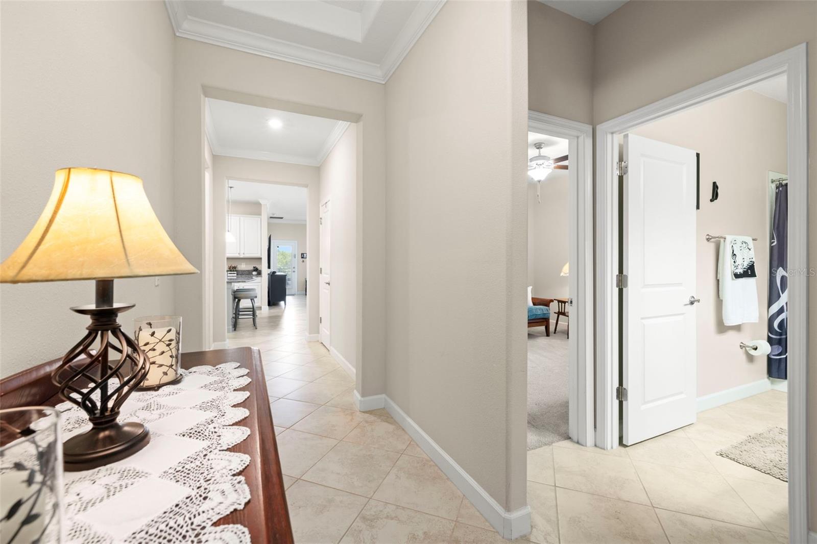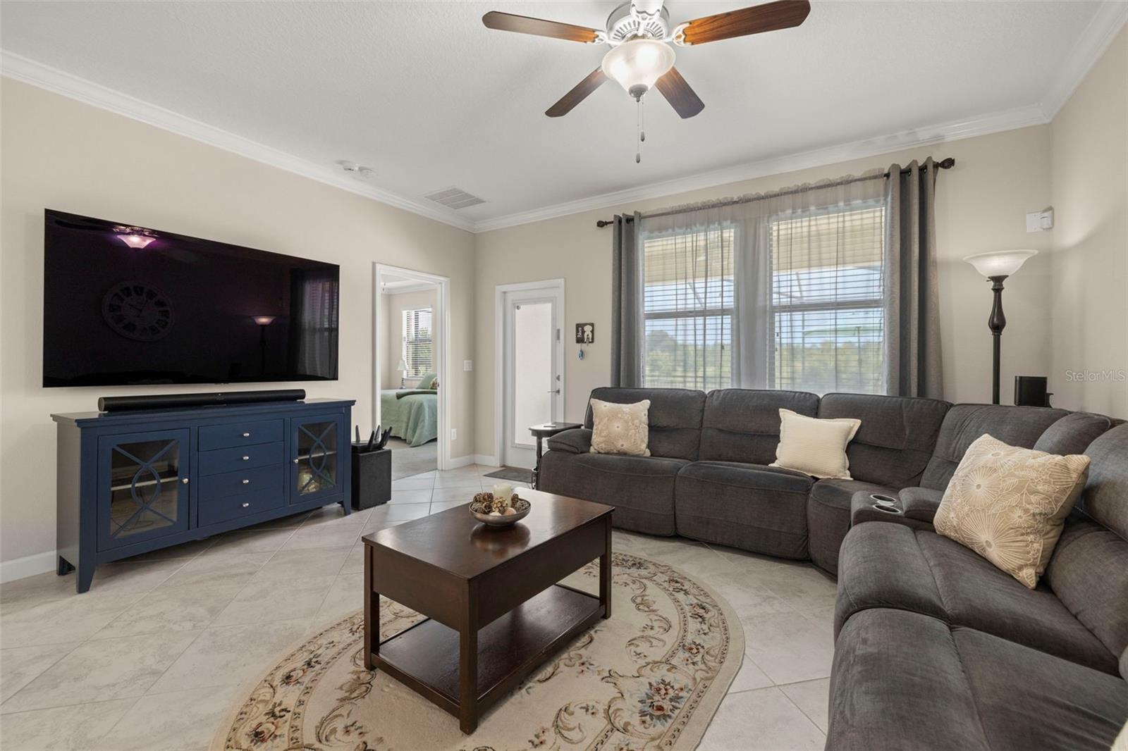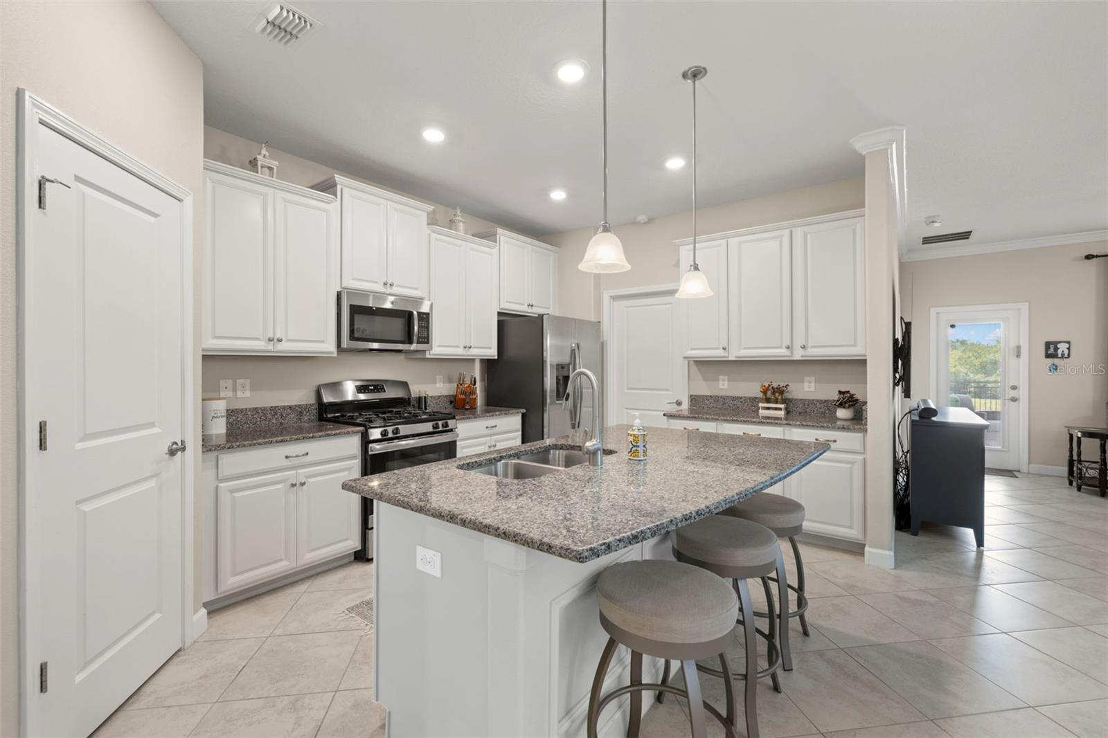 Escape to a world of privacy, tranquility and comfort, enveloped by mature landscaping and enhanced by waterfront views and lush conservation extending from the front to the back of this amazing pool home. Located in Prestigious Bexley, this true gem hosts the popular North Carolina floor plan with 4 bedrooms, 3 baths, great room plan with split bedrooms plus custom pool package. Stroll up the pavered driveway to the quaint front porch to enter this thoughtfully designed home and step into the double foyer featuring a tray ceiling, crown molding, custom tile on the diagonal & colonial baseboards. The desirable open great room encompasses the family living spaces, dining room and impressive kitchen. Great room is outstanding and offers volume ceilings, crown molding, designer ceiling fan with light, French door to lanai, custom diagonal tile throughout & window treatments. The Dining Room boasts a custom chandelier, tile throughout and window treatments. Outstanding Kitchen is complete with granite counters, 42" staggered white cabinetry, island with designer lighting above and custom fixtures, spacious walk-in pantry, tons of counter space, all stainless steel appliances including a side by side refrigerator, range, microwave & dishwasher plus convenient entrance to inside laundry room. Owners suite features tray ceiling, an abundance of light, designer ceiling fan with light, master bath with dual vanity, granite counters with integrated sinks, wood cabinetry, garden tub, separate glass enclosed shower, water closet, designer fixtures, tile flooring and massive walk-in closet complete with extra shelving and florescent lighting. Inside utility room can be accessed from master suite and kitchen and included the washer & dryer, upper cabinets and tile flooring. Spectacular pool package is exquisite with upgraded pavers, soaring cage, covered lanai, black vinyl open fencing overlooking pristine views of pond and lush conservation providing peace & tranquility. 2-Car Garage offers coach lights, extra storage racks and automatic opener. Superior location with access to the Suncoast Hwy, Tampa International Airport, excellent highly rated schools, shopping , professional services & restaurants. Residents of Bexley enjoy resort styled amenities including 2 resort styled pools, clubhouse, fitness center, restaurant, playgrounds, nature walking & biking trails & dog parks. Notables include sweeping conservation views in the front & rear of home, neutral colors, large extra hall with coffee bar, secondary bath with dual vanity, granite counters throughout, custom fixtures, immaculate turn- key interior, split bedroom plan, inside utility & all appliances convey. This home has been impeccably maintained and ready for its new owners. An absolute Must See !!!!
