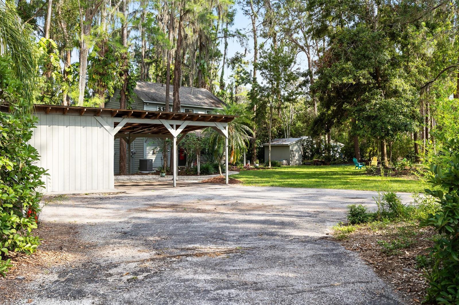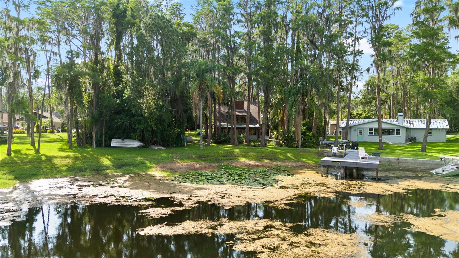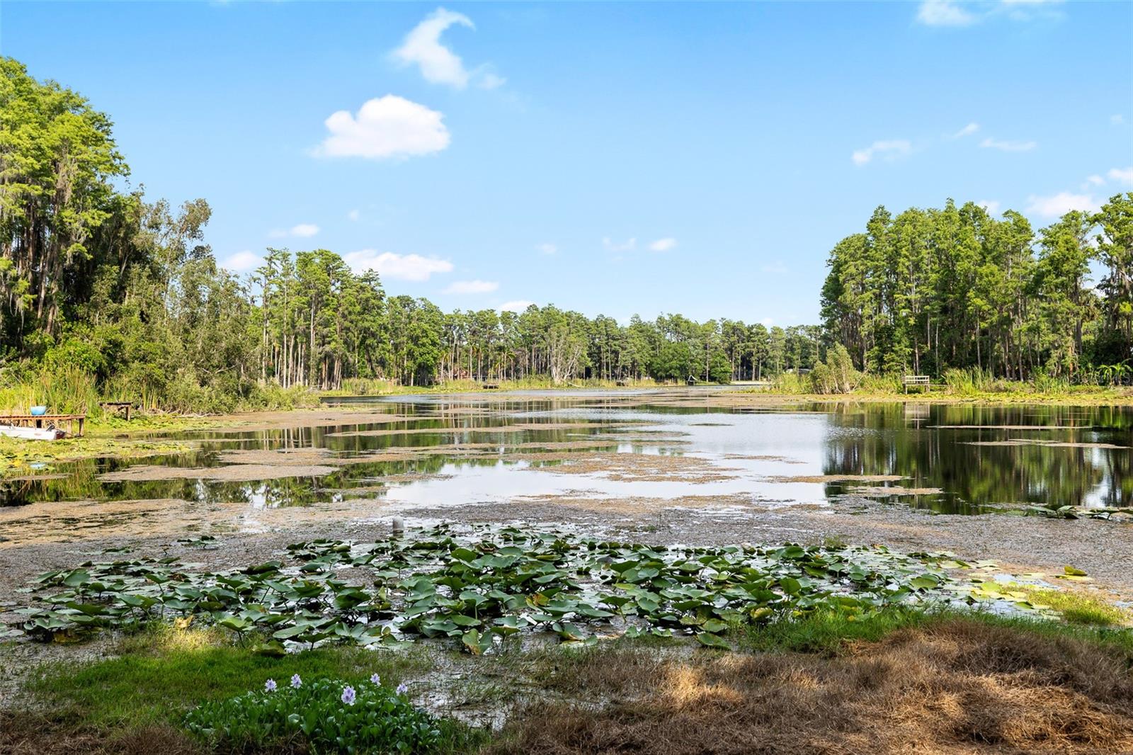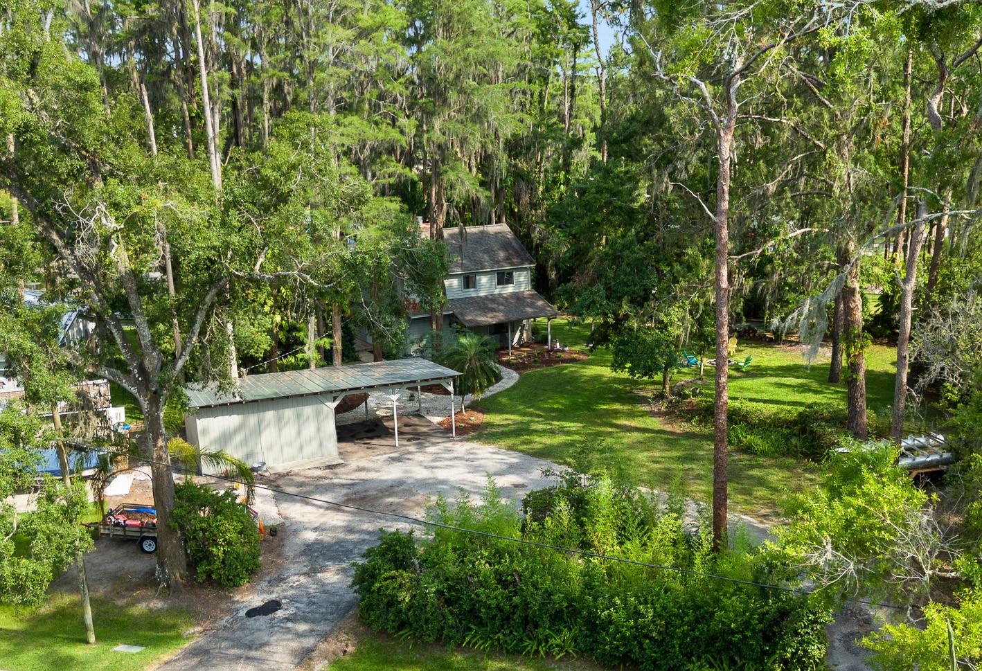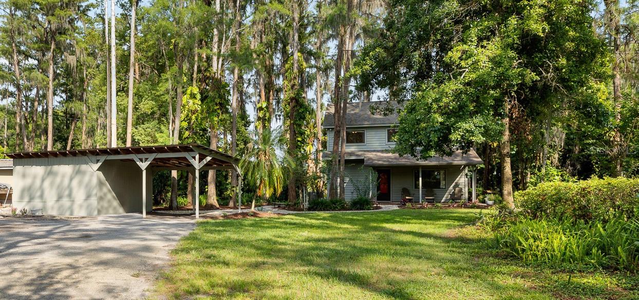 One or more photo(s) has been virtually staged. Charming Lakefront Retreat ... just under one acre! As you drive up, notice the landscaping. After a long day, relax around the fire pit and enjoy eating a s'more!! As you enter the home you will notice the newer storm door. There is a large walk-in storage closet off the entry. The kitchen features stainless steel appliances (range, microwave, and dishwasher have been replaced). The disposal has also been replaced. Behind the kitchen sink there is a charming garden window. Adjacent to kitchen there is a spacious dining area which overlooks the great room with wood-burning fireplace & upgraded ceiling fan. There is a downstairs bedroom with crown molding. The downstairs bath features a jetted tub/shower with upgraded tile and listello. There is a newer vanity with solid surface counter & the commode has been replaced. There is vinyl plank flooring throughout the downstairs with the exception of the Florida/Bonus room which is tiled. The Florida/Bonus room features a newer mini split central heat and air and new lighting. A storm door off the Florida/Bonus room leads to a wood deck & has been replaced. The kitchen, dining area, great room, and Florida/Bonus room all have beautiful lake views!! There is also a laundry room on the first floor & the newer washer/dryer are included. Upstairs there are 2 spacious bedrooms and Jack N Jill bath. Also upstairs is a small loft area ... perfect for an office. The roof was replaced in Sept of 2019, the septic tank pump has been replaced, and an alarm system for tank has been installed. The electrical panel was recently replaced and electrical has been updated in the shed. The majority of the interior is freshly painted! There are 2 sheds ... the large shed has a concrete floor, new metal roof in 2024 & shelving. The well equipment and water softener is also located in this shed. There is a 2-car carport. Serene lake life yet close to the Suncoast Expressway, Outlets Mall, and Wiregrass Mall.