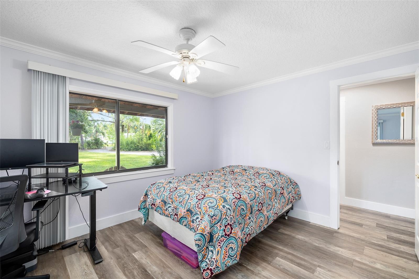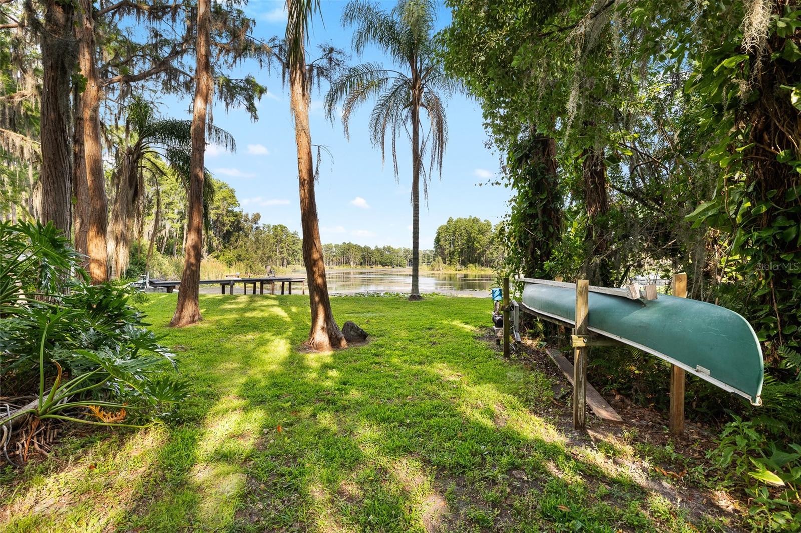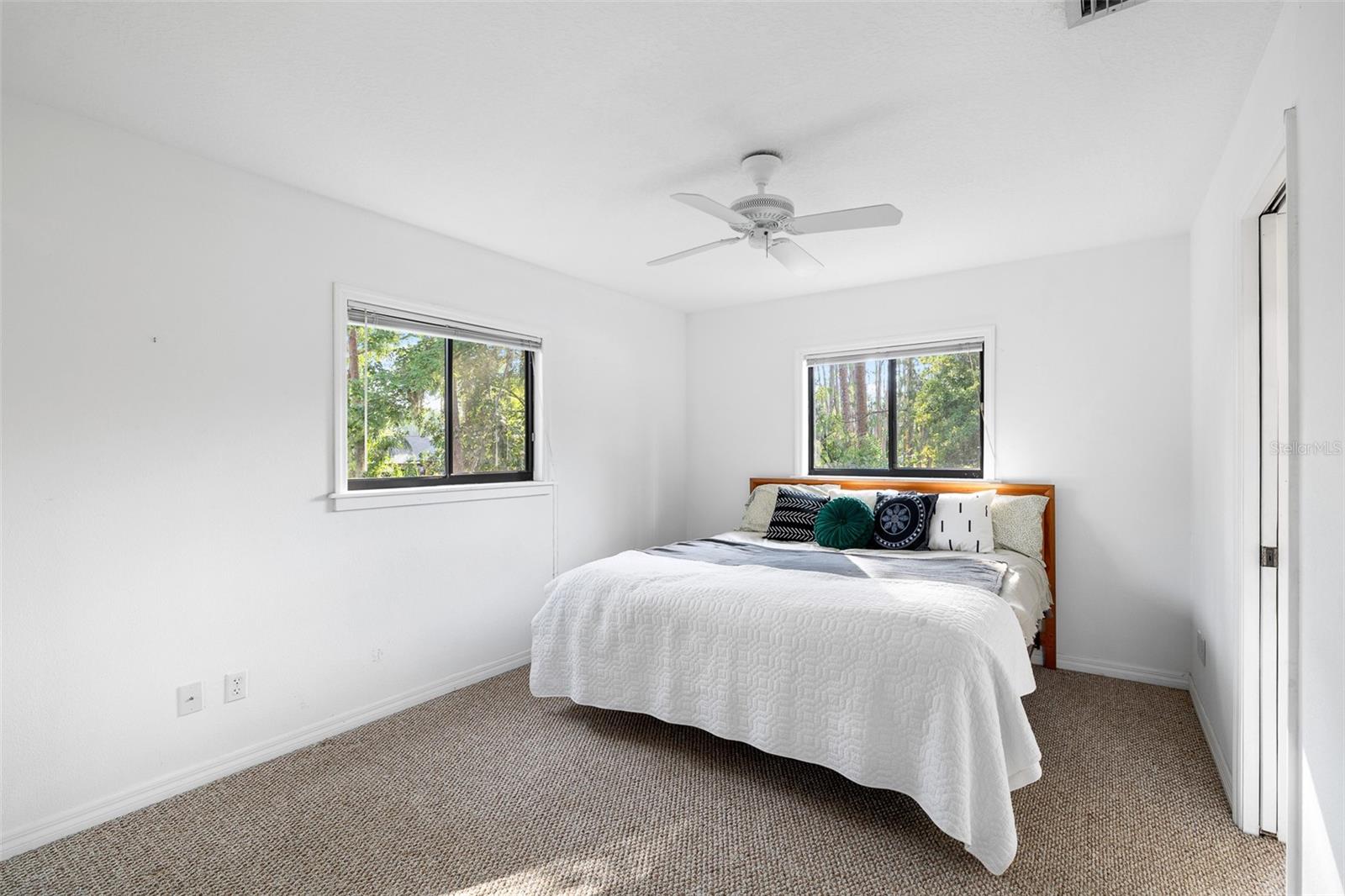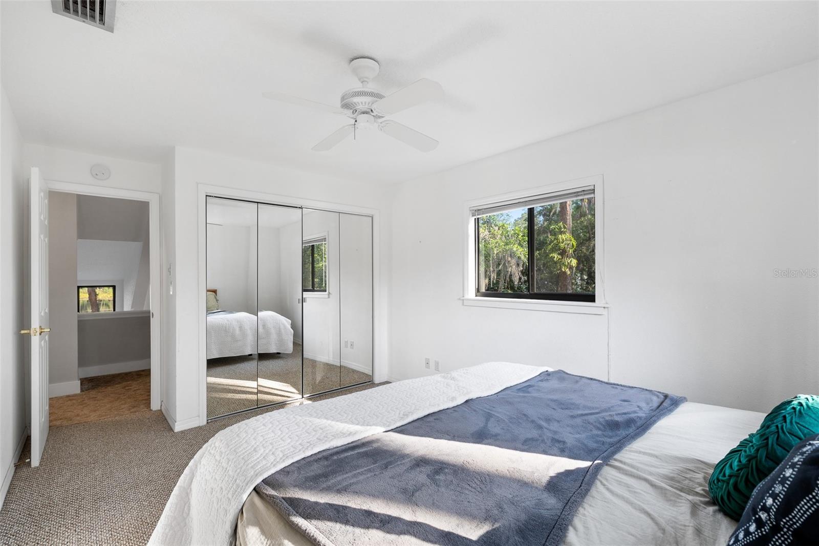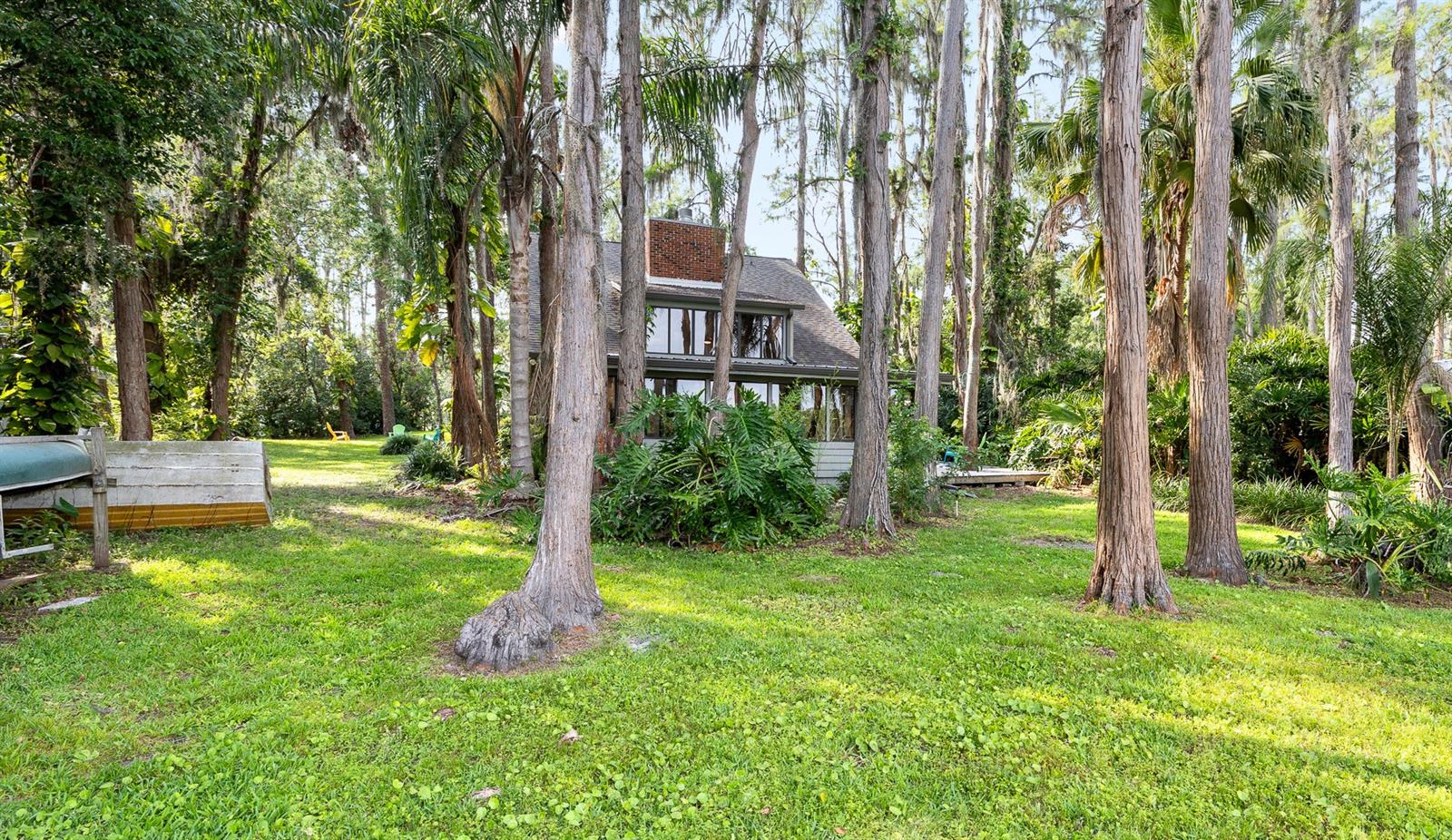 One or more photo(s) has been virtually staged. Charming Lakefront Retreat ... just under one acre! As you drive up, notice the landscaping. After a long day, relax around the fire pit and enjoy eating a s'more!! As you enter the home you will notice the newer storm door. There is a large walk-in storage closet off the entry. The kitchen features stainless steel appliances (range, microwave, and dishwasher have been replaced). The disposal has also been replaced. Behind the kitchen sink there is a charming garden window. Adjacent to kitchen there is a spacious dining area which overlooks the great room with wood-burning fireplace & upgraded ceiling fan. There is a downstairs bedroom with crown molding. The downstairs bath features a jetted tub/shower with upgraded tile and listello. There is a newer vanity with solid surface counter & the commode has been replaced. There is vinyl plank flooring throughout the downstairs with the exception of the Florida/Bonus room which is tiled. The Florida/Bonus room features a newer mini split central heat and air and new lighting. A storm door off the Florida/Bonus room leads to a wood deck & has been replaced. The kitchen, dining area, great room, and Florida/Bonus room all have beautiful lake views!! There is also a laundry room on the first floor & the newer washer/dryer are included. Upstairs there are 2 spacious bedrooms and Jack N Jill bath. Also upstairs is a small loft area ... perfect for an office. The roof was replaced in Sept of 2019, the septic tank pump has been replaced, and an alarm system for tank has been installed. The electrical panel was recently replaced and electrical has been updated in the shed. The majority of the interior is freshly painted! There are 2 sheds ... the large shed has a concrete floor, new metal roof in 2024 & shelving. The well equipment and water softener is also located in this shed. There is a 2-car carport. Serene lake life yet close to the Suncoast Expressway, Outlets Mall, and Wiregrass Mall.