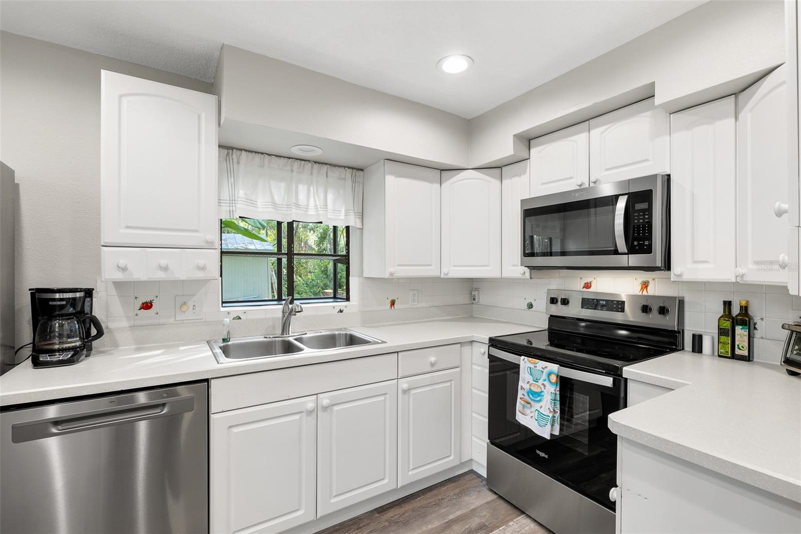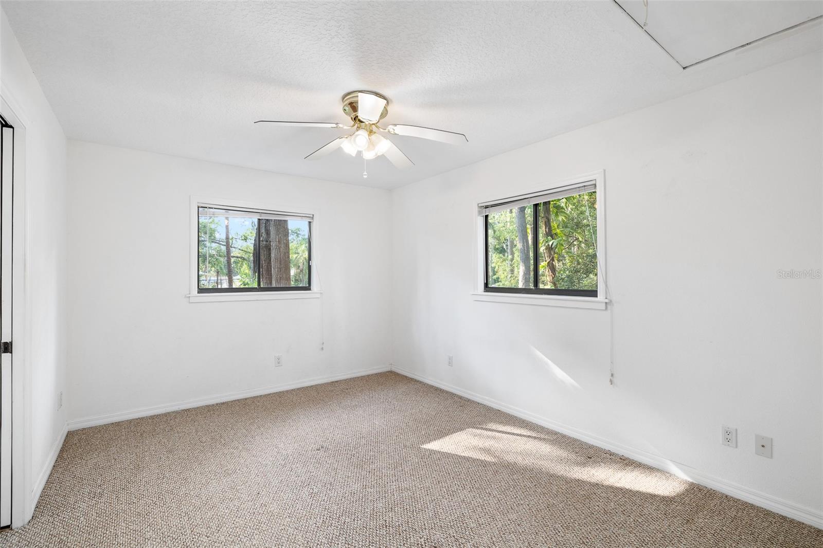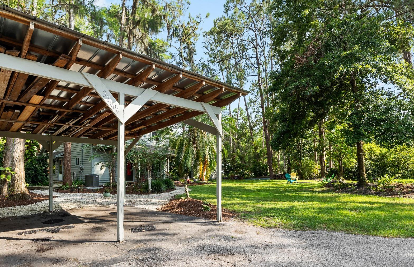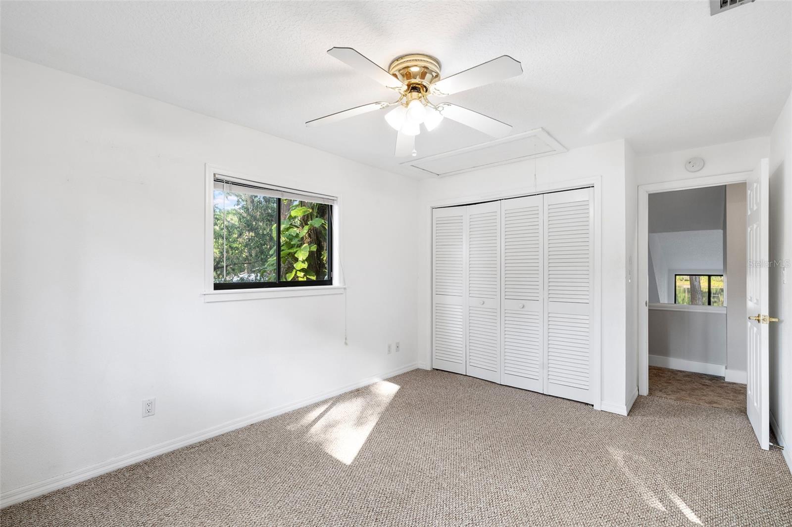 One or more photo(s) has been virtually staged. Charming Lakefront Retreat ... just under one acre! As you drive up, notice the landscaping. After a long day, relax around the fire pit and enjoy eating a s'more!! As you enter the home you will notice the newer storm door. There is a large walk-in storage closet off the entry. The kitchen features stainless steel appliances (range, microwave, and dishwasher have been replaced). The disposal has also been replaced. Behind the kitchen sink there is a charming garden window. Adjacent to kitchen there is a spacious dining area which overlooks the great room with wood-burning fireplace & upgraded ceiling fan. There is a downstairs bedroom with crown molding. The downstairs bath features a jetted tub/shower with upgraded tile and listello. There is a newer vanity with solid surface counter & the commode has been replaced. There is vinyl plank flooring throughout the downstairs with the exception of the Florida/Bonus room which is tiled. The Florida/Bonus room features a newer mini split central heat and air and new lighting. A storm door off the Florida/Bonus room leads to a wood deck & has been replaced. The kitchen, dining area, great room, and Florida/Bonus room all have beautiful lake views!! There is also a laundry room on the first floor & the newer washer/dryer are included. Upstairs there are 2 spacious bedrooms and Jack N Jill bath. Also upstairs is a small loft area ... perfect for an office. The roof was replaced in Sept of 2019, the septic tank pump has been replaced, and an alarm system for tank has been installed. The electrical panel was recently replaced and electrical has been updated in the shed. The majority of the interior is freshly painted! There are 2 sheds ... the large shed has a concrete floor, new metal roof in 2024 & shelving. The well equipment and water softener is also located in this shed. There is a 2-car carport. Serene lake life yet close to the Suncoast Expressway, Outlets Mall, and Wiregrass Mall.