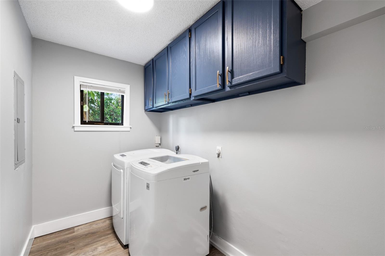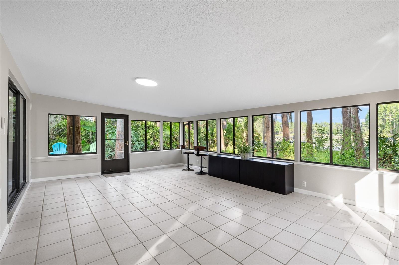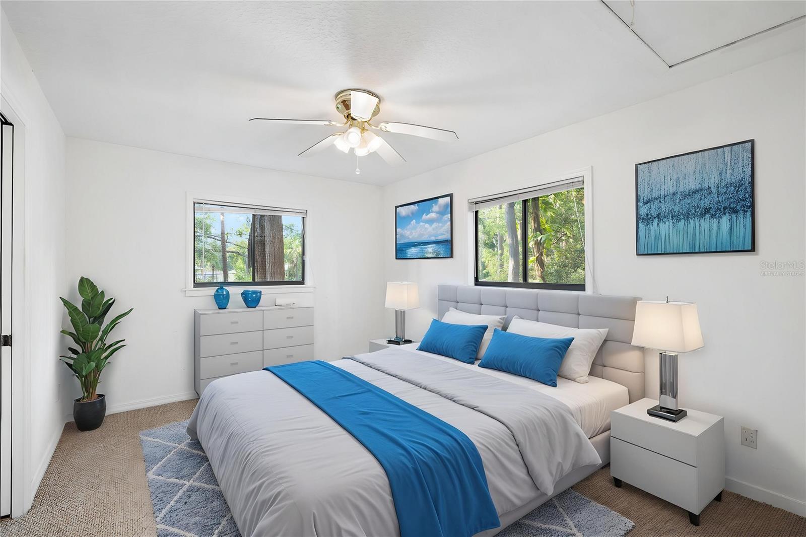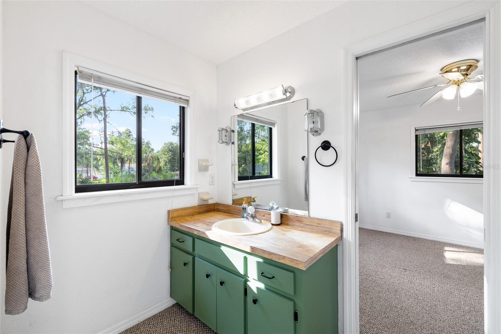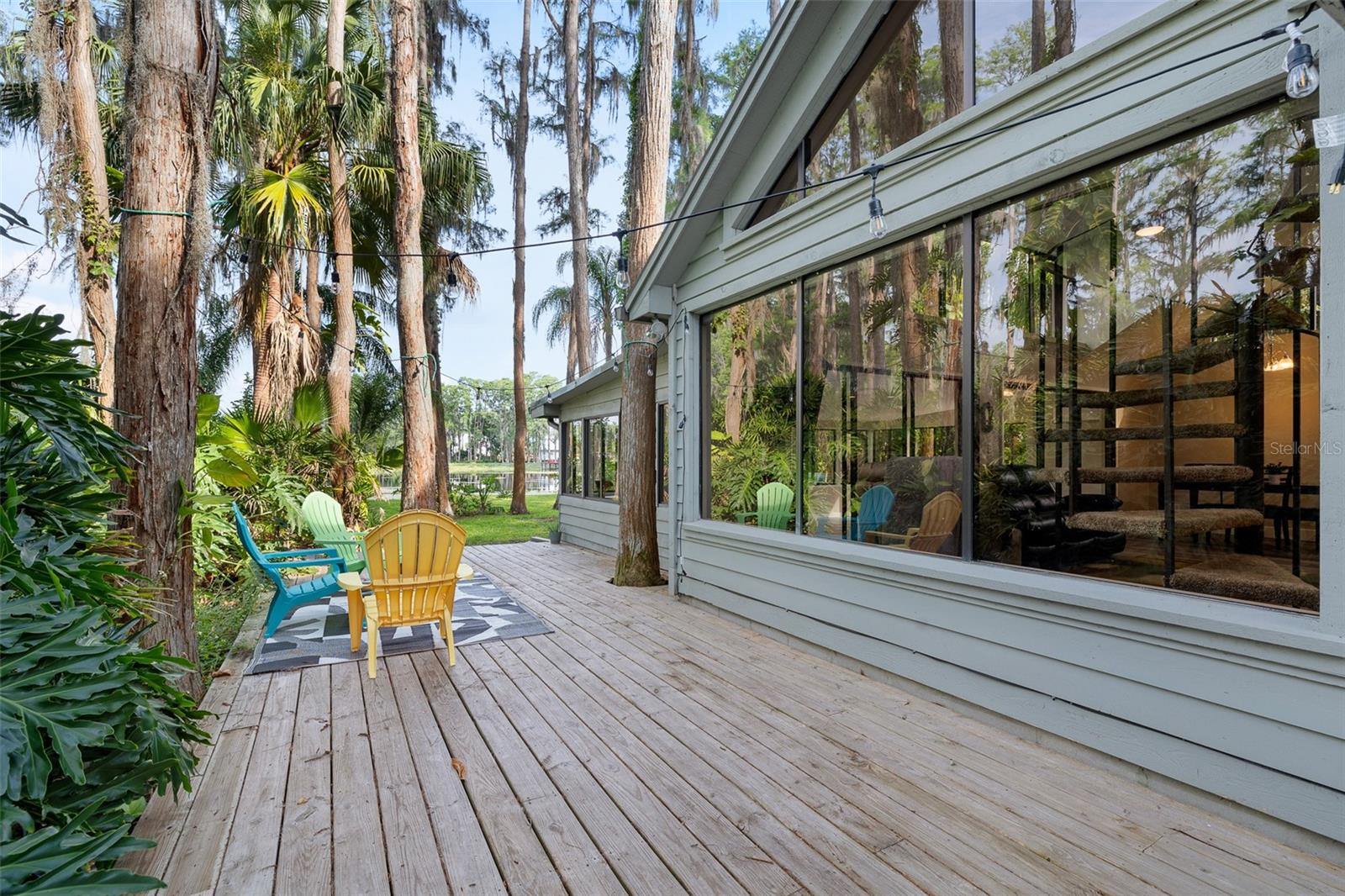 One or more photo(s) has been virtually staged. Charming Lakefront Retreat ... just under one acre! As you drive up, notice the landscaping. After a long day, relax around the fire pit and enjoy eating a s'more!! As you enter the home you will notice the newer storm door. There is a large walk-in storage closet off the entry. The kitchen features stainless steel appliances (range, microwave, and dishwasher have been replaced). The disposal has also been replaced. Behind the kitchen sink there is a charming garden window. Adjacent to kitchen there is a spacious dining area which overlooks the great room with wood-burning fireplace & upgraded ceiling fan. There is a downstairs bedroom with crown molding. The downstairs bath features a jetted tub/shower with upgraded tile and listello. There is a newer vanity with solid surface counter & the commode has been replaced. There is vinyl plank flooring throughout the downstairs with the exception of the Florida/Bonus room which is tiled. The Florida/Bonus room features a newer mini split central heat and air and new lighting. A storm door off the Florida/Bonus room leads to a wood deck & has been replaced. The kitchen, dining area, great room, and Florida/Bonus room all have beautiful lake views!! There is also a laundry room on the first floor & the newer washer/dryer are included. Upstairs there are 2 spacious bedrooms and Jack N Jill bath. Also upstairs is a small loft area ... perfect for an office. The roof was replaced in Sept of 2019, the septic tank pump has been replaced, and an alarm system for tank has been installed. The electrical panel was recently replaced and electrical has been updated in the shed. The majority of the interior is freshly painted! There are 2 sheds ... the large shed has a concrete floor, new metal roof in 2024 & shelving. The well equipment and water softener is also located in this shed. There is a 2-car carport. Serene lake life yet close to the Suncoast Expressway, Outlets Mall, and Wiregrass Mall.