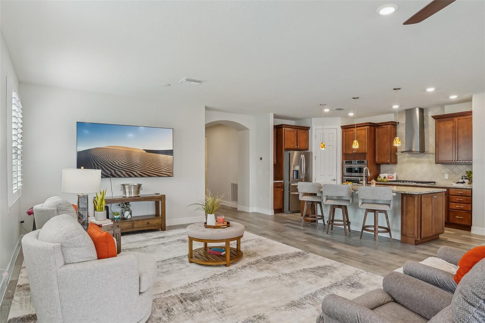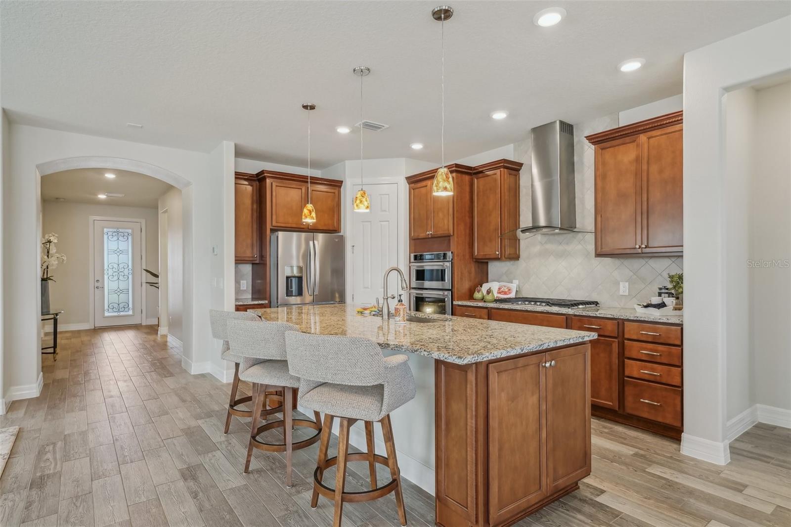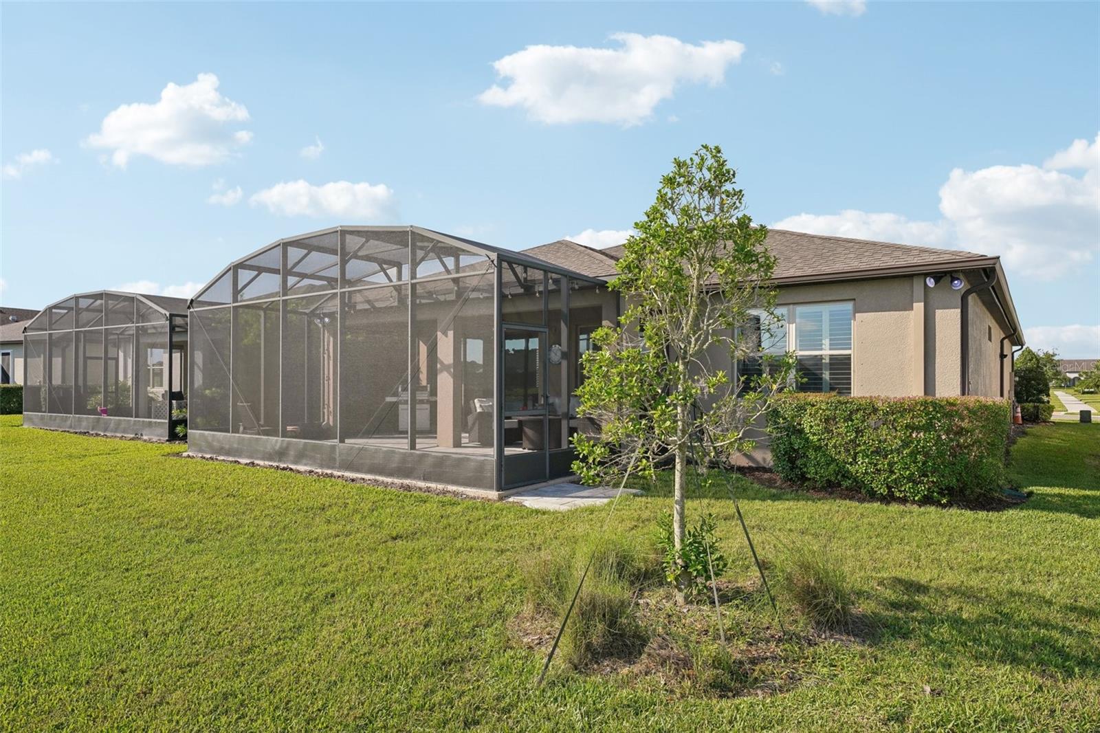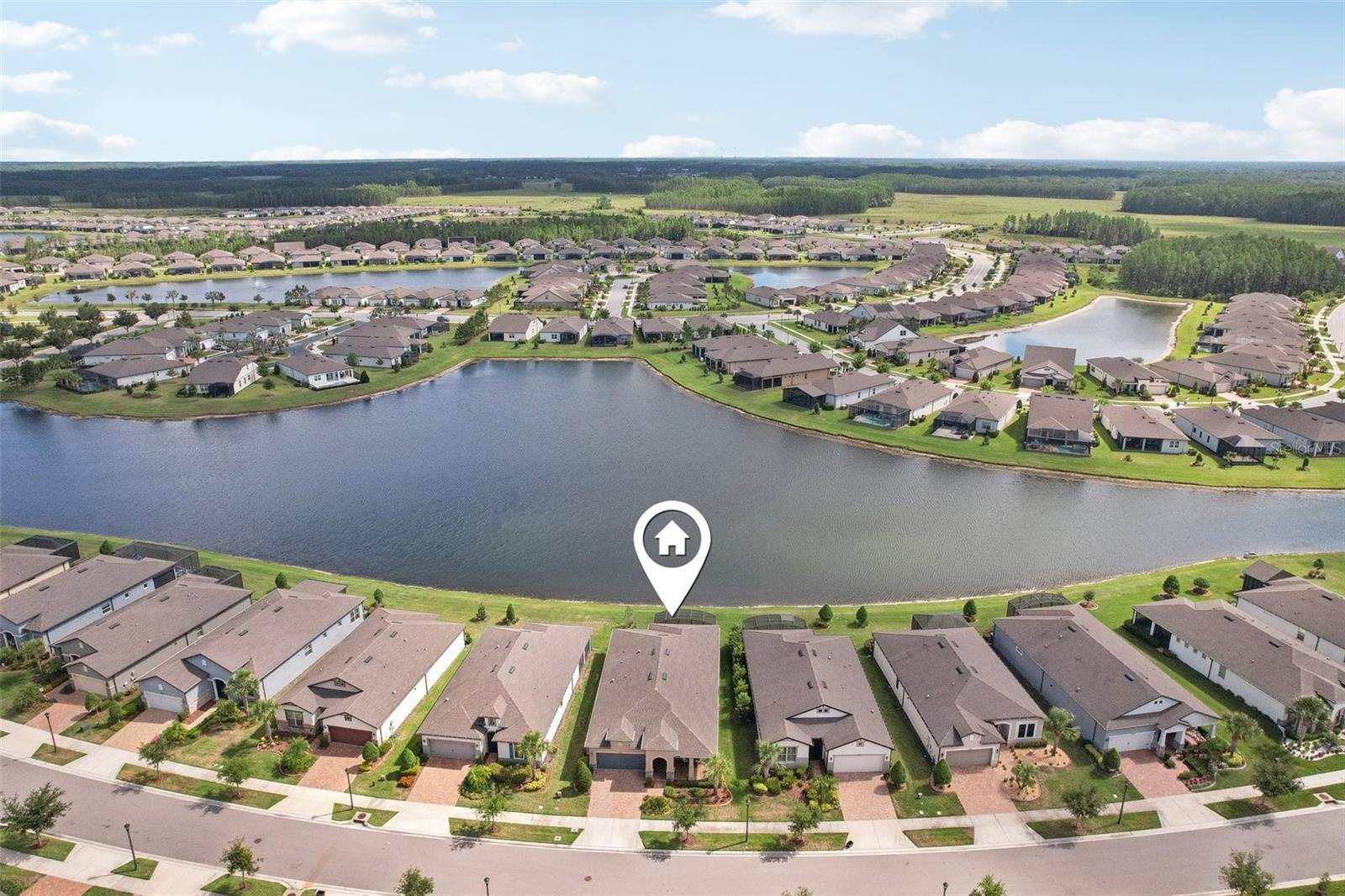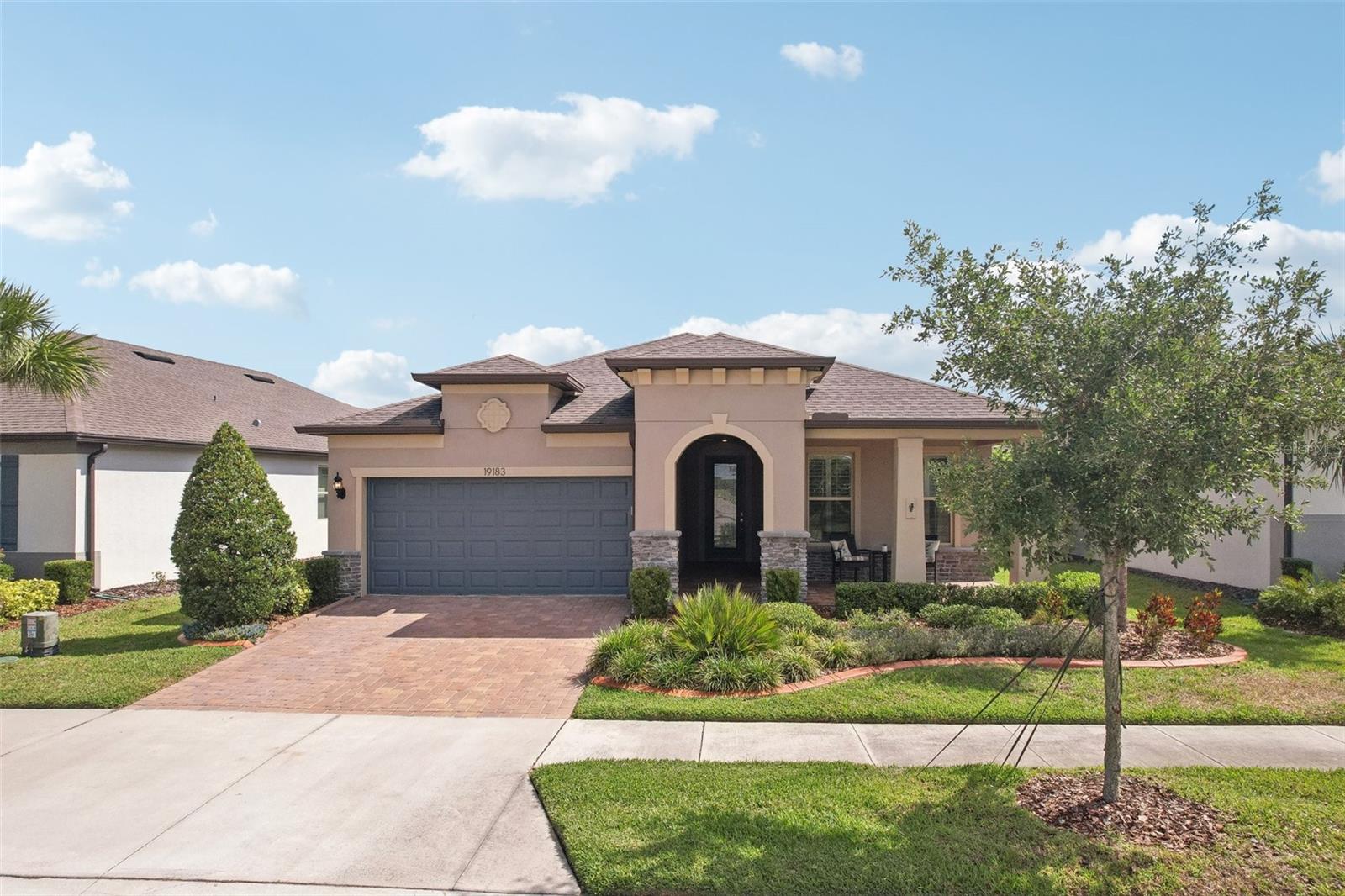 Step into elevated Florida living in this meticulously maintained, model-perfect 2019 home—located in the newly built subdivision of Del Webb Bexley, a premier 55+ active community known for its vibrant lifestyle and high-end amenities. This single-story, standalone home showcases a Mediterranean transitional design with architectural details that include curved archways, rounded corners, and ceramic clay tile flooring throughout. It’s as well-built as it is beautiful. Stately rectangular columns and real stone accents enhance the façade, while a covered front porch and smooth brick pavers create a warm, welcoming first impression. The interior and exterior were freshly painted just over a year ago. A coordinating slate blue garage and front door add a sophisticated pop of color that complement the neutral palette and ties into the surrounding stonework. Beneath the beauty, insulated concrete block construction provides enhanced thermal efficiency—reducing energy use and maintaining year-round comfort. With over 3,100 SF of total space, this home is designed to blend indoor and outdoor living. From the moment you enter, your eye is drawn through the open-concept layout—where the kitchen, living, and dining areas flow together—toward the lanai and vast pond view. At the heart of the home is the entertainer’s kitchen, designed to impress and built to perform. It features granite countertops, a sprawling center island with sink and breakfast bar seating, soft-close wood cabinetry with pull-out shelves and deep drawers, a professionally designed walk-in pantry with pull-out baskets and wine storage, and a KitchenAid natural gas griddle stove with exhaust hood. The primary suite is located at the back of the home, offering serene pond views. The en-suite bath is filled with natural light and includes dual vanities, a walk-in linear shower with bench and dual shower heads, a large linen closet, a private water closet, and a walk-in closet with built-in organizational shelving. Two guest bedrooms are thoughtfully positioned for guest privacy. Step outside to your oversized 24’ x 19’ lanai, with cement-tile flooring and a durable tension-cable screen that preserves wide-open water views—perfect for evening gatherings around the firepit table. The extended garage offers space for 2 cars + a golf cart and is outfitted with epoxy flooring, ceiling storage, and an insulated, impact-rated door with a raised threshold to help keep out debris. A full-sized laundry room provides upper and lower cabinetry, a washtub sink, and LG washer and dryer. Additional upgrades include: 8' interior doors, modern wide baseboards, gas-powered tankless water heater, whole-house water softener and RO system, and an in-wall pest control system with exterior access. Del Webb Bexley’s gated entrance leads to an exceptional amenity center featuring a 19,000-square-foot clubhouse, resort-style pools with lap and resistance lanes, hot tub, a fitness center, amphitheater, walking trails, pickleball and tennis courts, dog parks, a community garden, and a full calendar of social events. This home offers the perfect blend of style, comfort, and active living in one of Land O’ Lakes’ most desirable communities. Come experience the resort lifestyle every day.