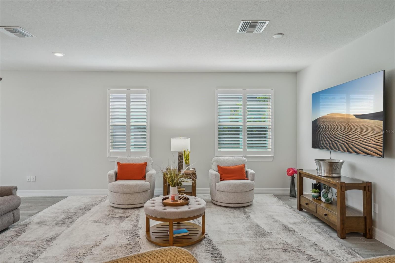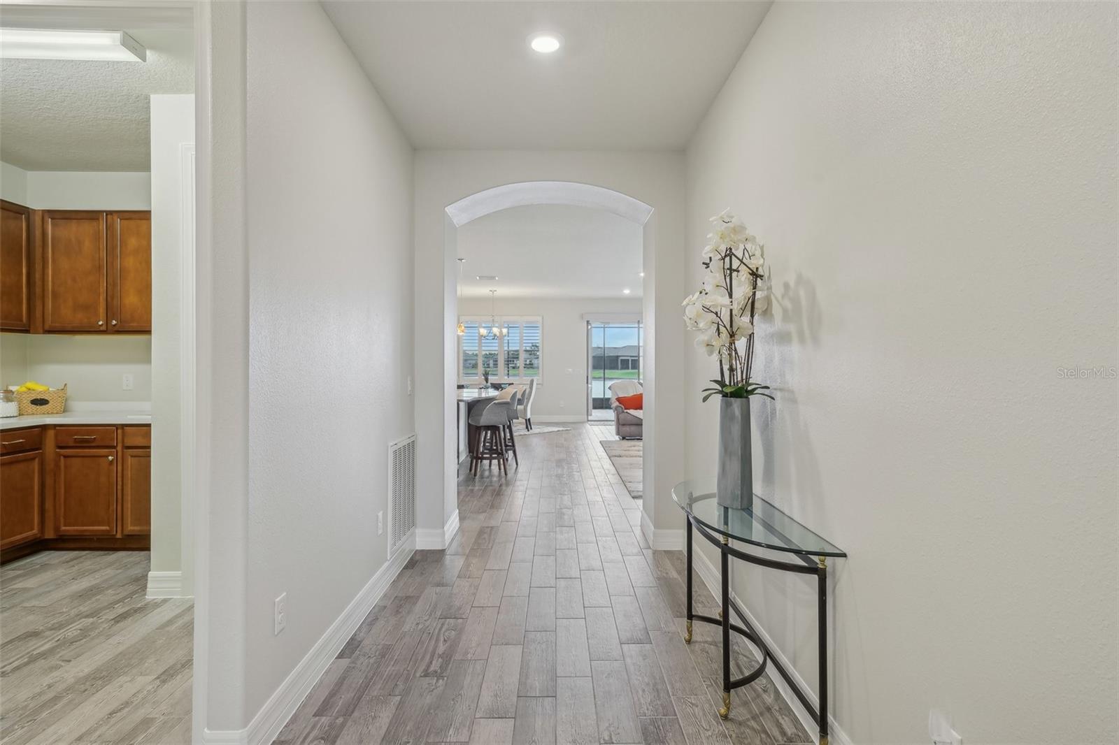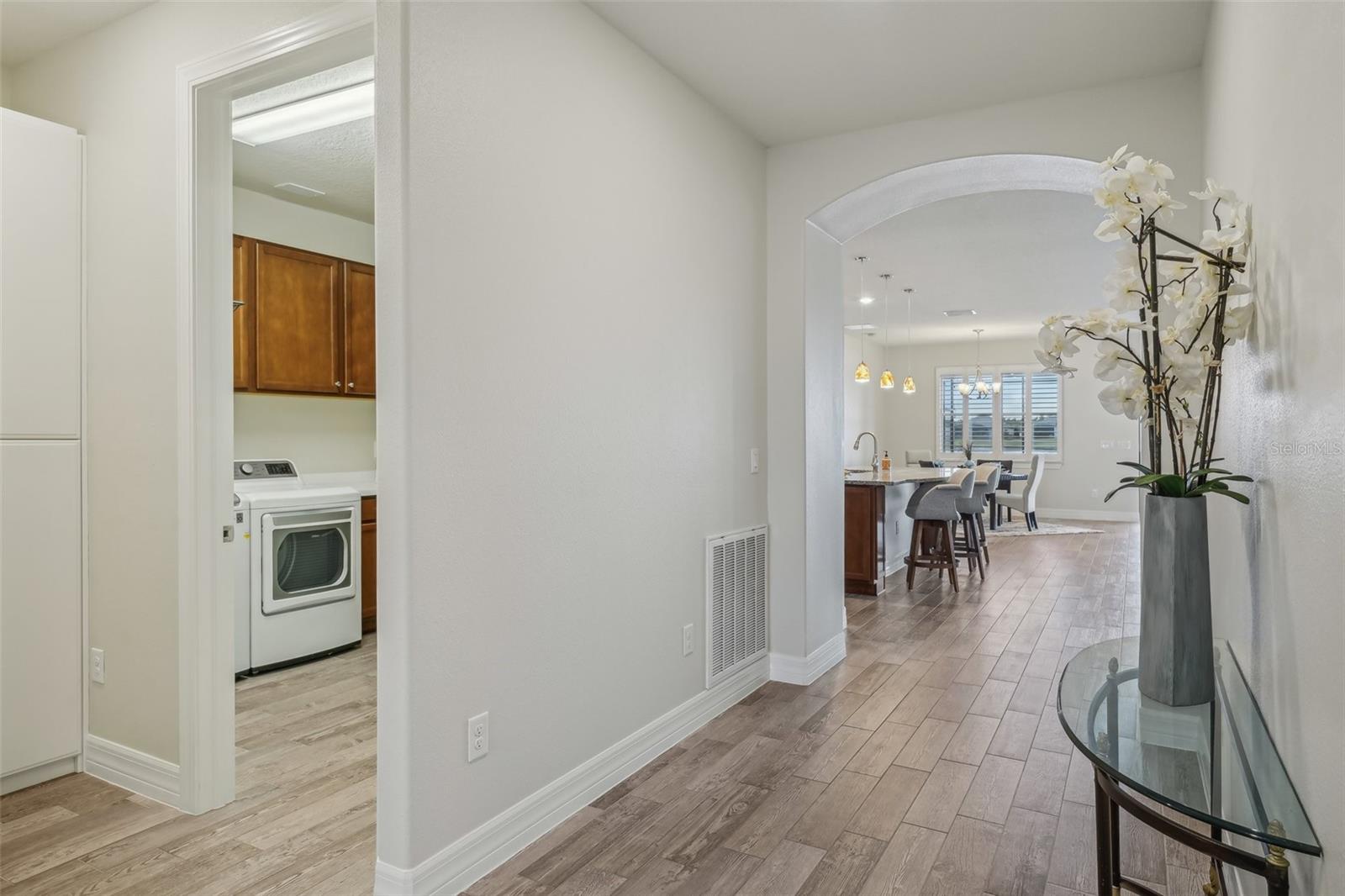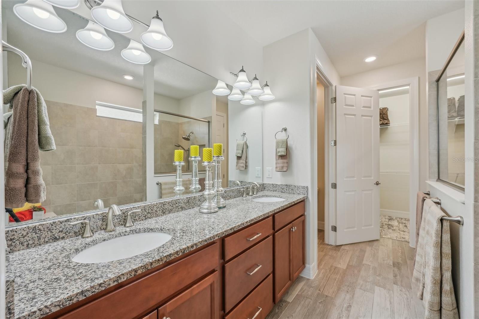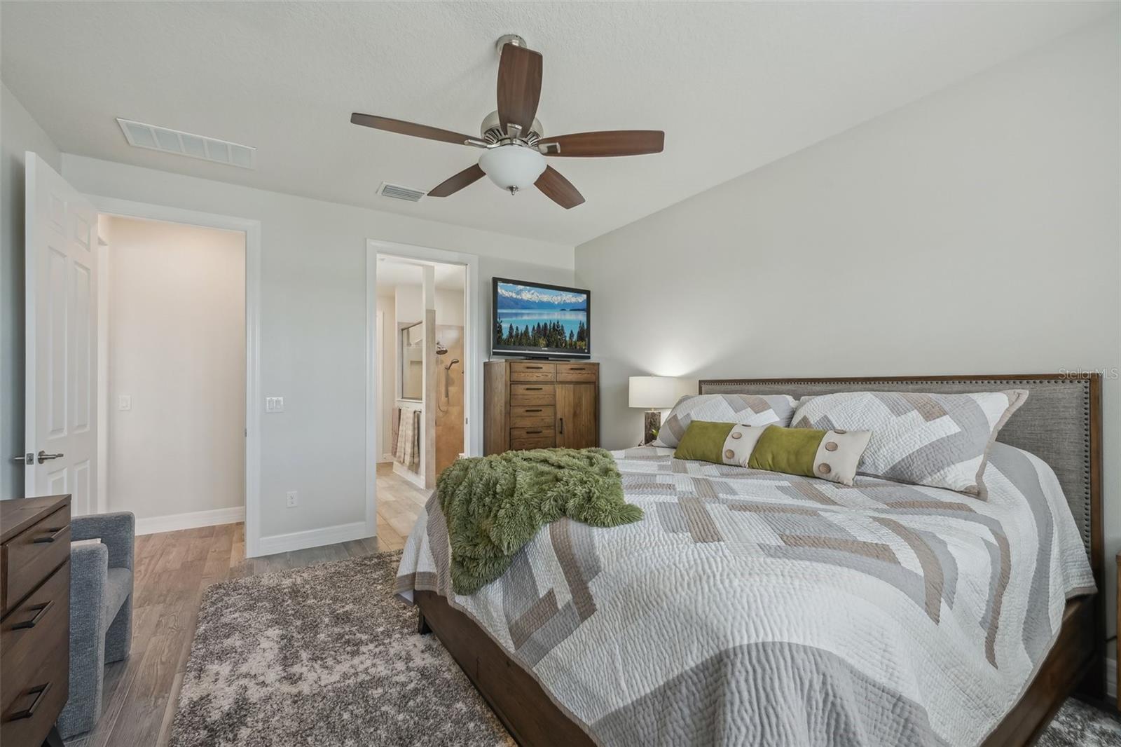 Step into elevated Florida living in this meticulously maintained, model-perfect 2019 home—located in the newly built subdivision of Del Webb Bexley, a premier 55+ active community known for its vibrant lifestyle and high-end amenities. This single-story, standalone home showcases a Mediterranean transitional design with architectural details that include curved archways, rounded corners, and ceramic clay tile flooring throughout. It’s as well-built as it is beautiful. Stately rectangular columns and real stone accents enhance the façade, while a covered front porch and smooth brick pavers create a warm, welcoming first impression. The interior and exterior were freshly painted just over a year ago. A coordinating slate blue garage and front door add a sophisticated pop of color that complement the neutral palette and ties into the surrounding stonework. Beneath the beauty, insulated concrete block construction provides enhanced thermal efficiency—reducing energy use and maintaining year-round comfort. With over 3,100 SF of total space, this home is designed to blend indoor and outdoor living. From the moment you enter, your eye is drawn through the open-concept layout—where the kitchen, living, and dining areas flow together—toward the lanai and vast pond view. At the heart of the home is the entertainer’s kitchen, designed to impress and built to perform. It features granite countertops, a sprawling center island with sink and breakfast bar seating, soft-close wood cabinetry with pull-out shelves and deep drawers, a professionally designed walk-in pantry with pull-out baskets and wine storage, and a KitchenAid natural gas griddle stove with exhaust hood. The primary suite is located at the back of the home, offering serene pond views. The en-suite bath is filled with natural light and includes dual vanities, a walk-in linear shower with bench and dual shower heads, a large linen closet, a private water closet, and a walk-in closet with built-in organizational shelving. Two guest bedrooms are thoughtfully positioned for guest privacy. Step outside to your oversized 24’ x 19’ lanai, with cement-tile flooring and a durable tension-cable screen that preserves wide-open water views—perfect for evening gatherings around the firepit table. The extended garage offers space for 2 cars + a golf cart and is outfitted with epoxy flooring, ceiling storage, and an insulated, impact-rated door with a raised threshold to help keep out debris. A full-sized laundry room provides upper and lower cabinetry, a washtub sink, and LG washer and dryer. Additional upgrades include: 8' interior doors, modern wide baseboards, gas-powered tankless water heater, whole-house water softener and RO system, and an in-wall pest control system with exterior access. Del Webb Bexley’s gated entrance leads to an exceptional amenity center featuring a 19,000-square-foot clubhouse, resort-style pools with lap and resistance lanes, hot tub, a fitness center, amphitheater, walking trails, pickleball and tennis courts, dog parks, a community garden, and a full calendar of social events. This home offers the perfect blend of style, comfort, and active living in one of Land O’ Lakes’ most desirable communities. Come experience the resort lifestyle every day.