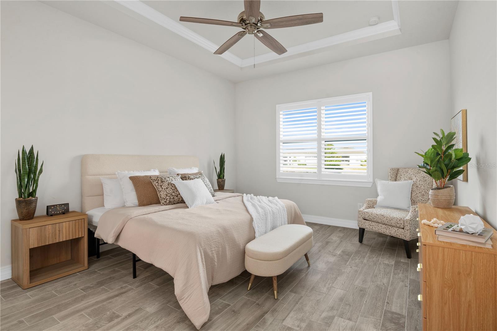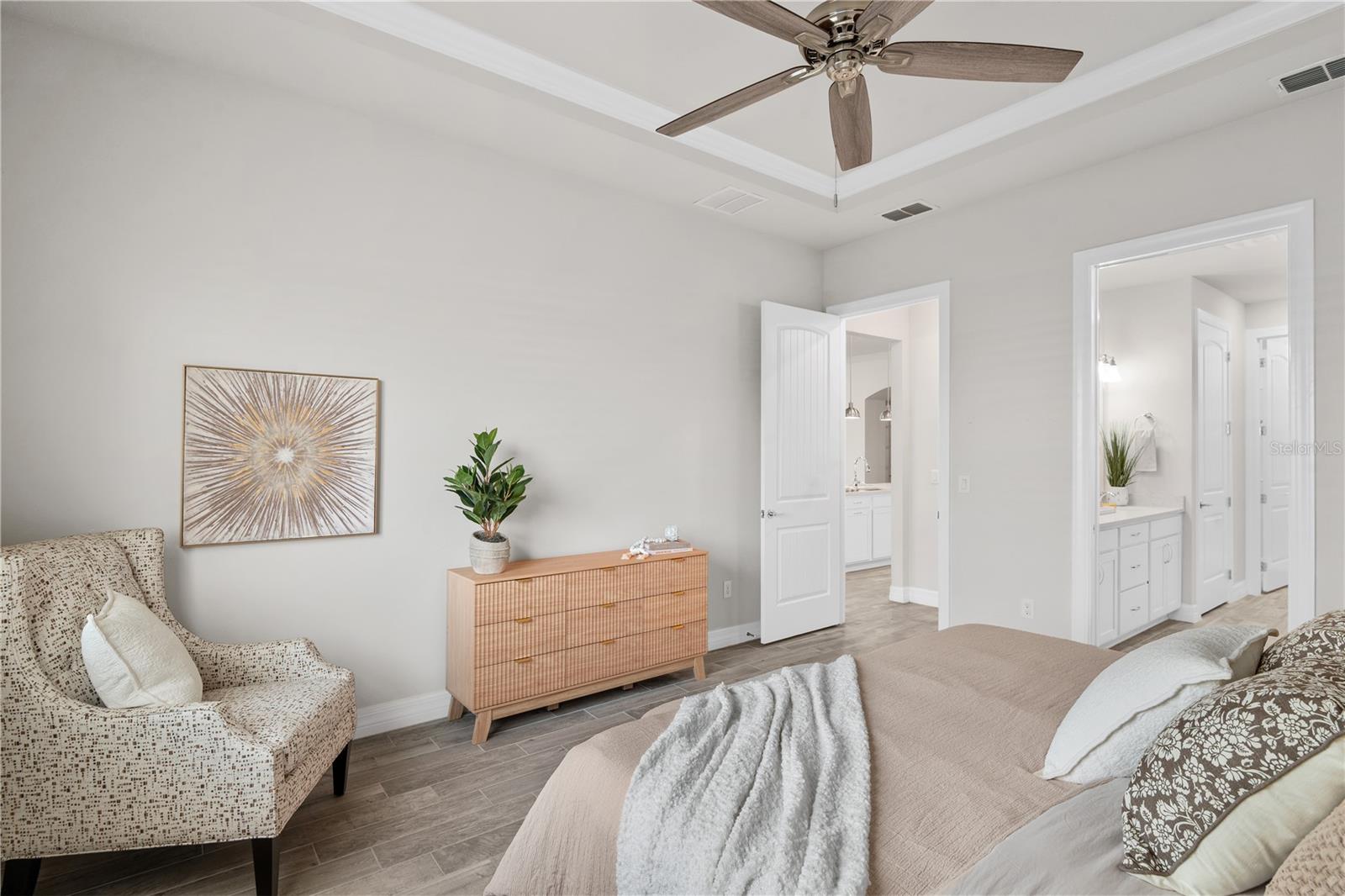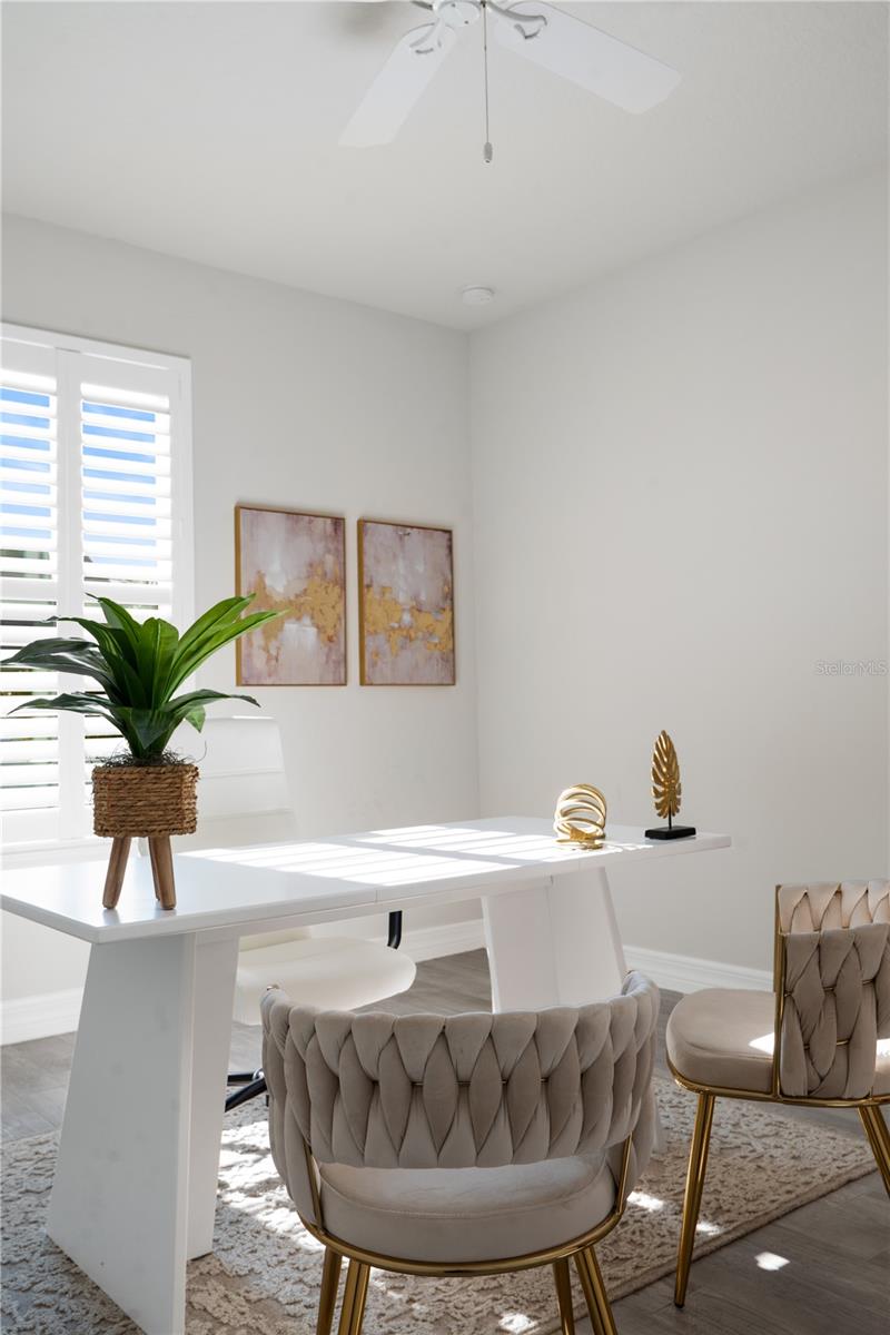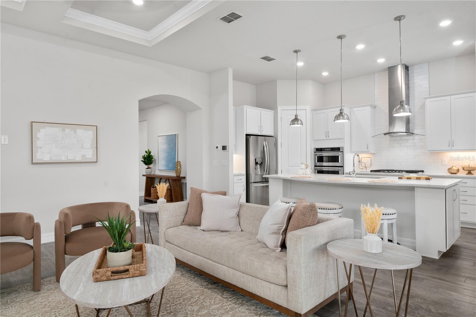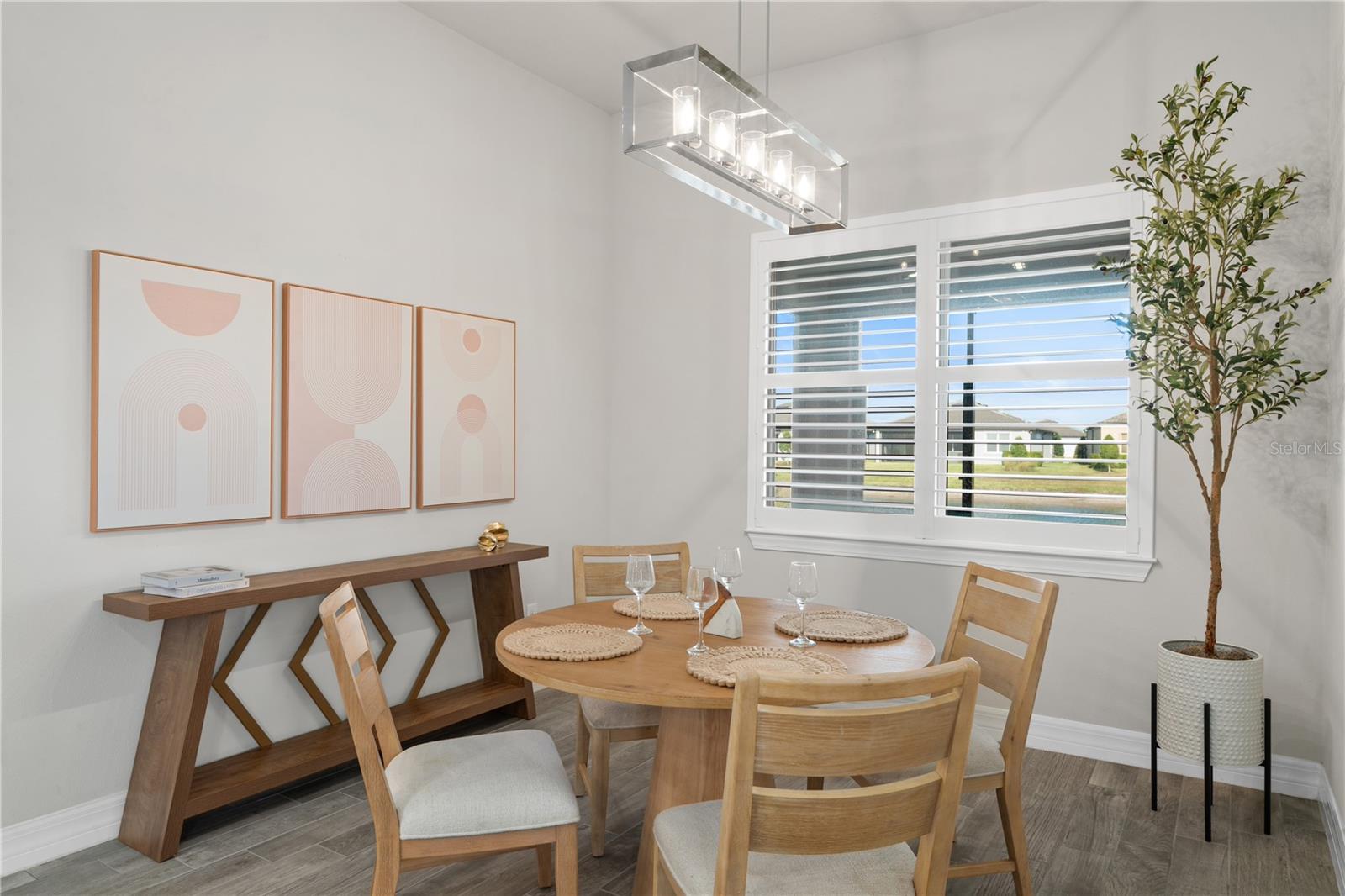 Nestled in a tranquil setting, this stunning property offers breathtaking water views from both the back and side of the home, providing a serene and picturesque backdrop for everyday living. Welcome to this beautifully appointed 3 Bedroom + Office, 2 Bath Home with a 2-car garage, perfectly situated on a serene pond in the gated 55+ community of Del Webb Bexley offering resort-style amenities. From the moment you step inside, you’ll notice the elegant wood-look tile flooring and plantation shutters that run throughout the home, creating a cohesive and upscale feel. The spacious kitchen is a chef’s dream, featuring crisp white cabinets, stunning quartz countertops, stainless steel appliances, a large island with seating and pendant lighting, subway tile backsplash, a vented range hood, and a generous sized pantry. The adjacent dining area boasts water views, making every meal a relaxing experience. The family room is equally inviting, complete with crown molding and sliding doors that open to the backyard, where tranquil pond views await. The primary suite is a peaceful retreat with a tray ceiling, crown molding, and pond views, plus an en suite bath that includes double sinks with quartz counters, a stall shower, large walk-in closet, and a linen closet for added storage. French doors lead into the office, which also offers beautiful water views—perfect for quiet work or reflection. The guest bath includes a tub/shower combo for versatility. Outdoor living is a dream with the expansive wrap-around, covered, and screened patio—ideal for entertaining or enjoying peaceful mornings by the water. The community amenities are plentiful! Relax in the heated swimming pool, resistance pool and spa. Stay active with tennis, pickleball, and bocce ball. The 19,000 sq ft Clubhouse hosts various events, activities and clubs and is home to the state-of-the-art fitness center and much more. Take advantage of the dog park, on-site bistro, and outdoor amphitheater. This home is the perfect blend of luxury, comfort, and active adult living.