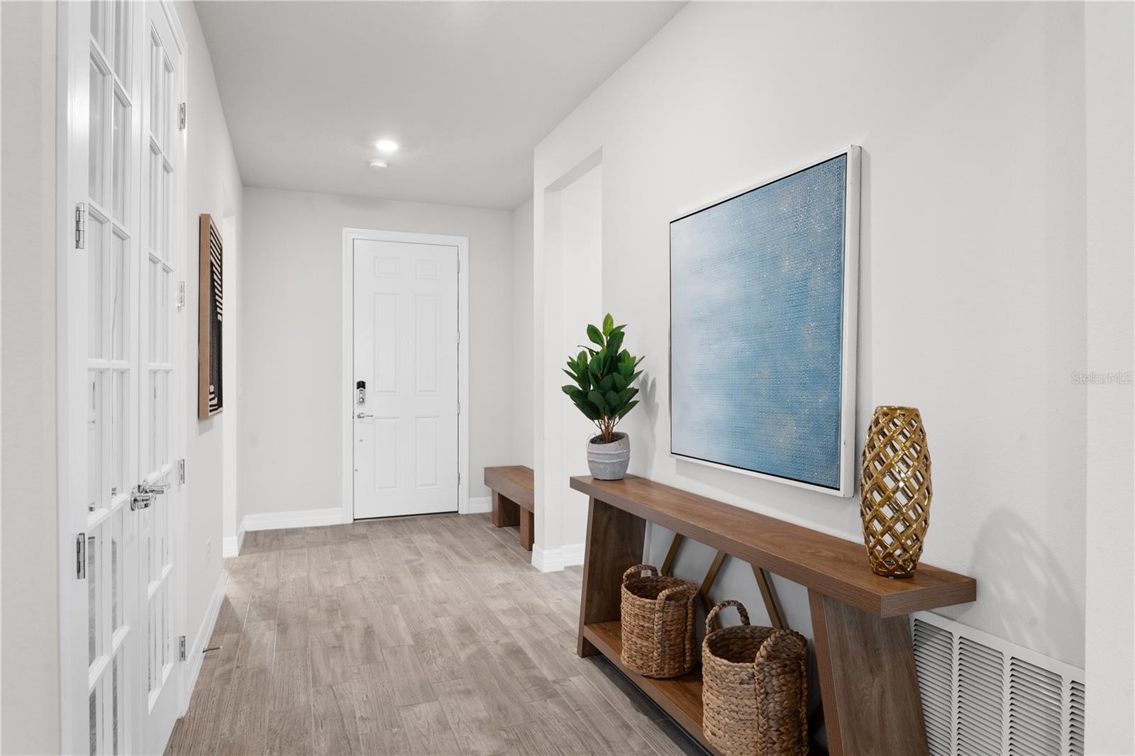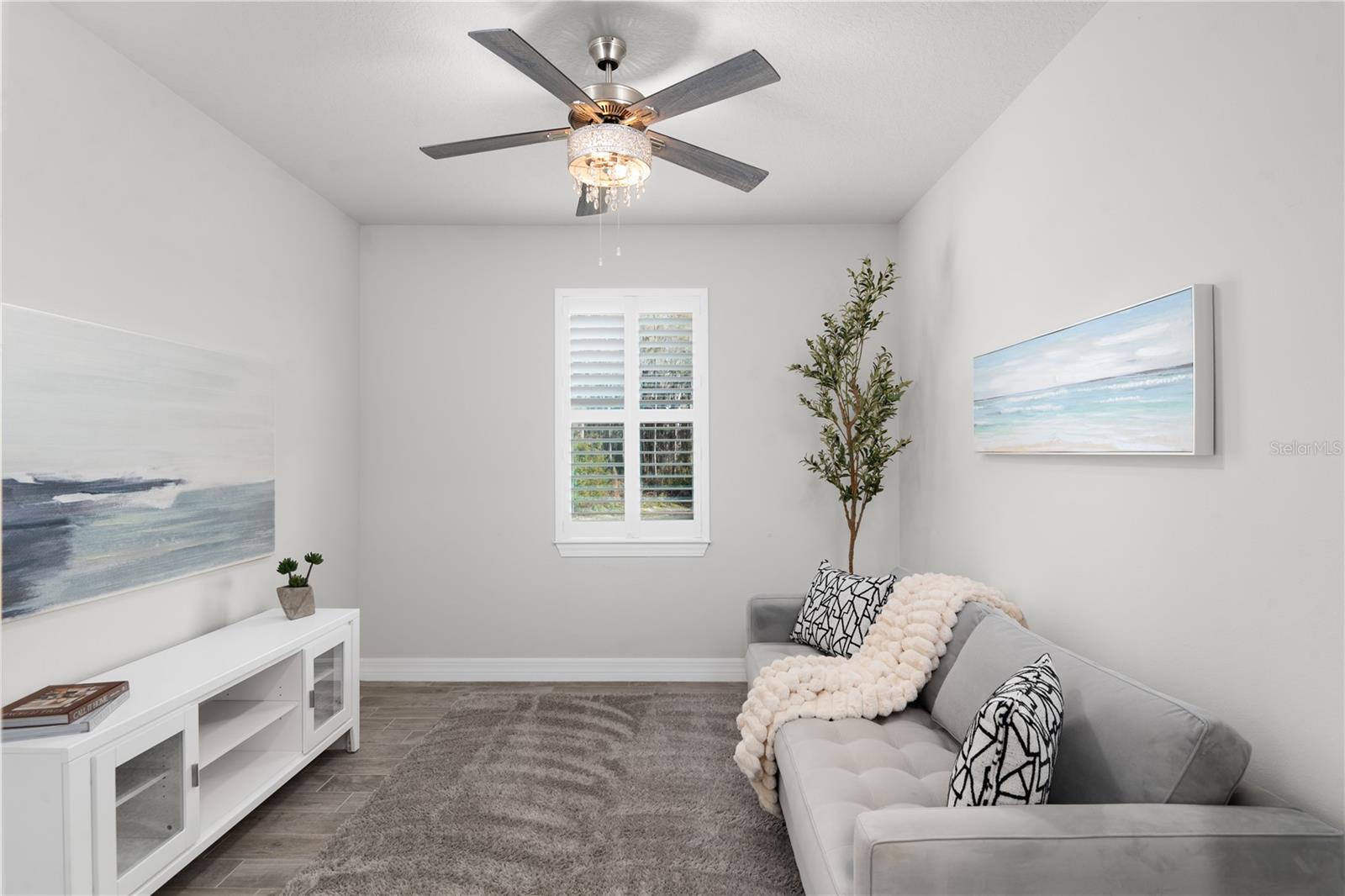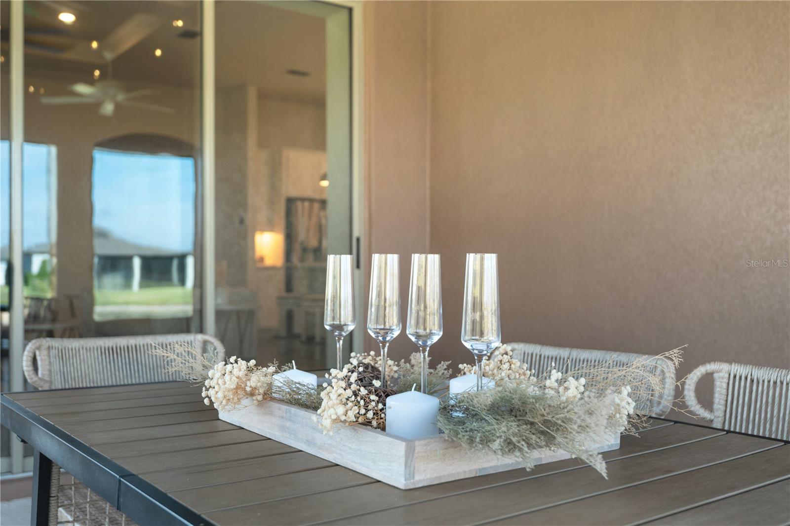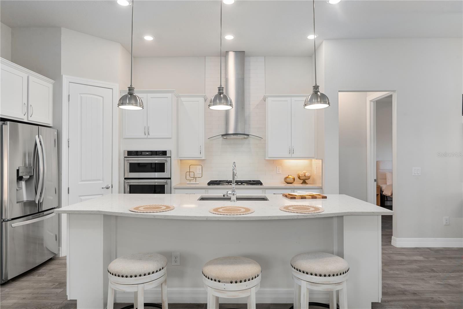 Nestled in a tranquil setting, this stunning property offers breathtaking water views from both the back and side of the home, providing a serene and picturesque backdrop for everyday living. Welcome to this beautifully appointed 3 Bedroom + Office, 2 Bath Home with a 2-car garage, perfectly situated on a serene pond in the gated 55+ community of Del Webb Bexley offering resort-style amenities. From the moment you step inside, you’ll notice the elegant wood-look tile flooring and plantation shutters that run throughout the home, creating a cohesive and upscale feel. The spacious kitchen is a chef’s dream, featuring crisp white cabinets, stunning quartz countertops, stainless steel appliances, a large island with seating and pendant lighting, subway tile backsplash, a vented range hood, and a generous sized pantry. The adjacent dining area boasts water views, making every meal a relaxing experience. The family room is equally inviting, complete with crown molding and sliding doors that open to the backyard, where tranquil pond views await. The primary suite is a peaceful retreat with a tray ceiling, crown molding, and pond views, plus an en suite bath that includes double sinks with quartz counters, a stall shower, large walk-in closet, and a linen closet for added storage. French doors lead into the office, which also offers beautiful water views—perfect for quiet work or reflection. The guest bath includes a tub/shower combo for versatility. Outdoor living is a dream with the expansive wrap-around, covered, and screened patio—ideal for entertaining or enjoying peaceful mornings by the water. The community amenities are plentiful! Relax in the heated swimming pool, resistance pool and spa. Stay active with tennis, pickleball, and bocce ball. The 19,000 sq ft Clubhouse hosts various events, activities and clubs and is home to the state-of-the-art fitness center and much more. Take advantage of the dog park, on-site bistro, and outdoor amphitheater. This home is the perfect blend of luxury, comfort, and active adult living.