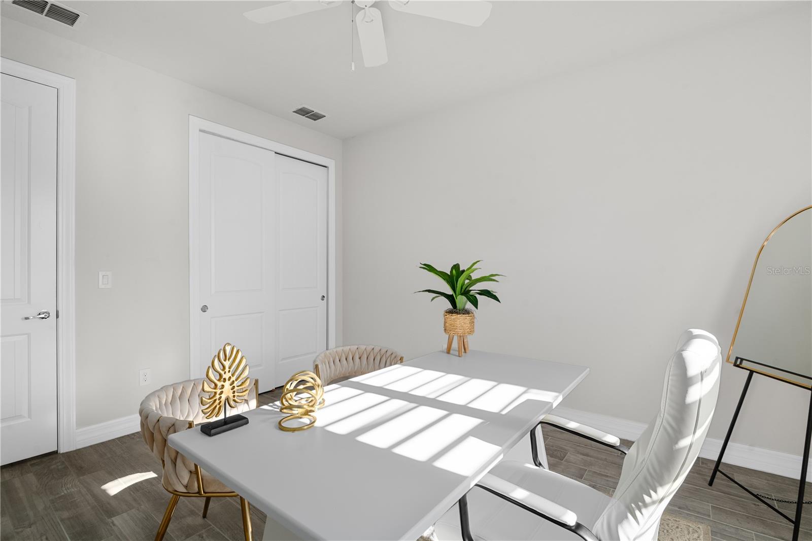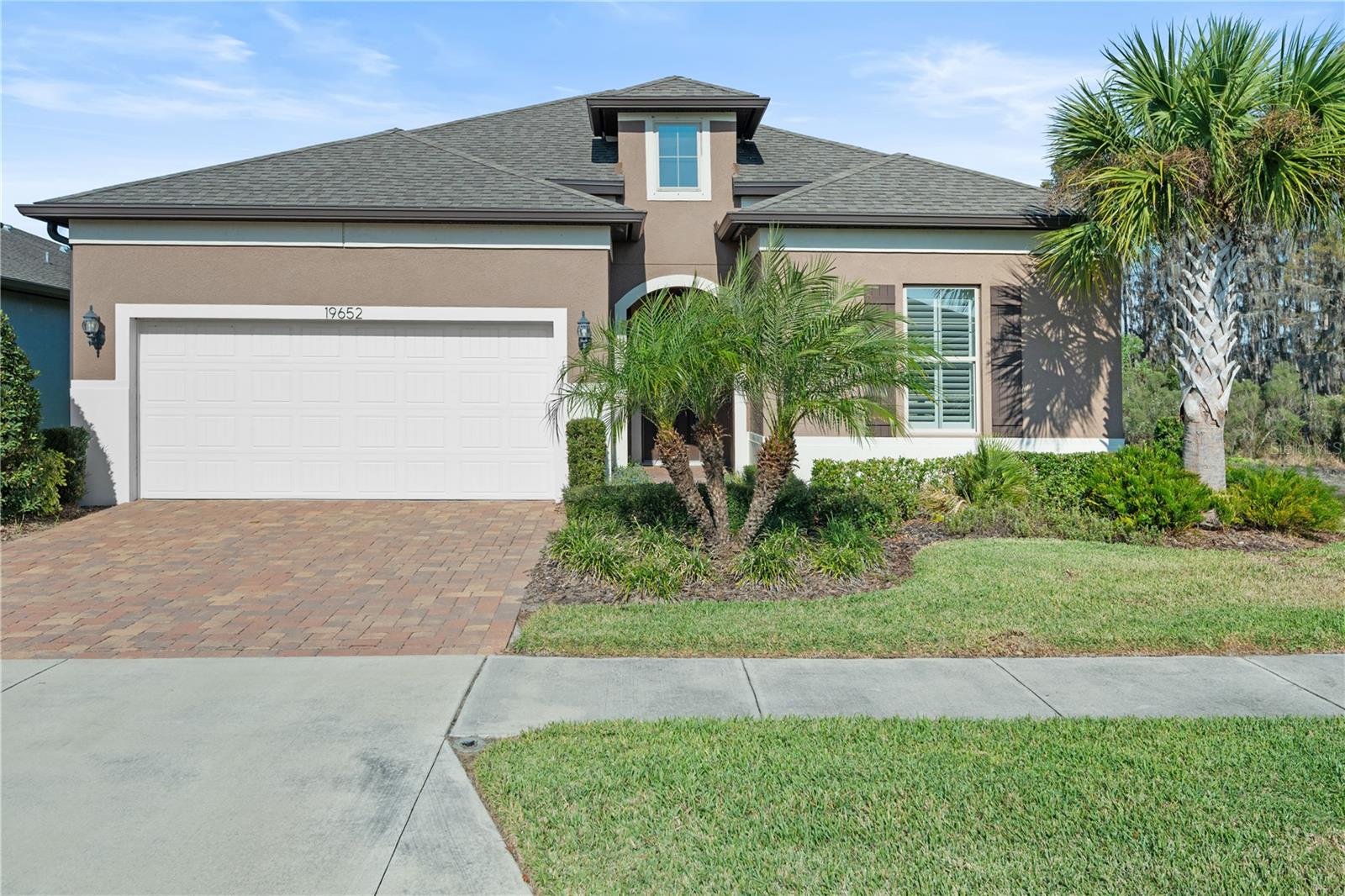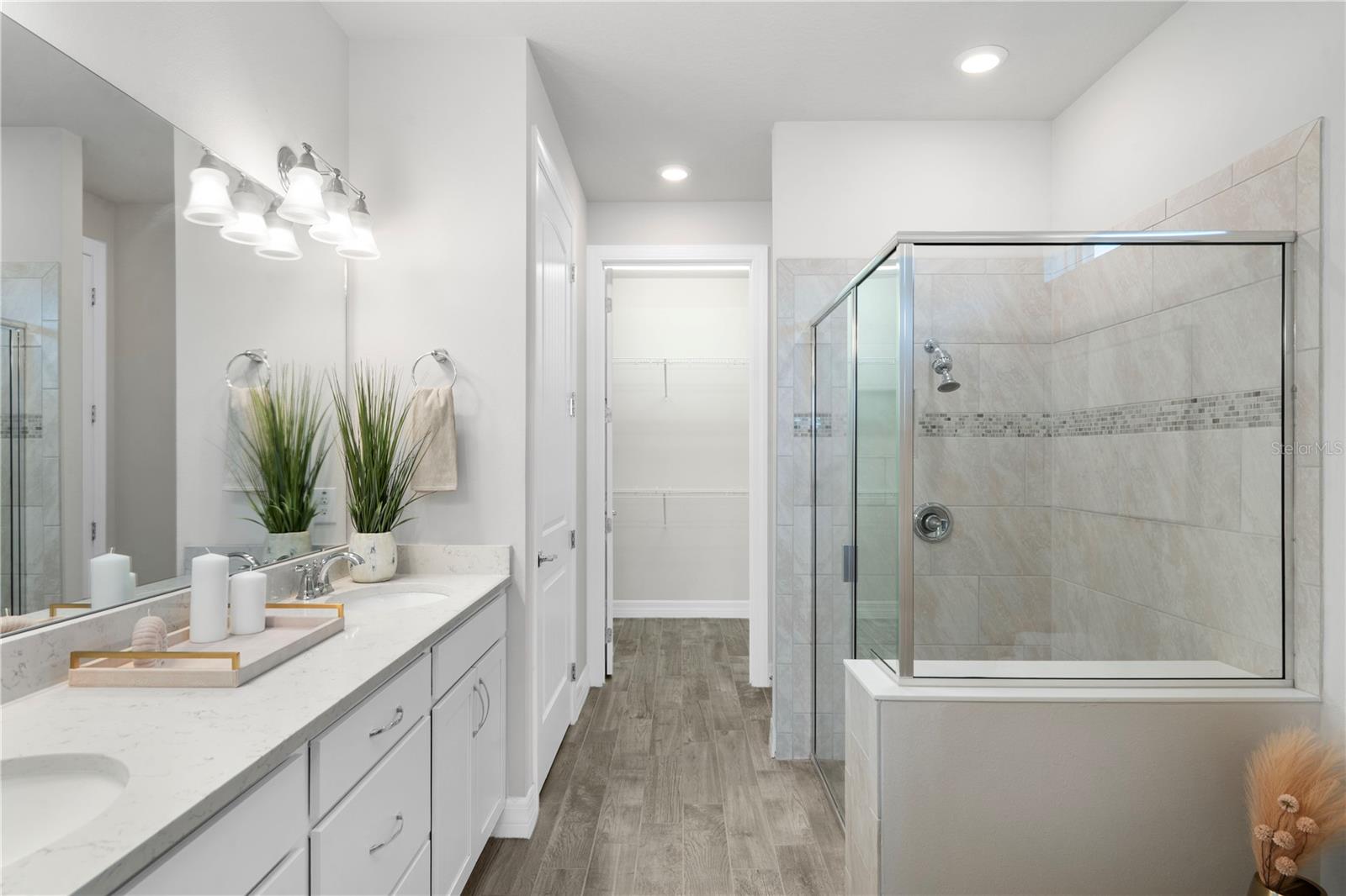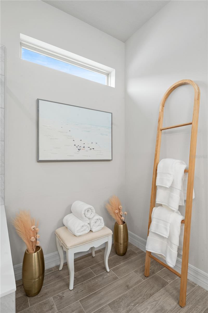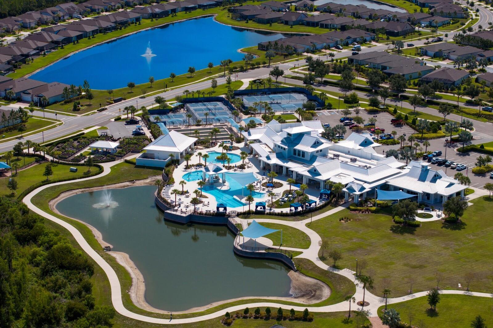 Nestled in a tranquil setting, this stunning property offers breathtaking water views from both the back and side of the home, providing a serene and picturesque backdrop for everyday living. Welcome to this beautifully appointed 3 Bedroom + Office, 2 Bath Home with a 2-car garage, perfectly situated on a serene pond in the gated 55+ community of Del Webb Bexley offering resort-style amenities. From the moment you step inside, you’ll notice the elegant wood-look tile flooring and plantation shutters that run throughout the home, creating a cohesive and upscale feel. The spacious kitchen is a chef’s dream, featuring crisp white cabinets, stunning quartz countertops, stainless steel appliances, a large island with seating and pendant lighting, subway tile backsplash, a vented range hood, and a generous sized pantry. The adjacent dining area boasts water views, making every meal a relaxing experience. The family room is equally inviting, complete with crown molding and sliding doors that open to the backyard, where tranquil pond views await. The primary suite is a peaceful retreat with a tray ceiling, crown molding, and pond views, plus an en suite bath that includes double sinks with quartz counters, a stall shower, large walk-in closet, and a linen closet for added storage. French doors lead into the office, which also offers beautiful water views—perfect for quiet work or reflection. The guest bath includes a tub/shower combo for versatility. Outdoor living is a dream with the expansive wrap-around, covered, and screened patio—ideal for entertaining or enjoying peaceful mornings by the water. The community amenities are plentiful! Relax in the heated swimming pool, resistance pool and spa. Stay active with tennis, pickleball, and bocce ball. The 19,000 sq ft Clubhouse hosts various events, activities and clubs and is home to the state-of-the-art fitness center and much more. Take advantage of the dog park, on-site bistro, and outdoor amphitheater. This home is the perfect blend of luxury, comfort, and active adult living.