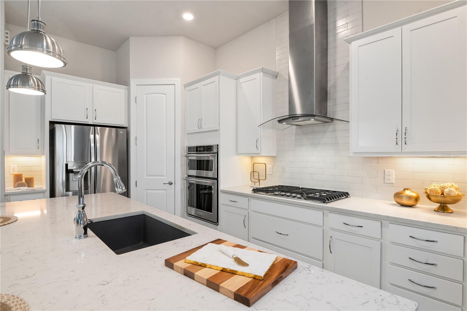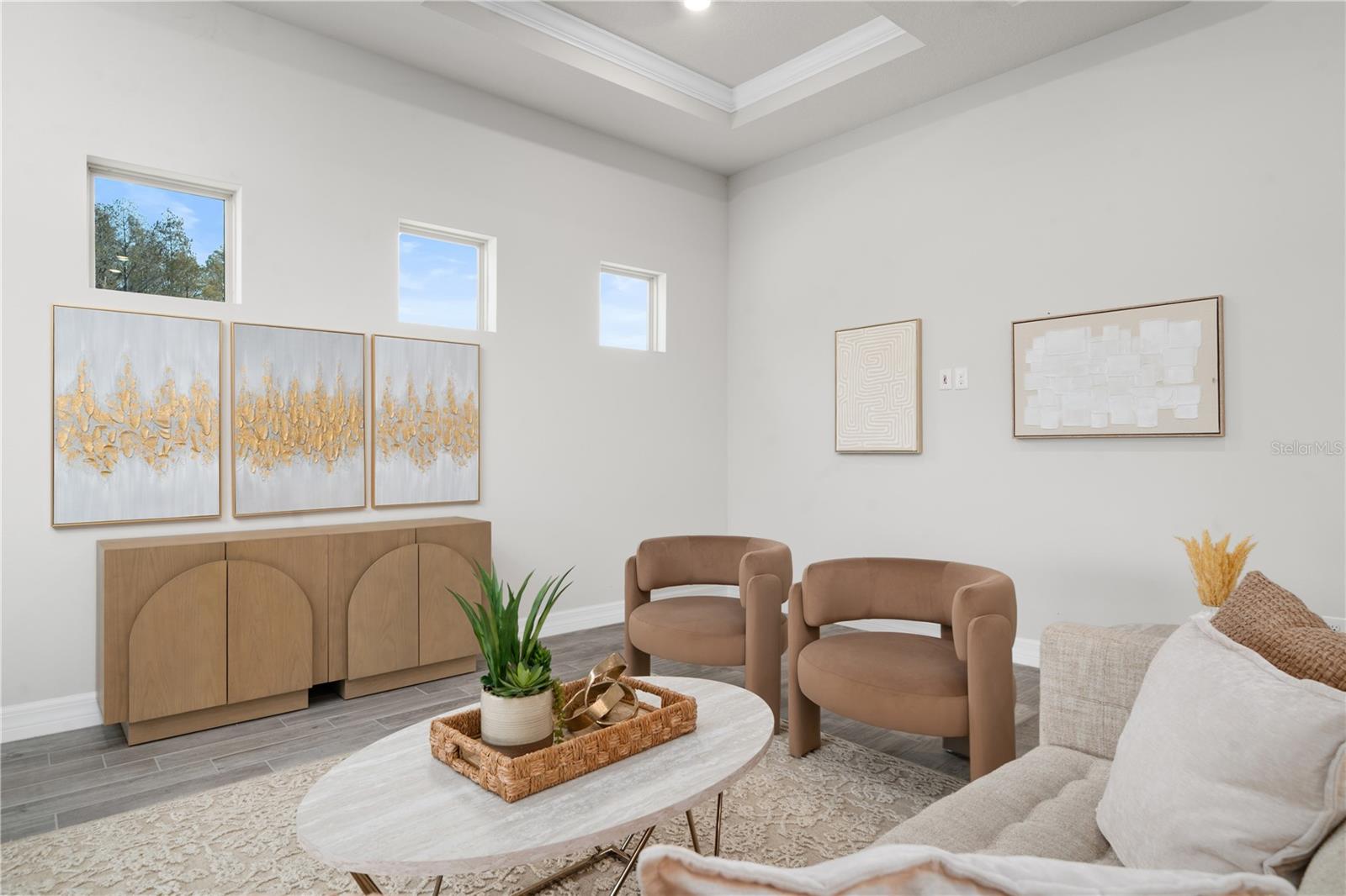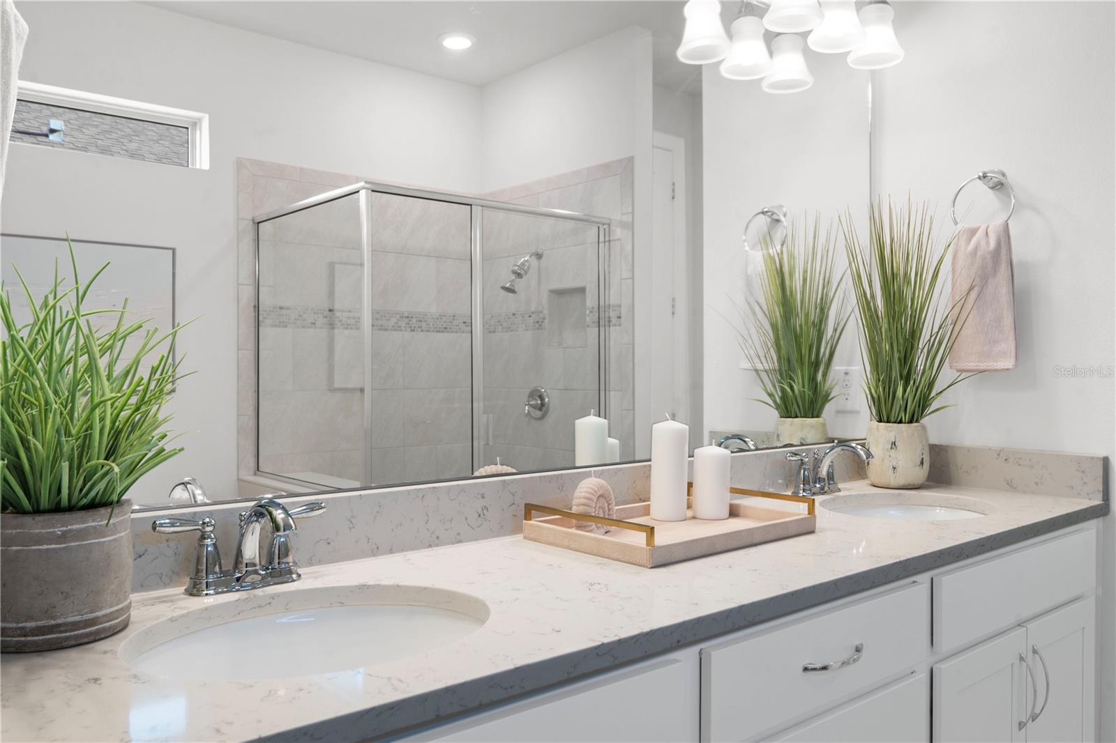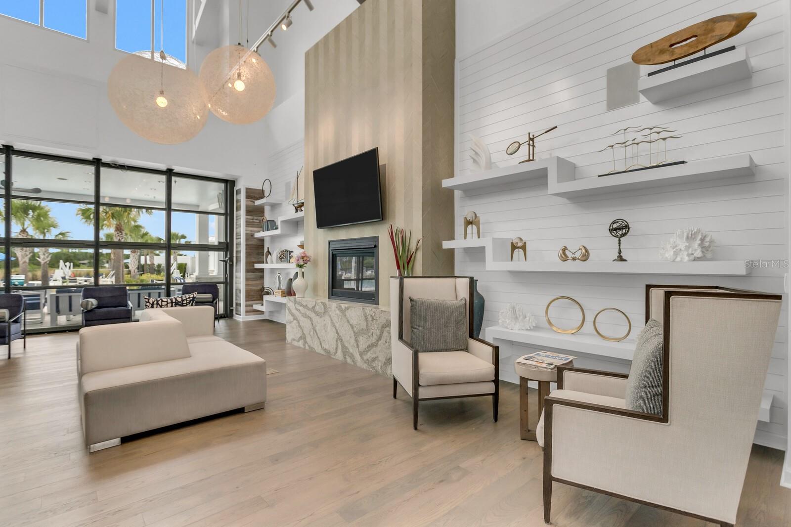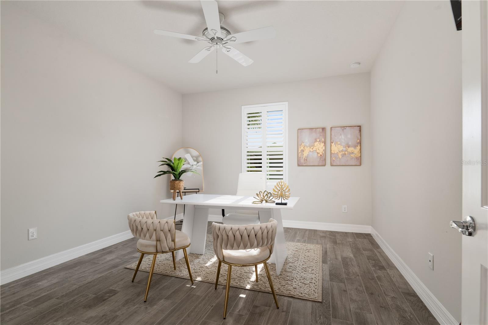 Nestled in a tranquil setting, this stunning property offers breathtaking water views from both the back and side of the home, providing a serene and picturesque backdrop for everyday living. Welcome to this beautifully appointed 3 Bedroom + Office, 2 Bath Home with a 2-car garage, perfectly situated on a serene pond in the gated 55+ community of Del Webb Bexley offering resort-style amenities. From the moment you step inside, you’ll notice the elegant wood-look tile flooring and plantation shutters that run throughout the home, creating a cohesive and upscale feel. The spacious kitchen is a chef’s dream, featuring crisp white cabinets, stunning quartz countertops, stainless steel appliances, a large island with seating and pendant lighting, subway tile backsplash, a vented range hood, and a generous sized pantry. The adjacent dining area boasts water views, making every meal a relaxing experience. The family room is equally inviting, complete with crown molding and sliding doors that open to the backyard, where tranquil pond views await. The primary suite is a peaceful retreat with a tray ceiling, crown molding, and pond views, plus an en suite bath that includes double sinks with quartz counters, a stall shower, large walk-in closet, and a linen closet for added storage. French doors lead into the office, which also offers beautiful water views—perfect for quiet work or reflection. The guest bath includes a tub/shower combo for versatility. Outdoor living is a dream with the expansive wrap-around, covered, and screened patio—ideal for entertaining or enjoying peaceful mornings by the water. The community amenities are plentiful! Relax in the heated swimming pool, resistance pool and spa. Stay active with tennis, pickleball, and bocce ball. The 19,000 sq ft Clubhouse hosts various events, activities and clubs and is home to the state-of-the-art fitness center and much more. Take advantage of the dog park, on-site bistro, and outdoor amphitheater. This home is the perfect blend of luxury, comfort, and active adult living.