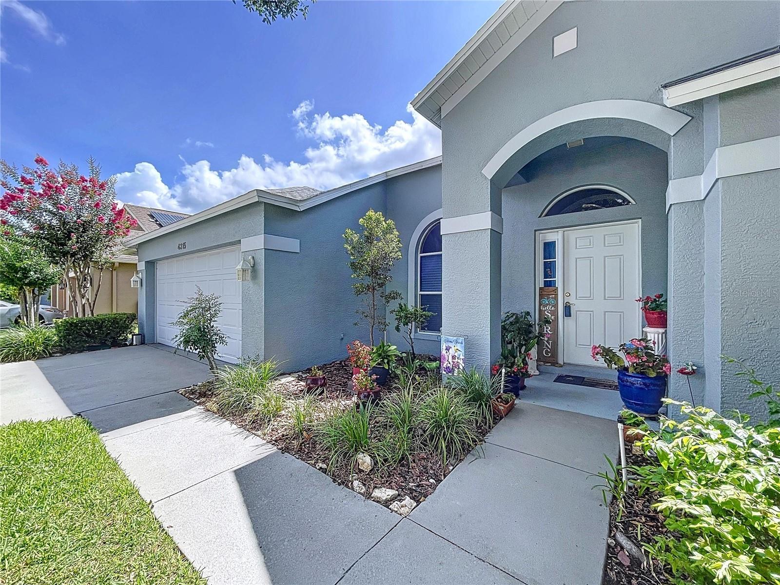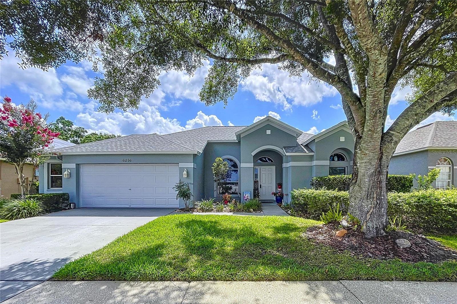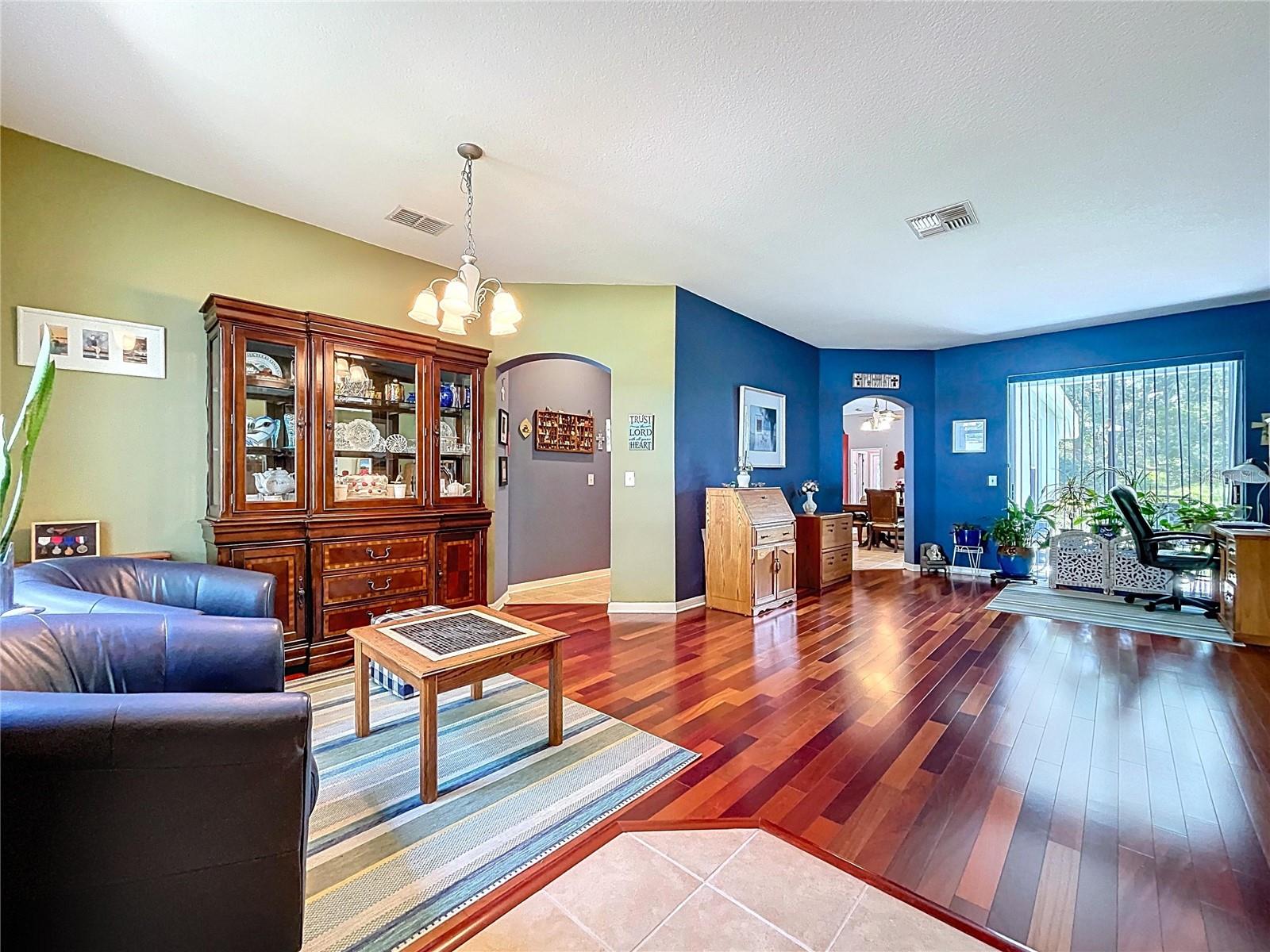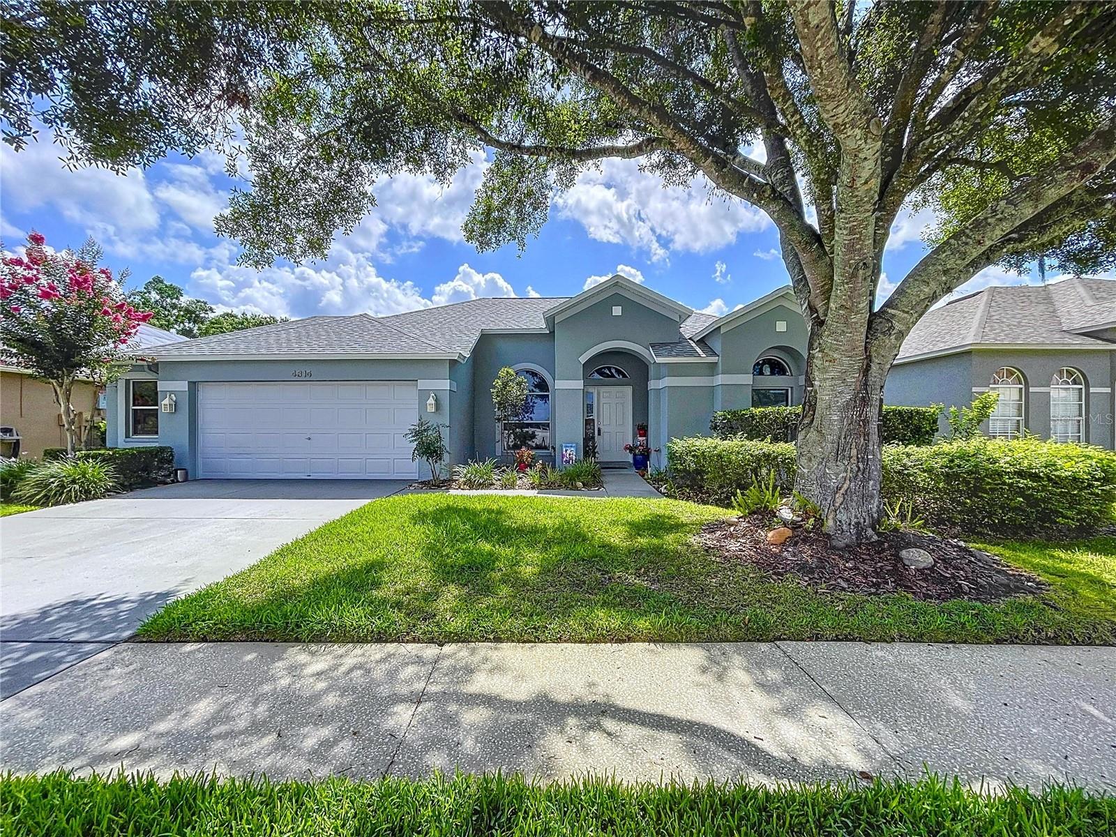 GREAT LOCATION! Price just reduced on this 2222 Square Foot, 4 Bedroom 3 Bath that offers a popular 3-Way Split Floor Plan with the 4th Bedroom & 3rd Bath located at the back of the home with a separate entry creating a great In-Law Quarters or Teen Retreat. High ceilings & arched windows greet you as you enter the front door. The Formal Living & Dining Rooms have gleaming Brazilian Cherry Wood Flooring and sliding glass doors. Spacious Family Room has decorative plant shelf and in combination with the kitchen create a wonderful gathering area. The Kitchen has Premium Ocean Blue Granite, Coordinating Tile Backsplash and 42 inch cabinetry, In addition there is a pantry & breakfast serving bar. The Dinette offers an additional eating area located between the kitchen & family rooms. The Primary Suite has 2 walk-in closets, an ensuite bath with 2 vanities, private commode, separate shower & relaxing garden soaking tub. The other secondary bedrooms share a hall bath. Convenient Interior Laundry Room. Garage is OVERSIZED with 2.5 Car Spaces. Covered Lanai is great for Barbeques and Plenty of Privacy as the back yard has a conservation view. Please note that stained glass light fixture and Drapes in the Primary Bedroom do not stay. Ice-maker as-is. Water softener is a monthly rental and can only convey with a new buyer contract with company.